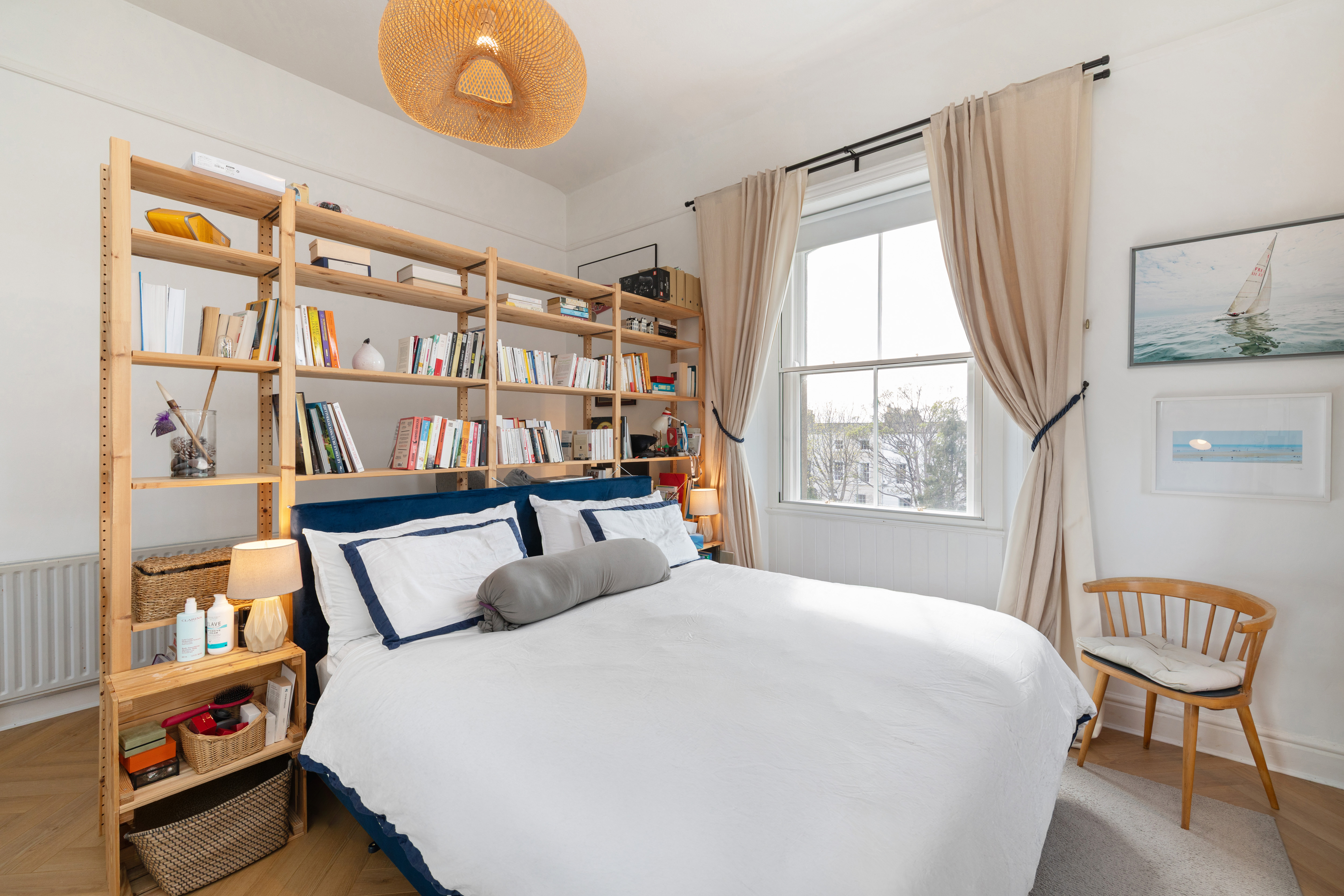 The apartment offers two generous double bedrooms. The main bedroom is located to the rear, enjoying a peaceful outlook over the private rear garden, with the benefit of a specially installed sound proofing layer to the window for enhanced comfort and a window to the side. The second bedroom is positioned to the front and is another exceptional space with truly outstanding sea views. Both bedrooms feature double height ceilings, original radiators retained for character, high quality herringbone laminate flooring and mirrored sliderobes.