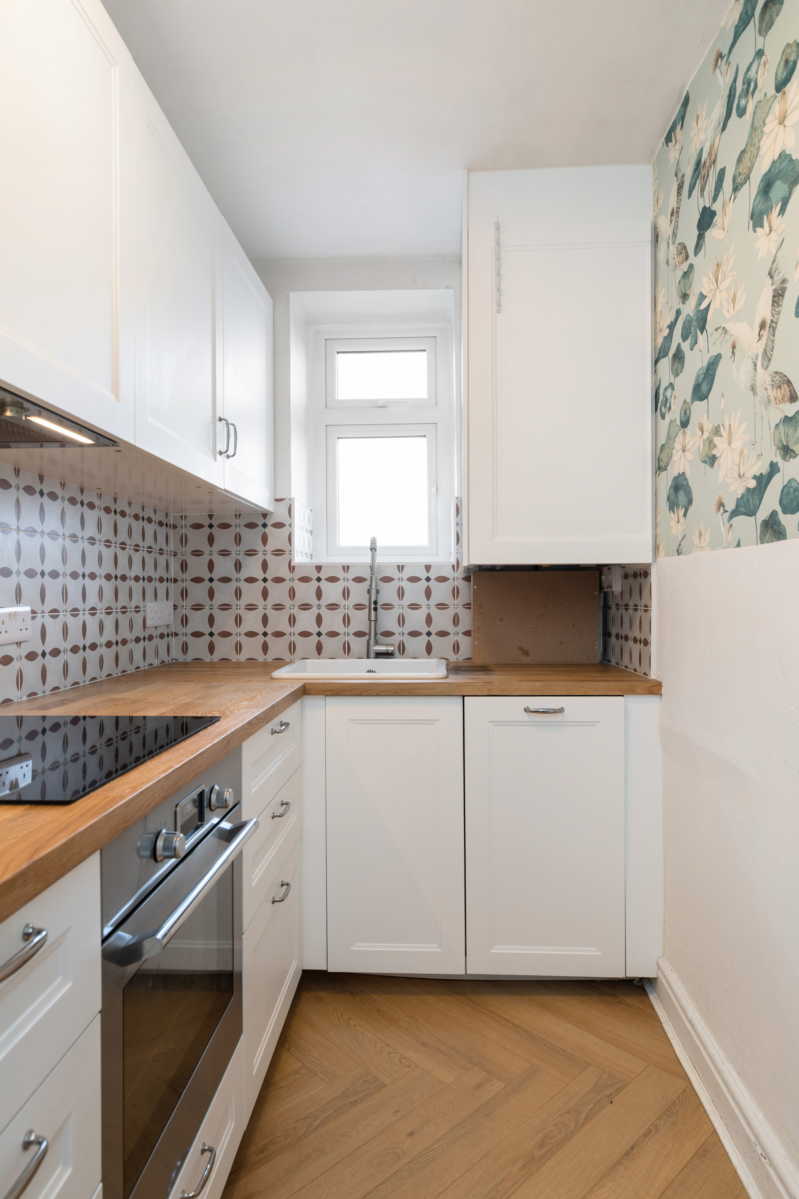 To the left of the entrance hall, the kitchen has been thoughtfully upgraded. It is fitted with a modern kitchen complete with electric hob and oven, Italian wall tiling and stylish decorative wallpaper. A highly efficient Viessmann gas boiler, with smart EPH connectable thermostat, provides gas fired central heating throughout and benefits from a manufacturer’s warranty.
