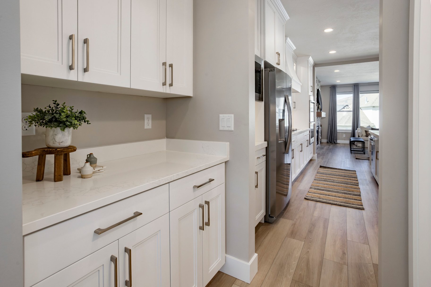 A charming front porch invites you into a grand, open entry, complemented by a sophisticated formal sitting room. The gourmet kitchen is truly the centerpiece of the home, featuring upgraded thick white quartz countertops, an expansive island, custom tile backsplash, cabinet and under-counter lighting, double ovens, and built-in cooktop with an upgraded hood. A walk-through butler/serving area and spacious walk-in pantry provide both elegance and functionality, offering abundant storage and prep space. Just off the kitchen, a hidden built-in office or beverage station adds a unique and convenient touch.