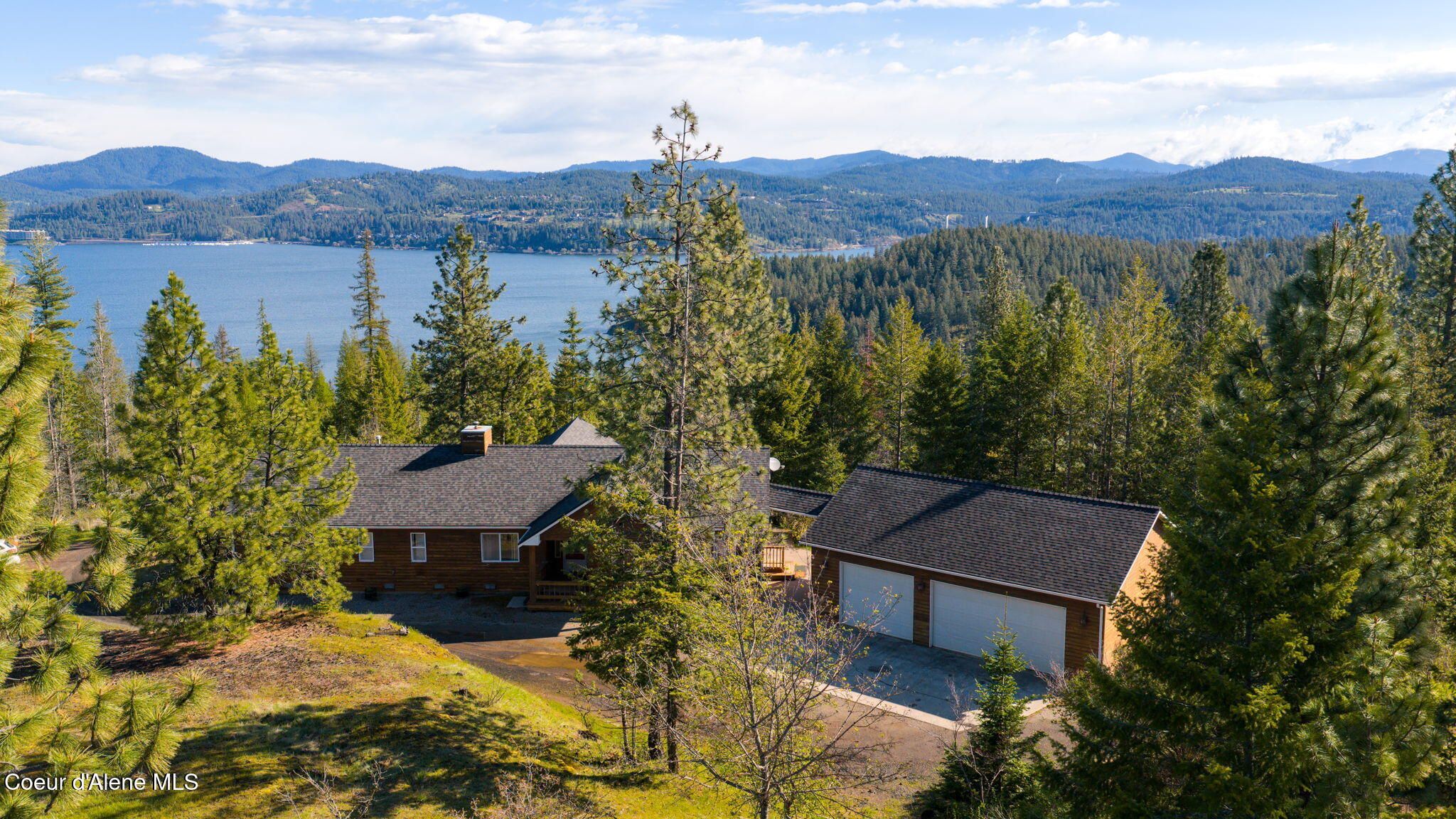 Rare opportunity to own 10.06 acres with Coeur d'Alene Lake views just minutes from Gozzer Ranch and close to downtown Coeur d'Alene. This single level home offers 3 bedrooms, 3.5 bathrooms, and 2,206 sq ft with a functional layout, vaulted ceilings, and large windows that frame Coeur d'Alene Lake views from the main living areas. The property includes a detached oversized 3-car garage/shop, ample parking, and usable acreage with privacy and space to expand. Surrounded by larger parcels, this setting offers a quiet, natural backdrop with abundant wildlife and North Idaho scenery. Built in 1998, the home is ready for updates and presents an excellent opportunity for a primary residence, second home, or investment property in a highly desirable area near lake access, golf, and recreation.