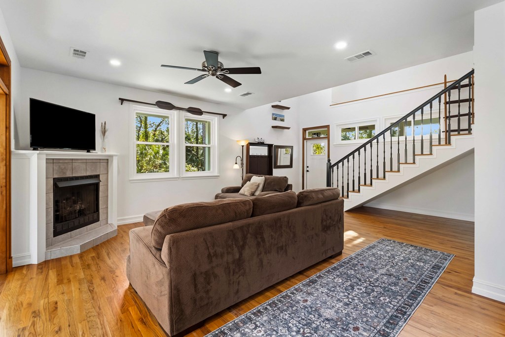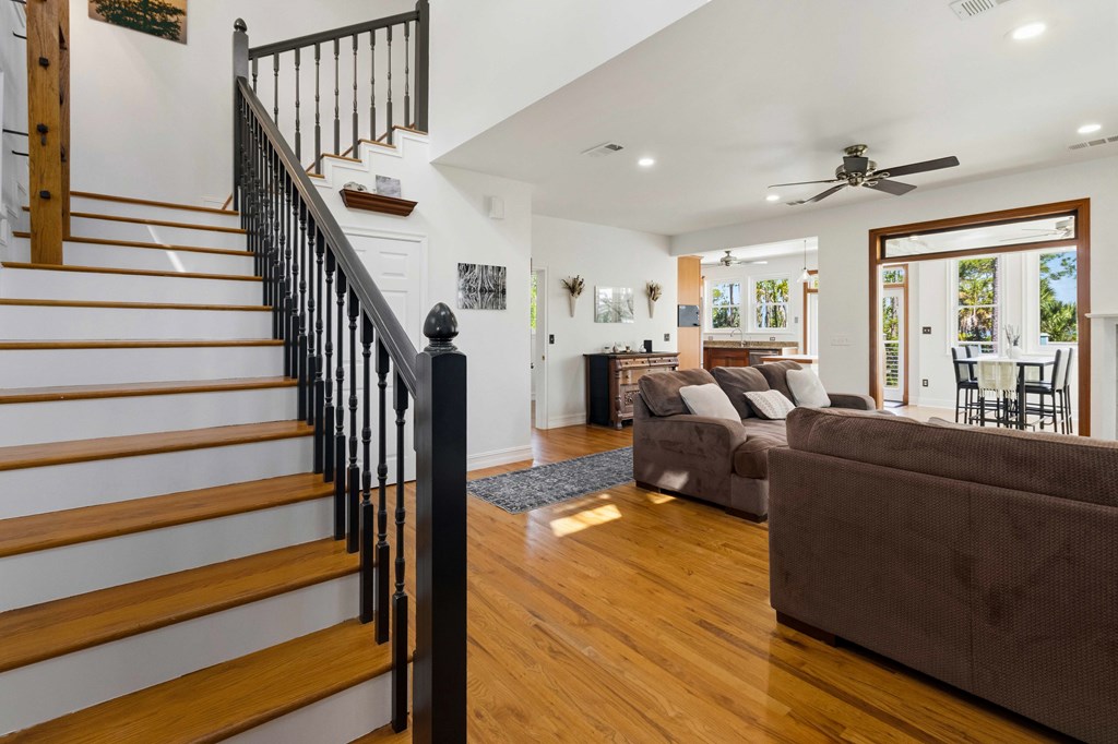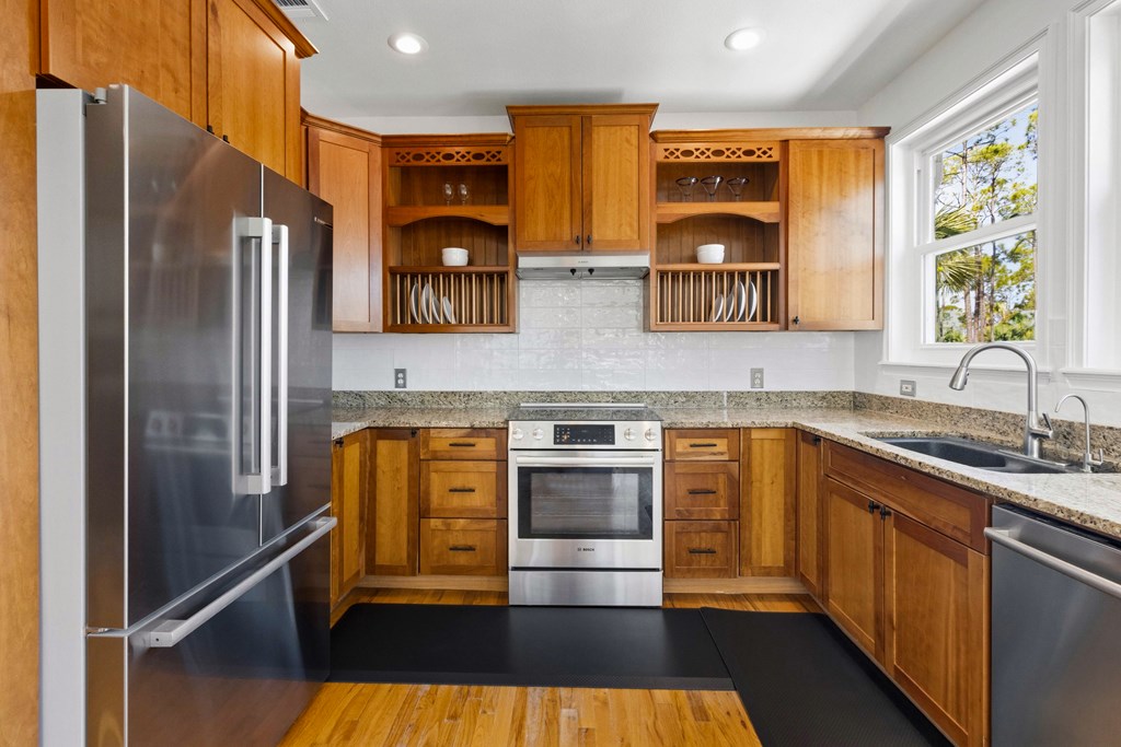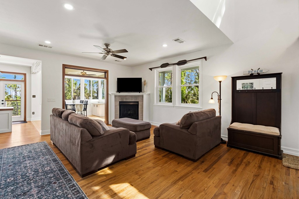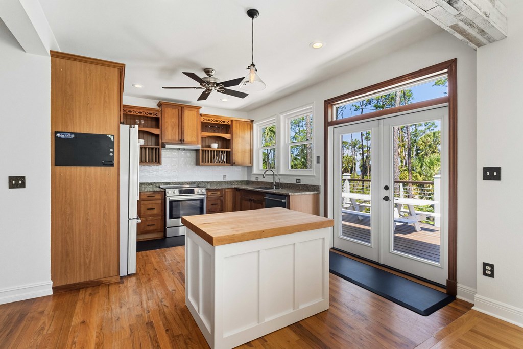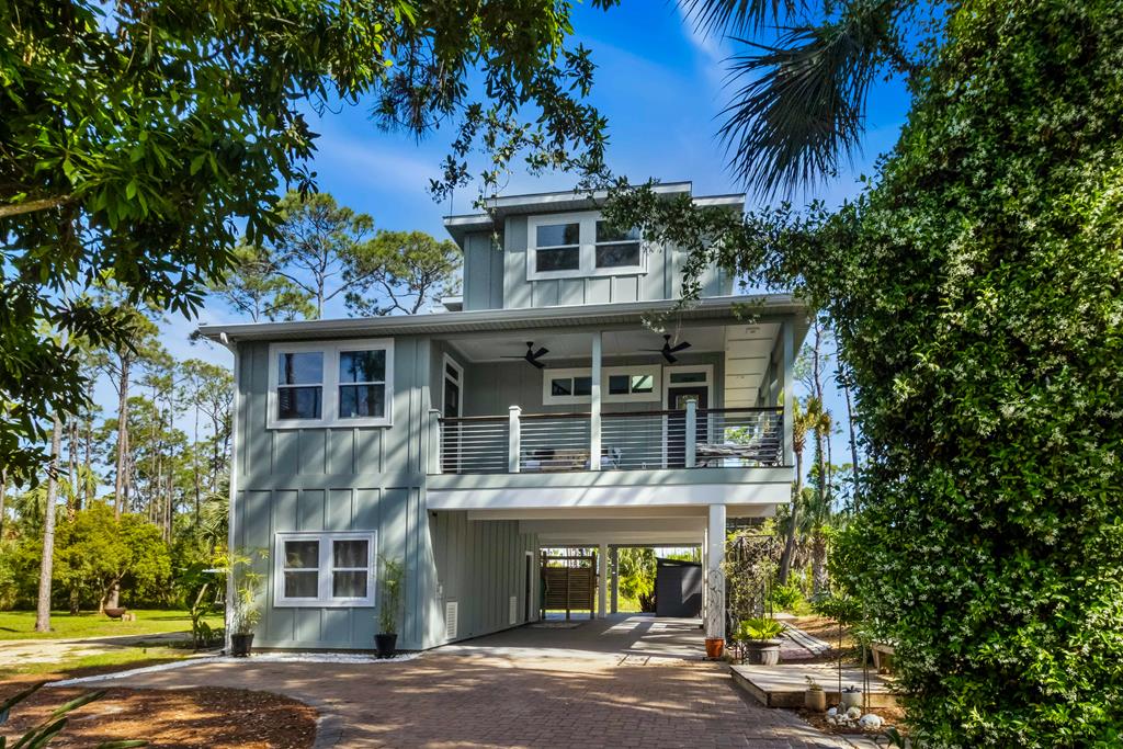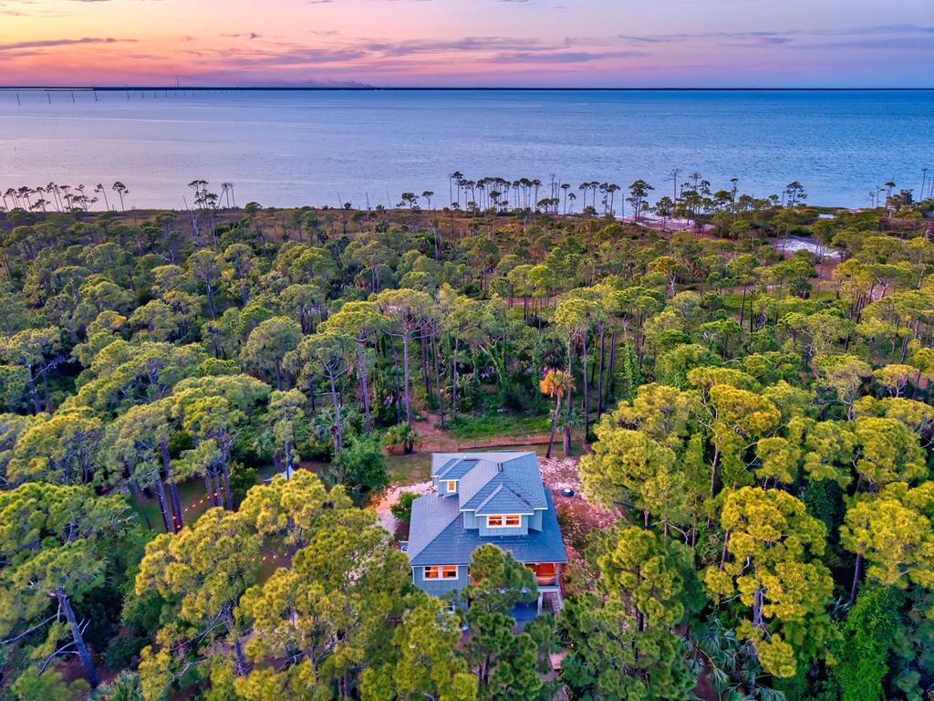 Stunning panoramic bay views from this jewel box custom home on St. George Island. This 2BR/2BA home looks out over protected state-owned land, so your view stays wide open - sunsets included - and access to the bay or beach is an easy stroll from your front door. Inside and out, there are many updates fit for modern living. Hardwood oak floors run throughout, and the layout is simple, bright, and easy to maintain whether you're here full time or using it as a second home. Both bedrooms offer privacy with loads of natural light, while the top-floor primary suite opens to its own deck - ideal for enjoying bay breezes with your morning coffee or winding down at the end of the day. Substantial updates have been recently completed: Hardie siding, impact-rated doors and windows, HVAC, hot water heater, gutters, new bathrooms, kitchen appliances and fresh paint inside and out. Two new rear decks - one on the main level and one off the primary suite - expand your outdoor living space without the upkeep, adding meaningful value and peace of mind. The property includes the adjacent lot, bringing the total to approximately .66 acres. The fenced yard with dual gates allows for easy drive-through access, with plenty of room for boat parking, gear storage, or future plans to build a neighboring house and create a family compound. Native landscaping and citrus trees keep maintenance low while attracting local wildlife - eagles, osprey, owls, peregrine falcons, red shouldered hawks, egrets, herons are regular visitors. Additional features include a ground-level storage room, outdoor shower, and outdoor shed. Having had only 2 owners and never used as a rental, this home has been carefully maintained as a full-time residence, however rentals are allowed. Being just 2.5 blocks to the Gulf beach and five blocks to favorite island restaurants and shops, this is an immaculate, updated coastal property with room to grow and views that will make you never want to leave!