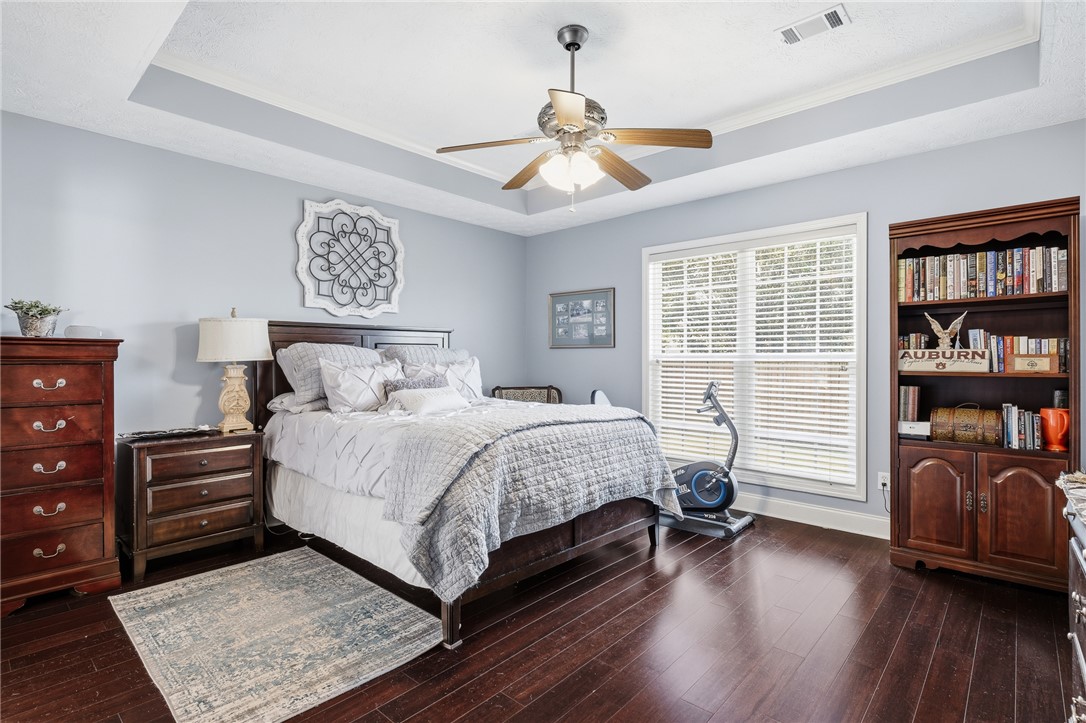 Impeccably maintained and updated, one level home! Move right in and enjoy! The welcoming cover front patio invites you into a dedicated foyer. The great room features a tray ceiling and a fireplace. The kitchen offers newly added quartz countertops, tile backsplash, breakfast bar and dining room. The expansive laundry features shelving and hanging space. Two generous sized bedrooms shared a hall bathroom. The [primary suite overlooks the backyard and offers an updated ensuite. The backyard has a privacy fence and covered patio! Location offers convenience to primary school, Tiger Town, I-85, and a short drive into downtown Opelika!