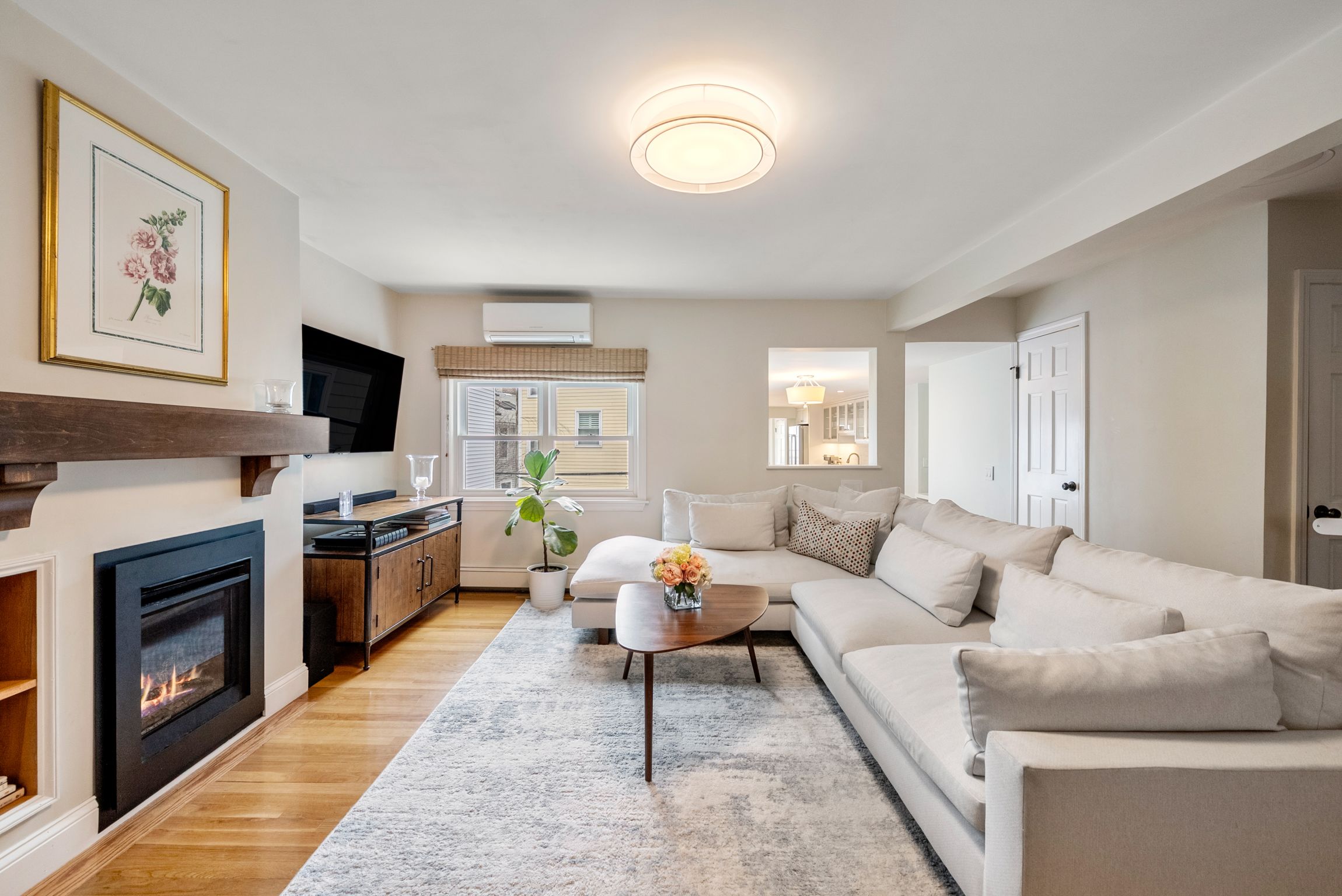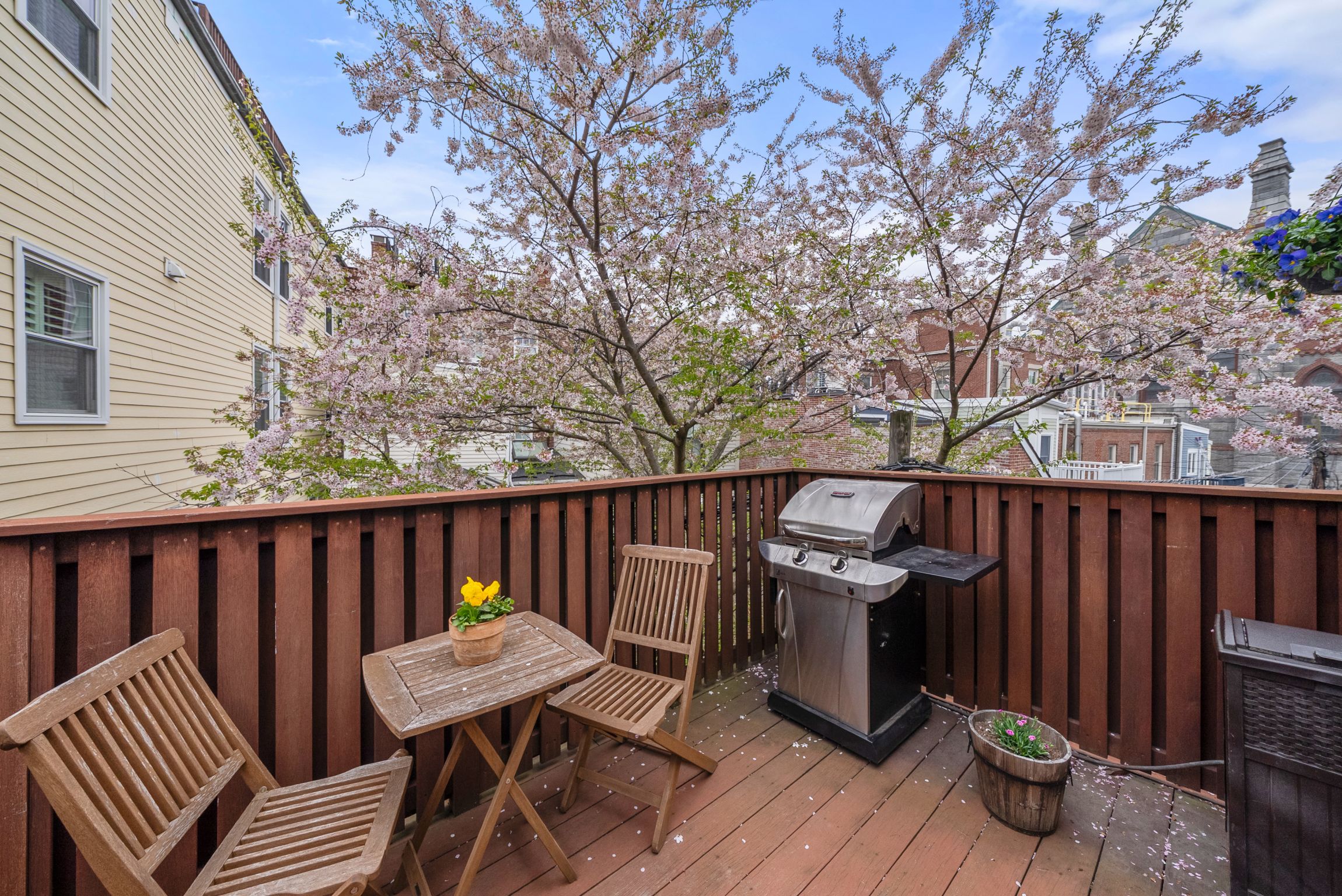 Located on a charming gas-lit street between Monument Square and town center, this three-plus bedrooms and one-and-a-half bathrooms penthouse duplex offers 1,374sf of beautifully designed living space and three private outdoor areas, including a roof deck with spectacular Monument and city views. The expansive main level features an elegant living/dining great room with black marble mantels and a gas fireplace, a newly renovated office with custom built-ins, and an eat-in chef’s kitchen with white cabinetry, stainless Bosch appliances, granite countertops, subway tile backsplash, pantry, and direct access to a private deck with a gas line for grilling. The upper level includes a spacious primary bedroom with a double-wide closet; an ample second bedroom with a large closet and direct access to a private deck; a nursery/office; and a well-appointed full bath with quartz topped double vanity, tub with tile surround, and marble flooring. Amenities: in-unit W/D, ductless A/C mini-splits, hardwood floors throughout, and storage.