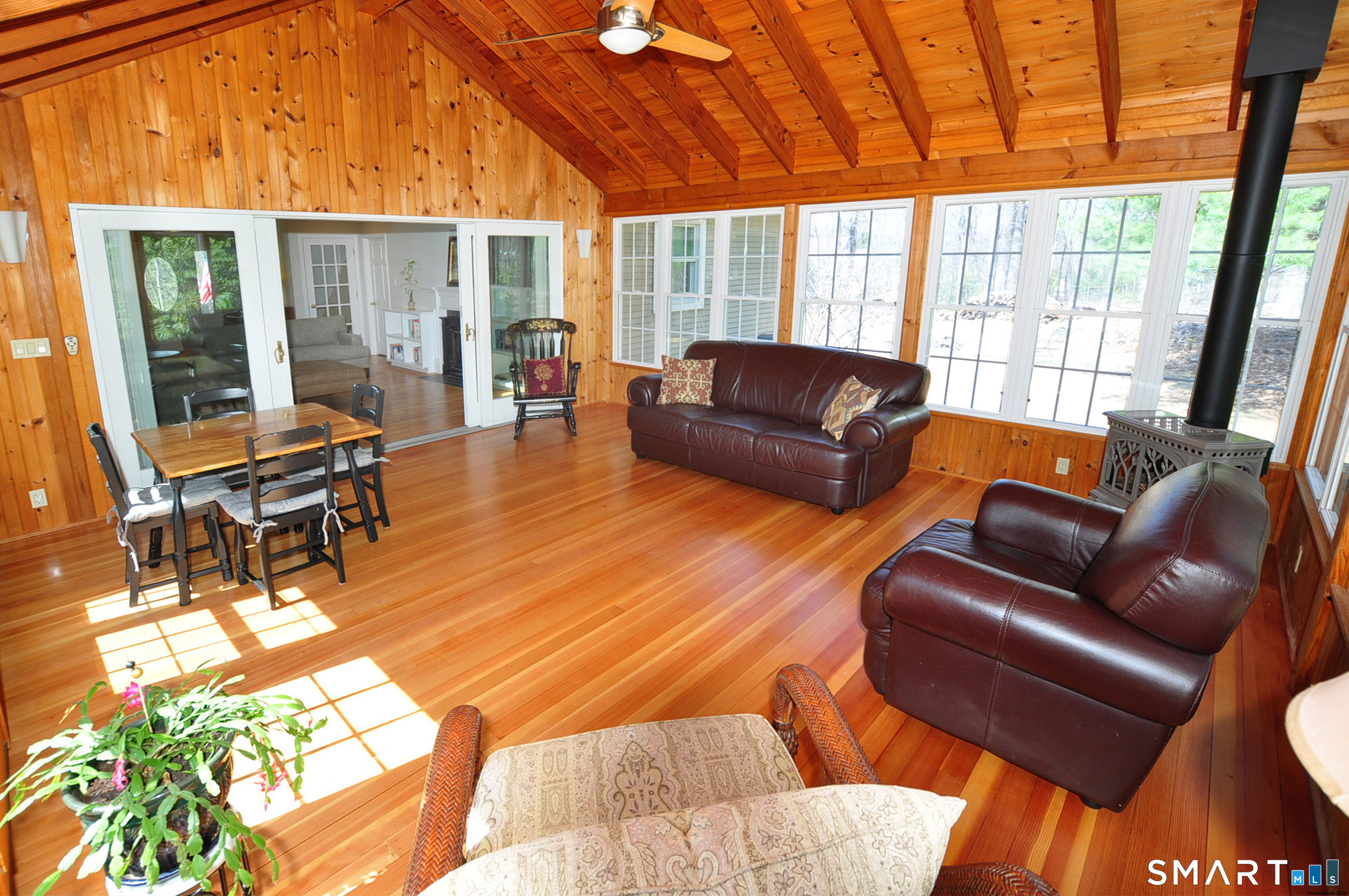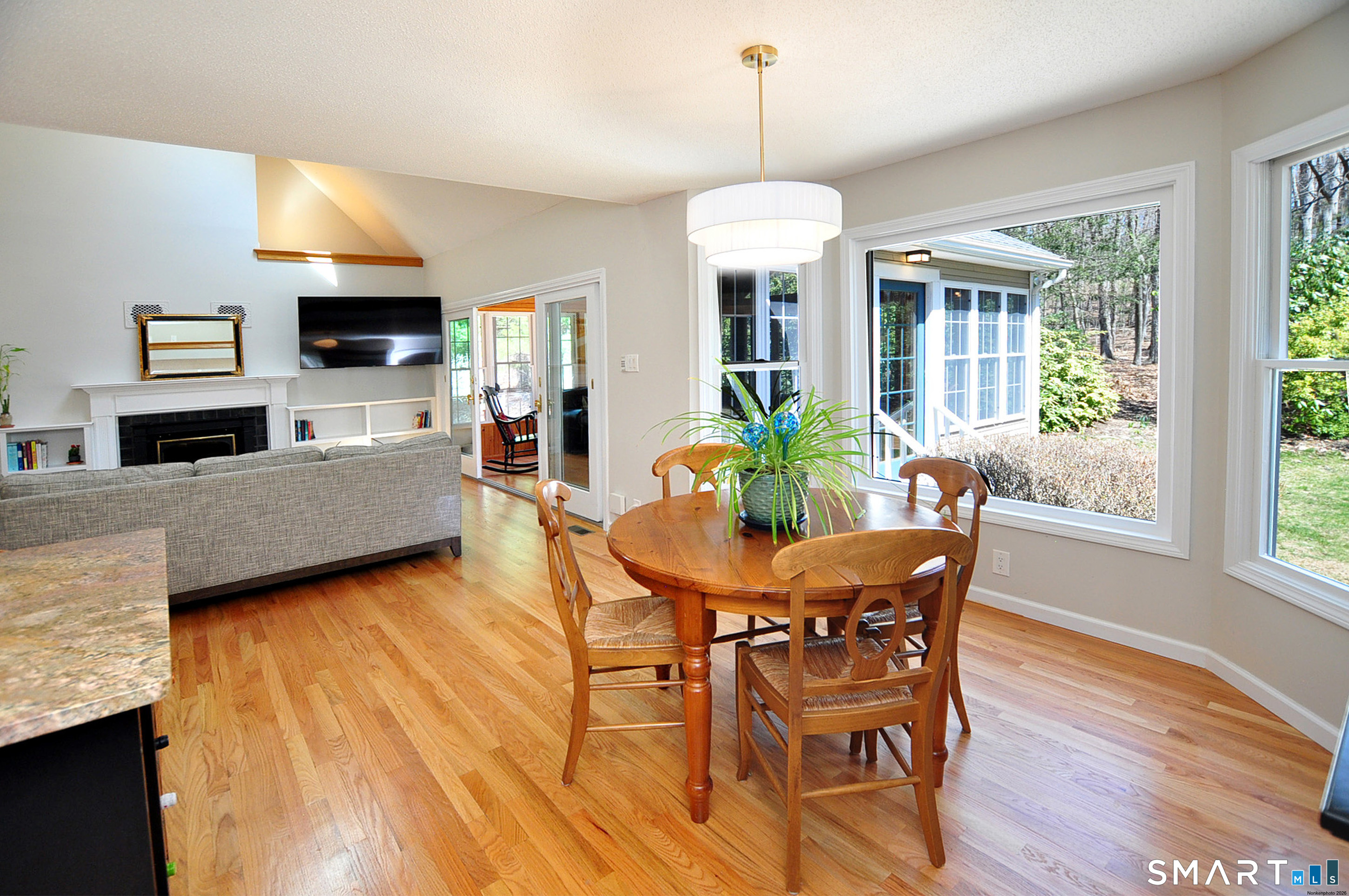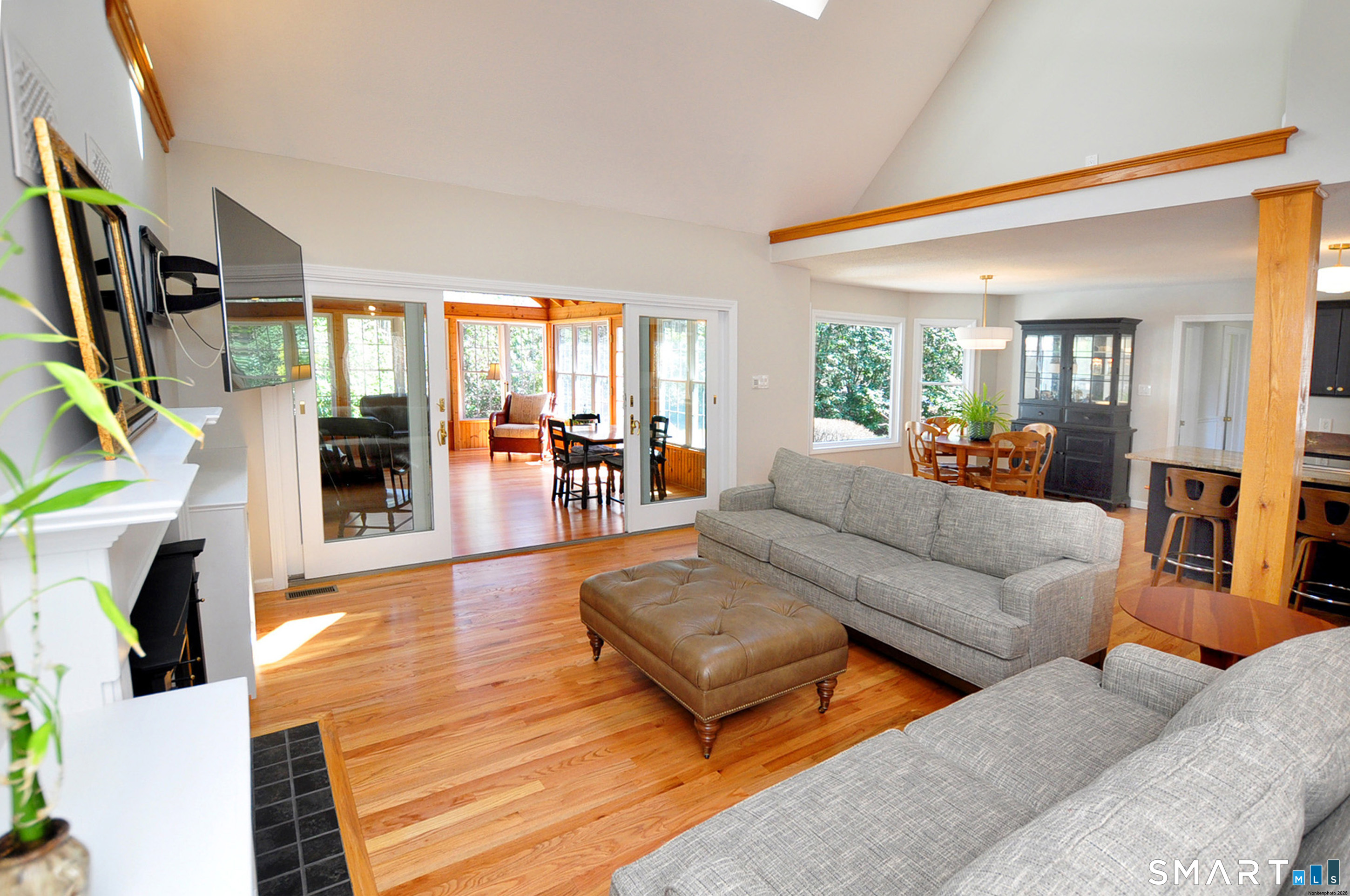 Nestled in a sought-after Canton neighborhood, this beautifully maintained oversized Cape offers over 3,400 square feet of living space, including a finished lower level. Thoughtful care & attention are evident throughout, complemented by wonderful curb appeal & a welcoming setting set back from the road. A charming walkway leads to the front door & covered porch, inviting you into this warm & spacious home. Inside, the open floor plan is ideal for both everyday living & entertaining. The first-floor primary suite features hardwood flooring, a walk-in closet, & a full bath with shower & whirlpool tub. The impressive great room showcases gleaming hardwood floors, vaulted ceilings, skylights, built-ins, & a fireplace, with atrium slider doors opening to an inviting sunroom with cathedral ceiling, cherry hardwood floors, & a propane stove. The eat-in granite kitchen offers abundant cabinetry with pull-outs, a center island, & stainless steel appliances, & flows seamlessly into the large dining room with crown molding & hardwood floors. A mudroom, laundry area, & half bath add convenience, while stairs off the mudroom lead to a spacious bonus room perfect for a home office, guest space, or possible fourth bedroom. Upstairs you'll find two generously sized bedrooms with refinished hardwood floors, walk-in closets, a loft area, & a beautifully remodeled full bath with granite and double sinks. The finished lower level provides additional flexible living space along with ample