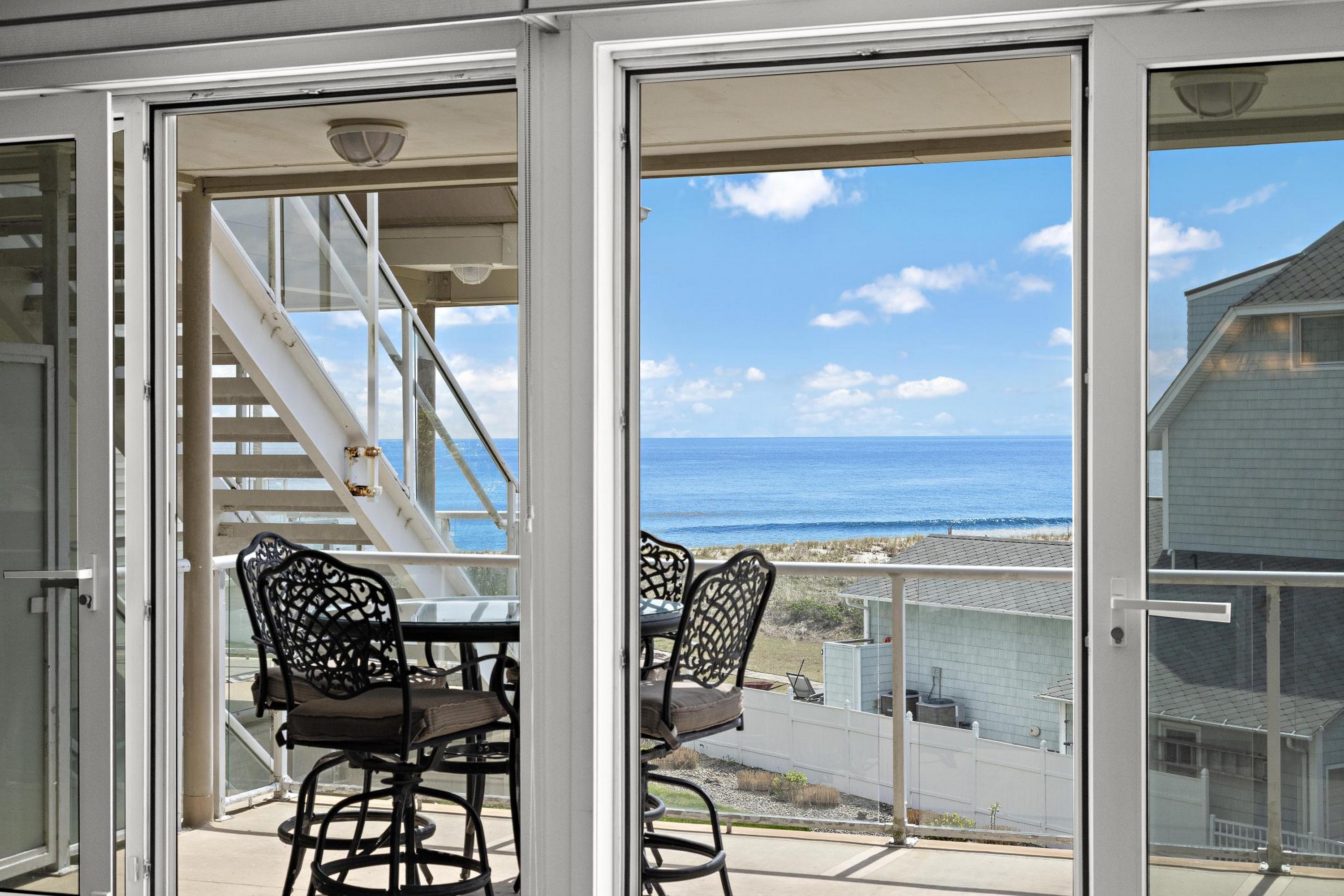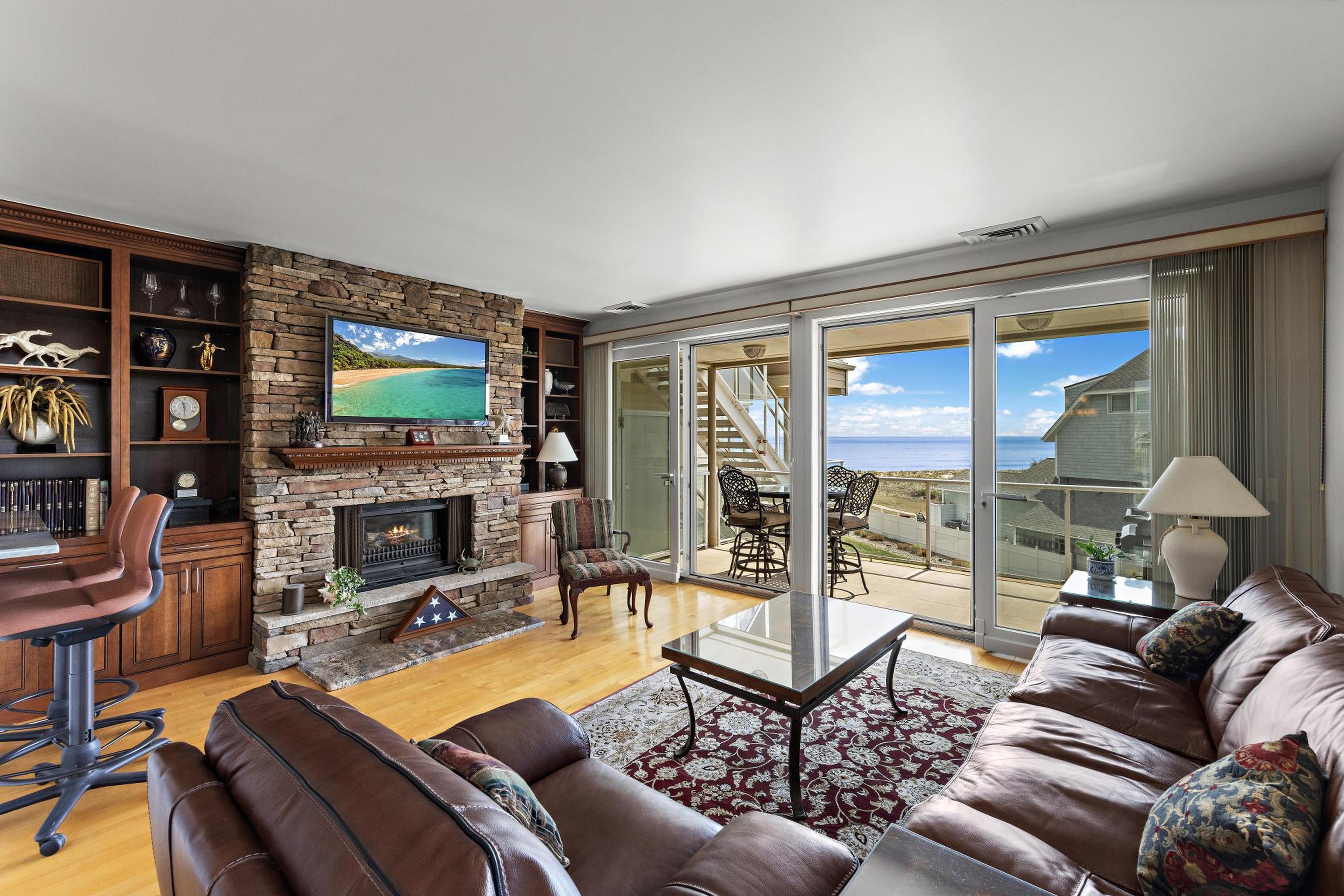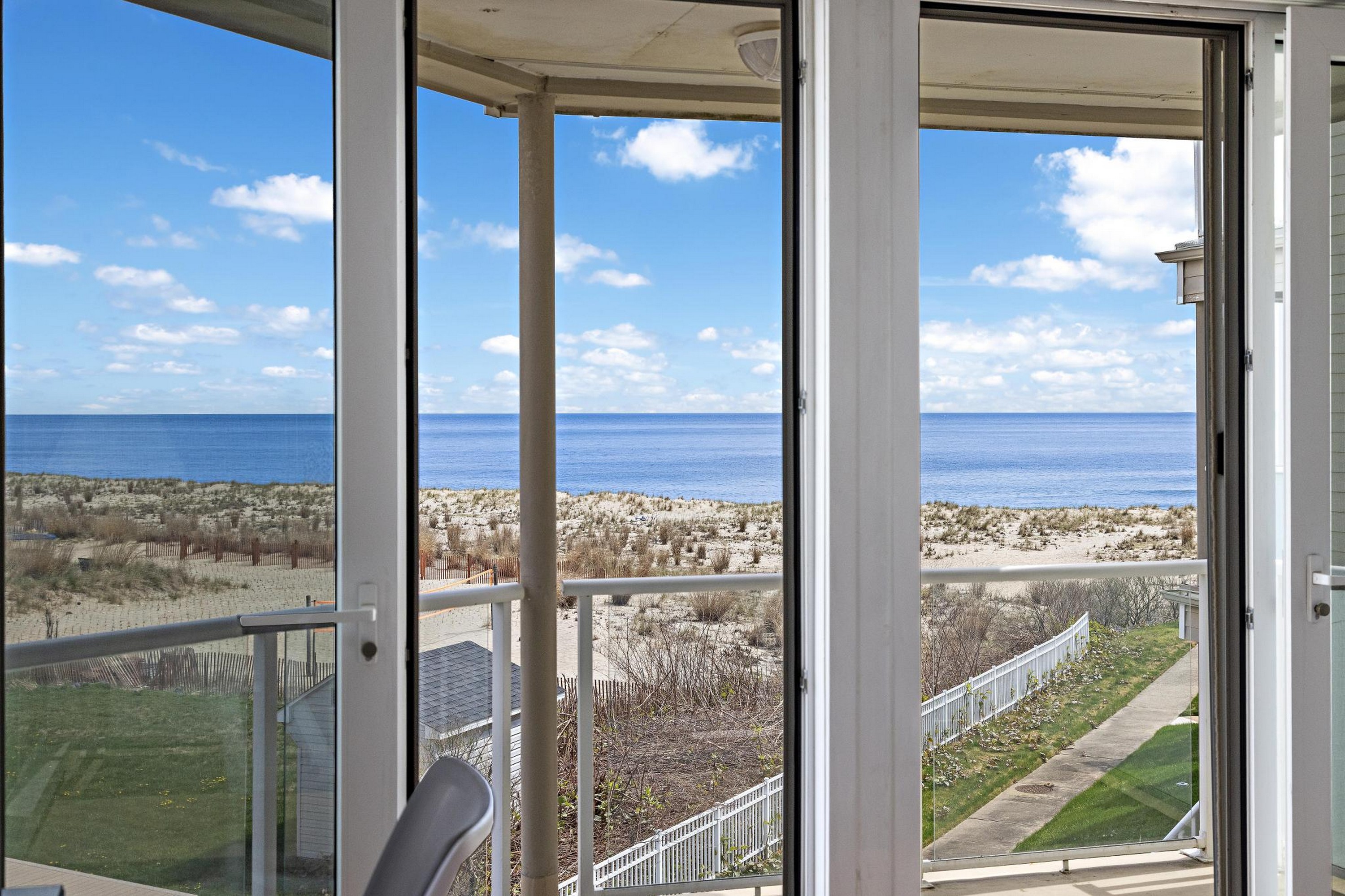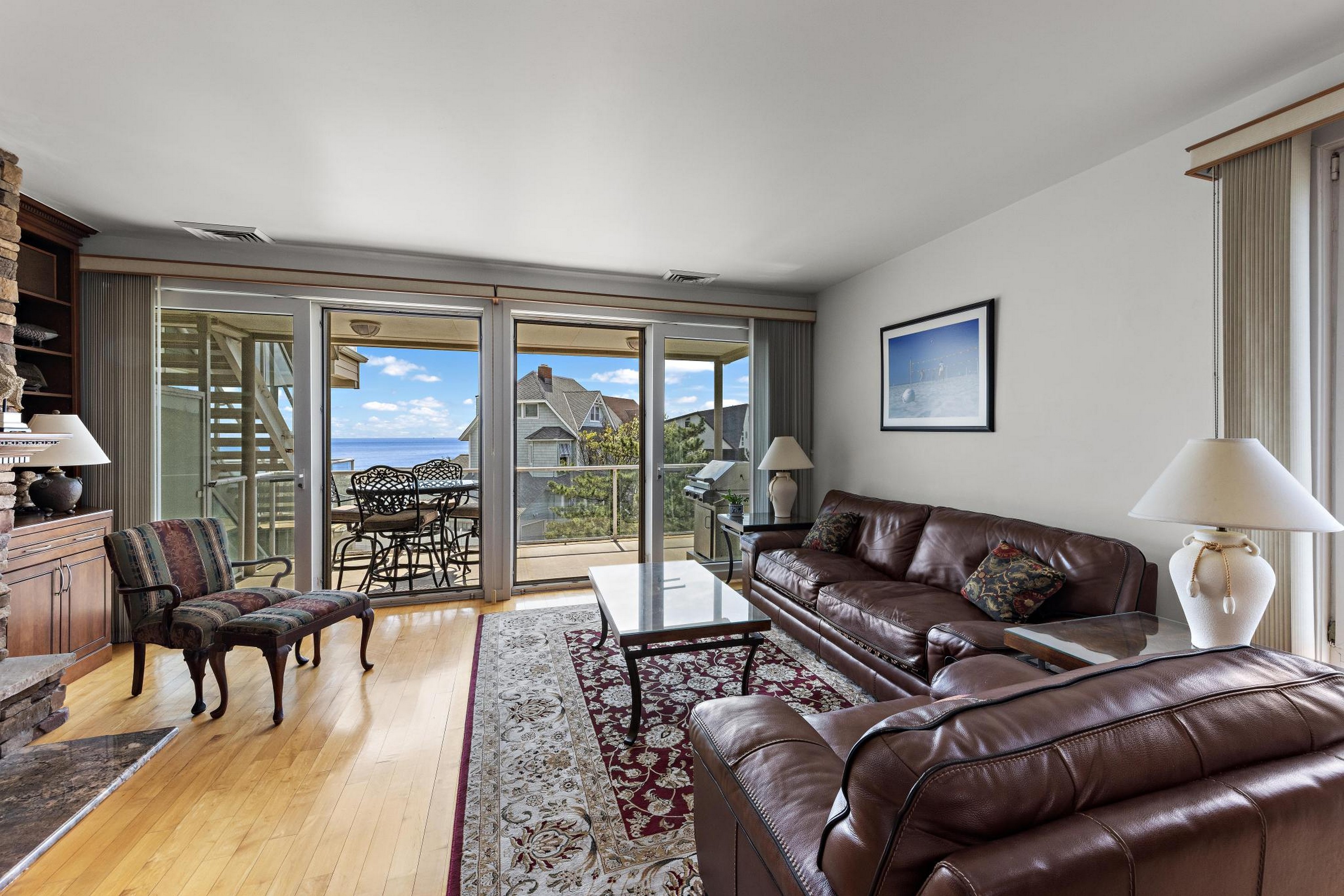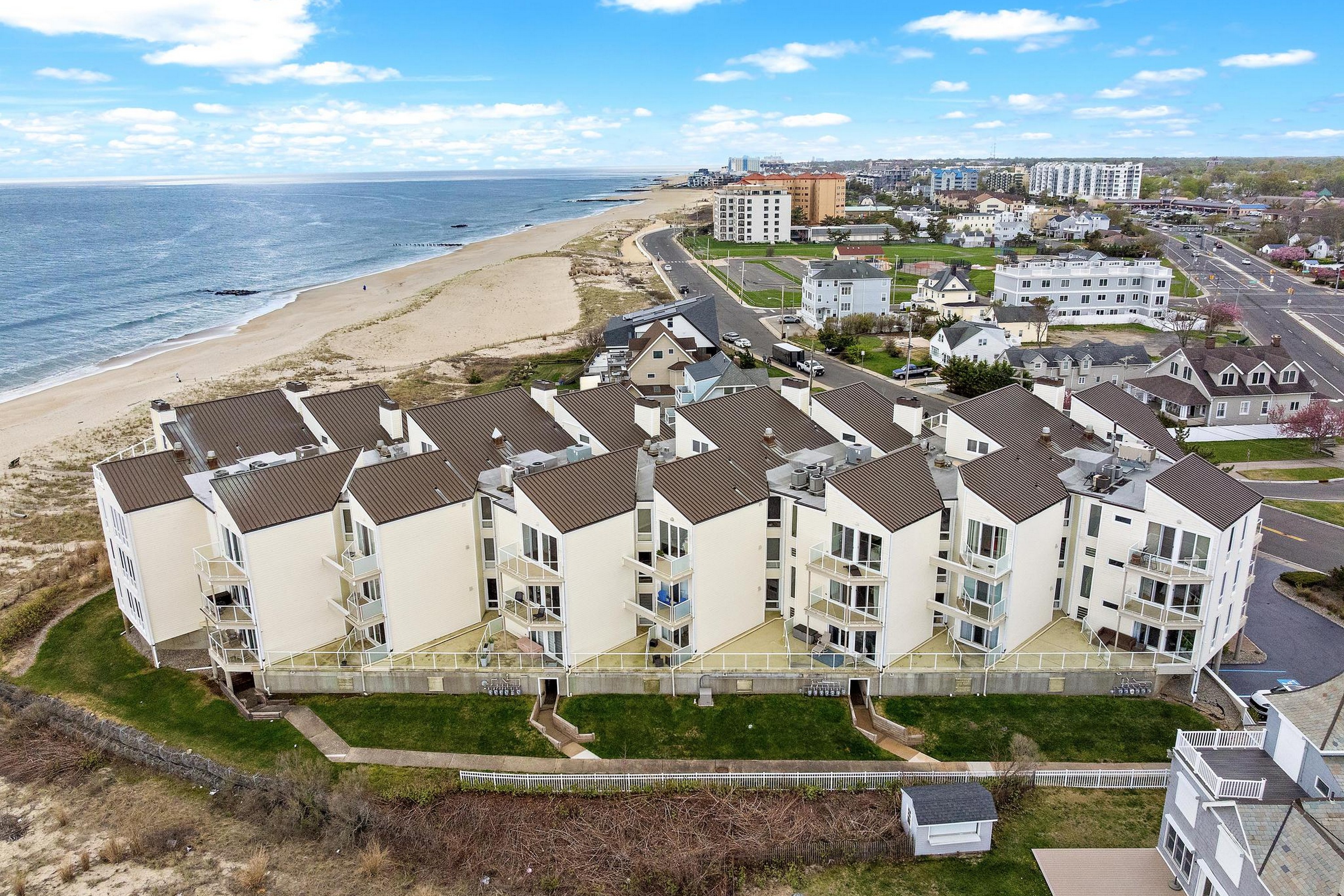 Sea Dunes is one of the only oceanfront condominium buildings in Long Branch with direct private beach access, and with just 24 units in the entire building, Unit H2 represents the kind of opportunity that does not come up often. A fully updated, end-unit with views of the Atlantic Ocean, three private balconies, and a permanently protected sightline to Seven Presidents Oceanfront Park. The 2025 kitchen renovation features 42'' natural cherry solid wood cabinets extending into the hallway, new stainless steel appliances, and granite countertops. All updated bathrooms, each with new cabinets, fixtures, sinks, and toilets. You will wake up to ocean views from your bed in the primary bedroom which also provides two walk-in closets. The living room features a custom built-in wall unit, a stone fireplace with mantel and gas insert, and a dedicated gas line extending to the deck for the infrared gas grill. Natural hardwood floors run throughout; tile in the kitchen and all bathrooms. Sea Dunes' U-shaped architectural design positions both the living room and the primary bedroom with ocean views. Amazing cross-ventilation provides an advantage no interior unit can match, with little reliance on air conditioning. All windows and 5 sliding glass doors are custom-fitted to open fully or crack at the top and can be locked in the open position with the security system engaged. New central air conditioning was installed in 2025. Two reserved parking spaces and a private storage unit are included, plus an outdoor shower after you've spent the day at the beach. Long Branch's waterfront restaurants and boardwalk close by, and direct NJ Transit rail service to New York Penn Station runs from Long Branch station minutes away. The Seastreak ferry nearby leads to midtown West 39th Street, Brookfield Place, Battery Maritime Building and East 35th Street. 477 Ocean ave is positioned with quick access to the Garden State Parkway and Routes 35 and 36.