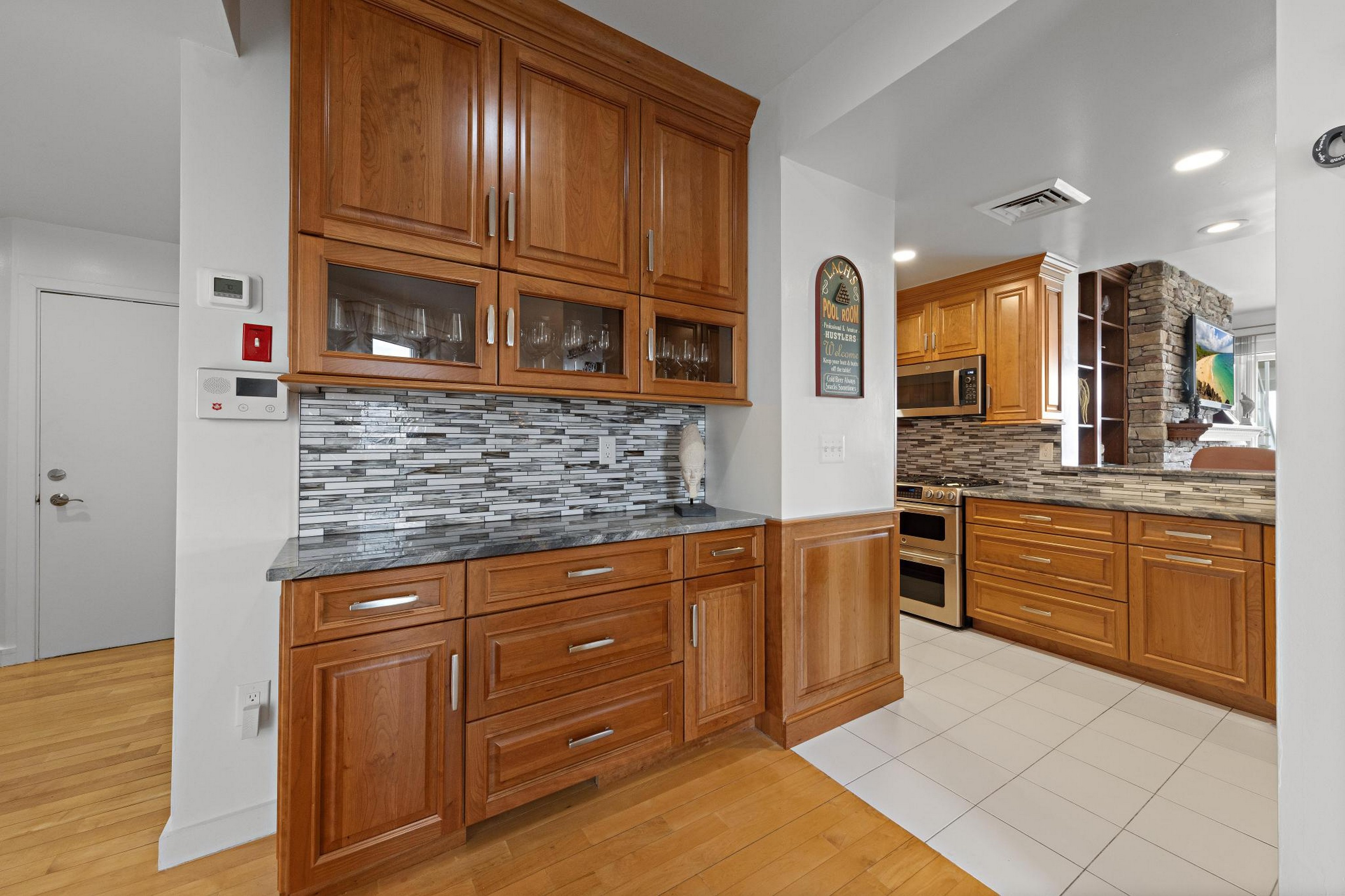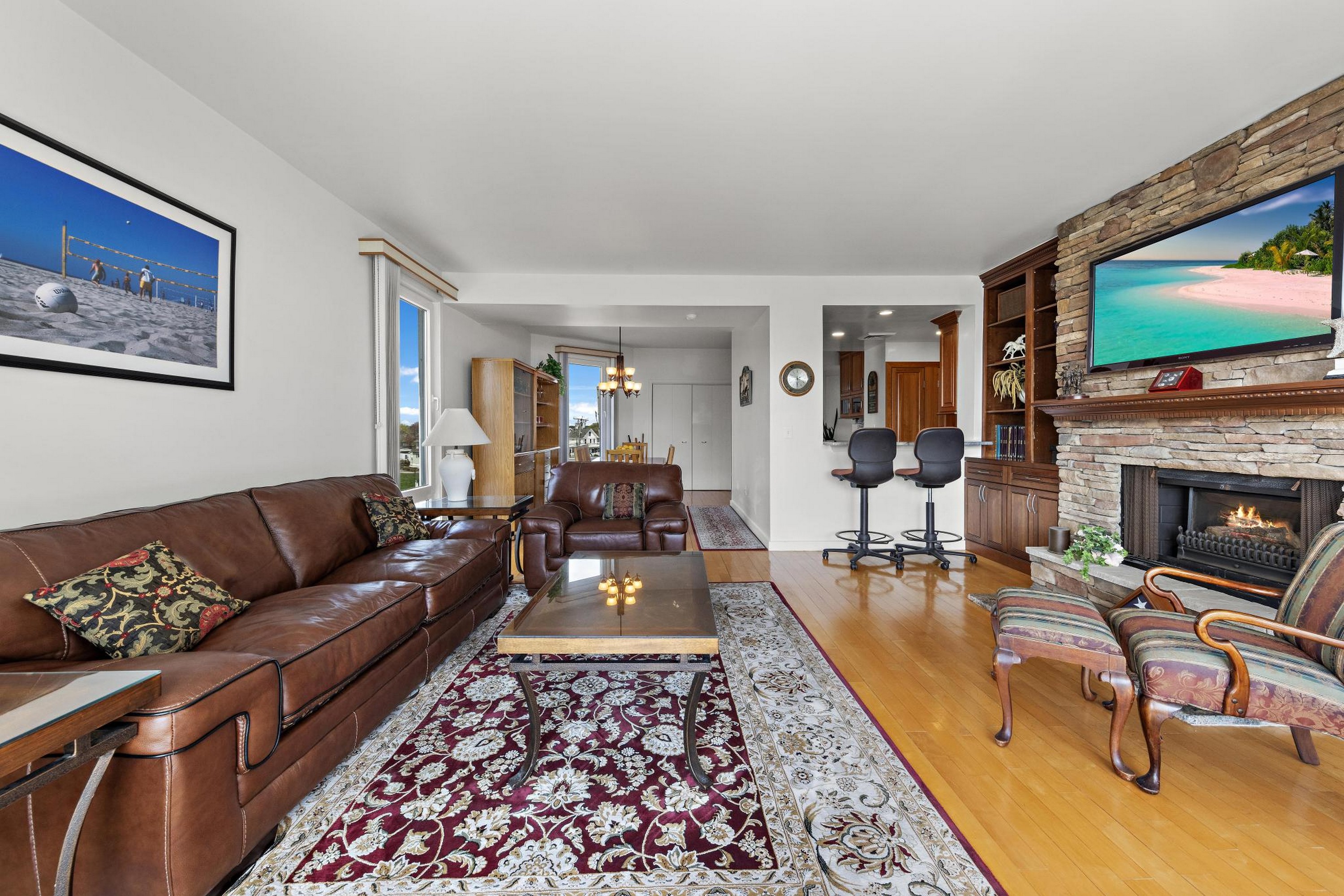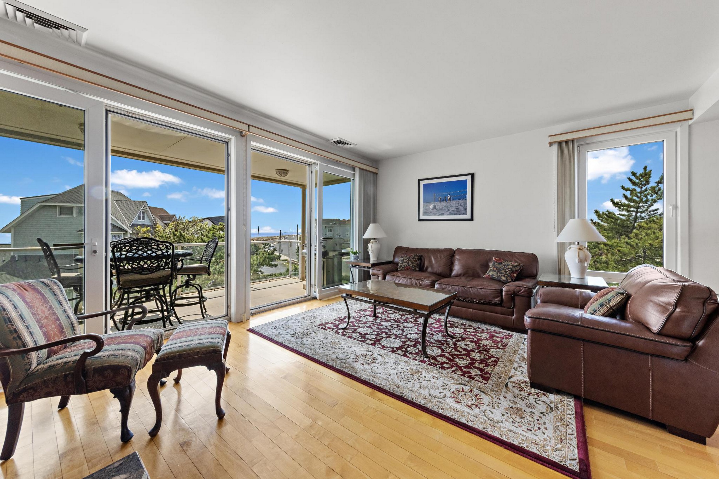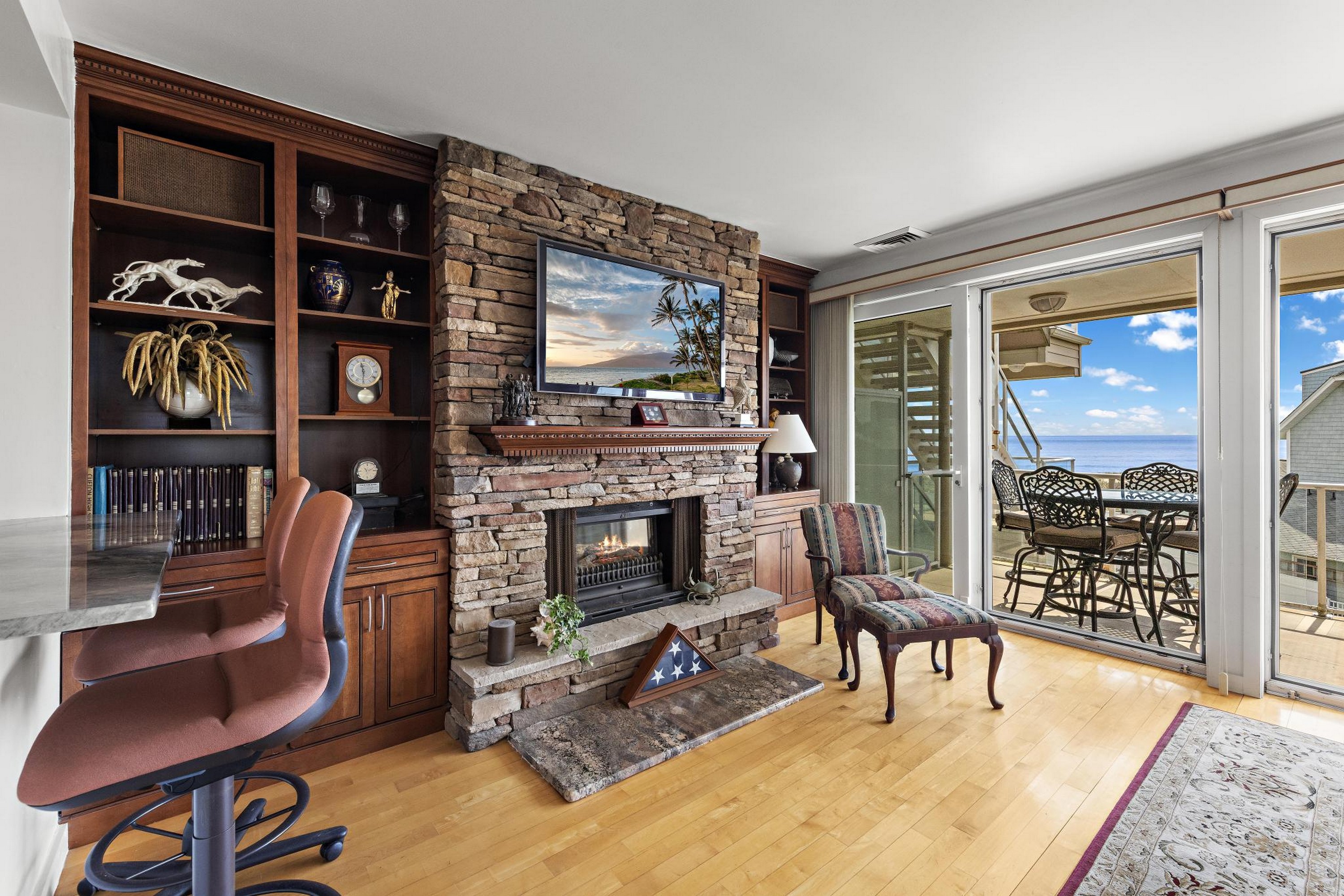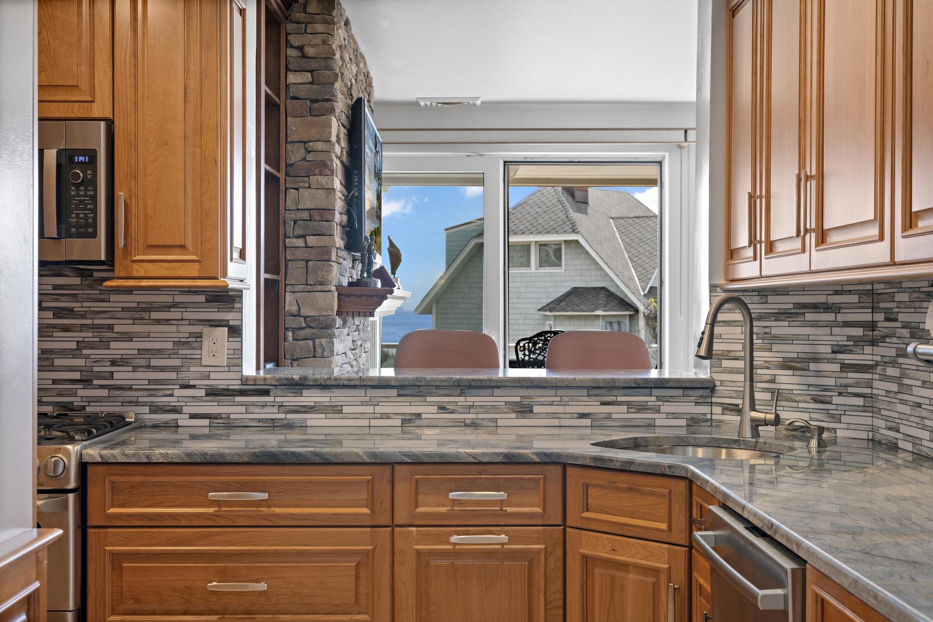Sea Dunes is one of the only oceanfront condominium buildings in Long Branch with direct private beach access, and with just 24 units in the entire building, Unit H2 represents the kind of opportunity that does not come up often. A fully updated, end-unit with views of the Atlantic Ocean, three private balconies, and a permanently protected sightline to Seven Presidents Oceanfront Park. The 2025 kitchen renovation features 42'' natural cherry solid wood cabinets extending into the hallway, new stainless steel appliances, and granite countertops. All updated bathrooms, each with new cabinets, fixtures, sinks, and toilets. You will wake up to ocean views from your bed in the primary bedroom which also provides two walk-in closets. The living room features a custom built-in wall unit, a stone fireplace with mantel and gas insert, and a dedicated gas line extending to the deck for the infrared gas grill. Natural hardwood floors run throughout; tile in the kitchen and all bathrooms. Sea Dunes' U-shaped architectural design positions both the living room and the primary bedroom with ocean views. Amazing cross-ventilation provides an advantage no interior unit can match, with little reliance on air conditioning. All windows and 5 sliding glass doors are custom-fitted to open fully or crack at the top and can be locked in the open position with the security system engaged. New central air conditioning was installed in 2025. Two reserved parking spaces and a private storage unit are included, plus an outdoor shower after you've spent the day at the beach. Long Branch's waterfront restaurants and boardwalk close by, and direct NJ Transit rail service to New York Penn Station runs from Long Branch station minutes away. The Seastreak ferry nearby leads to midtown West 39th Street, Brookfield Place, Battery Maritime Building and East 35th Street. 477 Ocean ave is positioned with quick access to the Garden State Parkway and Routes 35 and 36.