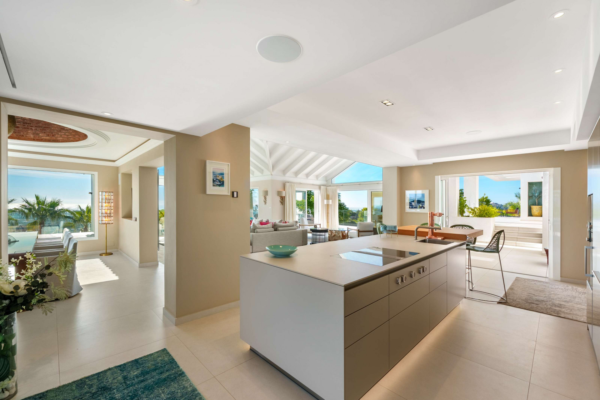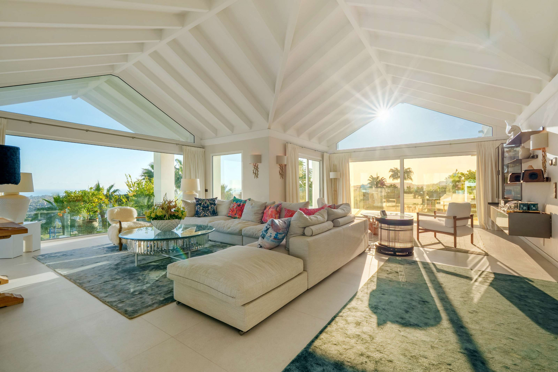 Situated in the elevated enclave of Puerto del Almendro in Benahavís, this exceptional south facing villa offers a rare combination of scale, privacy, and panoramic views across the Mediterranean coastline and surrounding mountains. Set on an expansive plot of over 7,800 square metres, the property blends contemporary Mediterranean architecture with a tranquil natural setting, creating a residence defined by space, light, and refined living.Ideally positioned, the villa enjoys a peaceful hillside location while remaining within easy reach of Marbella, Puerto Banús, renowned golf courses, international schools, and everyday amenities. The setting offers a balance between seclusion and accessibility, appealing to those seeking discretion without compromising on convenience.The residence comprises a main villa and an independent guest house, together offering nine bedrooms and nine en suite bathrooms across more than 1,100 square metres of built space. Generous interiors with expansive glazing connect seamlessly to outdoor terraces, landscaped gardens, and two swimming pools. Additional features include a private cinema room, wine cellar, and fully equipped gym, while extensive parking and well planned outdoor areas enhance both comfort and functionality throughout the property.Christie's Insight:Set within one of Benahavís' most established residential areas, this villa stands out for its exceptional scale, independent guest accommodation, and elevated position, offering a private and versatile lifestyle with uninterrupted views and close proximity to the best of the Costa del Sol.