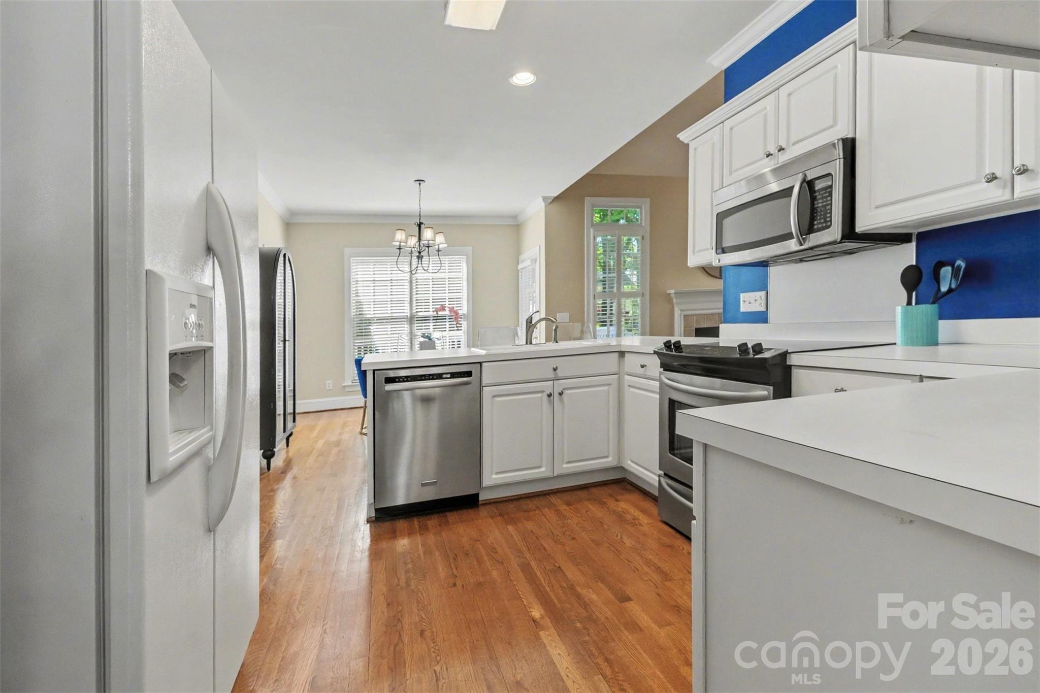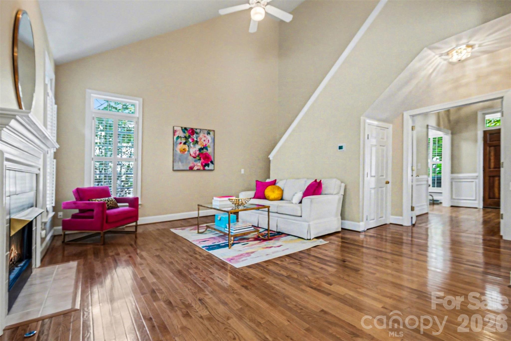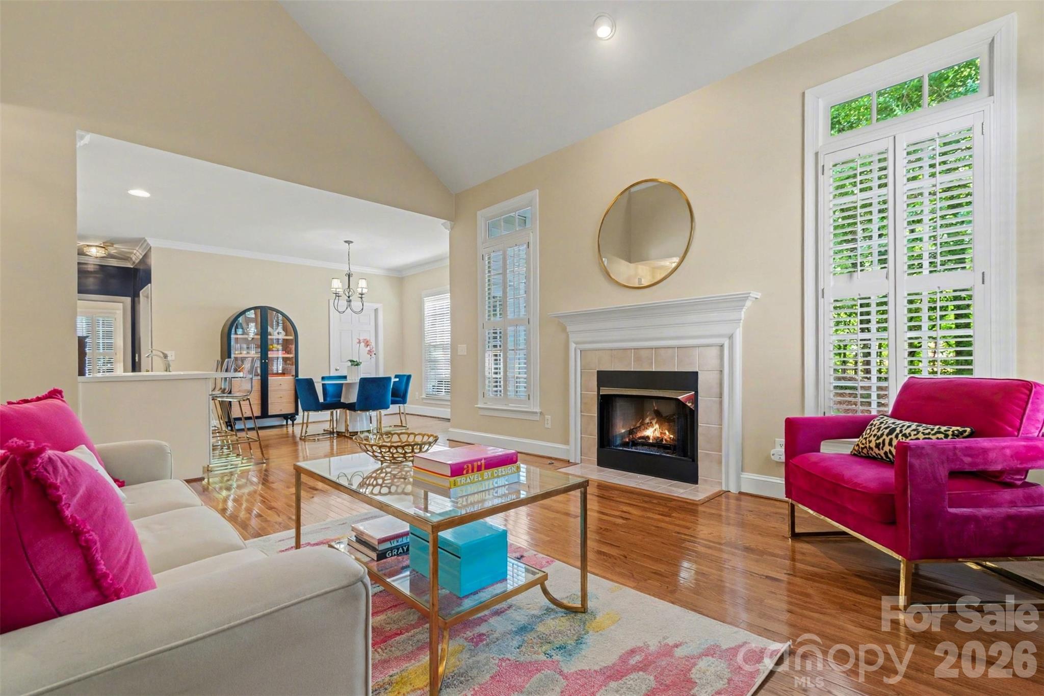 Welcome home! From the moment you arrive, the inviting rocking chair front porch sets the tone - warm, welcoming, and ready to greet you. Step inside this beautifully maintained two-story home where original hardwood floors lead you through a traditional yet flexible layout, including a formal dining room and a living room or home office. Just beyond, the impressive two-story family room with a cozy gas fireplace opens seamlessly to the kitchen, complete with an eat-in dining area - perfect for everyday living and entertaining. The main level also features a spacious primary suite with a private ensuite bath, along with a convenient laundry room, half bath, and direct access to the two-car garage. Step outside to enjoy the fenced backyard and deck, offering a peaceful, wooded backdrop ideal for relaxing or hosting gatherings. Upstairs, you'll find three generously sized guest bedrooms, a full bath, and an expansive flex room designed for fun and function - complete with a custom bar/beverage center, refrigerator, and pool table. Just off the landing, a large walk-in storage room with built-in shelving and pull-down attic access adds even more practicality. Additional highlights include plantation shutters, updated lighting, and a private setting within the charming, walkable Orchid Hills community - just minutes from shopping, dining, I-485, and entertainment. This is more than a house - it's a place to truly feel at home. Don't miss your chance to make it yours! The following items do not convey with the property: Washer & dryer; navy bookcase in office; teal bookcase in upstairs movie room and the outdoor grill do not convey.
