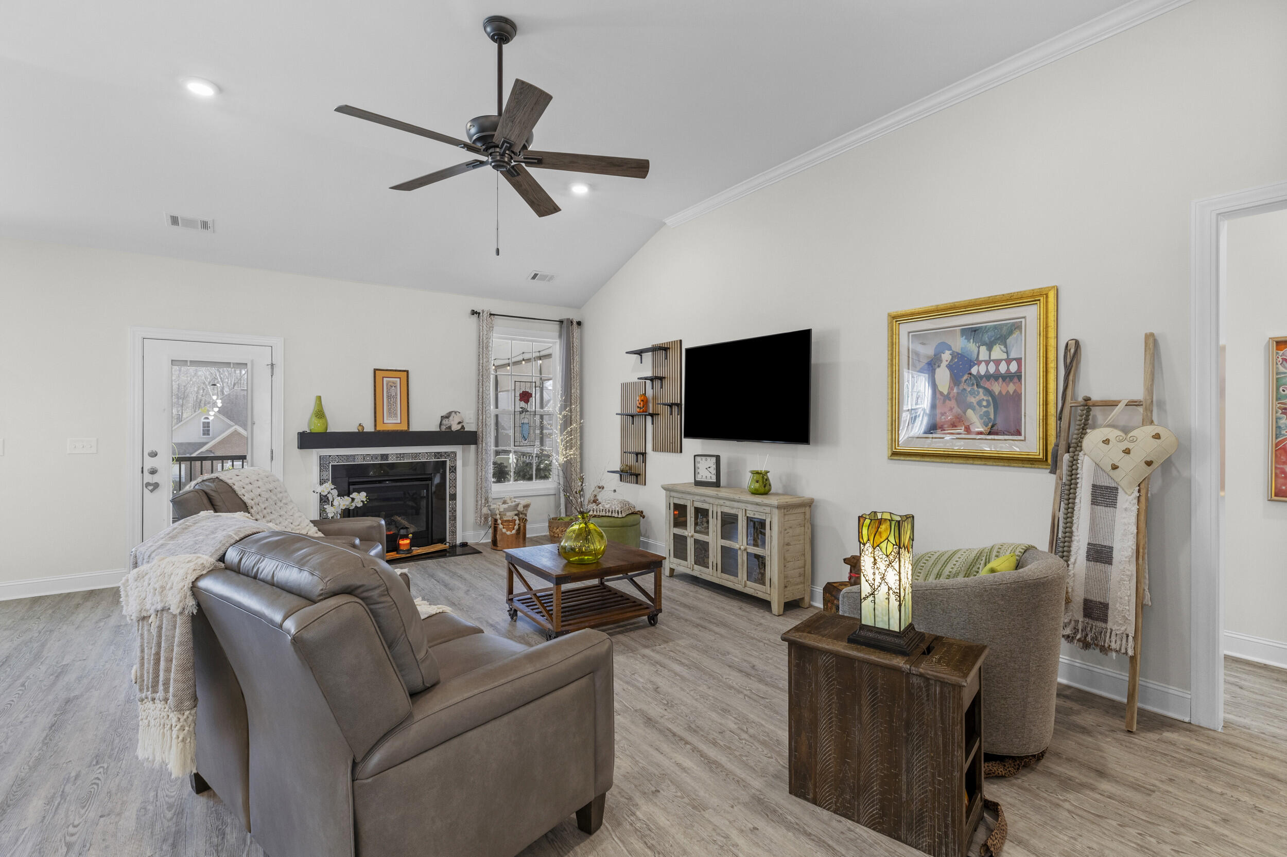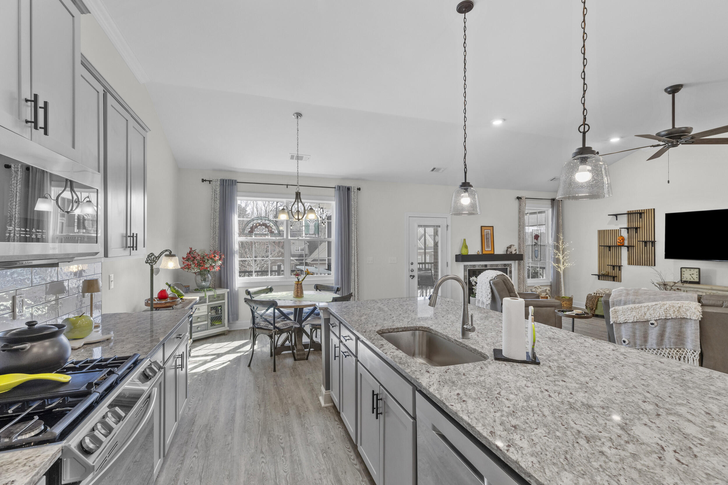 Welcome to this stunning solid brick home in the highly desirable Mount Vintage community, featuring modern design, a thoughtfully designed floor plan, and exceptional amenities. This 2,513 sq. ft. smart home features 4 bedrooms, 3 full bathrooms, and a 2-car attached garage. The inviting foyer opens up to an 11' high ceilings and open concept floor plan which seamlessly connects the kitchen, dining, and living areas, creating an ideal space for both everyday living and entertaining. The spacious kitchen features a large island, a walk-in pantry, ample cabinetry, and overlooks the inviting living room complete with a cozy fireplace. The primary suite is conveniently located on the main level and offers a generous walk-in closet, an en-suite luxury bathroom with barn door entry, double vanities, soaking tub, separate tiled shower, and water closet. Also on the main level are two additional bedrooms that share a full bathroom, along with a dedicated laundry room for added convenience. Upstairs, you'll find a fourth bedroom with its own attached full bath and large closet, making it perfect for guests or a private retreat. The spacious bonus room offers endless possibilities: use it as a home office, media room, playroom, fitness area, hobby space, or additional guest area. Step outside to enjoy the gorgeous screened-in porch and attached Trex deck with aluminum railing, great for relaxing or entertaining while overlooking the beautifully landscaped yard. Perfect area to admire colorful sunsets!! Yard all around this beautiful house features complete 7-zones sprinkler system throughout to help keep everything lush and green. Interior finishes include durable LVP flooring throughout the bedrooms, closets, and main areas, tile in the bathrooms and laundry room, and carpet on the stairs with original oak treads underneath. Located in the sought-after Mount Vintage community, residents enjoy outstanding amenities including a 27 hole golf course, swimming, bocce ball courts, tennis, fitness center, clubhouse, community garden and scenic walking areas, all within a peaceful and welcoming neighborhood. This move-in-ready home offers modern comfort, flexible living spaces, and access to an incredible community lifestyle. Schedule your showing today! Up to 1% Lender Credit towards closing costs or rate buydown with preferred lender!
