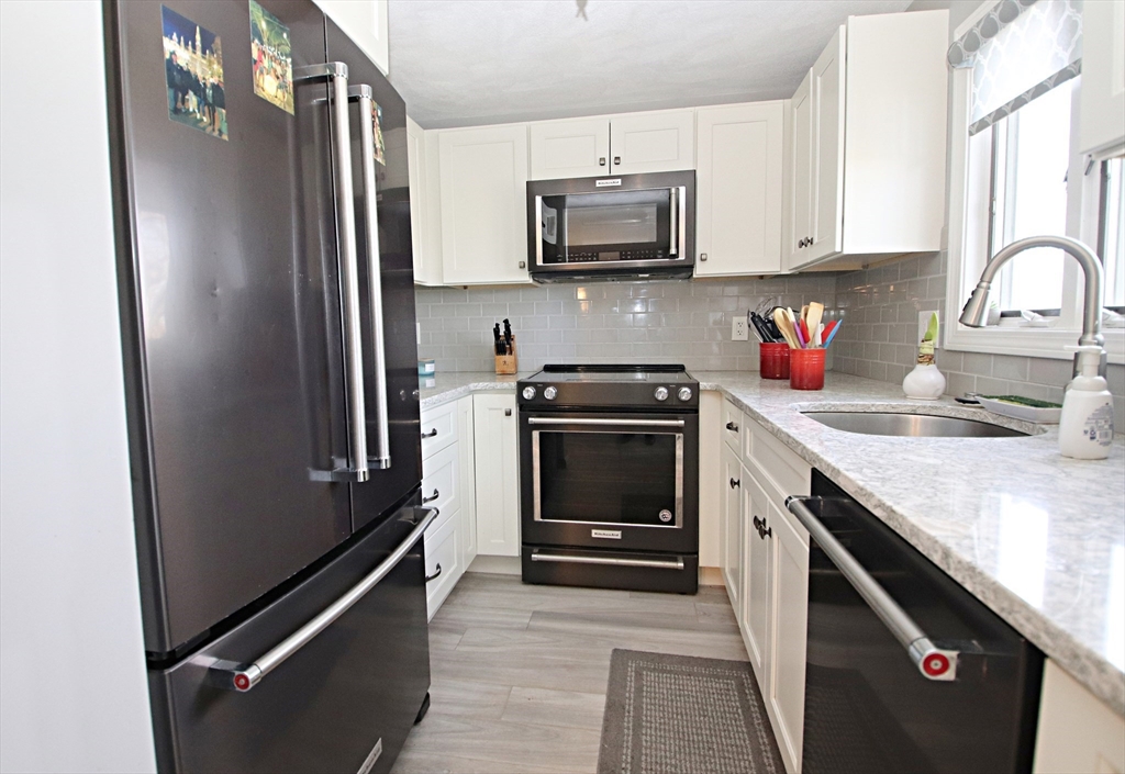Wonderful Periwinkle Park townhouse featuring 6 rooms, 2-3 bedrooms, 2 full baths, beautifully, updated galley kitchen with stunning granite countertops and glass backsplash, top-of-the-line Kitchen Aid appliances open to dining room with slider to deck, spacious living room with newer laminate flooring, large primary bedroom with double closets, finished loft with newer skylight - great for 3rd bedroom, family room or office (great for working from home!), one car garage under, updated hot water heater and central air conditioning condenser (2023). Conveniently located just outside of Saugus Center. Units rarely become available in this sought-after complex. Come see why! "Welcome Home to Periwinkle Park!"