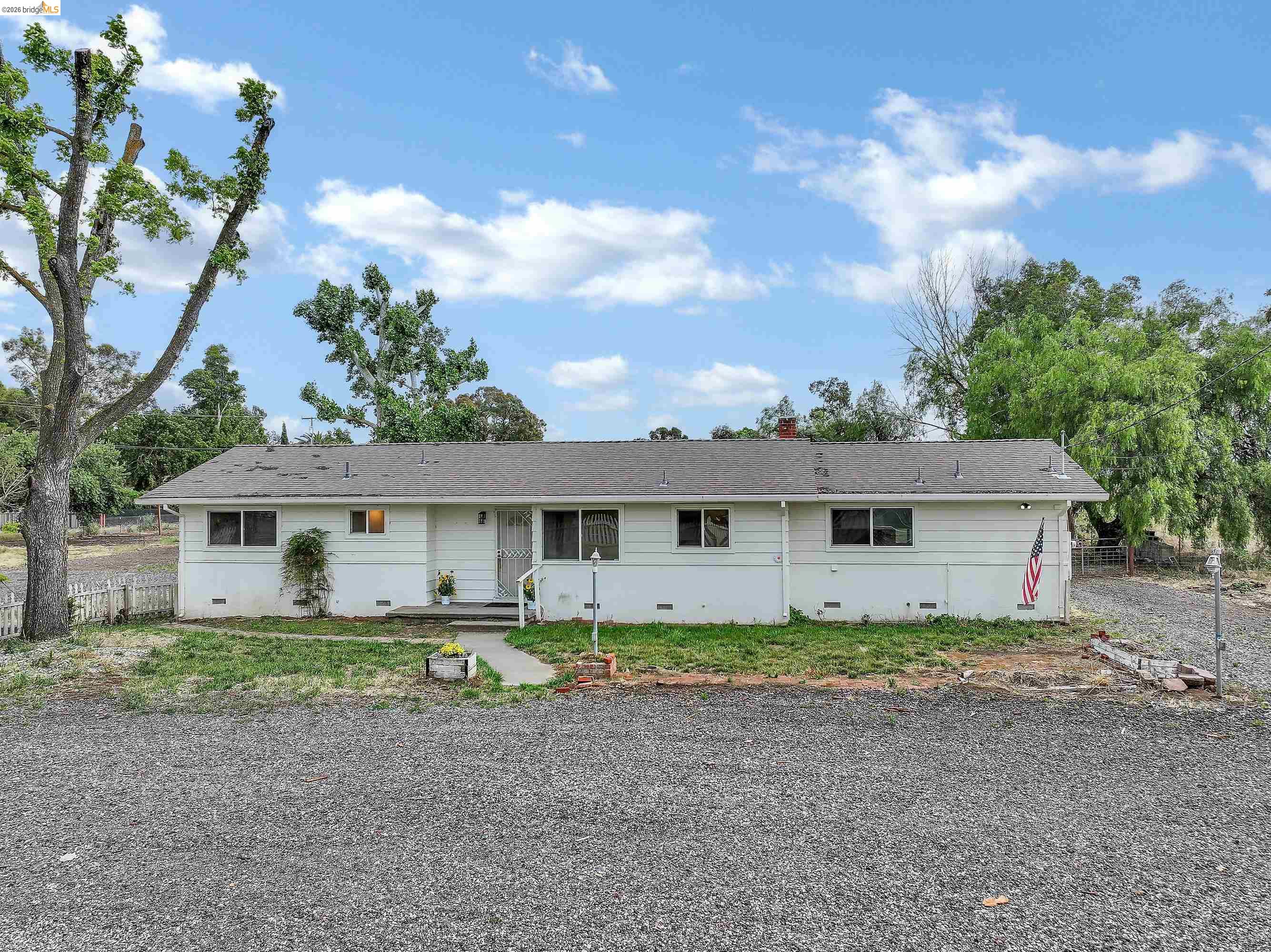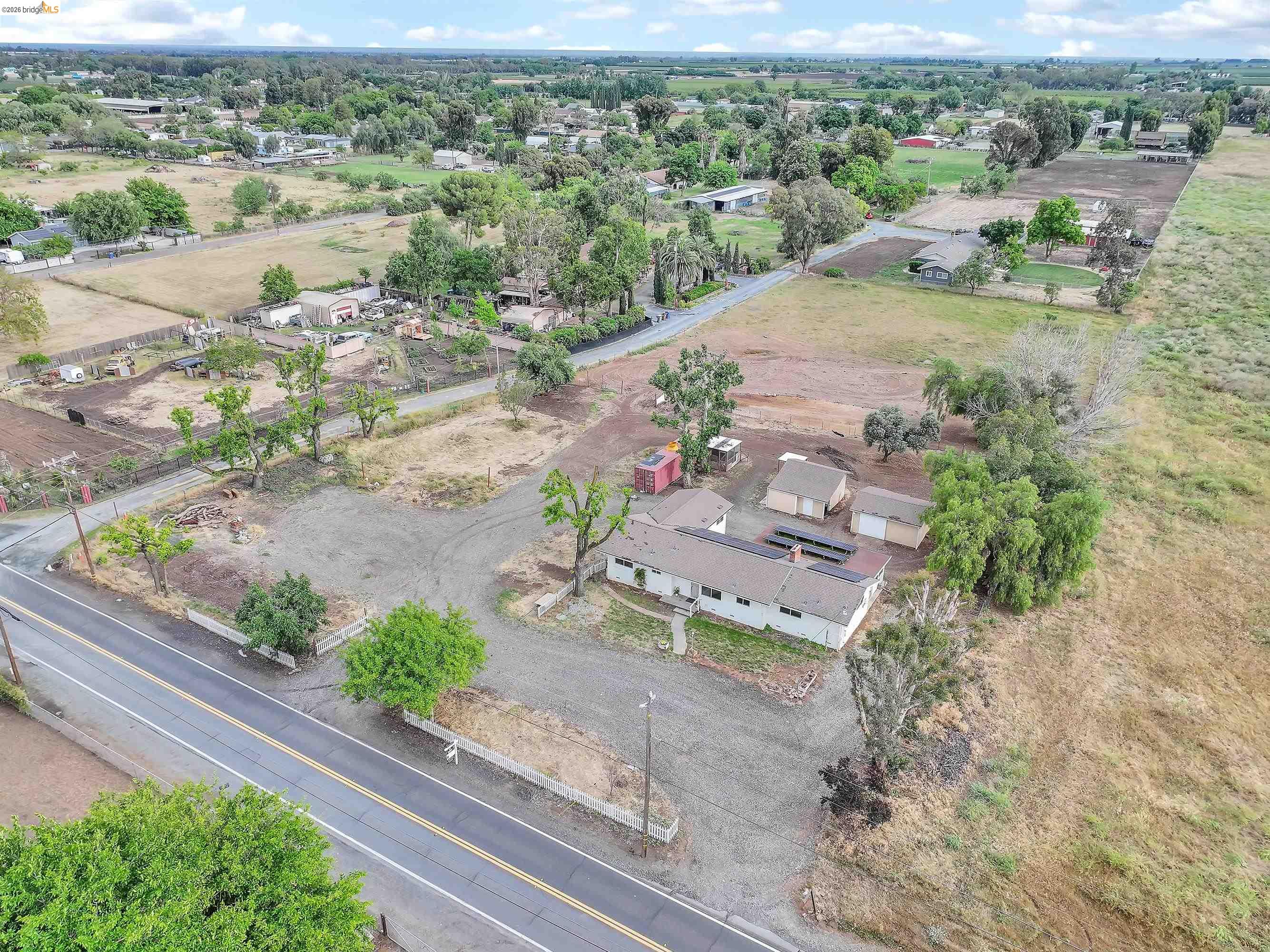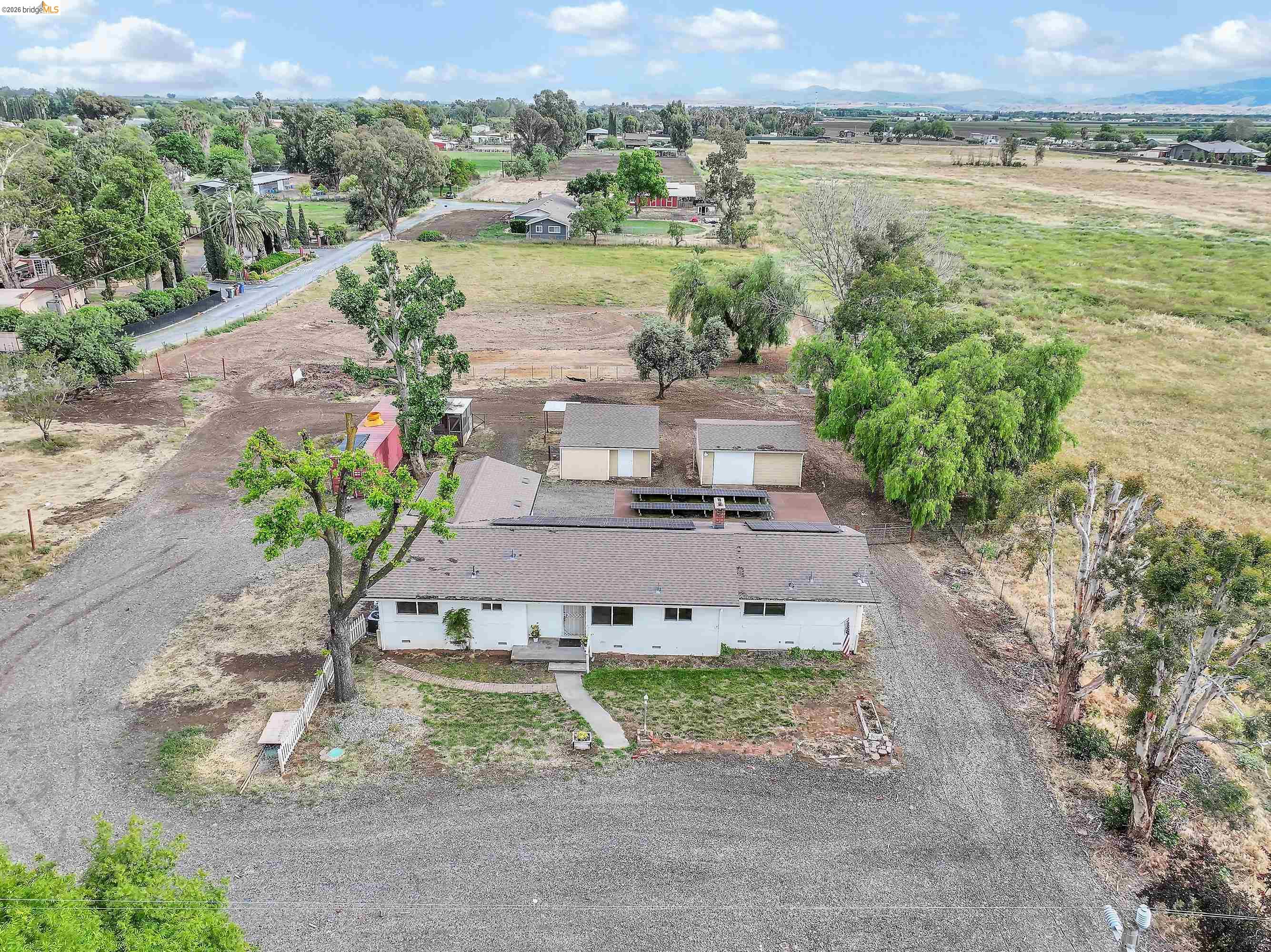 Experience the perfect blend of country living and city convenience with this exceptional opportunity to own a 2.1 acre estate just outside the city limits. Seller's Current Rocket Mortgage Loan with 3% interest rate may be assumable under certain conditions. Please inquire. Zoned A-2, the property offers a wide range of possibilities for agricultural, recreational, or lifestyle use. The front parcel features a 1702 sq ft single-story home with four bedrooms and two bathrooms. In addition, you'll find a comfortable living room with a wood-burning stove, separate family room with a fireplace, an eat-in kitchen, and a spacious multipurpose room/covered patio ideal for a home office, gym, playroom, hobby or recreational space. The property is well-equipped with a one car detached garage, large red storage container with racks, and an additional outbuilding, providing ample space for storage, equipment, or projects. Enjoy scenic Mount Diablo views, mature trees that have been recently pruned, and fencing for added privacy and functionality. Recent 2022 upgrades include energy-efficient HVAC, updated windows, custom glass sliding door, and exterior reflective coating for improved comfort and efficiency. Owned Solar system further helps to reduce energy costs. A rare opportunity to enjoy the space, flexibility, and tranquility of rural, unincorporated, Brentwood living, without sacrificing proximity to city amenities. Two parcels are being sold with this sale for a total of 2.1 acres. Come and enjoy the lovely sunsets and Mt. Diablo views from the property. Ranch life is calling. Schedule a showing today before it's gone! Open House on Sunday, 4/26/26 from 4pm to 7pm. Broker Tour on Tuesday, 4/28/26 from 9:30am to 12:00pm and Broker Tour on Wednesday, 4/29/26 from 9:30am to 11:00am.