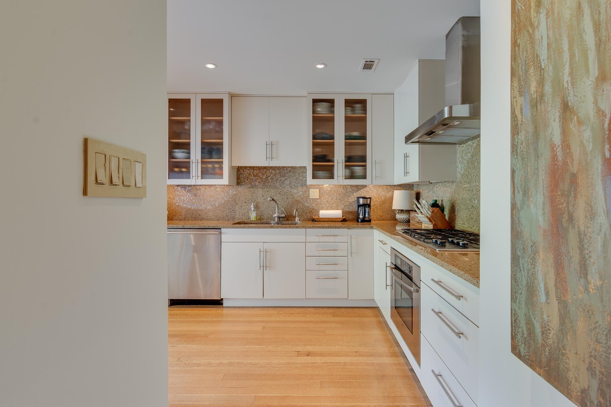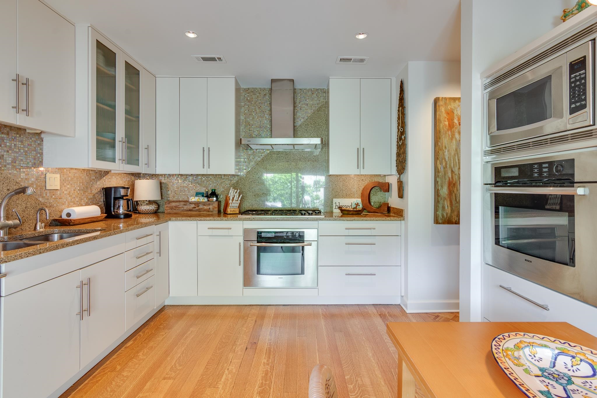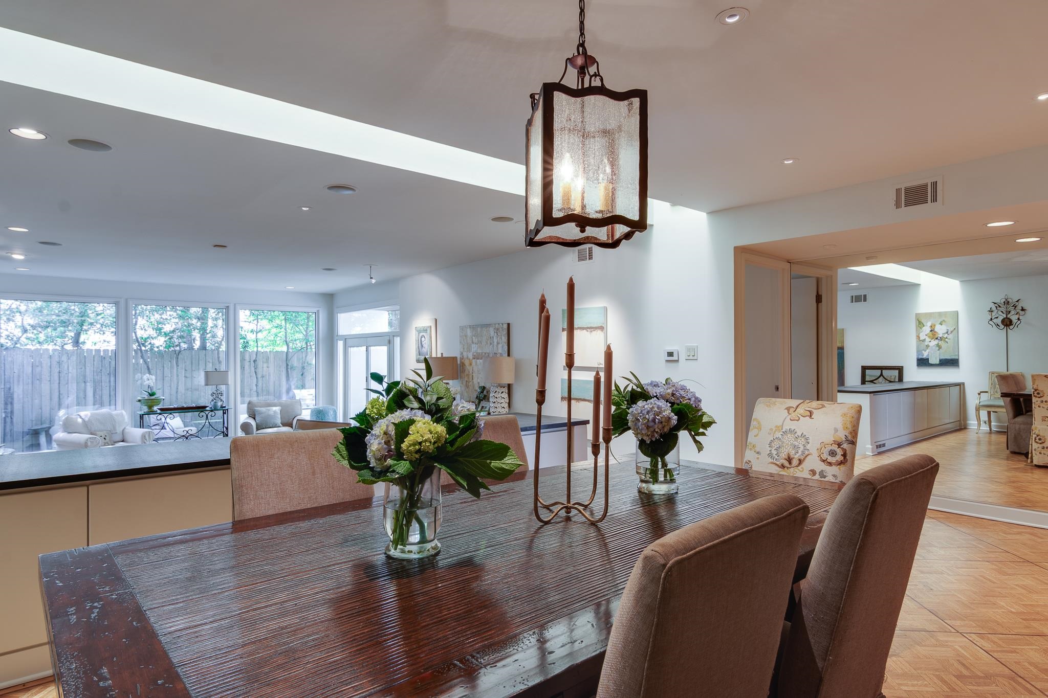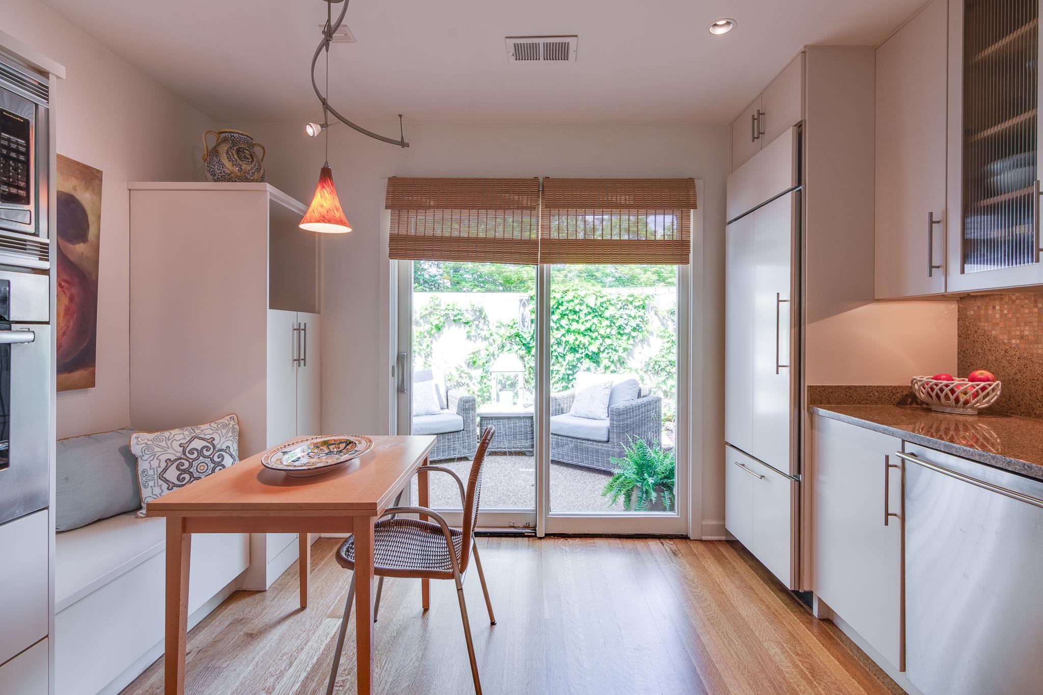 Beautiful Modern Open One level floor plan. Large living room & dining room area. Updated kitchen, granite, Bosch appliances,Gas cook top, Double ovens, microwave, and Sub-Zero Refrigerator. Spacious 2 bedrooms and 2 Baths. Hardwood floors throughout, freshly painted ceilings and walls, large 2 car garage and front and back patios. OWNER/AGENT