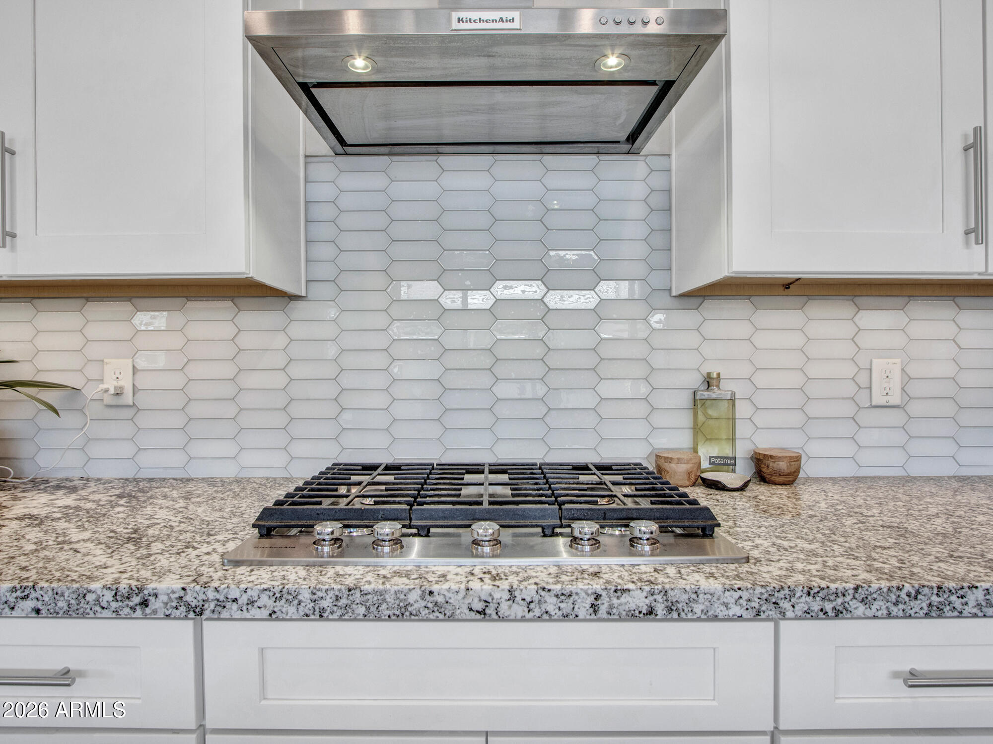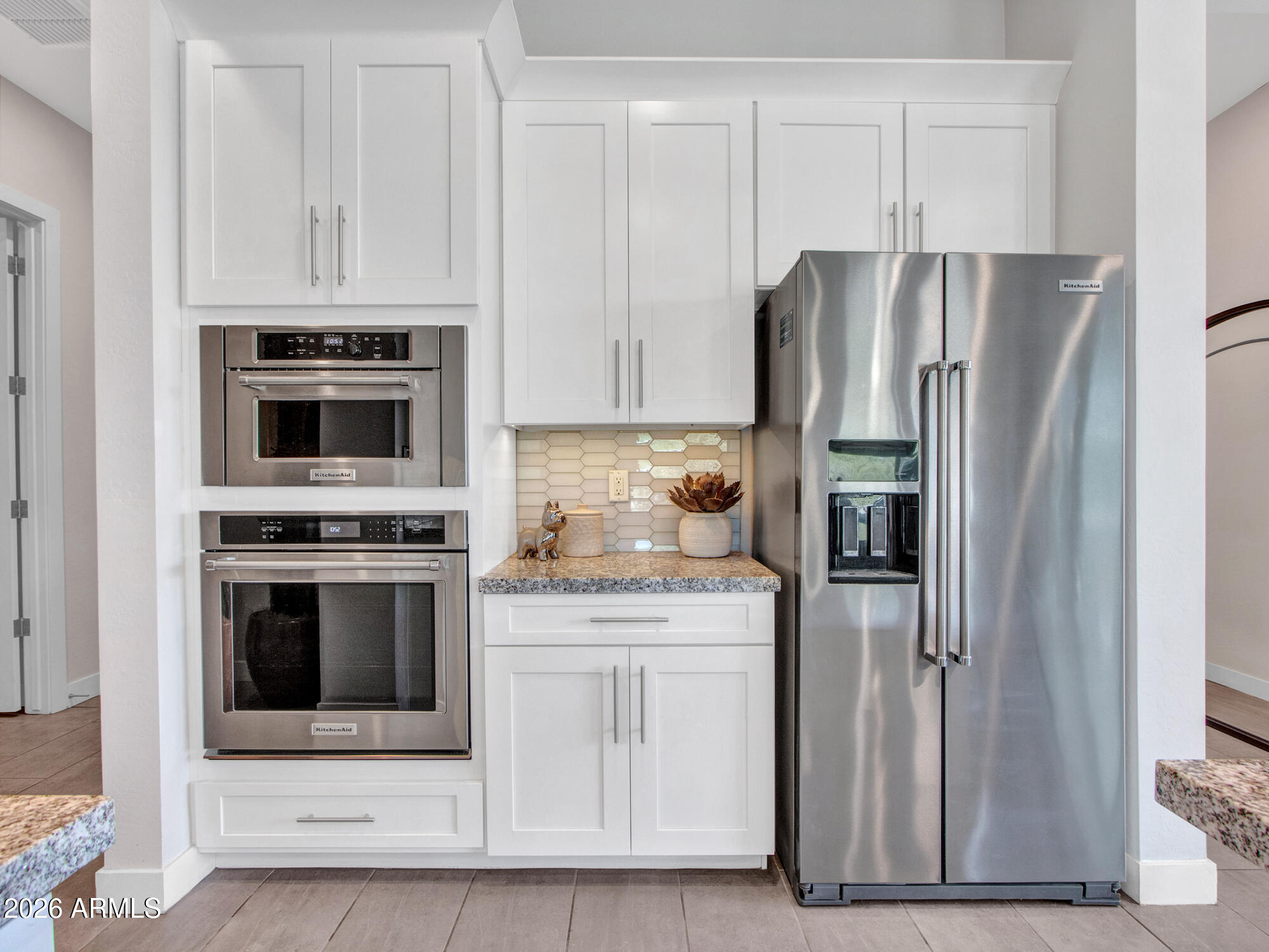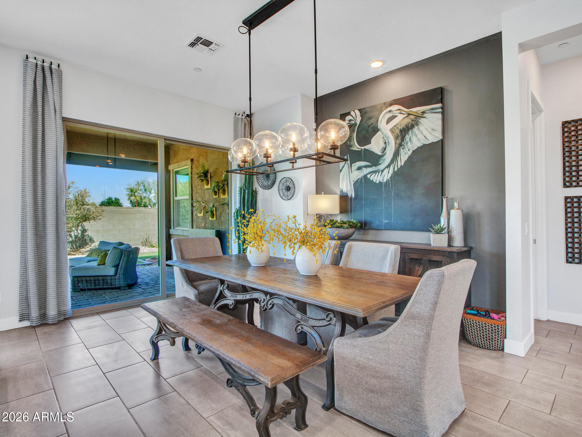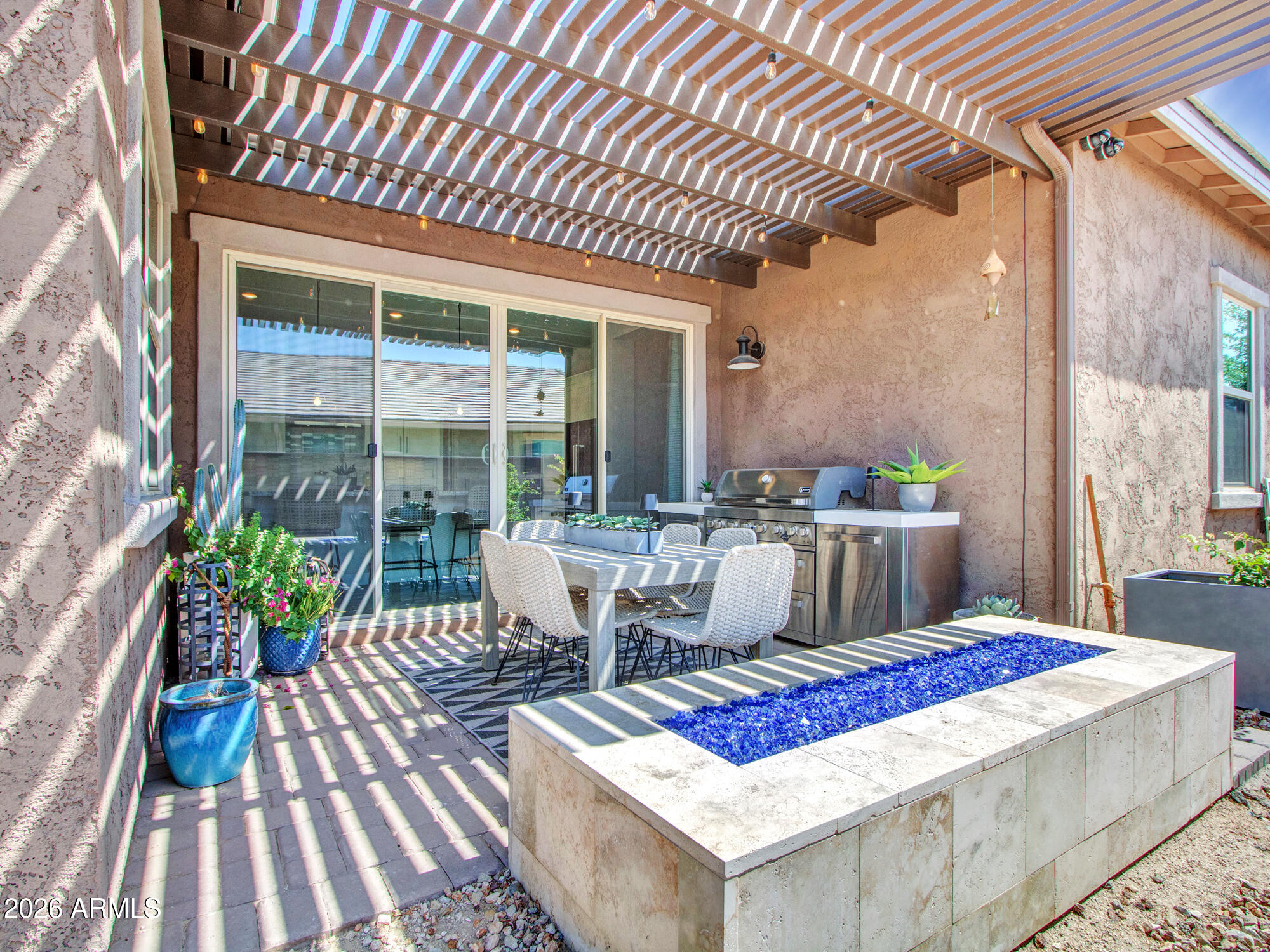 Perfectly positioned in the heart of North Goodyear's most vibrant corridor, this stunning, former Model home offers the ideal blend of modern luxury, comfort, & lifestyle. Nestled within the gated community of Vistas at Palm Valley & adjacent to the Palm Valley Championship West Golf Course, this 2021-built single-story townhome invites you to experience effortless Arizona living at its finest. All the amenities you want are here, including 10' ceilings throughout, custom light fixtures, designer-inspired accent walls, high-end plantation shutters, & elegant drapery to add warmth & sophistication throughout the home. The gourmet kitchen is anchored by an oversized granite island, stainless steel KitchenAid appliances with a sleek 5-burner gas cooktop & abundant cabinetry. A large, center-opening, glass slider opens to a charming Alumawood covered side patio with a gas fire pit perfect for relaxing evenings at home. The great room seamlessly blends dining & living spaces, enhanced by two additional oversized sliding glass doors that lead to the expansive back patio with power privacy/sunshade, and no neighbors behind. The split, primary suite serves as a tranquil escape, with a spa-like bathroom featuring a large walk-in shower, executive-height dual sink vanity, & a generous walk-in closet. Additional highlights include a well-appointed laundry room with sink & cabinetry. Residents of this desirable community also enjoy access to a resort-style pool & barbecue area. Located within highly rated school boundaries & just minutes from major freeways, shopping, dining, & entertainment, this home offers not only exceptional living but also unmatched convenience. Welcome home!