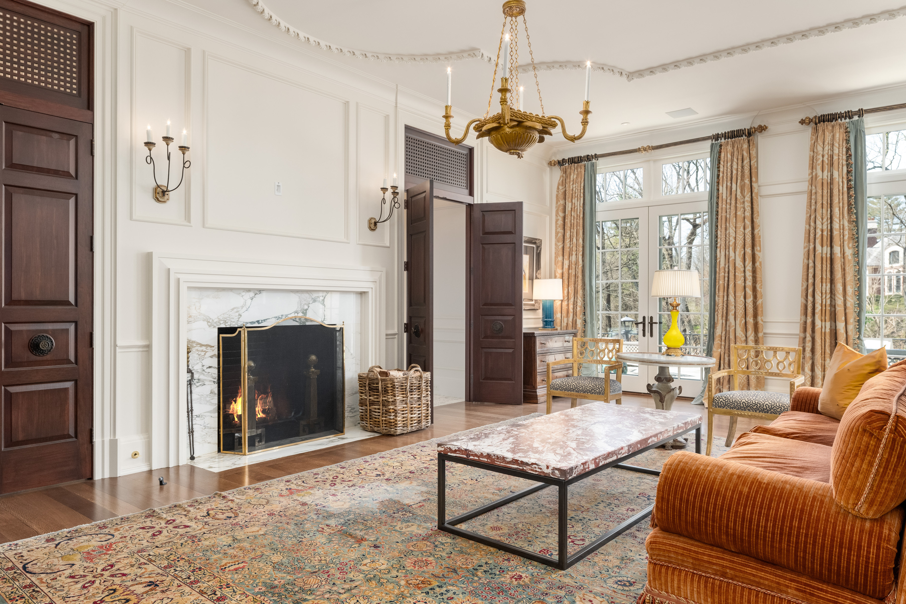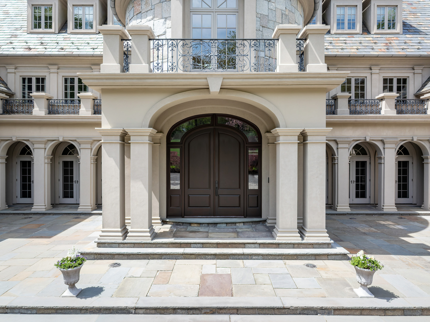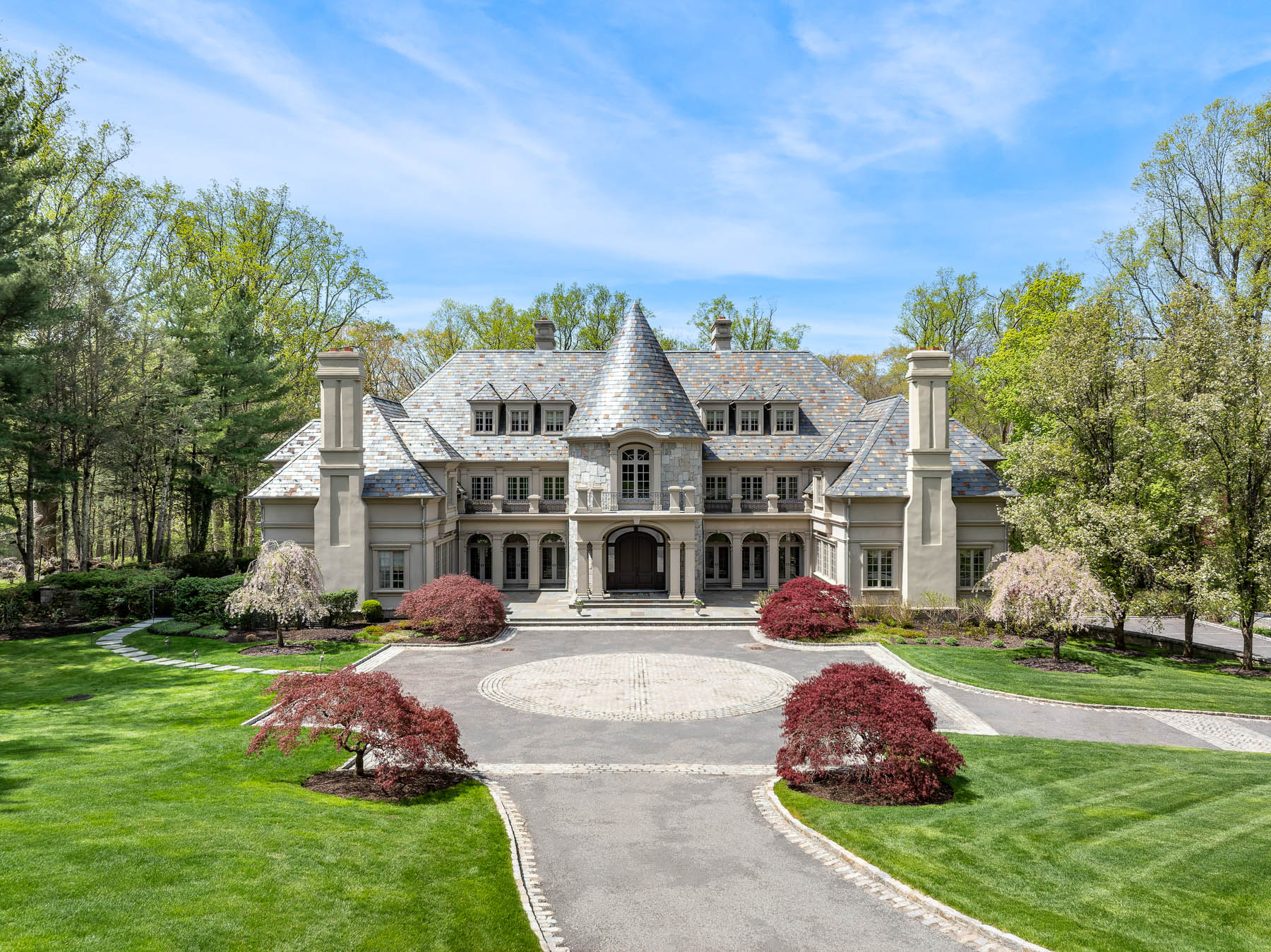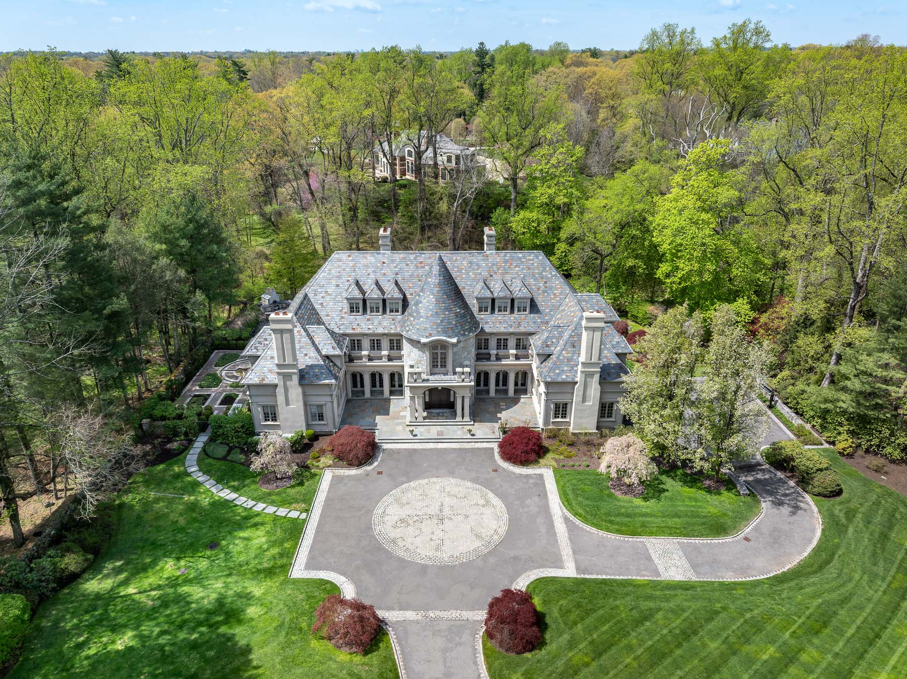 A gated drive opens to this elegant six-bedroom Mid-Country Manor overlooking tranquil views of Horseneck Brook. A stone courtyard introduces the dramatic four-story residence with elegant foyer, where sweeping butterfly staircases and limestone floors create a striking architectural welcome. From the gracious gallery hall, beautifully proportioned formal and informal rooms unfold-including generous living and dining rooms, a family room, chef's kitchen with breakfast room and a private paneled library-all distinguished by hardwood floors, bespoke detailing, and soaring ceilings. A gracious ground floor guest suite completes this level. The serene primary suite offers a spacious retreat with fireplace, luxurious bathrooms, generous dressing rooms and complemented by an elegant sitting room with its own fireplace. Four additional en-suite bedrooms are located on the second floor. The third level offers versatile living space, including a custom home office, playroom, and full bathroom. The walk-out lower level is thoughtfully designed with a pool cabana, sauna and pool bathroom, wine cellar, gym, game room, mudroom, and direct access to the three-car garage. Outdoors, a pool, spa, and outdoor kitchen overlook the gently flowing brook and beautifully landscaped grounds. Ideally situated in the heart of Greenwich, this exceptional residence seamlessly blends privacy, architectural character, and convenience.