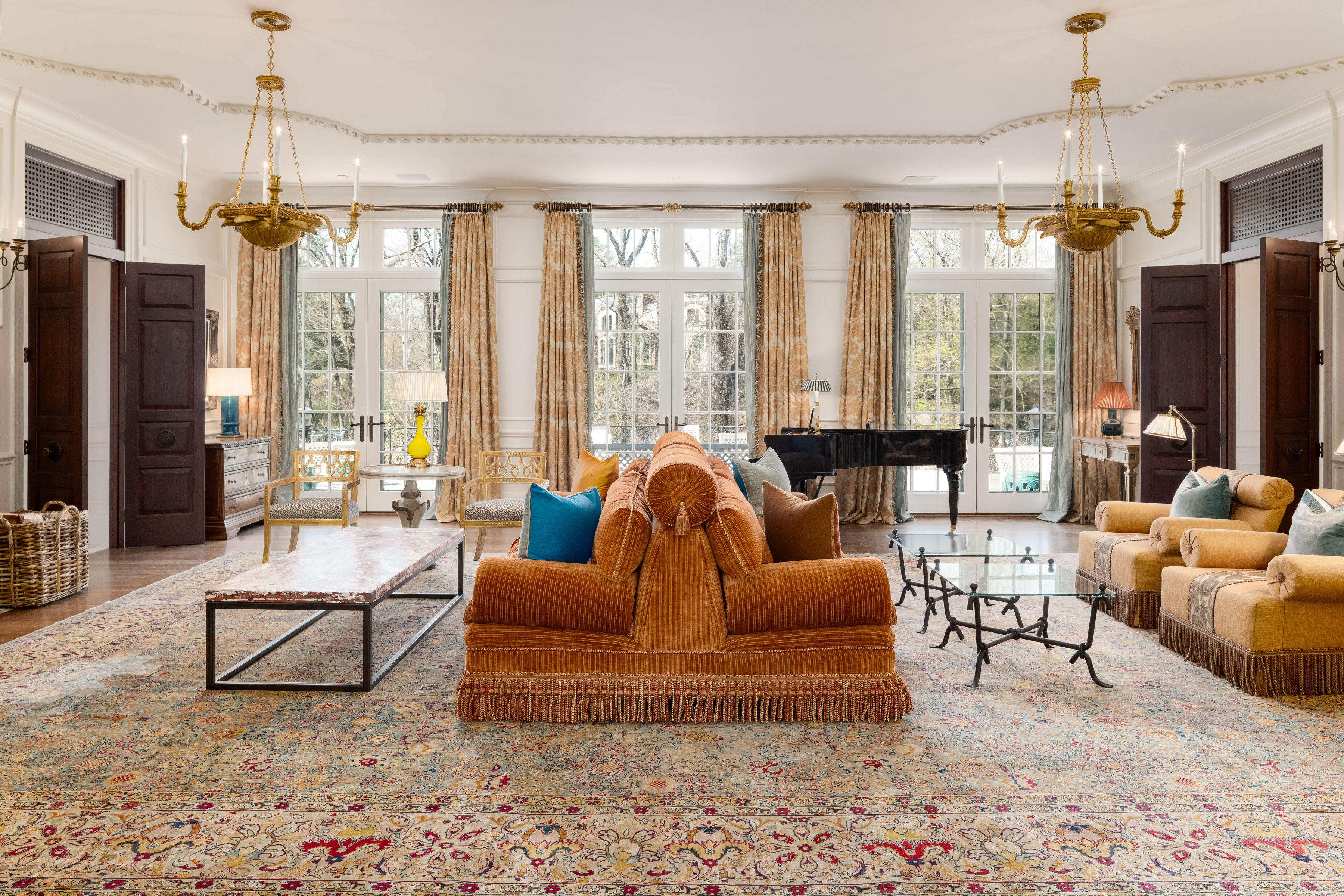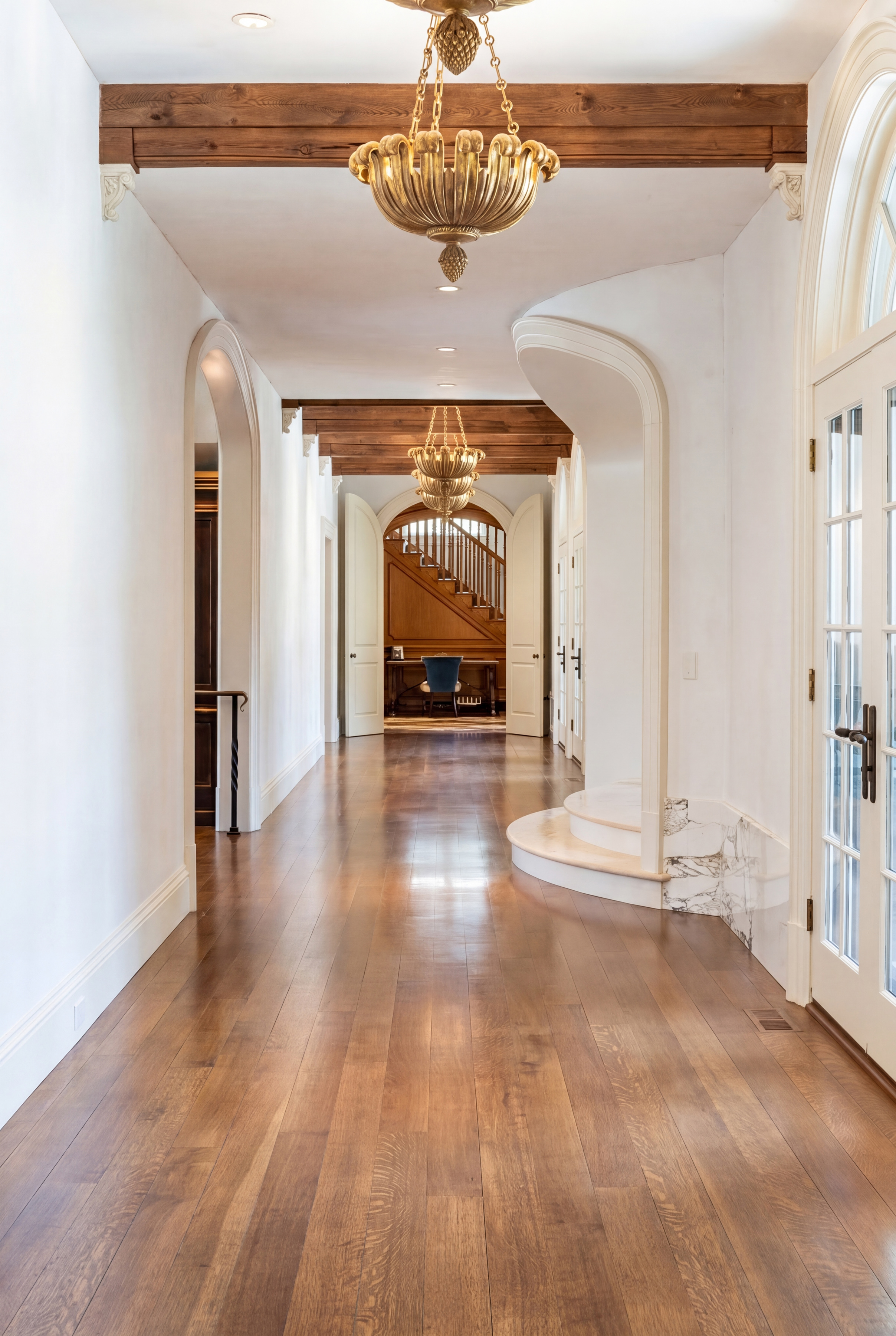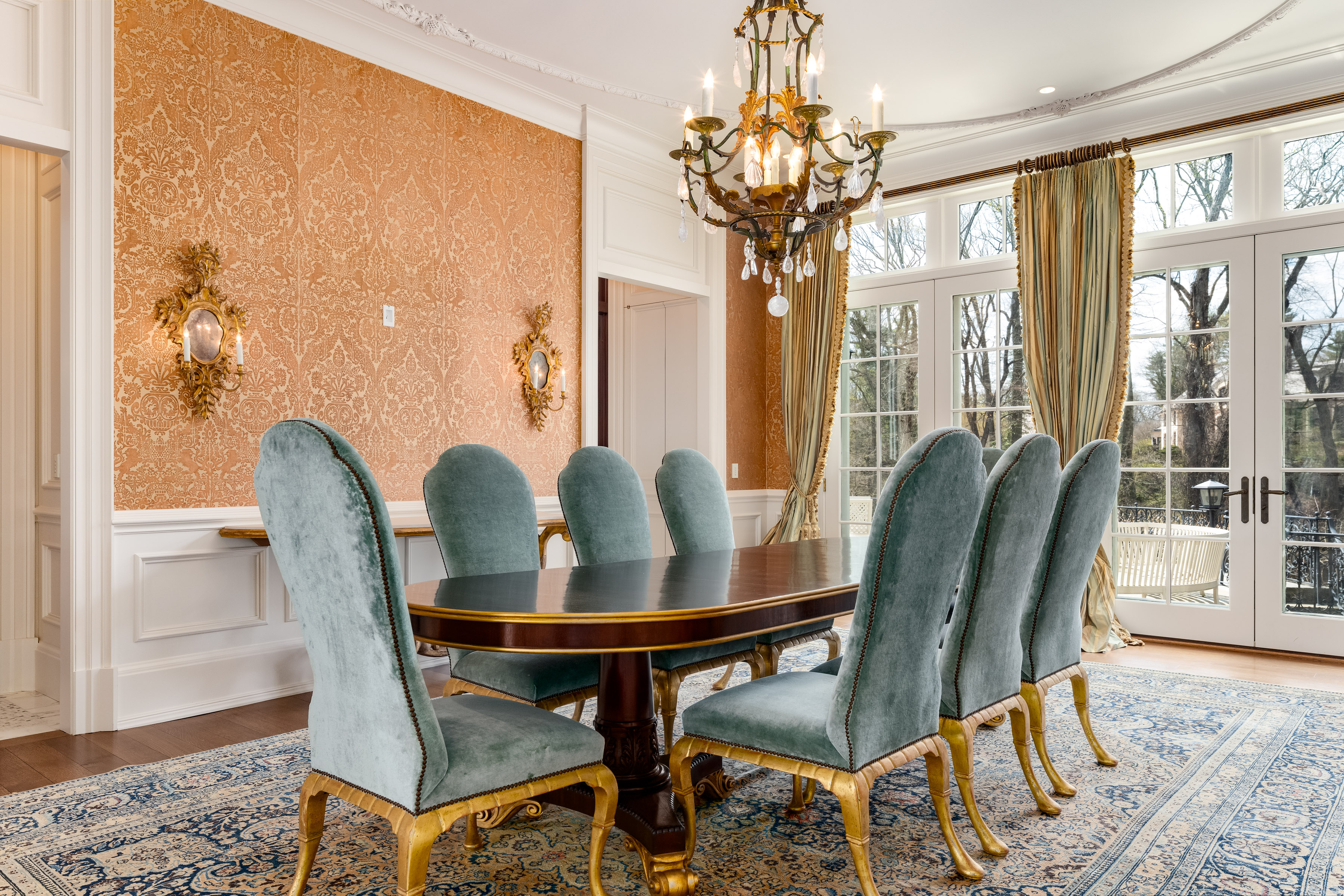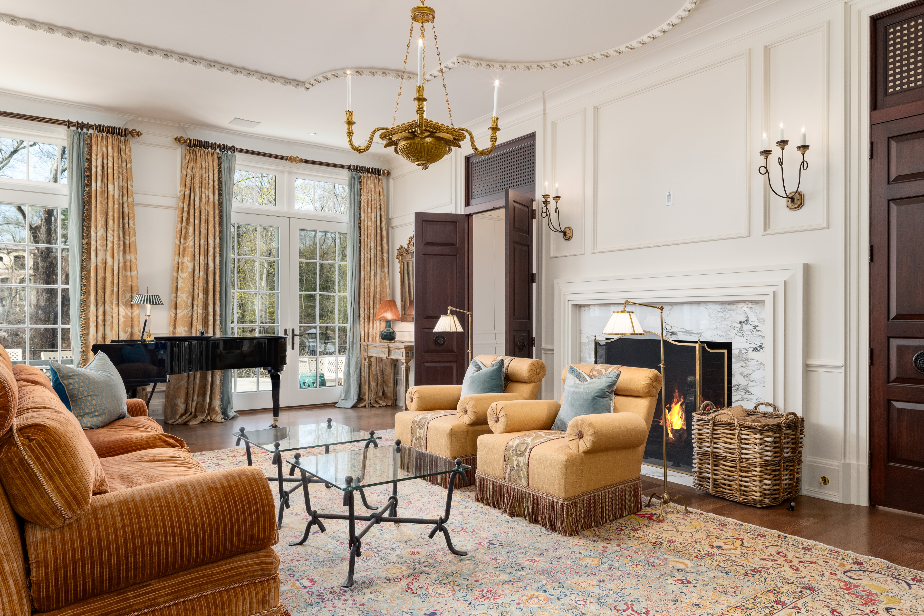 A gated drive opens to this elegant six-bedroom Mid-Country Manor overlooking tranquil views of Horseneck Brook. A stone courtyard introduces the dramatic four-story residence with elegant foyer, where sweeping butterfly staircases and limestone floors create a striking architectural welcome. From the gracious gallery hall, beautifully proportioned formal and informal rooms unfold-including generous living and dining rooms, a family room, chef's kitchen with breakfast room and a private paneled library-all distinguished by hardwood floors, bespoke detailing, and soaring ceilings. A gracious ground floor guest suite completes this level. The serene primary suite offers a spacious retreat with fireplace, luxurious bathrooms, generous dressing rooms and complemented by an elegant sitting room with its own fireplace. Four additional en-suite bedrooms are located on the second floor. The third level offers versatile living space, including a custom home office, playroom, and full bathroom. The walk-out lower level is thoughtfully designed with a pool cabana, sauna and pool bathroom, wine cellar, gym, game room, mudroom, and direct access to the three-car garage. Outdoors, a pool, spa, and outdoor kitchen overlook the gently flowing brook and beautifully landscaped grounds. Ideally situated in the heart of Greenwich, this exceptional residence seamlessly blends privacy, architectural character, and convenience.
