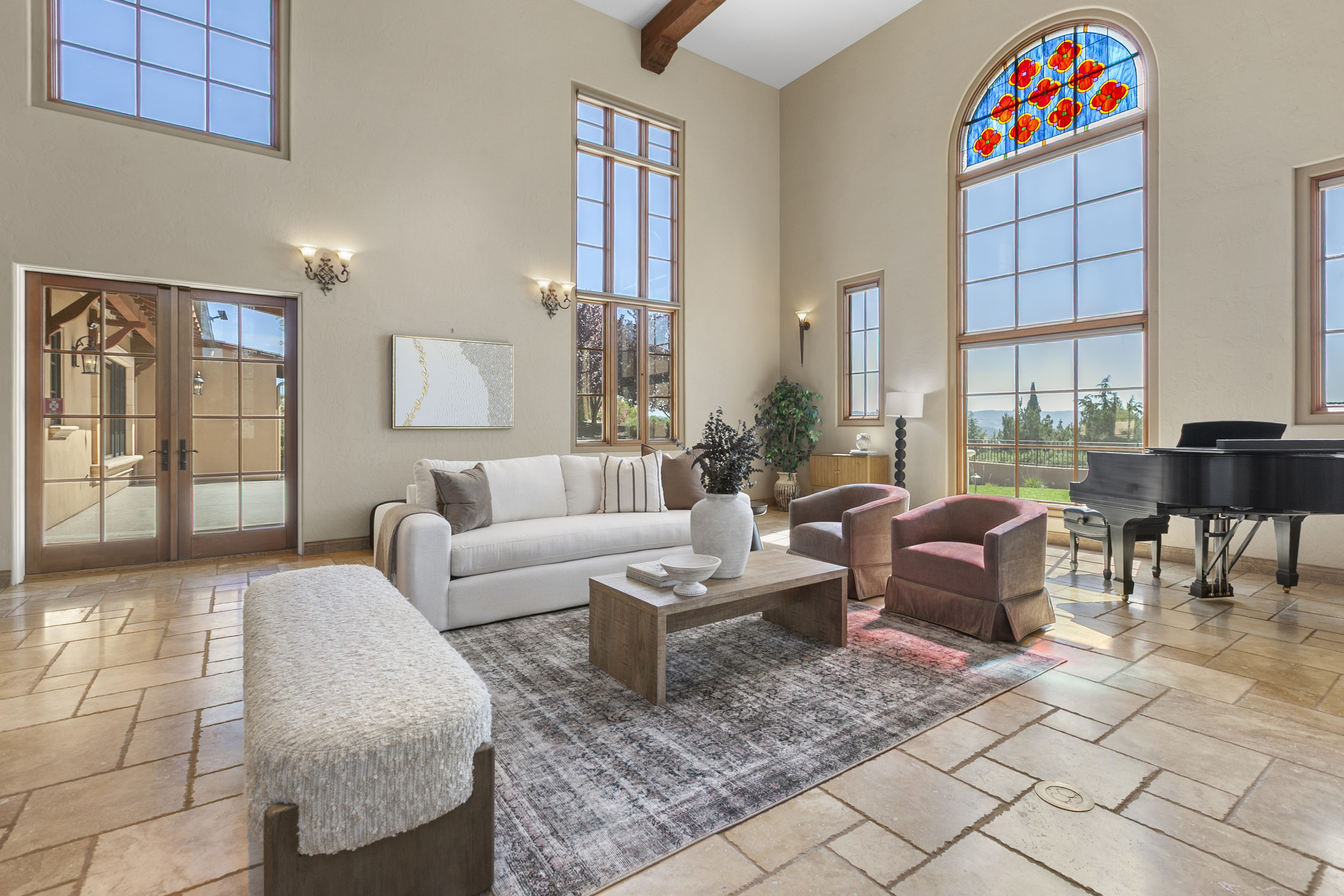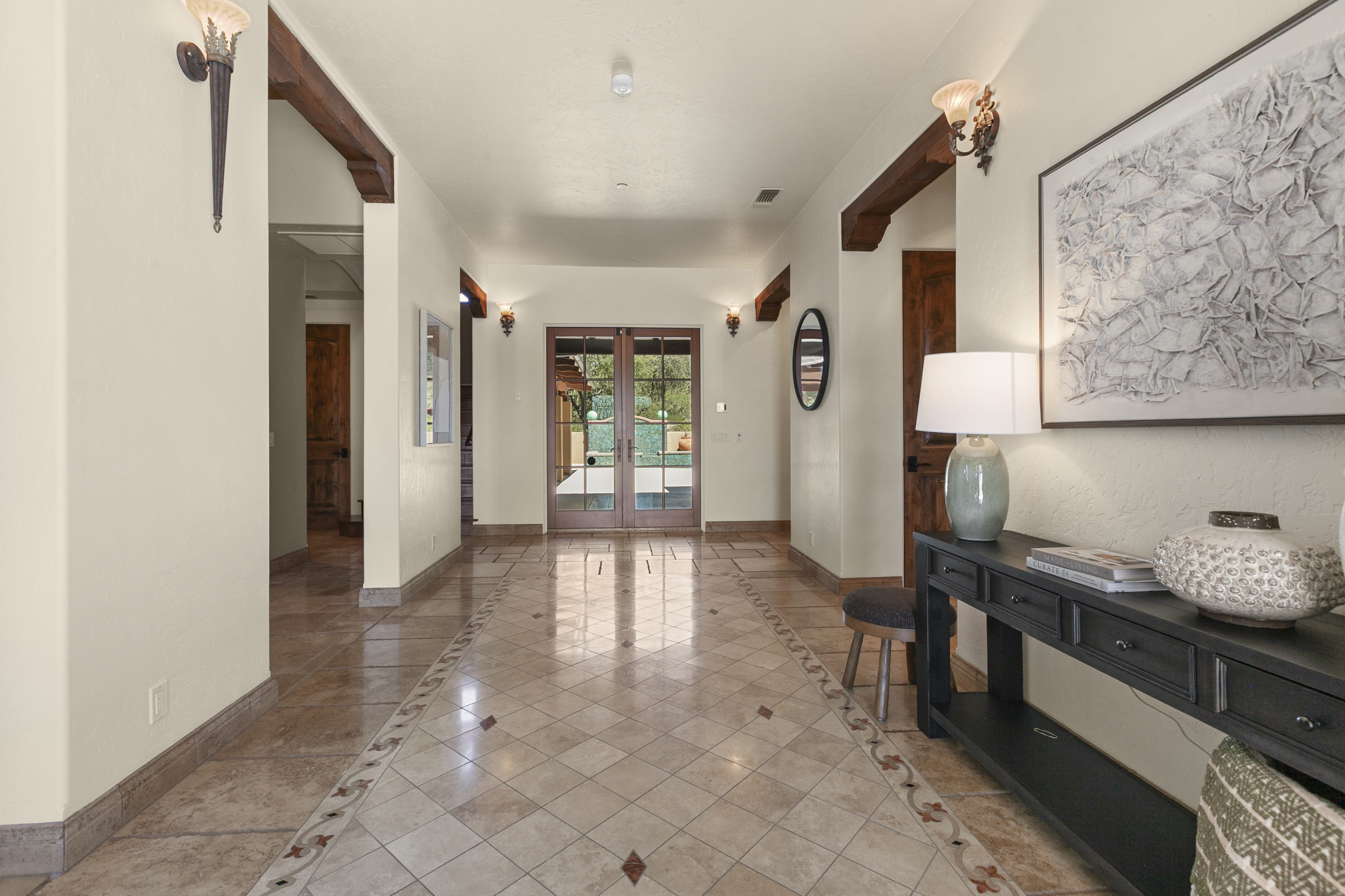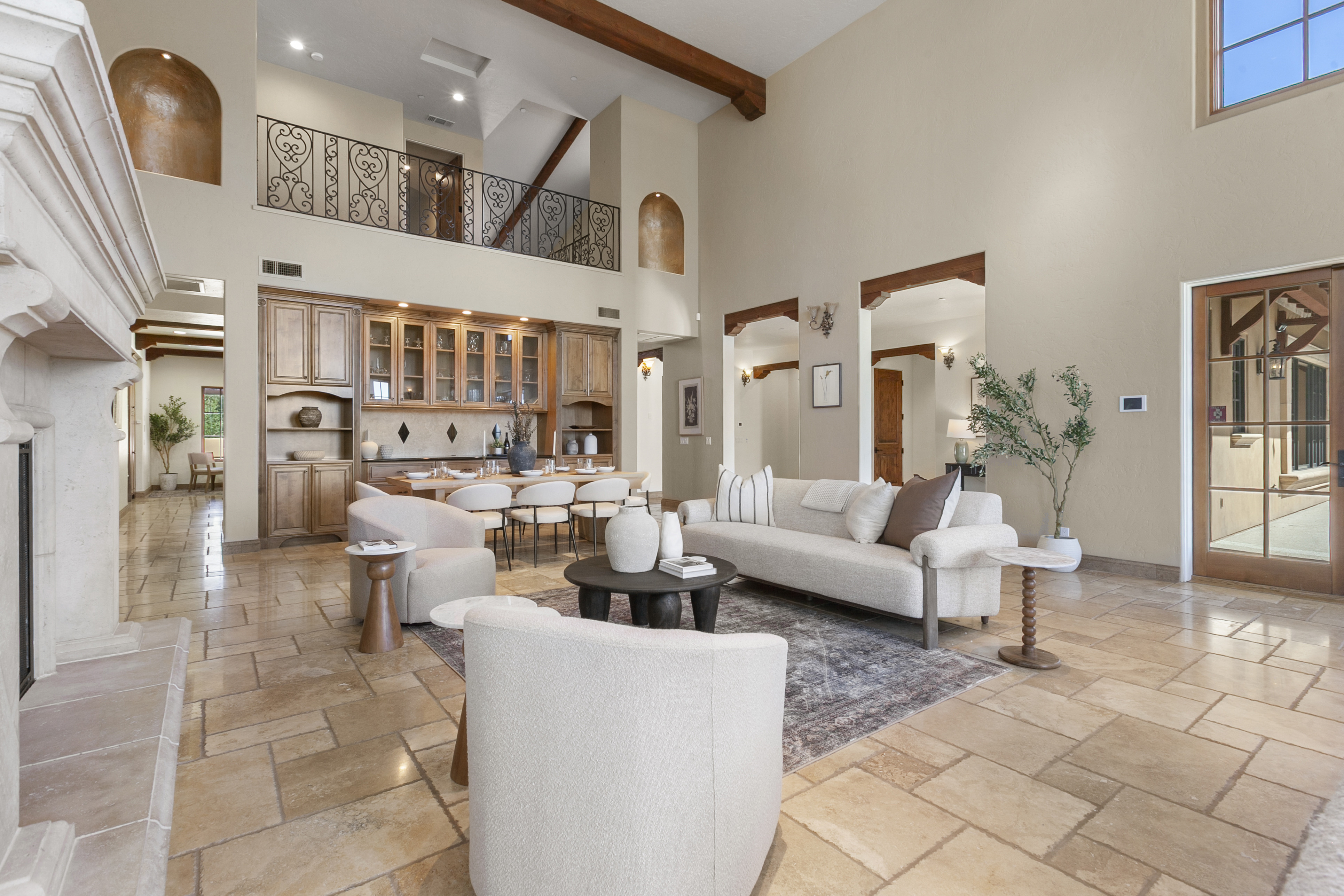 Set behind the gates of Santa Ysabel Ranch Estates, this nearly 5,000± sq. ft. residence embodies timeless Mediterranean-inspired architecture, blending refined craftsmanship with elegant, old-world character. The entry opens to a grand foyer introducing soaring ceilings, graceful archways, and rich architectural detailing throughout. The main living space is truly extraordinary, evoking the feel of a European palazzo. With its expansive proportions, soaring ceilings, and striking architectural details, it offers a sense of volume and elegance rarely found in residential homes—perfect for both everyday living and large-scale entertaining. Travertine flooring, exposed wood beams, and a statement fireplace, while a dramatic arched window frames picturesque views and some of the most amazing sunsets. The floor plan flows effortlessly from the living area to a formal dining room with a built-in bar, and into a well-appointed chef’s kitchen. The kitchen features premium appliances, including a 6-burner Viking range with pot filler, Sub-Zero refrigeration, a warming drawer, and custom cabinetry complemented by granite countertops and a generous center island with prep sink. The main level also includes a private office, powder room, laundry room, and an elegant primary suite retreat. The spacious primary suite offers vaulted ceilings, a fireplace, and tranquil views, along with a spa-inspired bathroom complete with dual vanities, soaking tub, custom walk-in shower, and expansive dual walk-in closets. Upstairs, two well-appointed guest suites provide comfort and privacy, including one featuring a charming Romeo and Juliet balcony overlooking the front grounds. Outdoor living features a solar-heated pool, custom water feature, and a detached casita with private entrance and en-suite bath—ideal for guests or extended stays. The grounds are thoughtfully designed with a textured concrete patio, ambient lighting, raised garden beds, and mature landscaping that complements the home’s Mediterranean aesthetic. Additional features include four HVAC systems, a three-car garage with upgraded flooring, and abundant storage, along with an additional storage room/workshop adjacent to the garage. Residents of Santa Ysabel Ranch Estates enjoy the benefits of one of the area’s most exclusive communities, offering a gated setting with 24/7 security, scenic walking trails, tennis courts, and a serene, private environment just minutes from town.