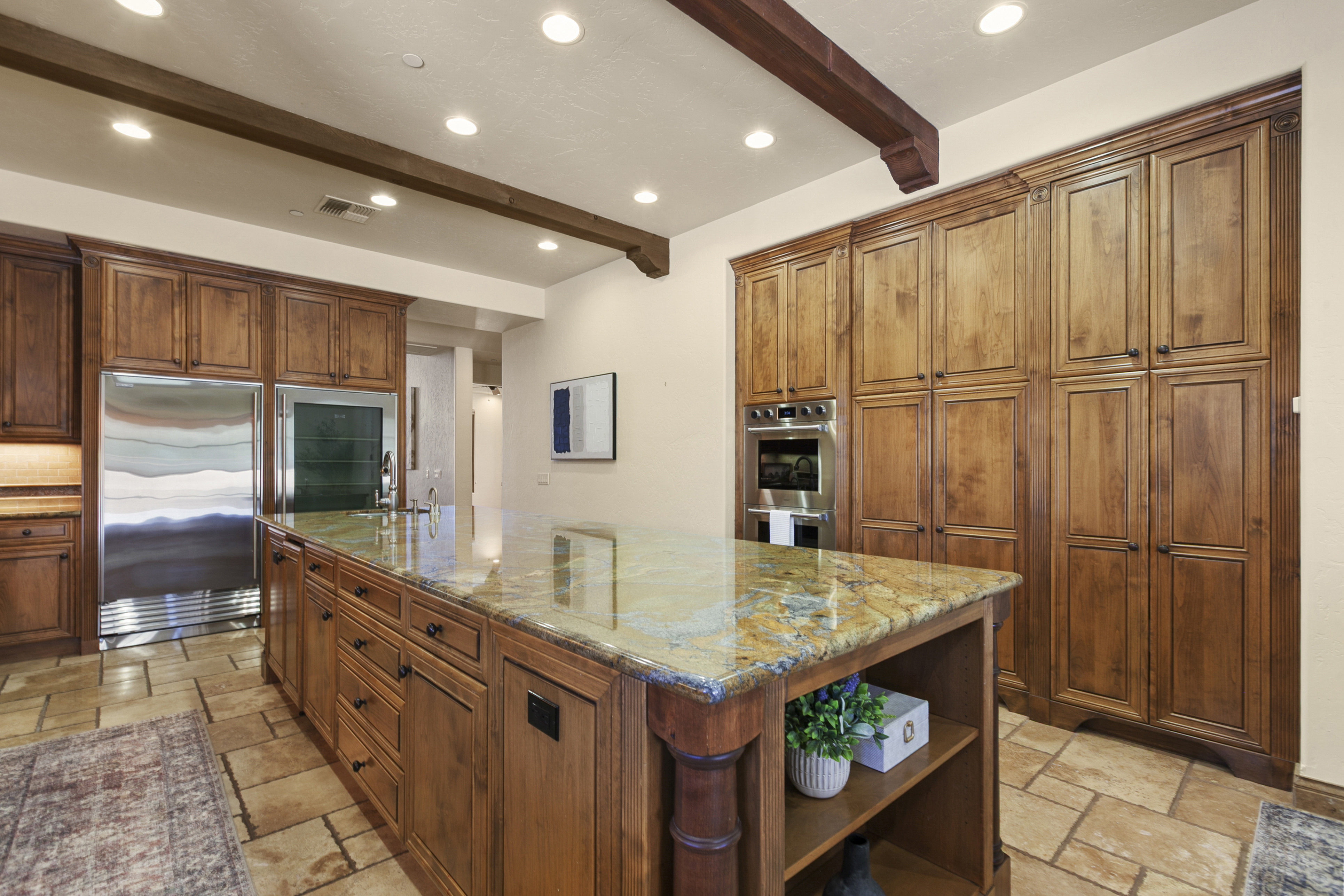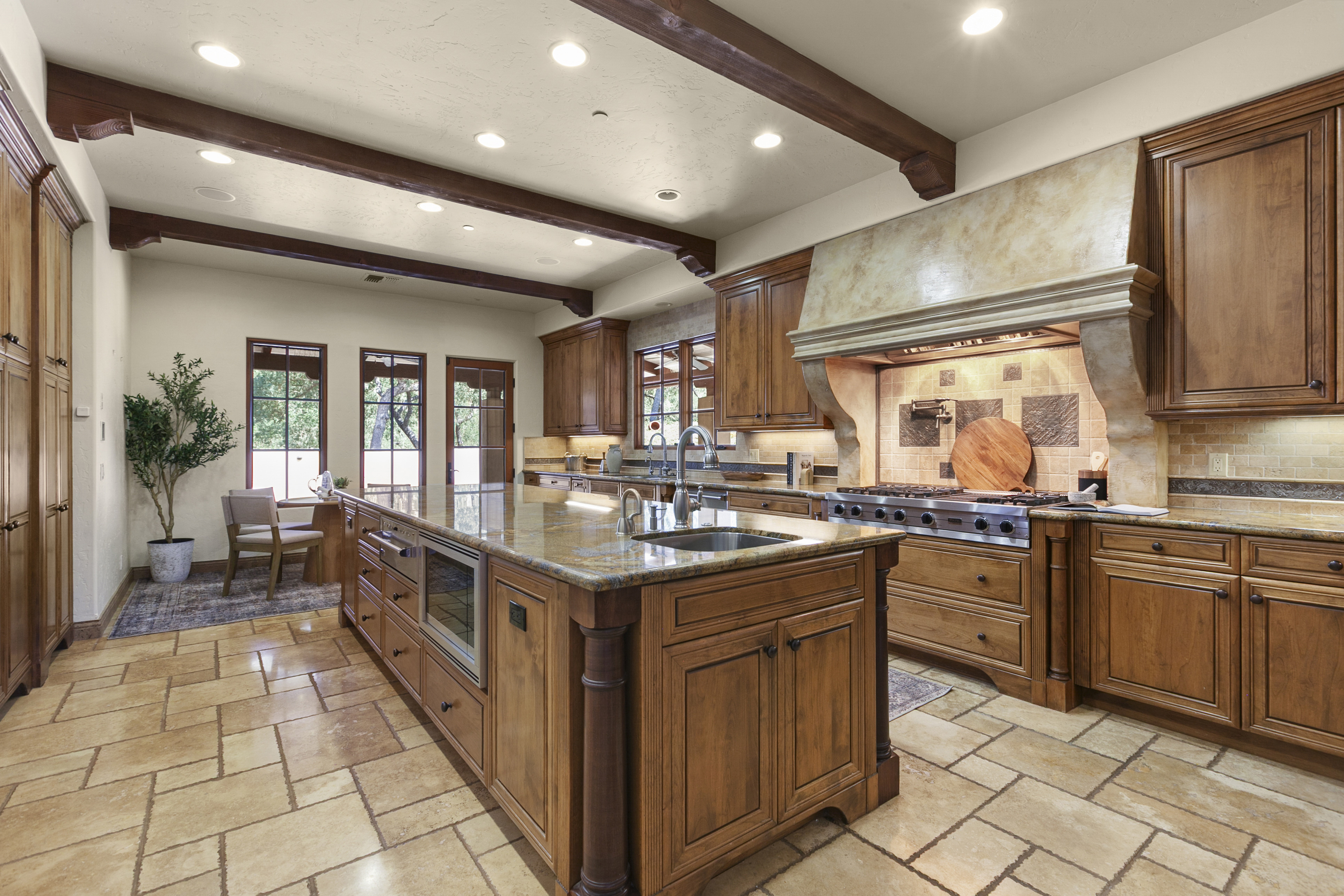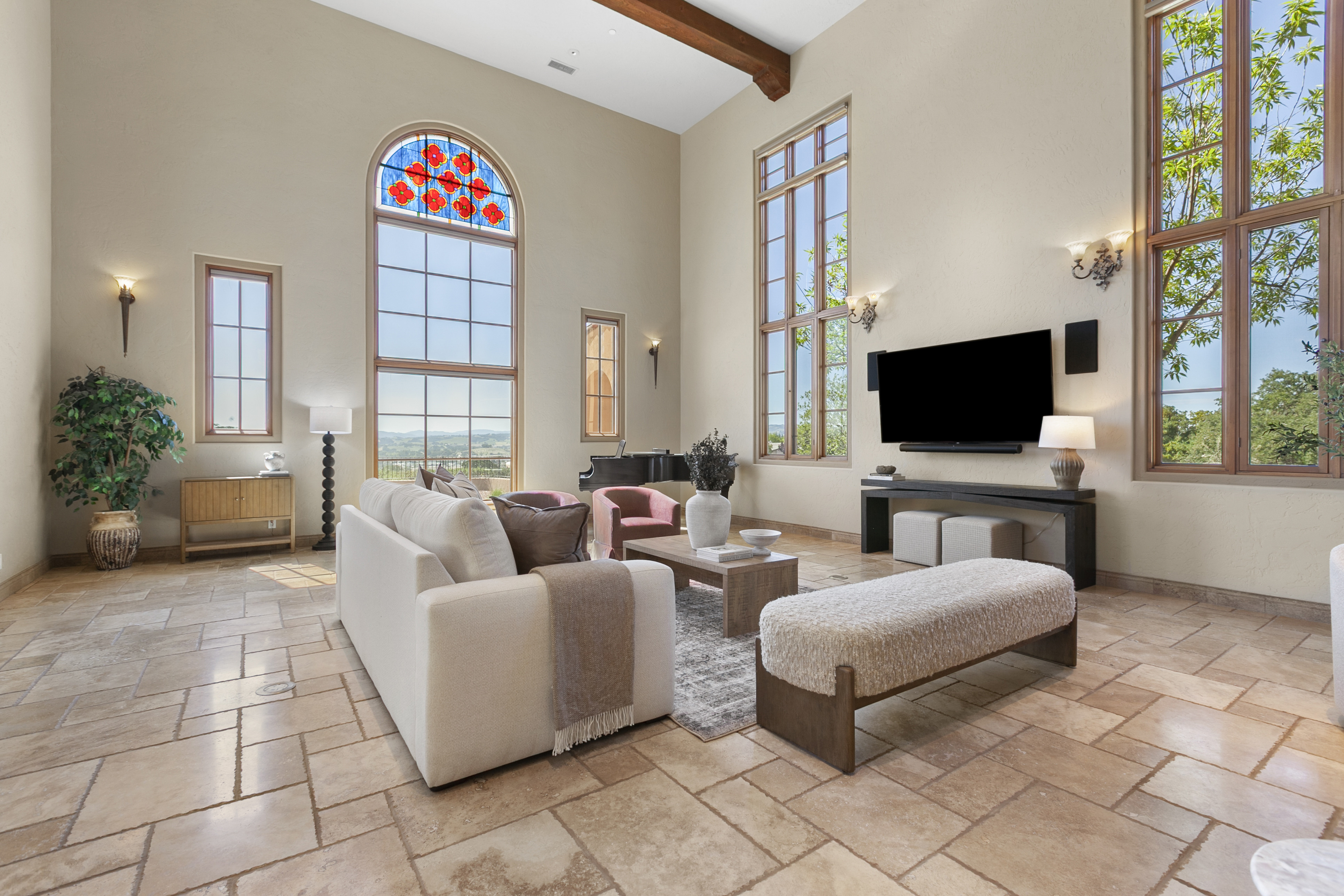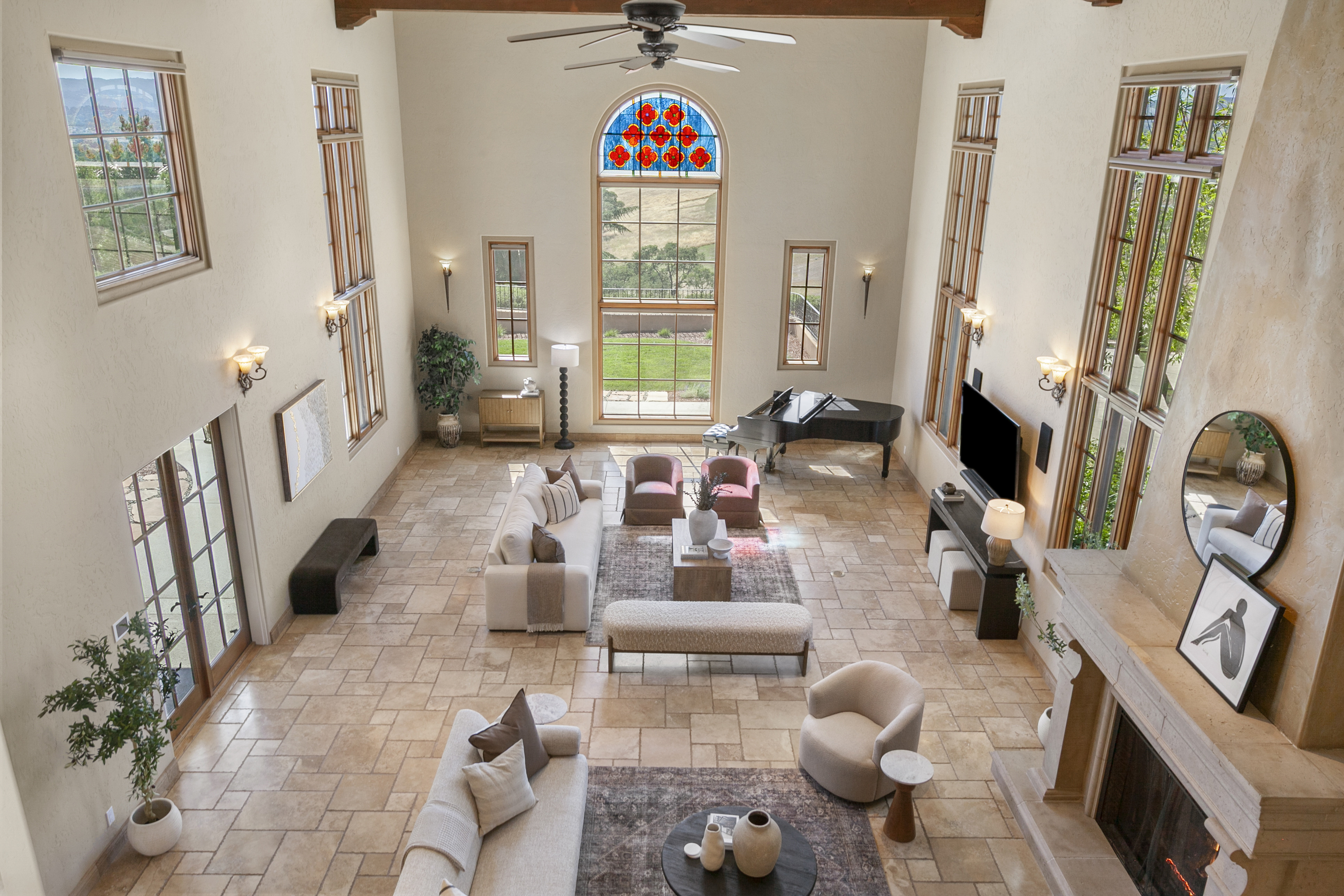 Set behind the gates of Santa Ysabel Ranch Estates, this nearly 5,000± sq. ft. residence embodies timeless Mediterranean-inspired architecture, blending refined craftsmanship with elegant, old-world character. The entry opens to a grand foyer introducing soaring ceilings, graceful archways, and rich architectural detailing throughout. The main living space is truly extraordinary, evoking the feel of a European palazzo. With its expansive proportions, soaring ceilings, and striking architectural details, it offers a sense of volume and elegance rarely found in residential homes—perfect for both everyday living and large-scale entertaining. Travertine flooring, exposed wood beams, and a statement fireplace, while a dramatic arched window frames picturesque views and some of the most amazing sunsets. The floor plan flows effortlessly from the living area to a formal dining room with a built-in bar, and into a well-appointed chef’s kitchen. The kitchen features premium appliances, including a 6-burner Viking range with pot filler, Sub-Zero refrigeration, a warming drawer, and custom cabinetry complemented by granite countertops and a generous center island with prep sink. The main level also includes a private office, powder room, laundry room, and an elegant primary suite retreat. The spacious primary suite offers vaulted ceilings, a fireplace, and tranquil views, along with a spa-inspired bathroom complete with dual vanities, soaking tub, custom walk-in shower, and expansive dual walk-in closets. Upstairs, two well-appointed guest suites provide comfort and privacy, including one featuring a charming Romeo and Juliet balcony overlooking the front grounds. Outdoor living features a solar-heated pool, custom water feature, and a detached casita with private entrance and en-suite bath—ideal for guests or extended stays. The grounds are thoughtfully designed with a textured concrete patio, ambient lighting, raised garden beds, and mature landscaping that complements the home’s Mediterranean aesthetic. Additional features include four HVAC systems, a three-car garage with upgraded flooring, and abundant storage, along with an additional storage room/workshop adjacent to the garage. Residents of Santa Ysabel Ranch Estates enjoy the benefits of one of the area’s most exclusive communities, offering a gated setting with 24/7 security, scenic walking trails, tennis courts, and a serene, private environment just minutes from town.