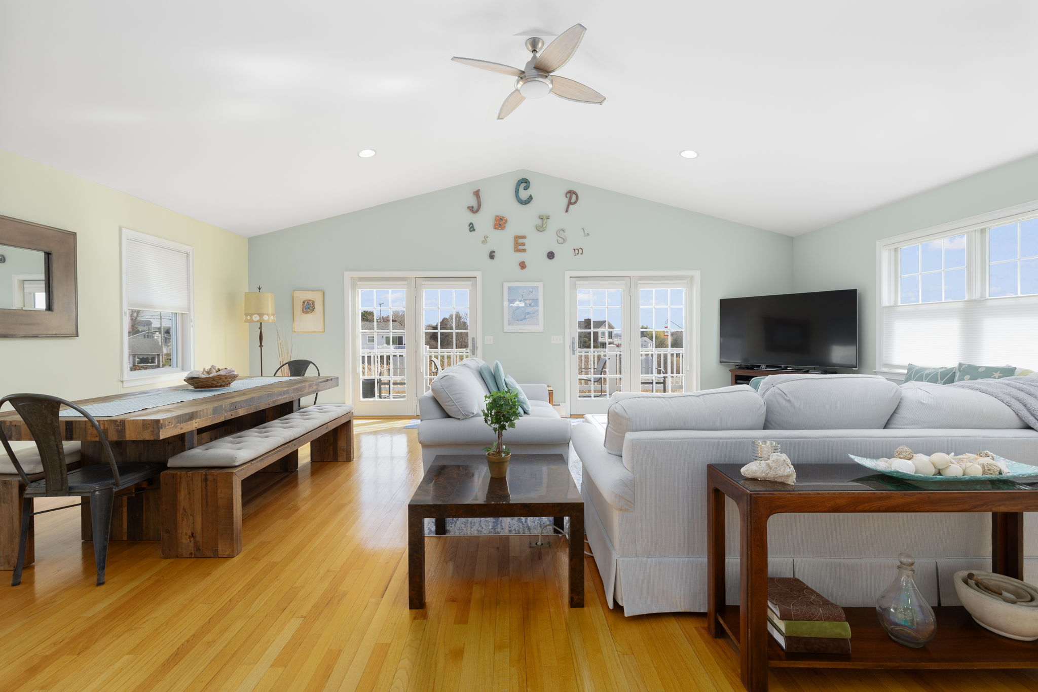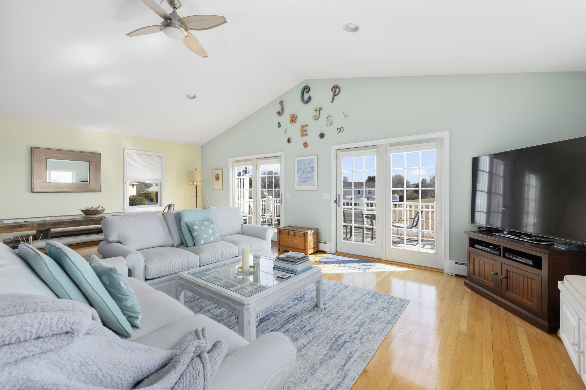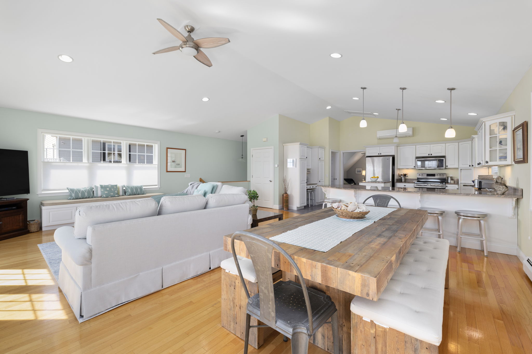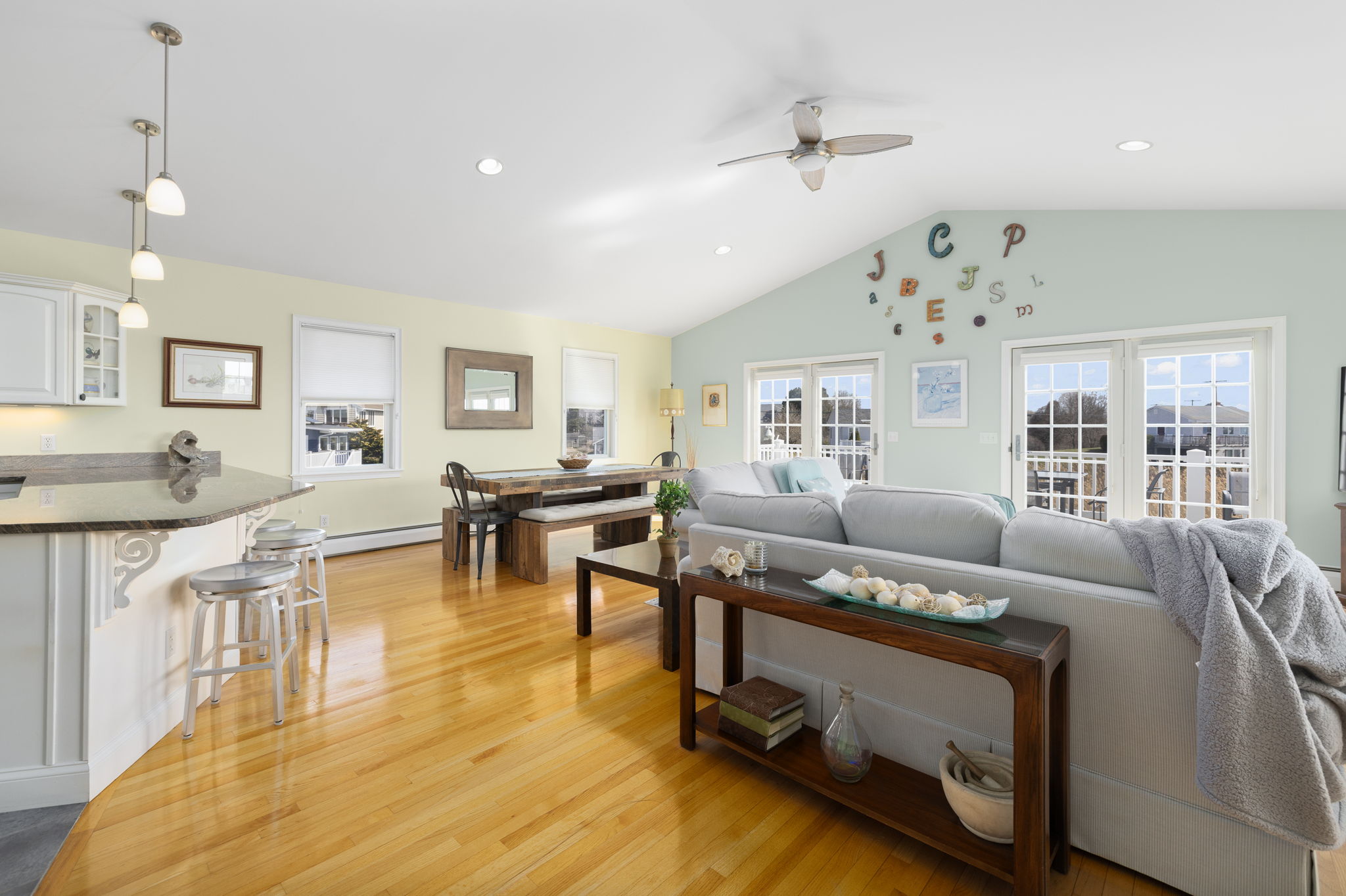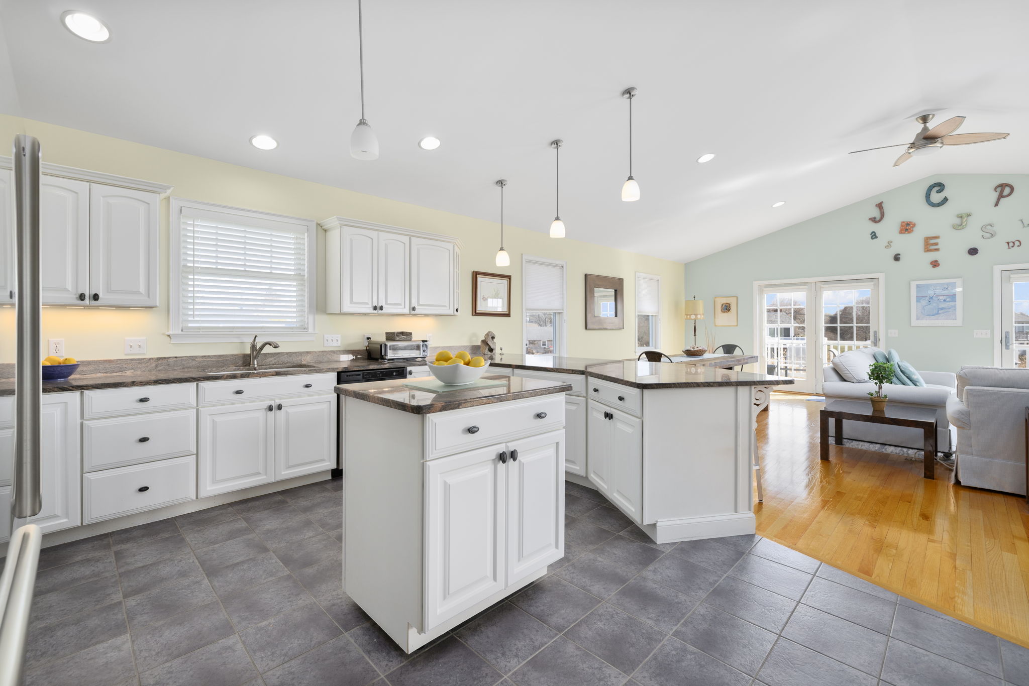 with sweeping views of the Great Salt Pond, Galilee and beyond. The dramatic open space of living, dining and kitchen is an entertainer's delight as is the home's layout with a primary suite on each floor.....perfect for an in-law!!! Each level has an outside deck to enjoy nature's beauty, soaring birds or stunning sunsets. There is still more....office and kitchenette on first level, hardwoods, tiled baths, granite counters in kitchen and baths. The feeling is spacious, warm and comfortable. And, you can move right in as it has been lovingly cared for. Water access at the end of the street. This is not a home to miss.... come on home today.