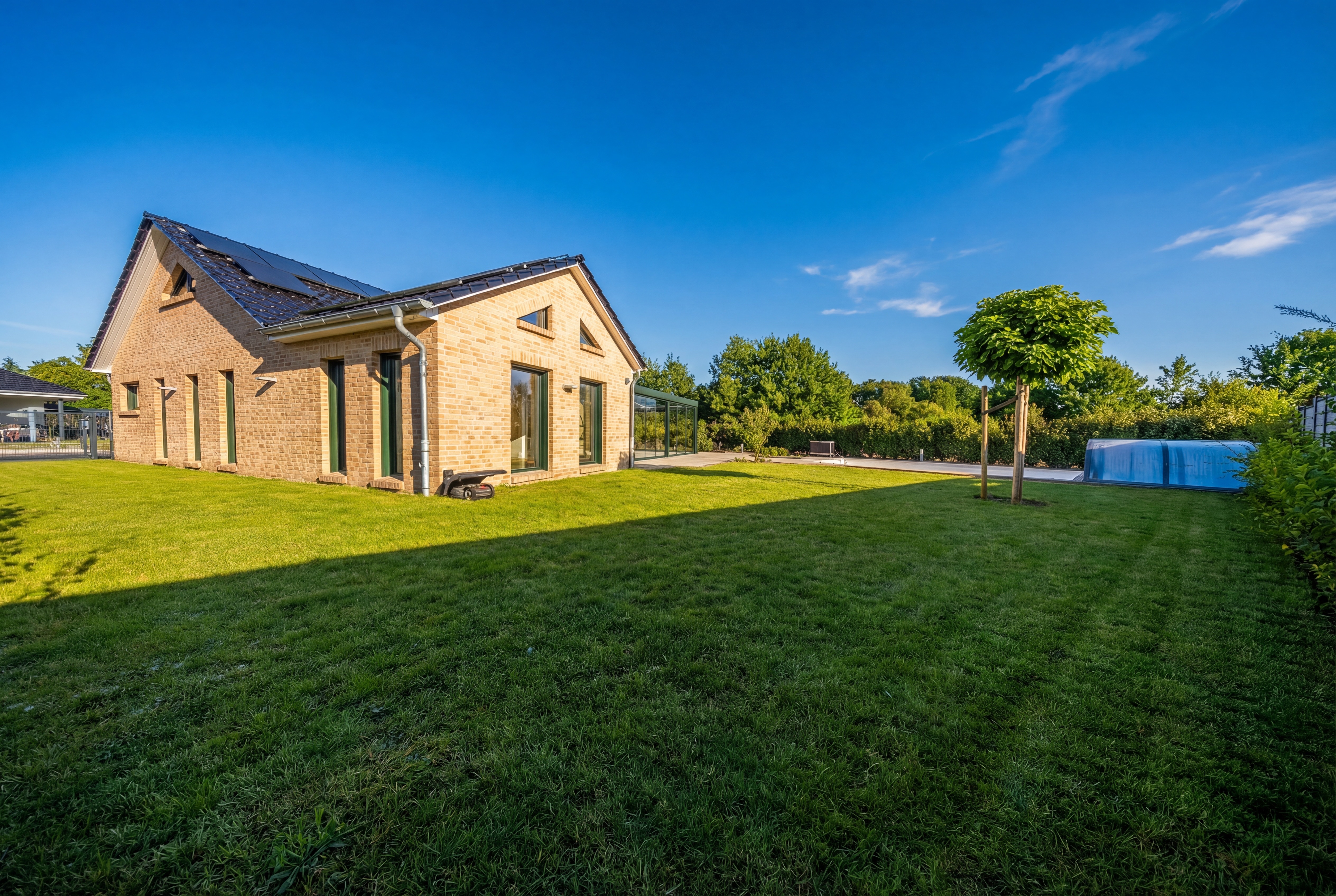 Particularly noteworthy is the spacious terrace and sunroom area with large glass panels, which allows for sheltered outdoor use, can be fully shaded via the smart home system, and harmoniously extends the living space into the garden.