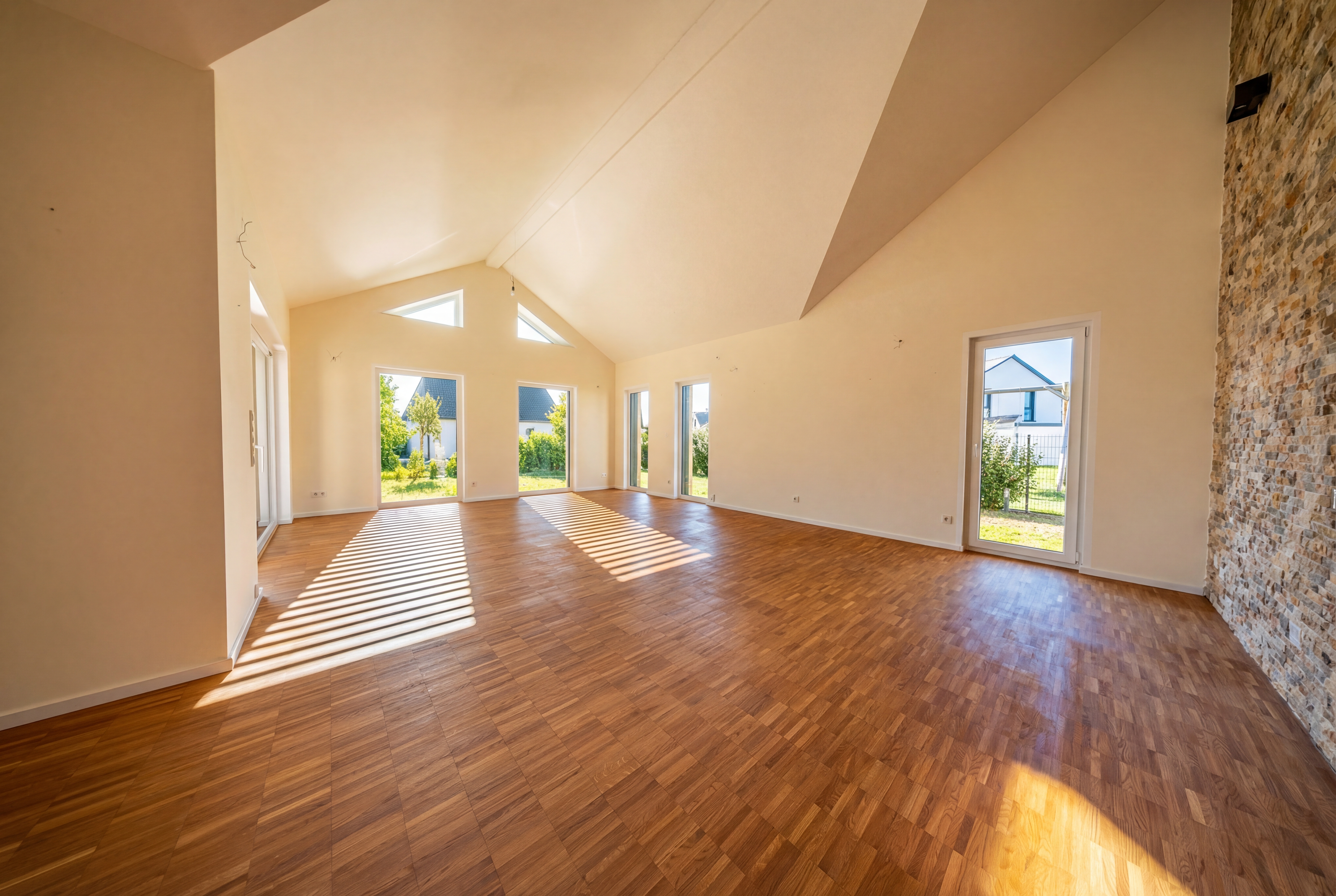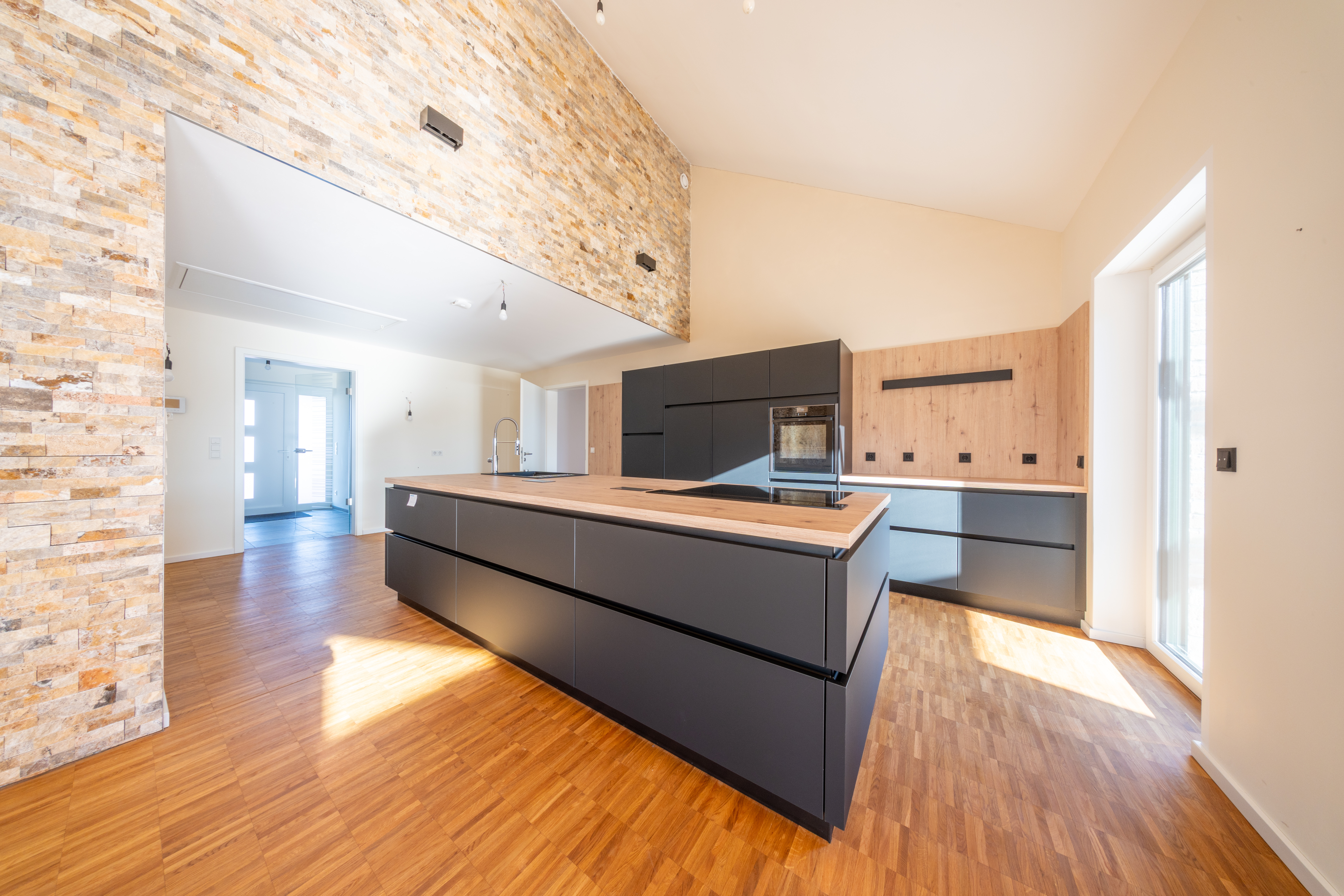 The single-story design enables particularly comfortable and future-proof living on one level. Spanning approximately 154 m² of living space, the home features a spacious layout with clean lines, plenty of natural light, and a harmonious connection between indoor and outdoor areas. The heart of the home is the expansive living and dining area with impressive ceiling heights and large windows that create a bright and open living atmosphere.