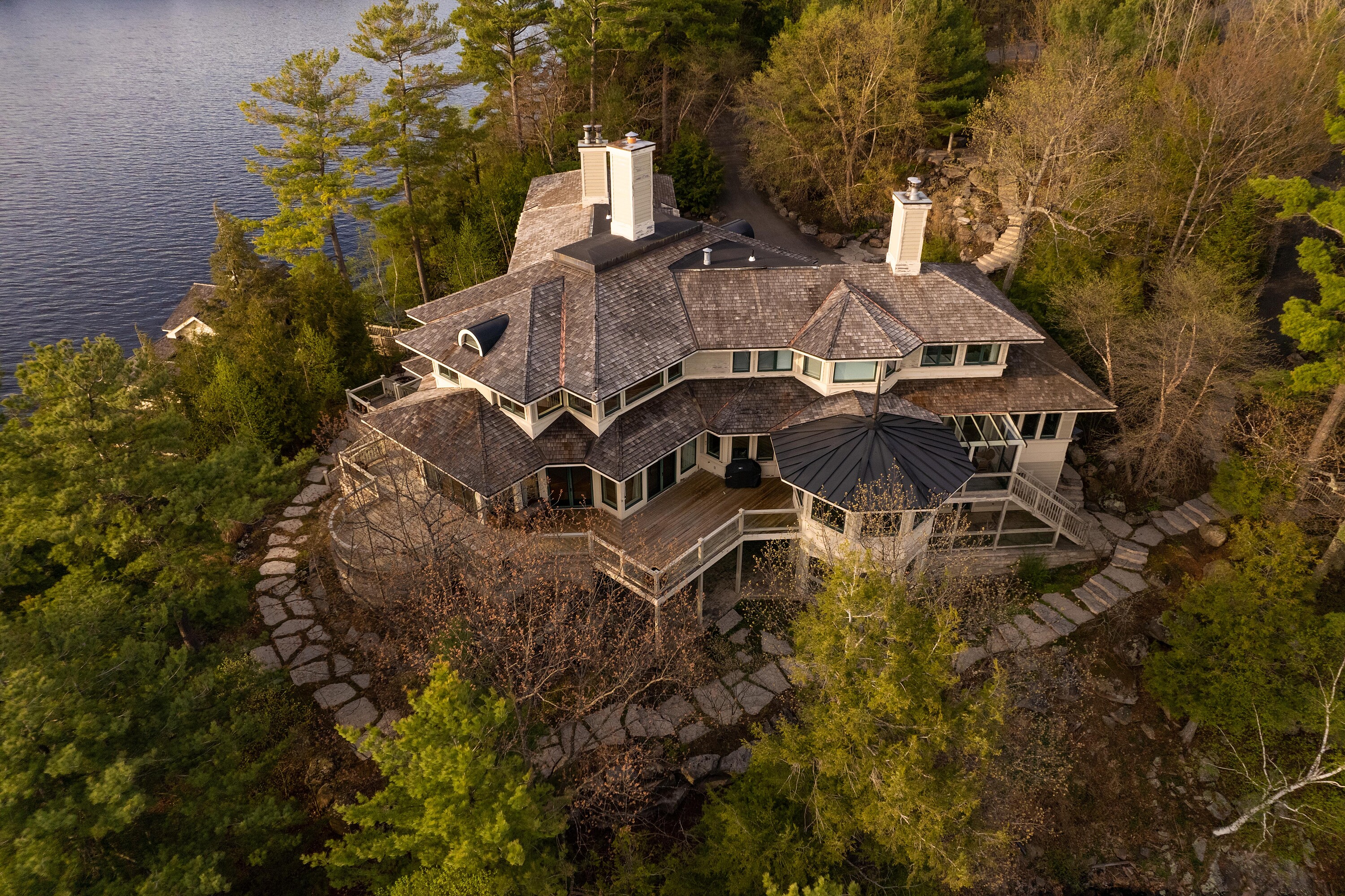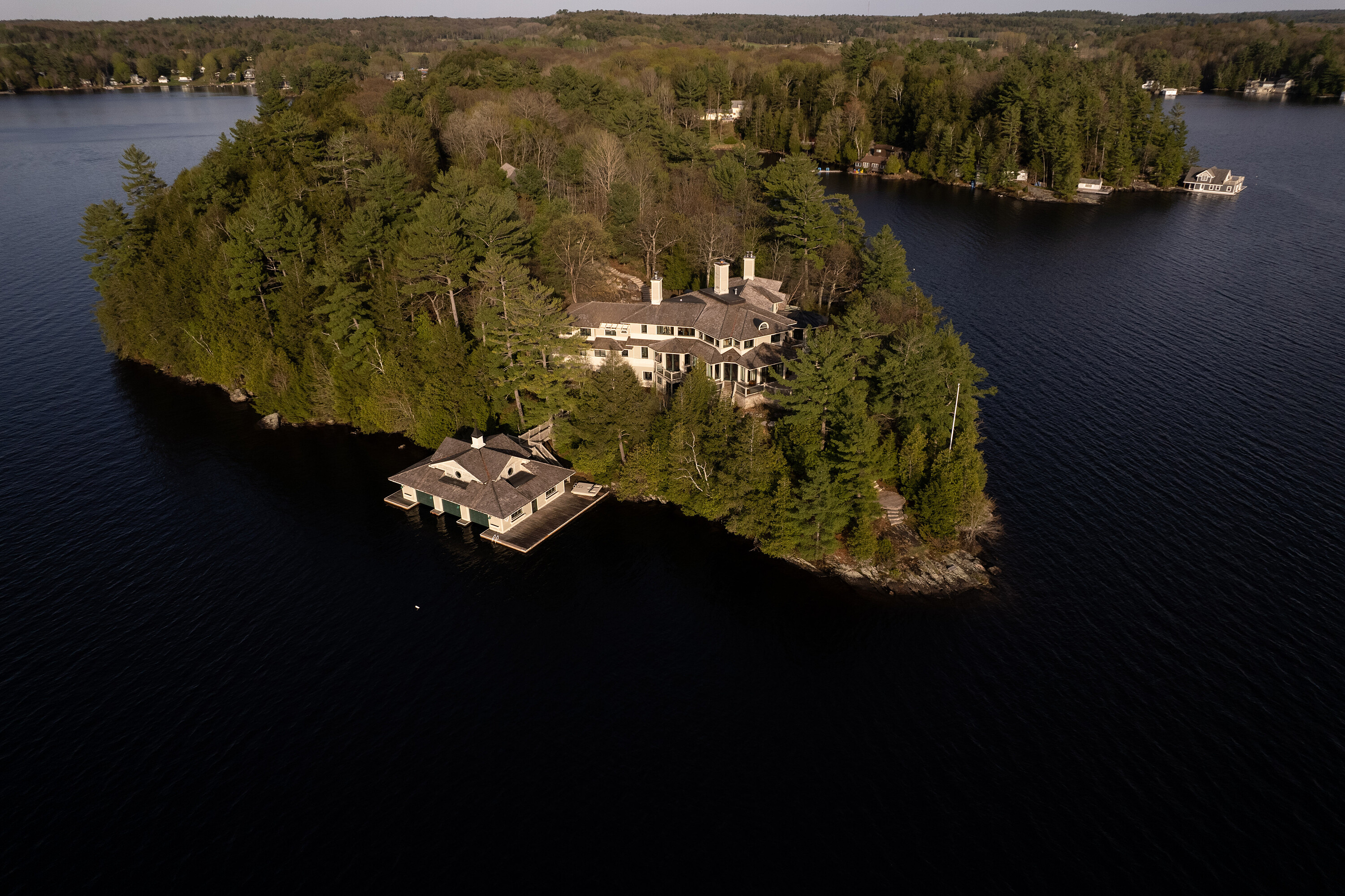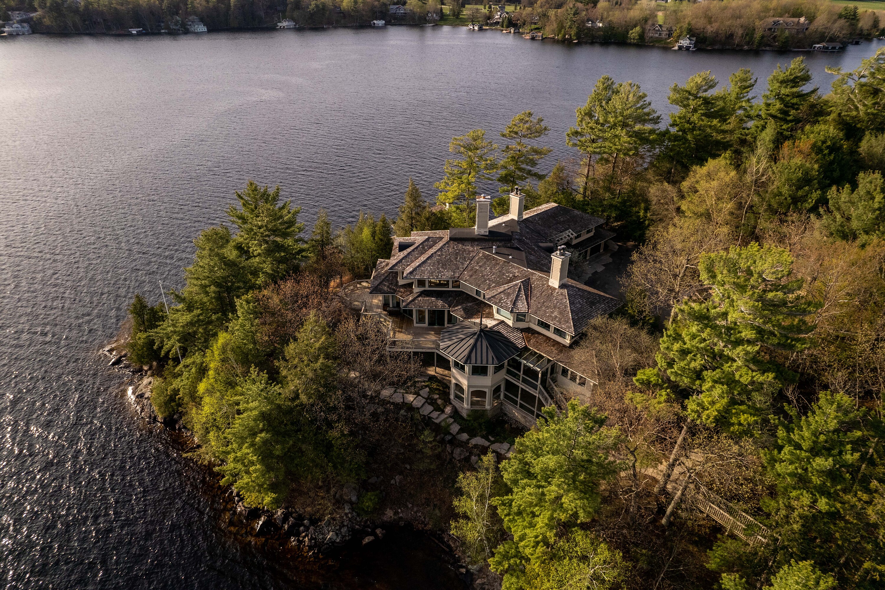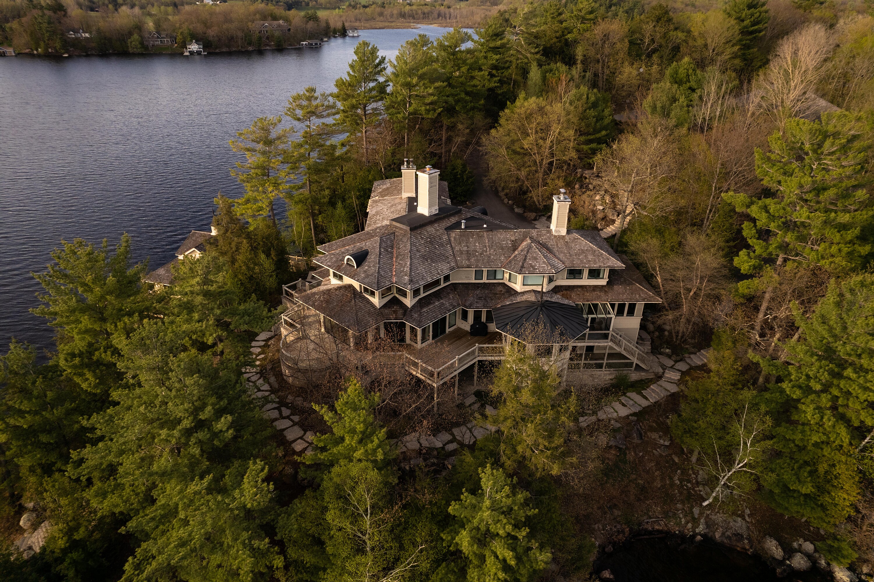 Sunset Point Lake Muskoka - Presenting the most Iconic Muskoka Estate, embodying unparalleled luxury and prestige on the shores of Lake Muskoka. This 1.5 acre west facing point offers 689 feet of lakefront. Meticulously crafted for discerning families, this bespoke Muskoka compound delivers a distinctive residence providing privacy, views, location, architecture, and amenities. Ideally positioned at the cape of the peninsula, an elegant seven bedroom, eight bathroom manor with a magnificent lakeside position awaits.