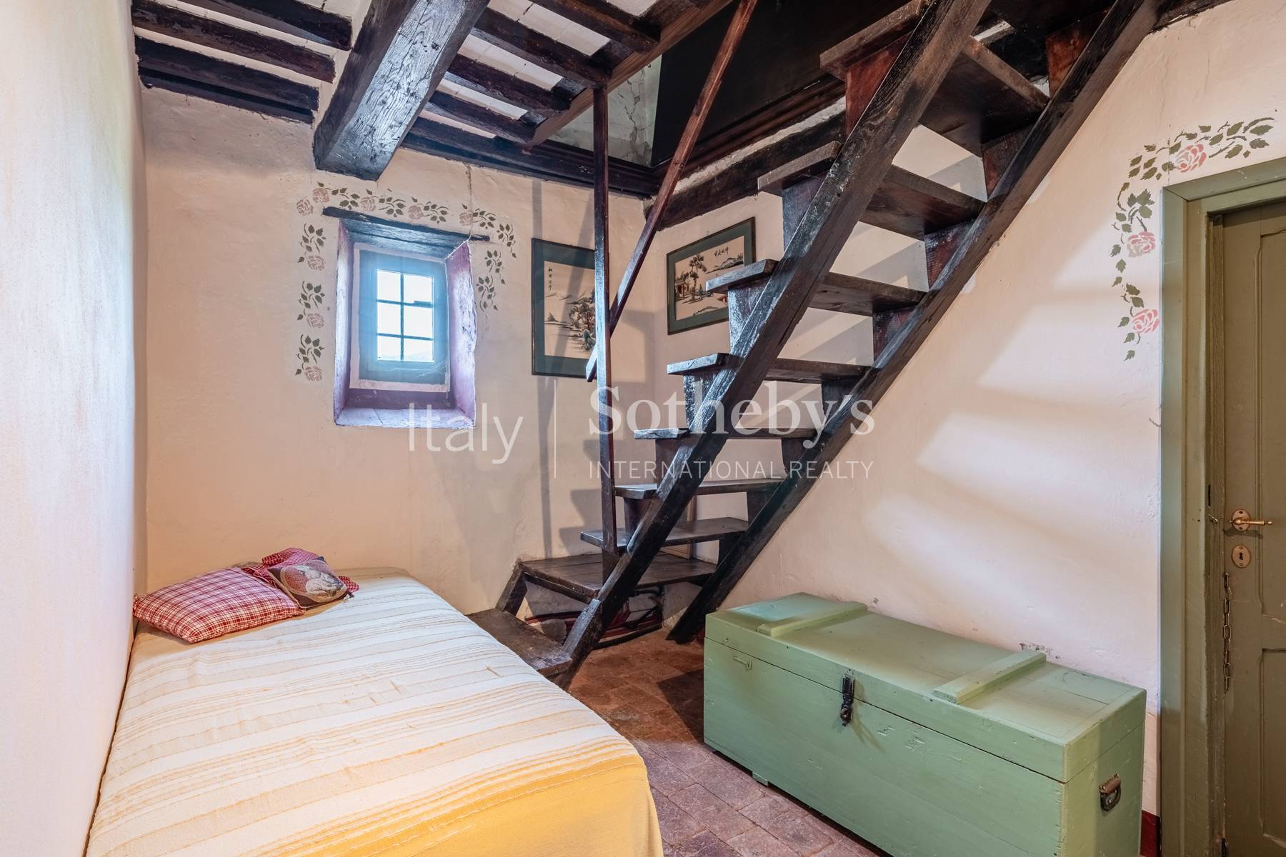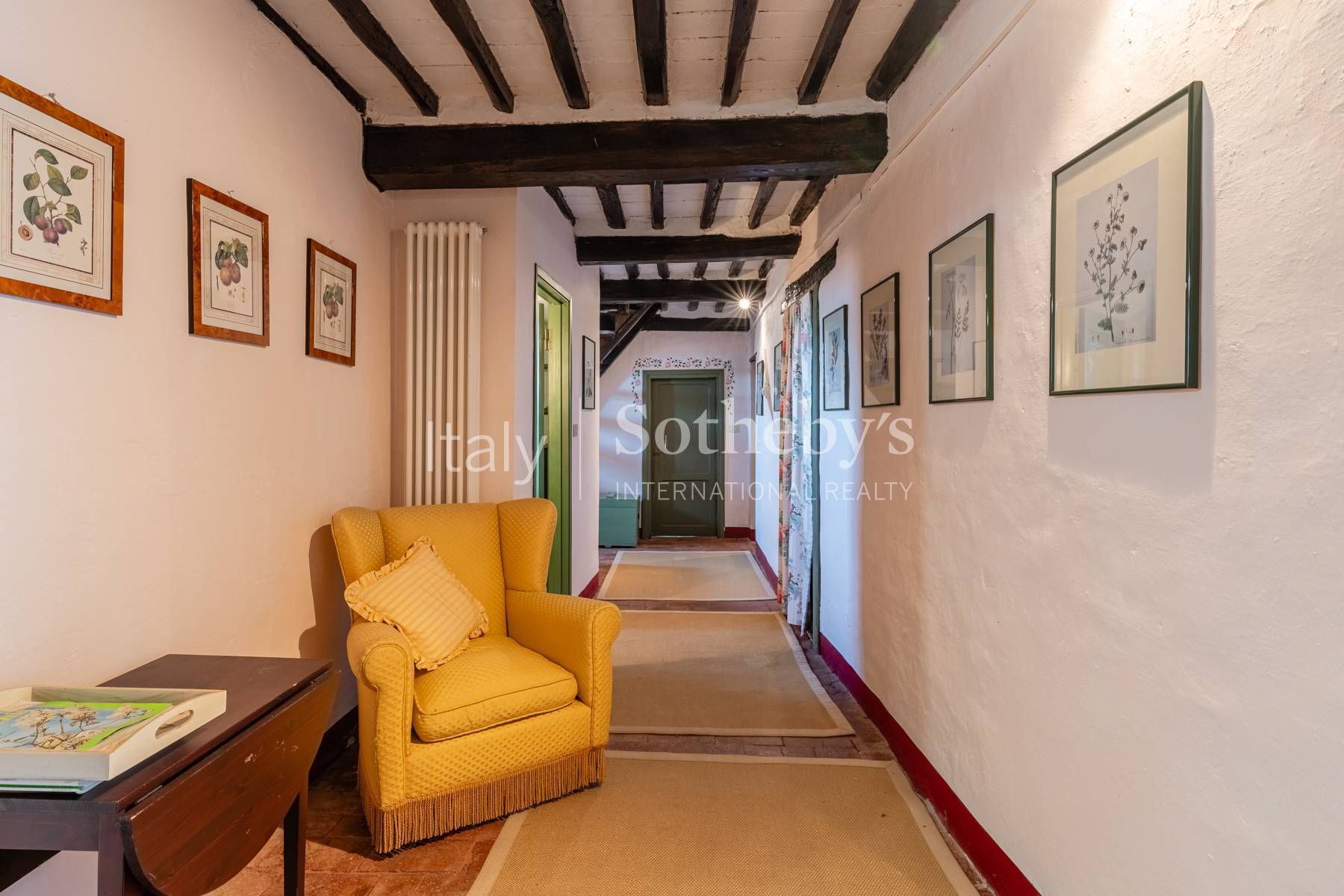 In one of the most prestigious and panoramic hills of the Lucca area, authentic old country house dating back to the XV Century, former monastery, with land and swimming pool, located just 6 miles north-west of Lucca. The country house consists of the main building on three levels with on the Ground Floor a large rustic eat-in kitchen, dining room, living room with fireplace, a further sitting room with access to the rear garden, a guest bathroom and utility room. The upper floor includes five bedrooms and two bathrooms. The attic has ample in height for further living space, currently to be finished. Adjacent to the house there is the large heybarn with the classic "mandolate" openings, where one can enlarge the living space of further 200 sqm. A wonderful porch with a breathtaking view, ideal for outdoor lunches and dinners, enriches the large garden that develops around it. As well as another room used as an external kitchen with wood-burning oven and barbecue area. The splendid 6x12 m private swimming pool with solarium area and pergola is located further down. Finally, a small annexe on two levels completes the front garden with a wide parking shaded by secular trees. The land of about 17 hectares is very pleasant and widely flat, with large terraces sloping gently down towards the valley, an olive grove of about 700 trees and a small woodland. Time seems to slow down in this enchanting scenery of tranquility and peace, despite its proximity to various towns and services.