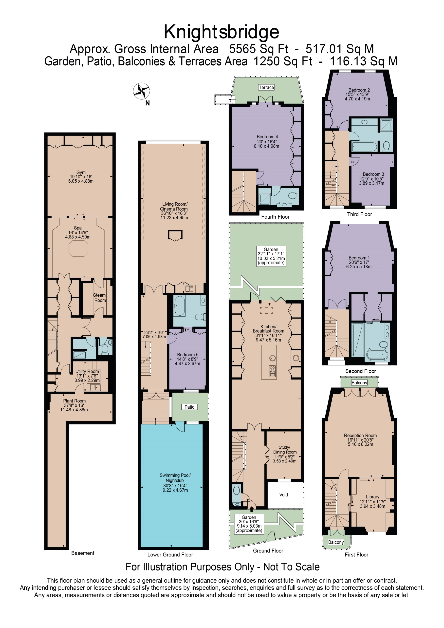 The two lower-ground floors play host to a number of impressive spaces, which are ideal when entertaining. The basement houses a gym, a spa with a steam room and a plant room, as well as a utility room and a bathroom. On the lower-ground floor, there’s a living room/cinema room, a large indoor swimming pool, which transforms into a dance floor. There is also a bedroom, perfect for hosting guests. Four more bedrooms lie on the second, third and fourth floors. The main bedroom on the second-floor bedroom has its own dressing room and en-suite with a bath, while the two bedrooms on the third floor have access to a family bathroom. A fourth bedroom spans the second floor and has an en-suite and private balcony with views of the garden.