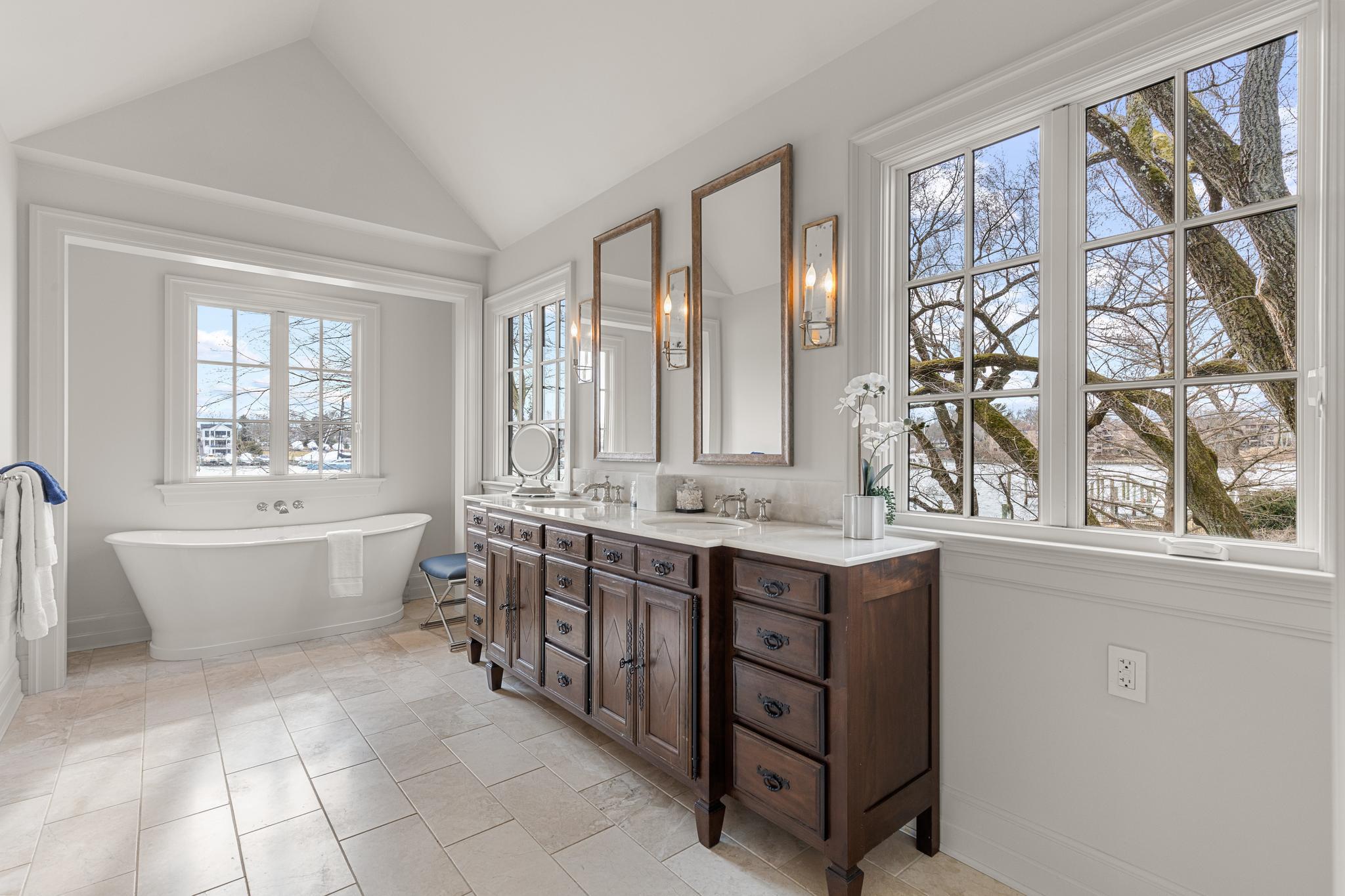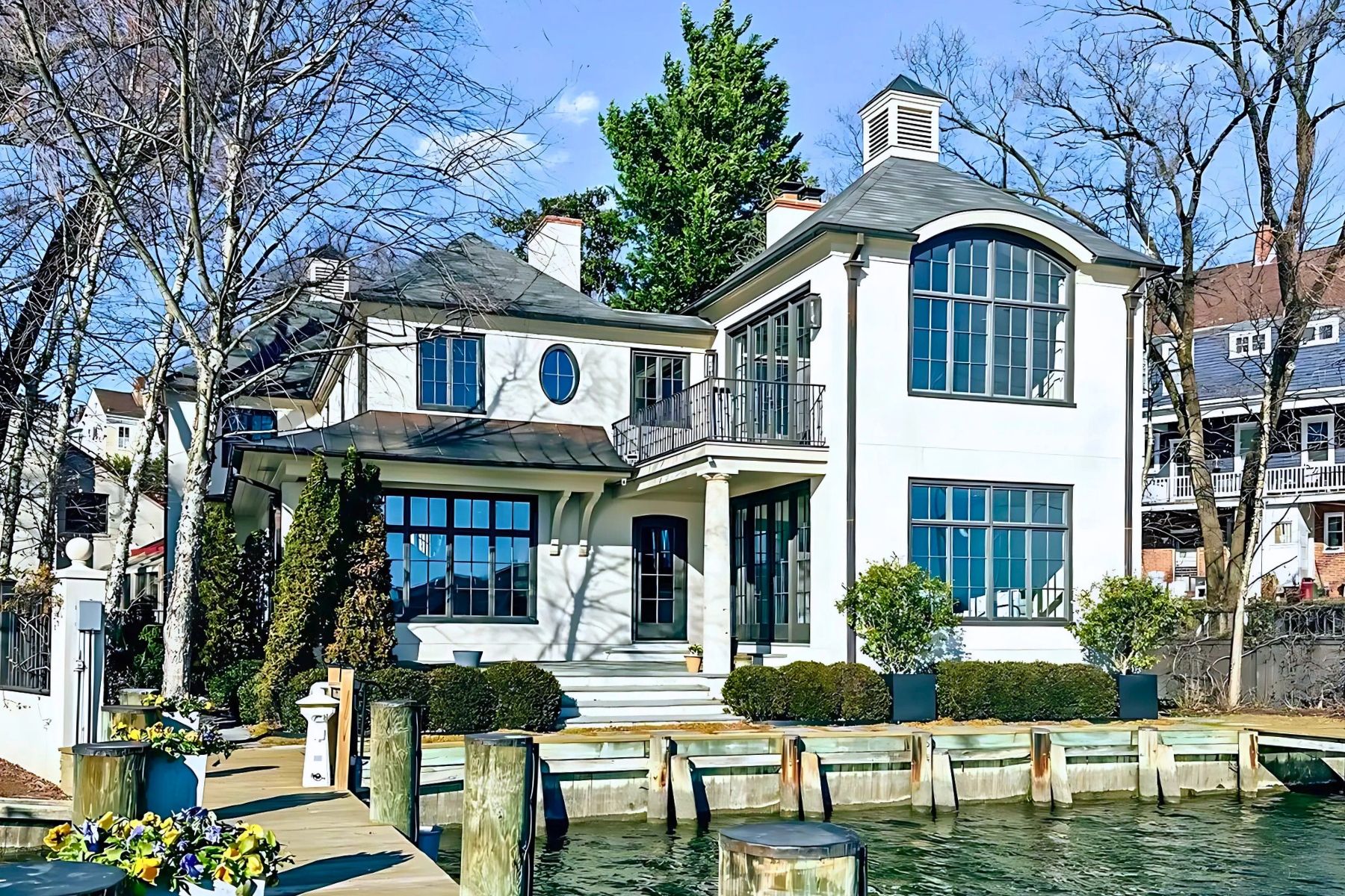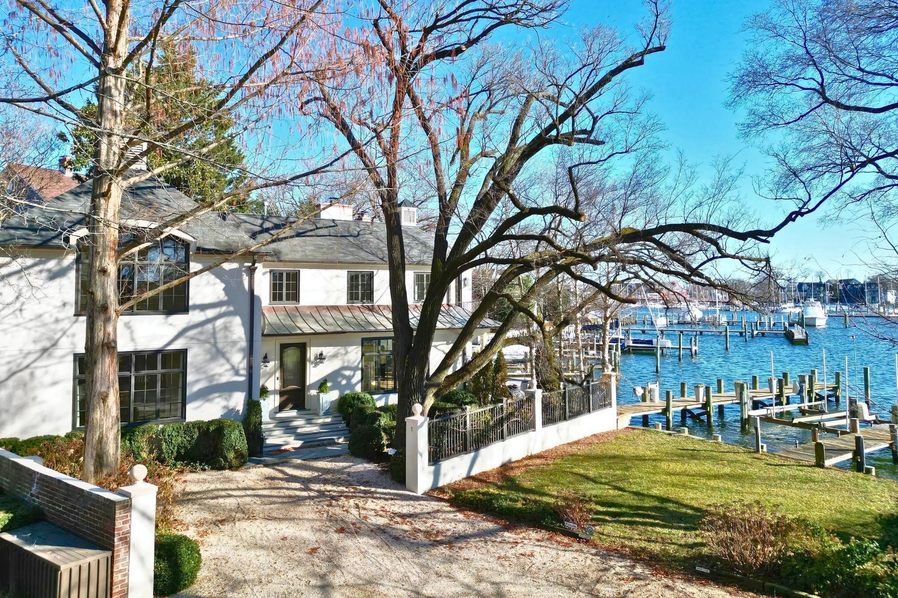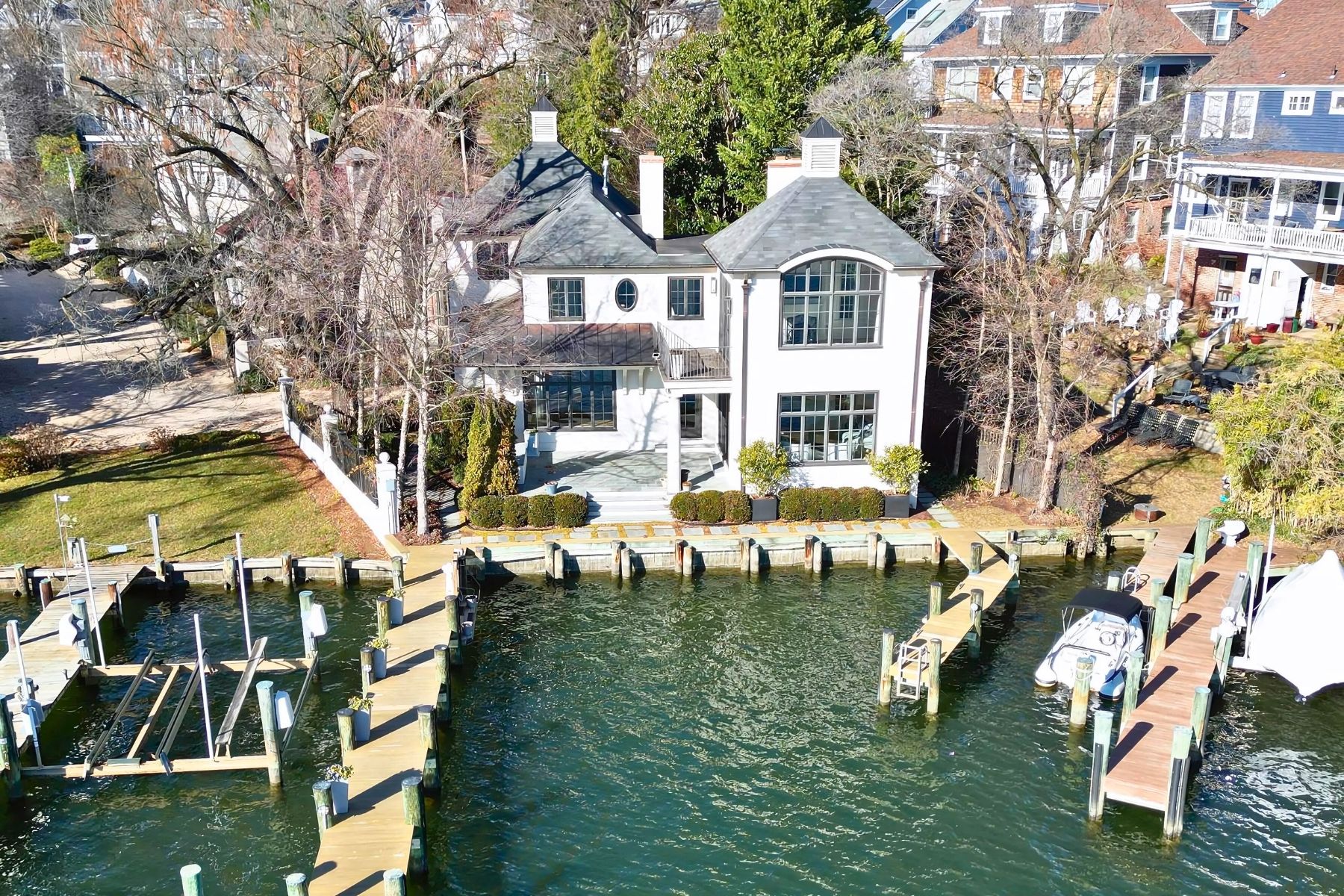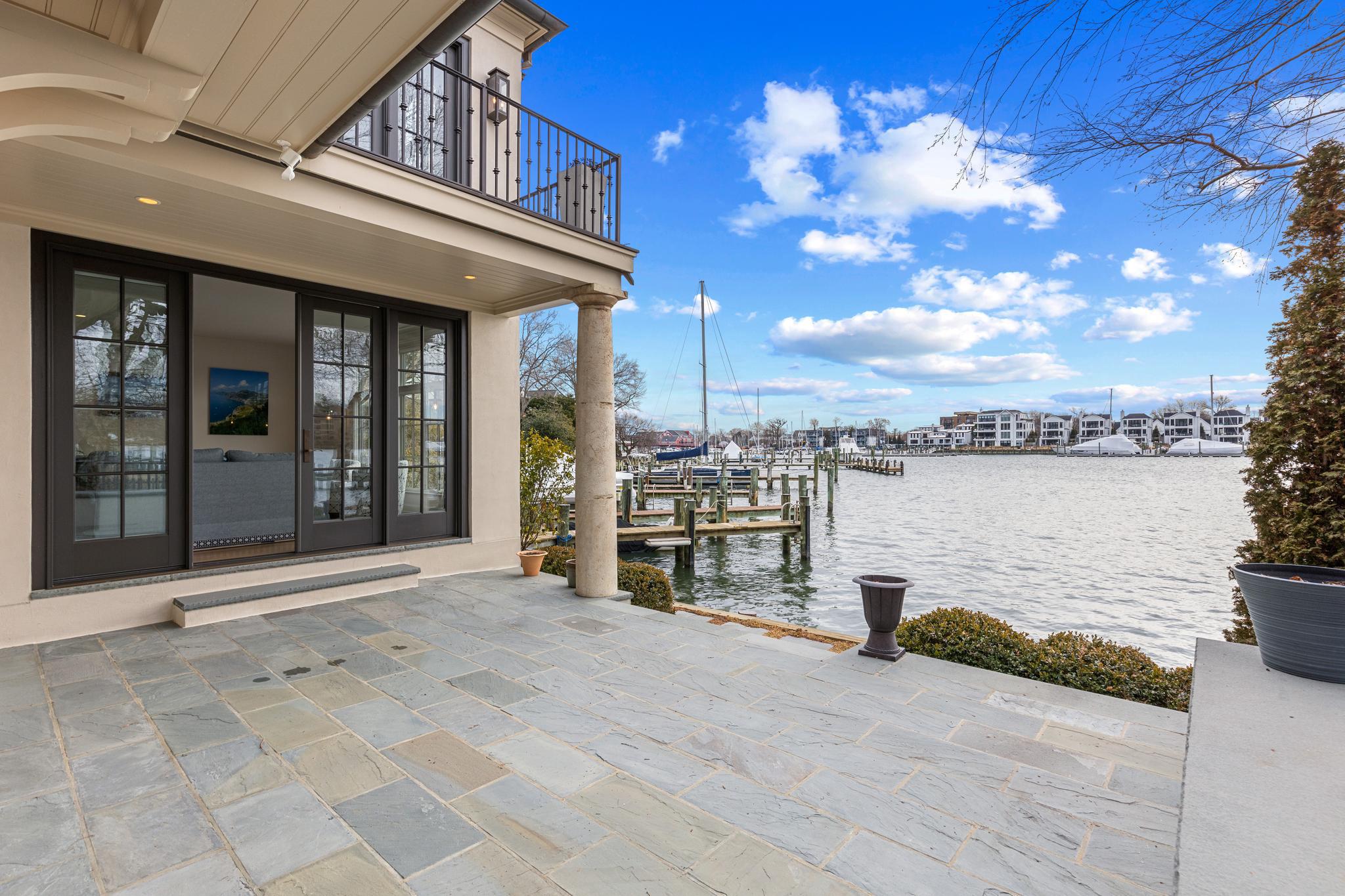Stately French Villa on Spa Creek in downtown Annapolis! This jewel box of a home was designed and built by a renowned local architect as the culmination of an award-winning career. Offered completely turn-key, this exceptional residence conveys fully furnished and thoughtfully appointed—including furniture, fully equipped kitchen, linens, etc —allowing you to arrive with nothing more than a suitcase and begin enjoying the Annapolis waterfront lifestyle from day one. The unrivaled architectural detail, exquisitely curated finishes, and sweeping views across Spa Creek elevate this residence into a class of its own. Privately positioned at the end of a quiet street within one of downtown’s most coveted waterfront enclaves, this 3-bedroom, 3.5-bath retreat is equally suited as an elegant weekend escape or a full-time residence.Dramatic Palladian windows bathe the interiors in natural light while perfectly framing the ever-changing harbor views. At the heart of the home, the gourmet kitchen—appointed with custom cabinetry, premium appliances, and a striking designer hood—flows seamlessly into both the formal living room and inviting family room, each enhanced by a gas fireplace and captivating water vistas. A main-level secondary primary suite offers comfort and flexibility for guests of all generations.Upstairs, the extraordinary waterside primary suite features vaulted ceilings, walls of glass, a gas fireplace, spa-inspired bath with soaking tub, and a custom dressing room with center island. A private balcony provides the ideal perch for sunrise coffee or sunset reflections overlooking Spa Creek, Annapolis Harbor, and Eastport.Designed for effortless waterfront living, two deep-water piers with approximately 9 feet of MLW accommodate substantial vessels, with immediate access to the Severn River, the Chesapeake Bay, and beyond. Walkable to the shops, restaurants, and charm of downtown, this rare offering delivers convenience, privacy, elegance, and ease in one remarkable package. Welcome Home!