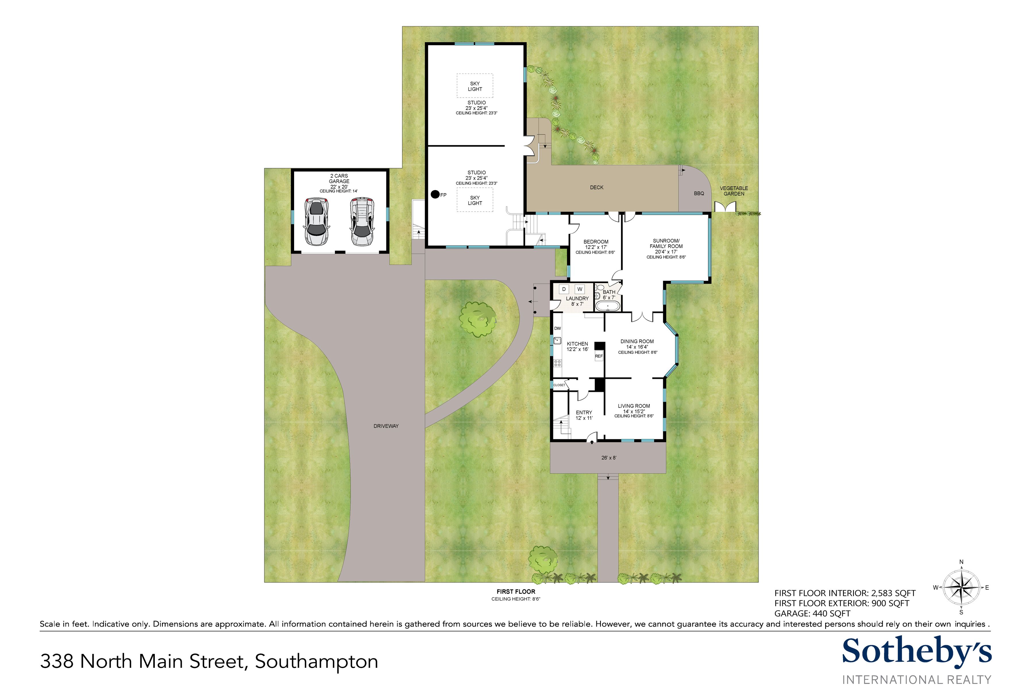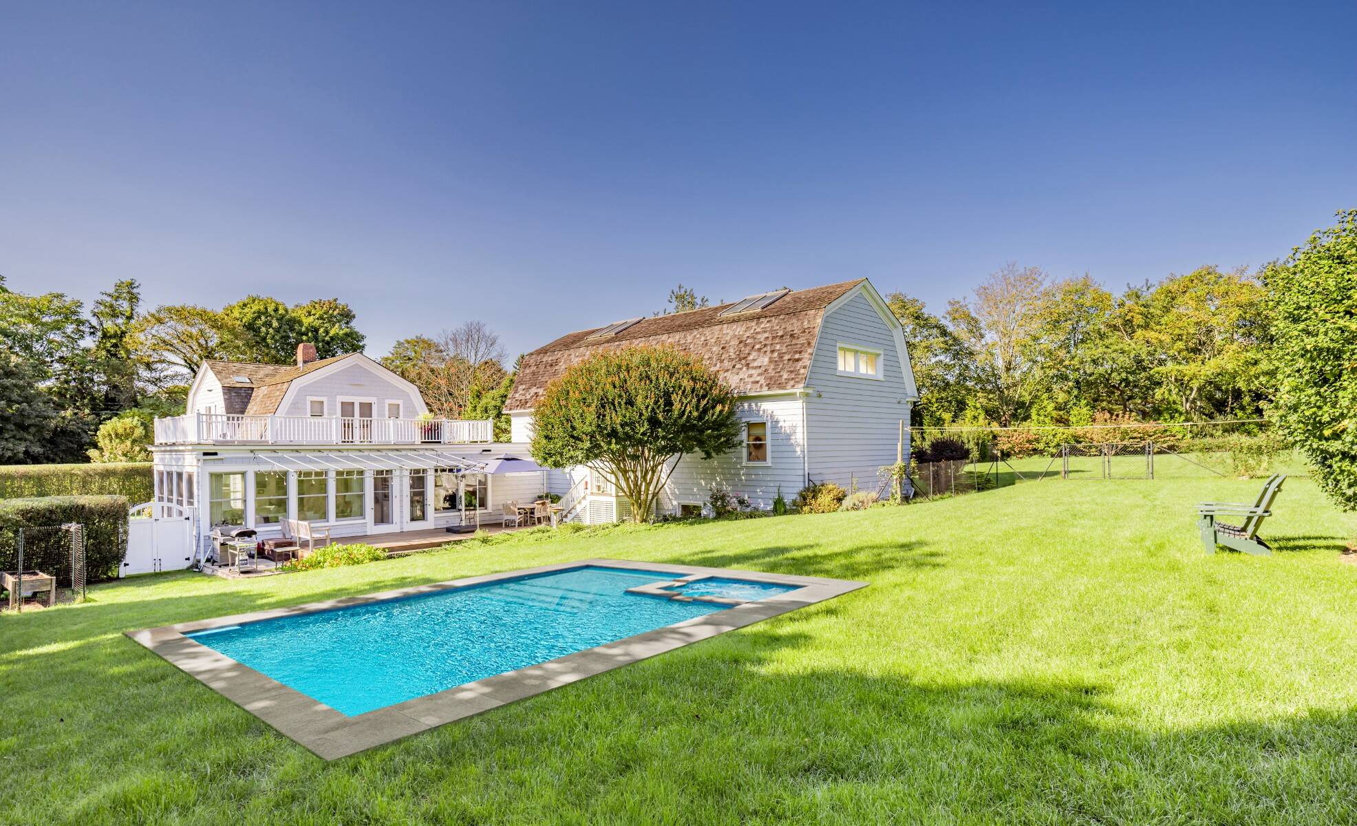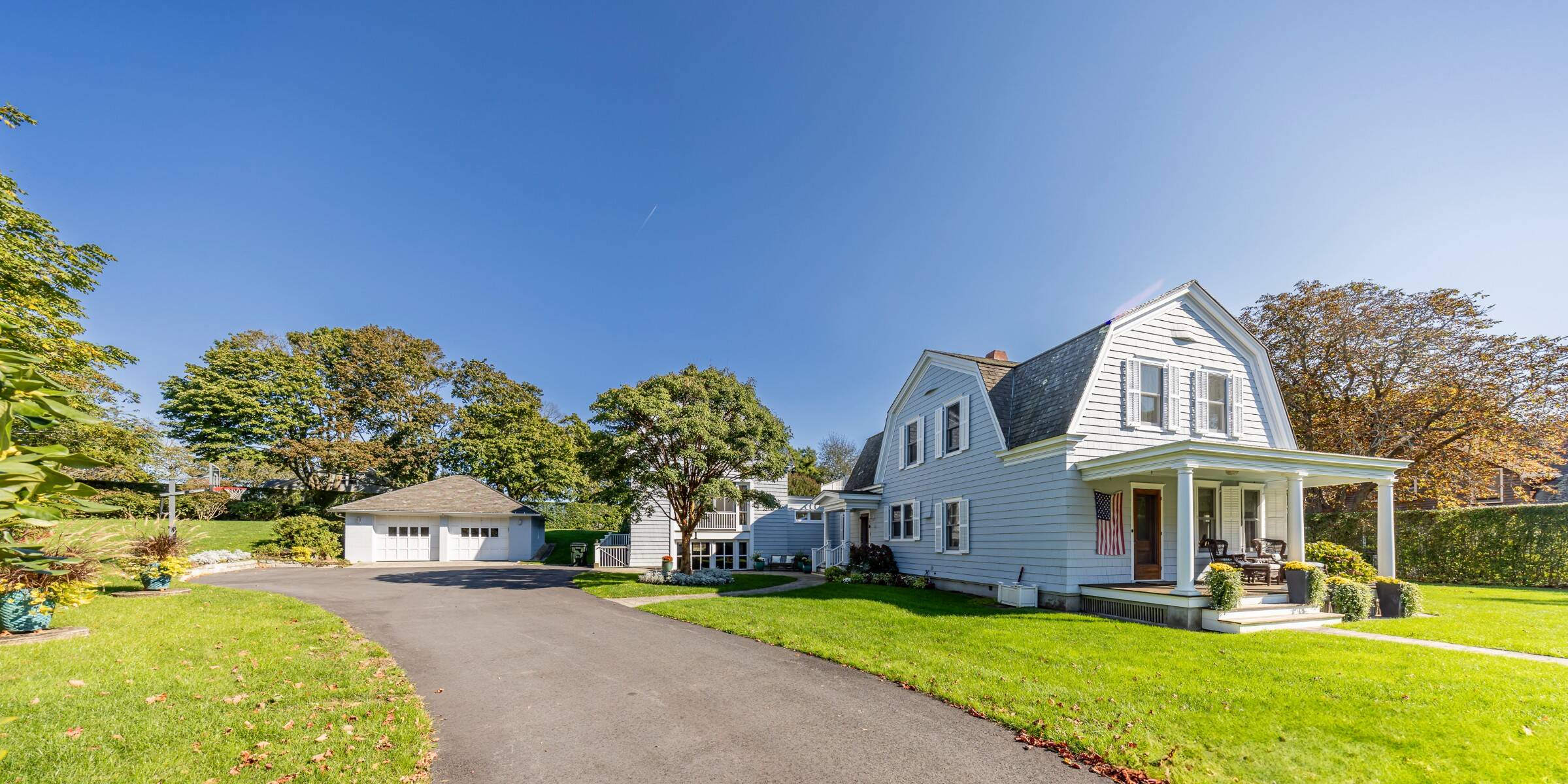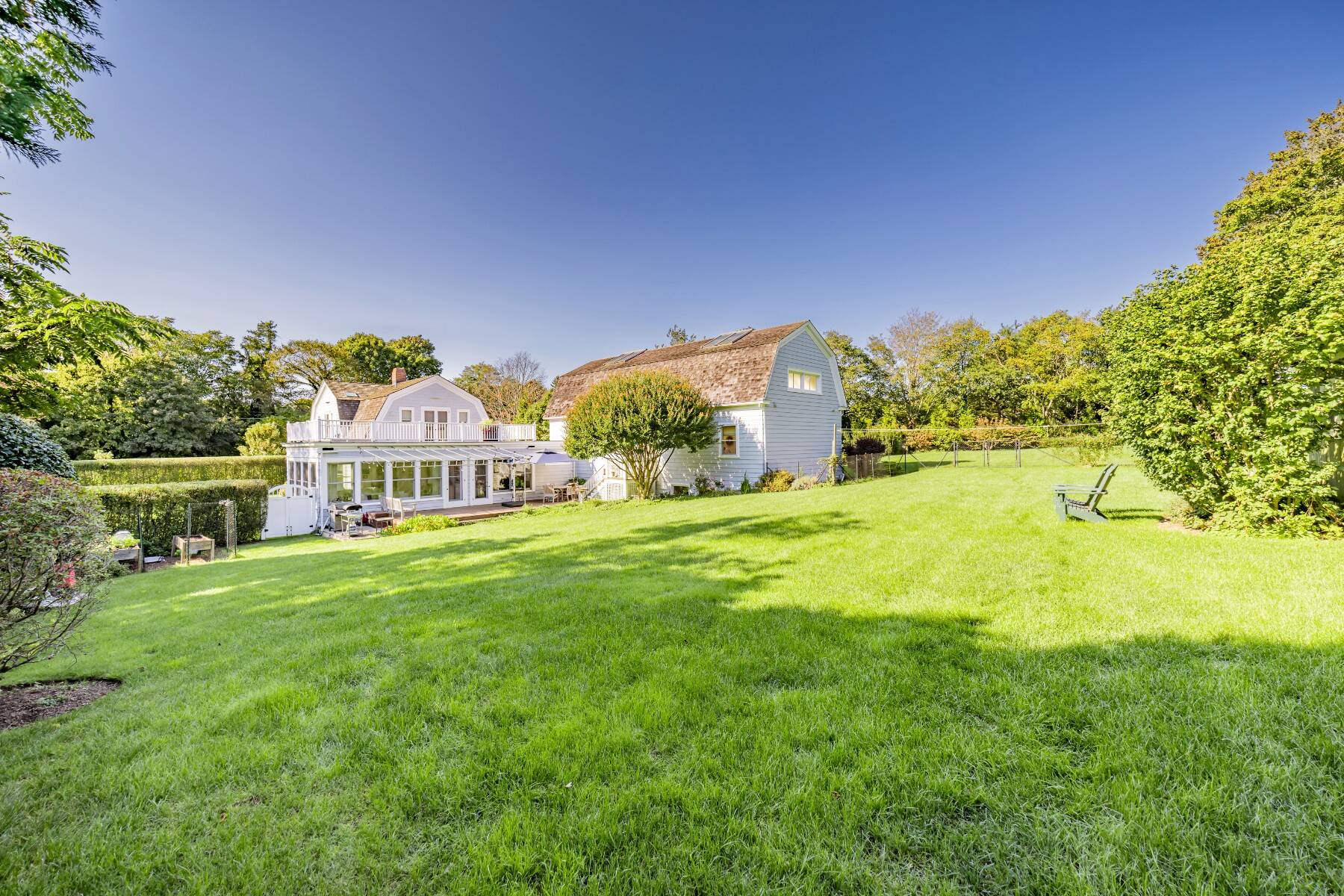 This beautifully restored classic home is set on a lush, full acre in Southampton Village, seamlessly blending timeless charm with modern comfort and exceptional potential. The first floor features a gracious formal living room, an elegant dining room, and a sunlit family room with expansive windows and French doors that open to a large rear deck-ideal for effortless indoor-outdoor living. The stylish, well-appointed kitchen is outfitted with stainless steel appliances, perfect for everyday living and entertaining. A flexible bedroom or office and a full bath complete the main level, while a detached two-car garage adds convenience. Upstairs, the private primary suite offers an ensuite bath and a spacious mahogany deck, creating a peaceful retreat. Two additional guest bedrooms share a full bath, providing comfortable accommodations for family or visitors. A true standout is the impressive, light-filled 2,200 sq. ft. attached studio. Designed with cathedral ceilings, skylights, and incredible scale, this space offers endless possibilities-ideal as an art studio, home office, or guest quarters. The lower level spans 22' x 50' with 10-foot ceilings, while the upper level features two expansive rooms with soaring 23-foot ceilings. Exterior access via a dedicated staircase seamlessly connects the studio to the backyard entertaining areas. Additional highlights include a charming front porch, mature landscaping, and privacy hedging, along with a detached two-car garage, a shed, and high-end mechanicals including 400-amp electric service, two Aprilaire systems, and geothermal air conditioning with heating capability. Set on a meticulously landscaped acre-rare within the Village at this price-this exceptional property offers ample room for a pool, gardens, or future expansion, presenting a unique opportunity to create a true retreat.