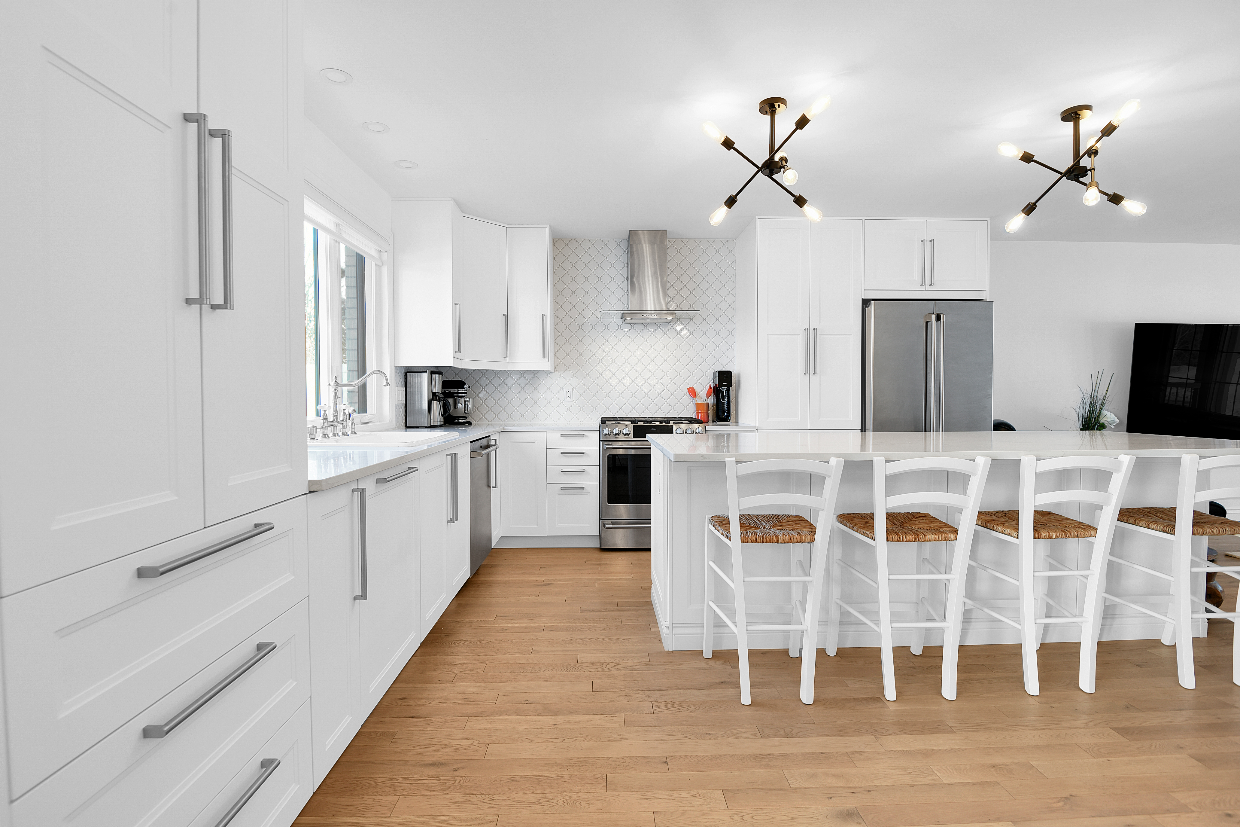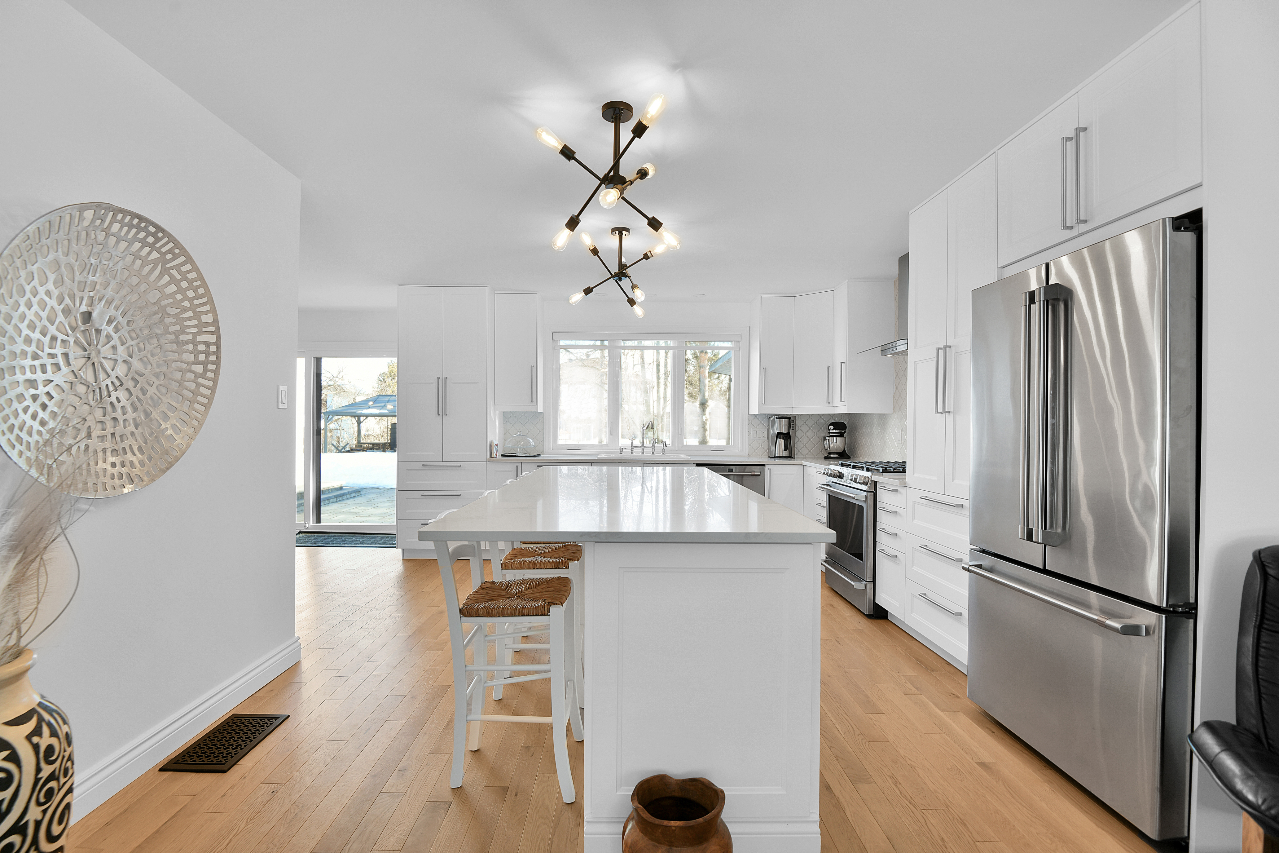 The main wing offers an open-concept layout that seamlessly connects the dining and great rooms with the kitchen. This chef's dream features a long center island with seating and top-of-the-line appliances, including a gas stove with a professional hood fan. Sliding doors from the dining room lead to a private backyard oasis complete with a saltwater pool (2021) surrounded by interlock landscaping.