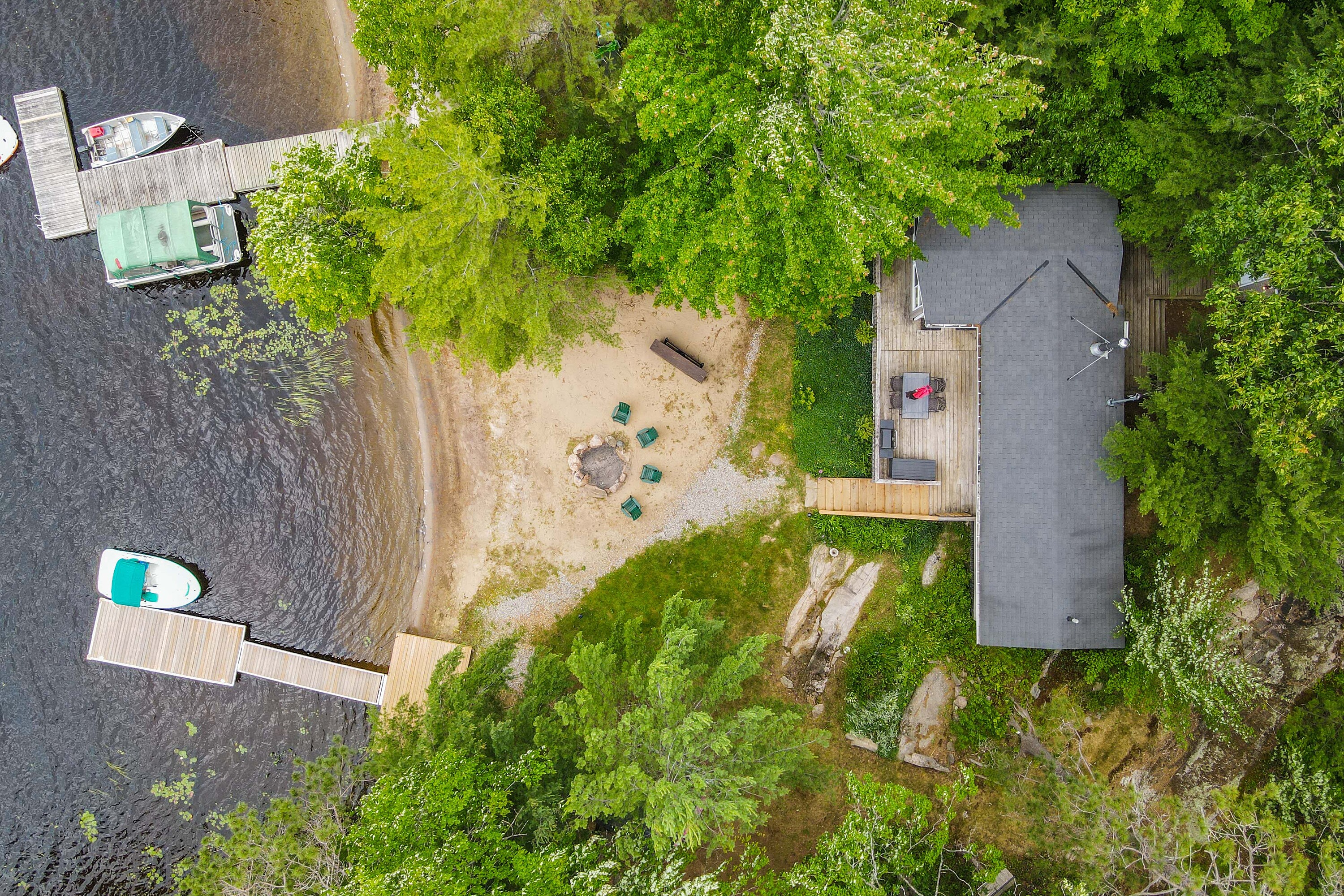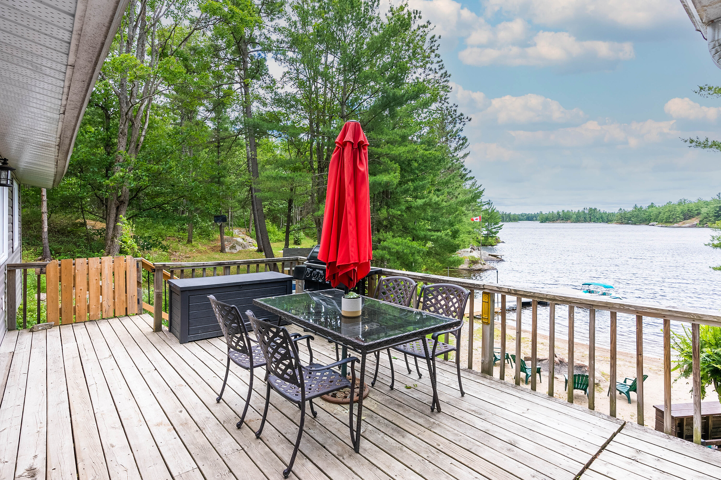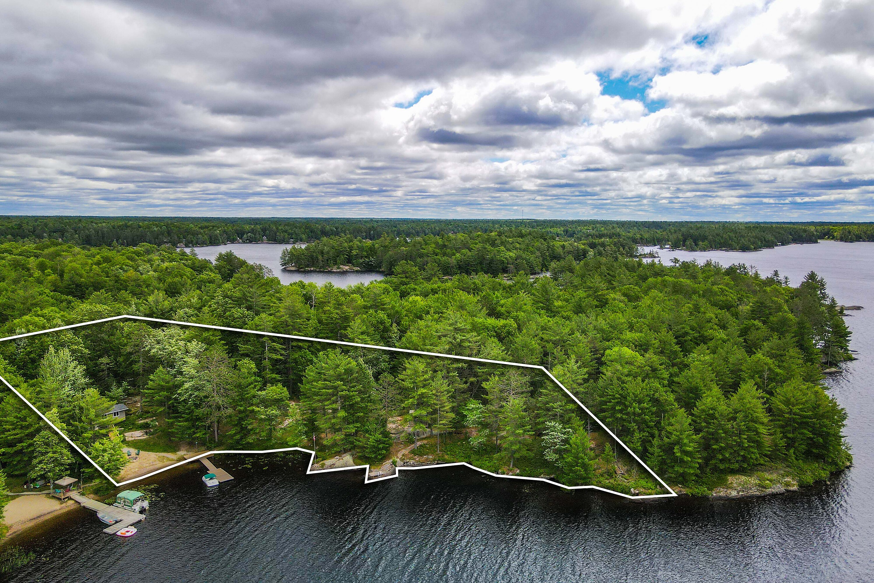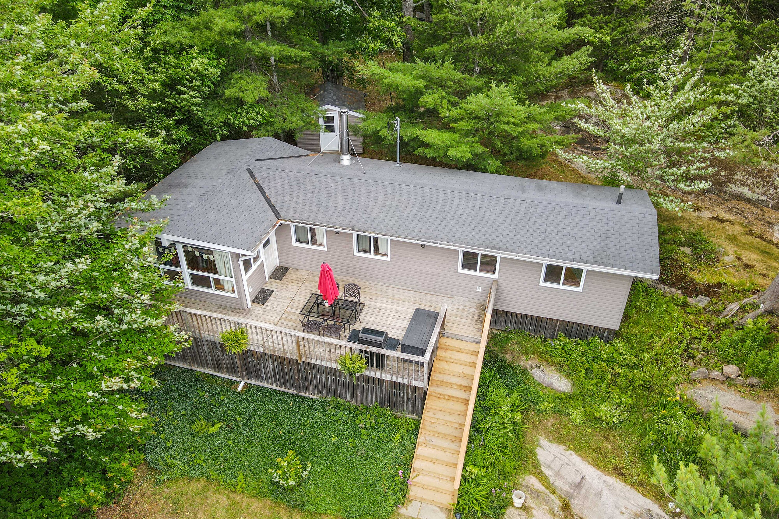 If stealing the spotlight in family lawn games (or just stealing a little sunset quiet time outside) excites you, this expansive lakeside yard is calling your name! Boat access from the mainland brings you to an exceptional west-facing retreat with over 337 feet of private shoreline, capturing iconic Muskoka sunsets and expansive lake views. Set in a quiet bay shared by just two other cottages and backed by stretches of crown land, the setting is both private and unspoiled. The 1.5-acre property features a level, granite shoreline with a sandy, shallow-entry beach-ideal for families and easy swimming-while the dock extends into deeper water. A raised waterside gazebo offers the perfect place to take in the view, and a lakeside shed keeps all your gear organized and within reach. Inside, the open-concept cottage offers two bedrooms plus a flexible laundry room that could be converted into a third, along with a cozy wood stove and warm pine finishes throughout. A separate insulated bunkie provides comfortable overflow space for guests. Offered fully turnkey, this package includes a 50HP pontoon boat and a 1987 StarCraft V6 - arrive and start enjoying cottage life immediately. Recent updates include a new water line (2024), septic lift pump (2022), new bunkie flooring, and deck stairs with dock (2021), along with fresh beach sand added in 2022. Earlier improvements include a modernized kitchen with granite countertops, and upgrades to electrical, plumbing, windows, and septic. Evenings are best spent by the fire pit or under the stars along your private shoreline. Located just under two hours from the GTA, the property includes two parking spaces and a boat slip at Denne's Marina (yearly fee), just a five minute boat ride away-making access simple and convenient. A move-in-ready Kahshe Lake cottage with space, privacy, and all the essentials already in place. Your three-season turnkey cottage is ready to enjoy!