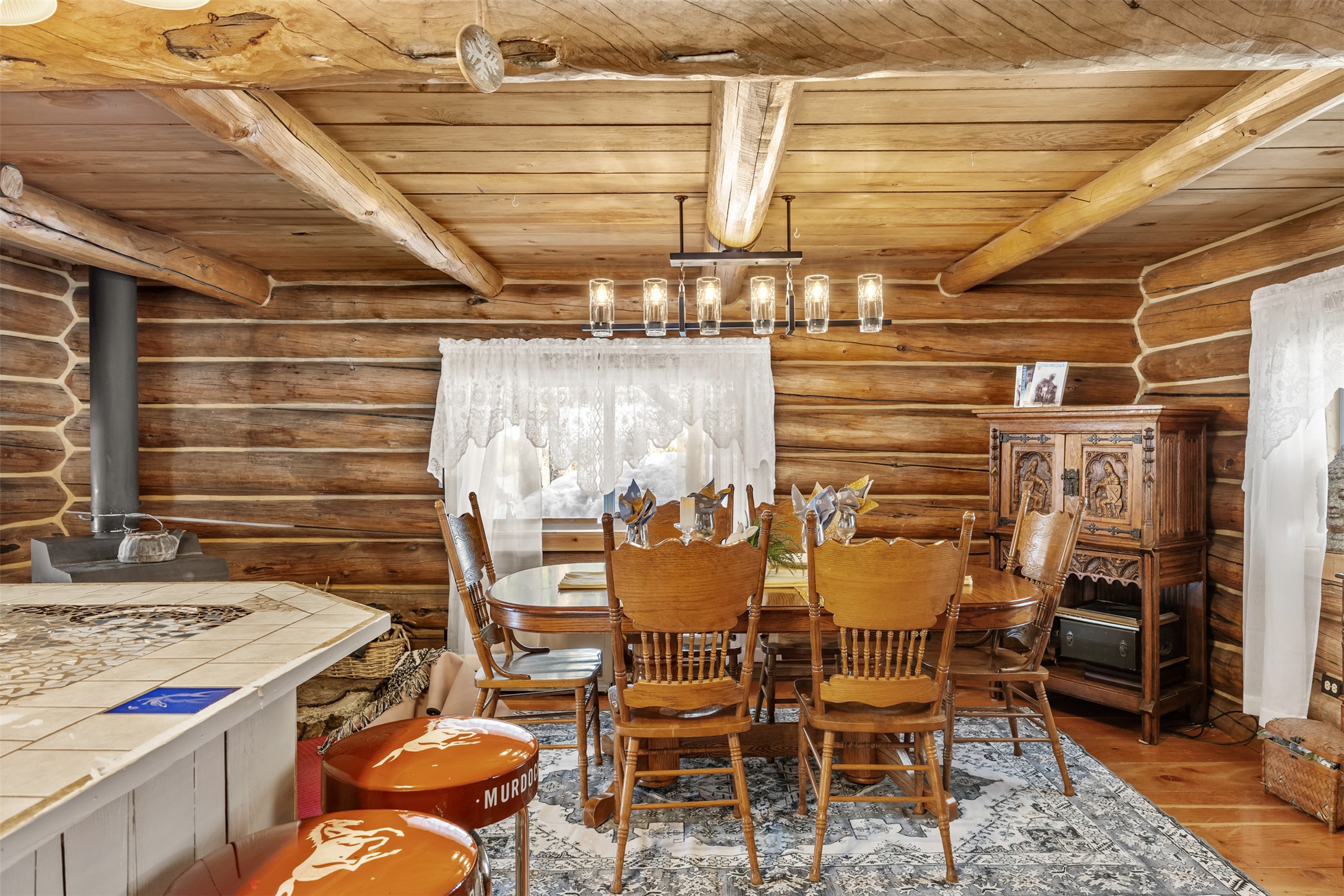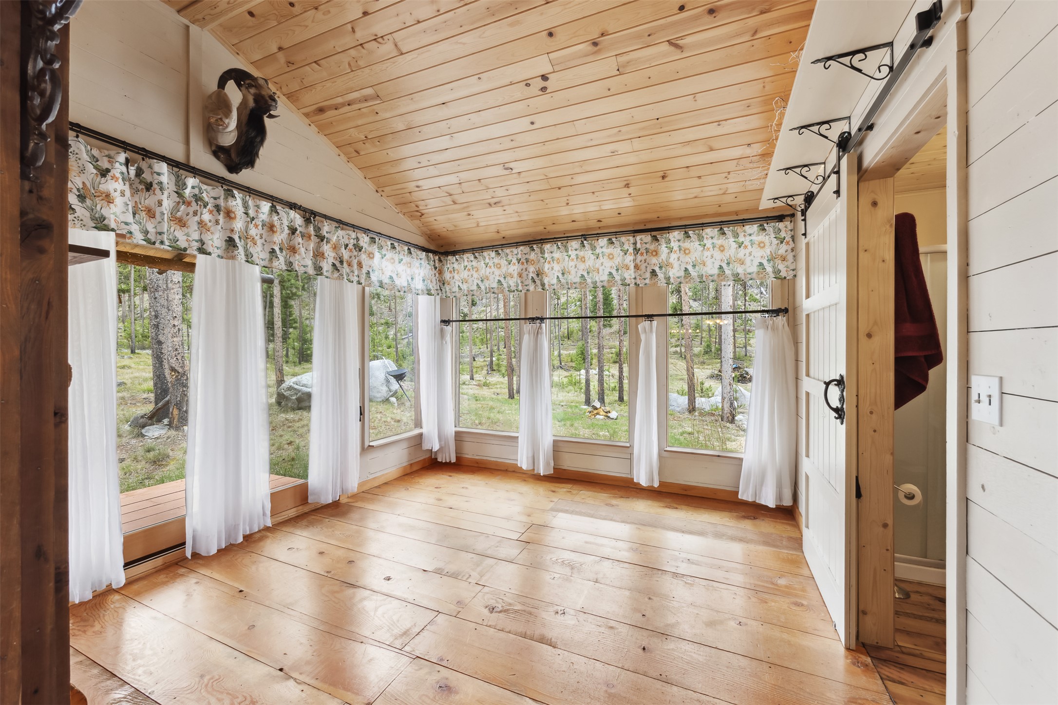 creating a warm and inviting atmosphere. Inside, the open-concept kitchen and dining area provide the perfect space for gathering, while the loft bedroom and sunroom offer a peaceful retreat to take in the beauty of Montana's wildlife and scenery. A newly remodeled bathroom adds a touch of modern comfort to this rustic haven.