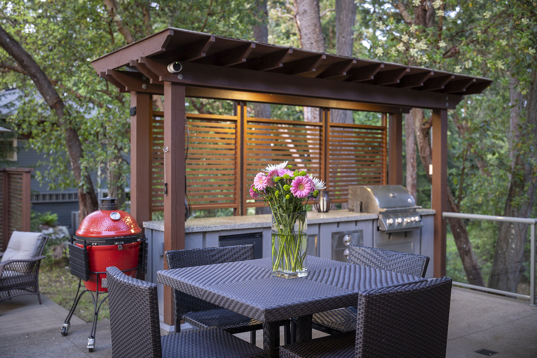 This exceptional West Coast-style home is set in a private Cordova Bay cul-de-sac with mature gardens, underground services, and an exclusive feel. Built by Citta as the original show home, it offers over 4,400 square feet of quality design. The main floor features an open kitchen with oversized island, living room with gas fireplace, and California shutters throughout. The primary bedroom is also on the main level with a gas fireplace, updated ensuite, and custom walk-in closet. Upstairs are three spacious bedrooms, including one with its own ensuite and walk-in closet. A detached casita with a private two-piece bath offers flexible use as a studio, home office, or guest area. The private backyard includes two composite decks, an outdoor kitchen, and a six person hot tub. Other highlights: two car garage with built-ins, upgraded HVAC, security system, and irrigation. Steps to trails/hiking, and close to Broadmead Shopping Centre, beaches, schools, Mattick’s Farm, and Cordova Bay Golf.