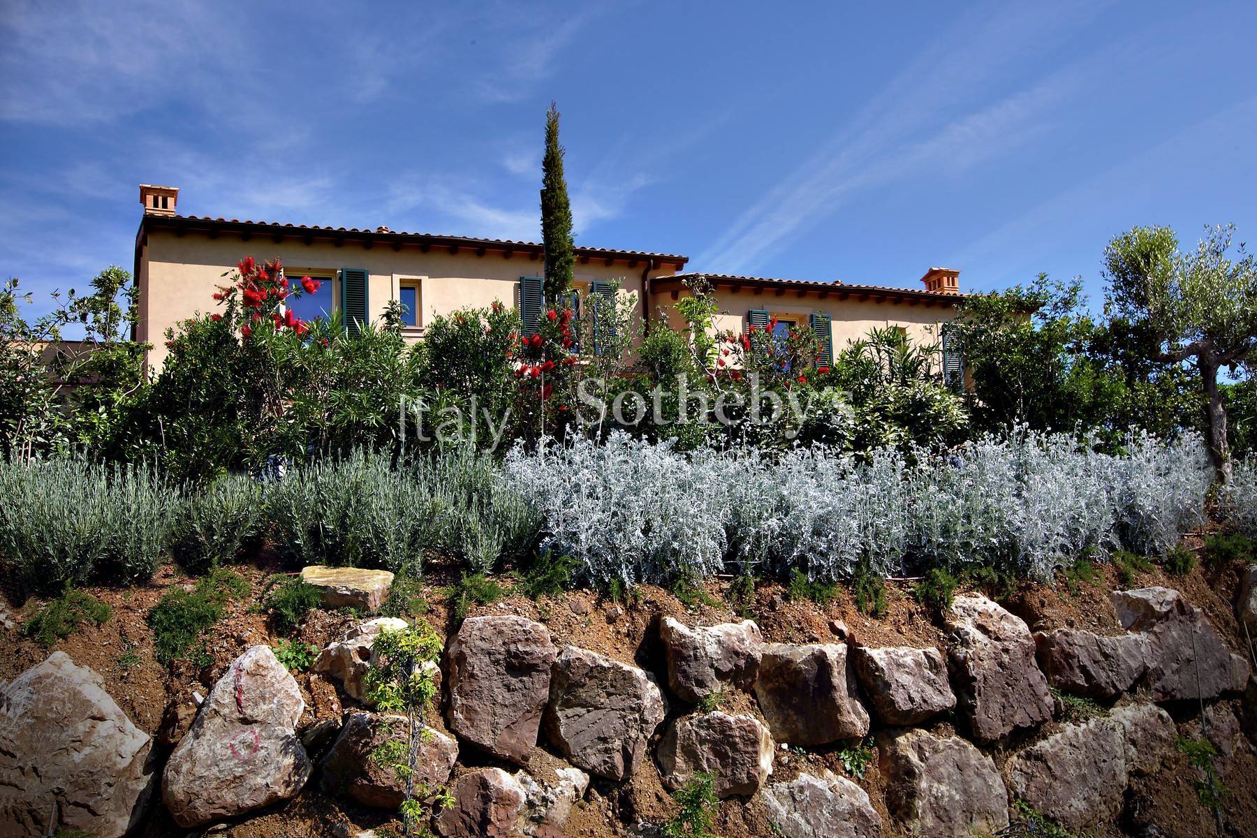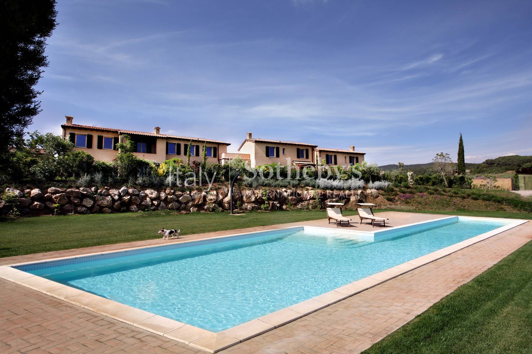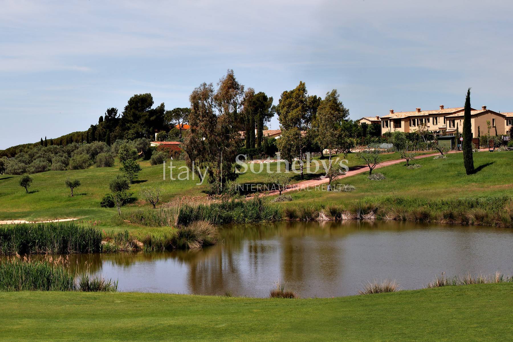 In an enchanting setting between golf course, hills and sea, a small village of 10 residential units has been created. The farmhouses (from 143 to 159 m² plus terraces and garden) overlook a farmyard planted with olive trees and cypresses. Each home has its own garden with a pergola area and 2 parking spaces. The condominium area consists of gardens and a 20-meter swimming pool. The place enjoys a particularly mild microclimate that allows outdoor activities throughout the year. The homes are certified in class A and are built to offer the highest level of comfort and guarantee minimum management costs while respecting the environment: radiant panel heating, handmade Impruneta terracotta floors, Villeroy & Boch sanitary ware, centralized TV and data systems, high-speed internet connection. Management services are available on request, which are highly appreciated. The property presented here is reached by crossing a small garden while the living area overlooks the garden of relevance already planted with native species. The house is on two levels with a kitchen, large living room and service area and/or study with bathroom on the ground floor. On the upper floor we find the three bedrooms, of which the master bedroom with its own bathroom and the other two with a shared bathroom. The interior architecture has been designed with great care to be able to use the houses both for holidays and to live in them all year round with plenty of space for guests and maximum privacy.