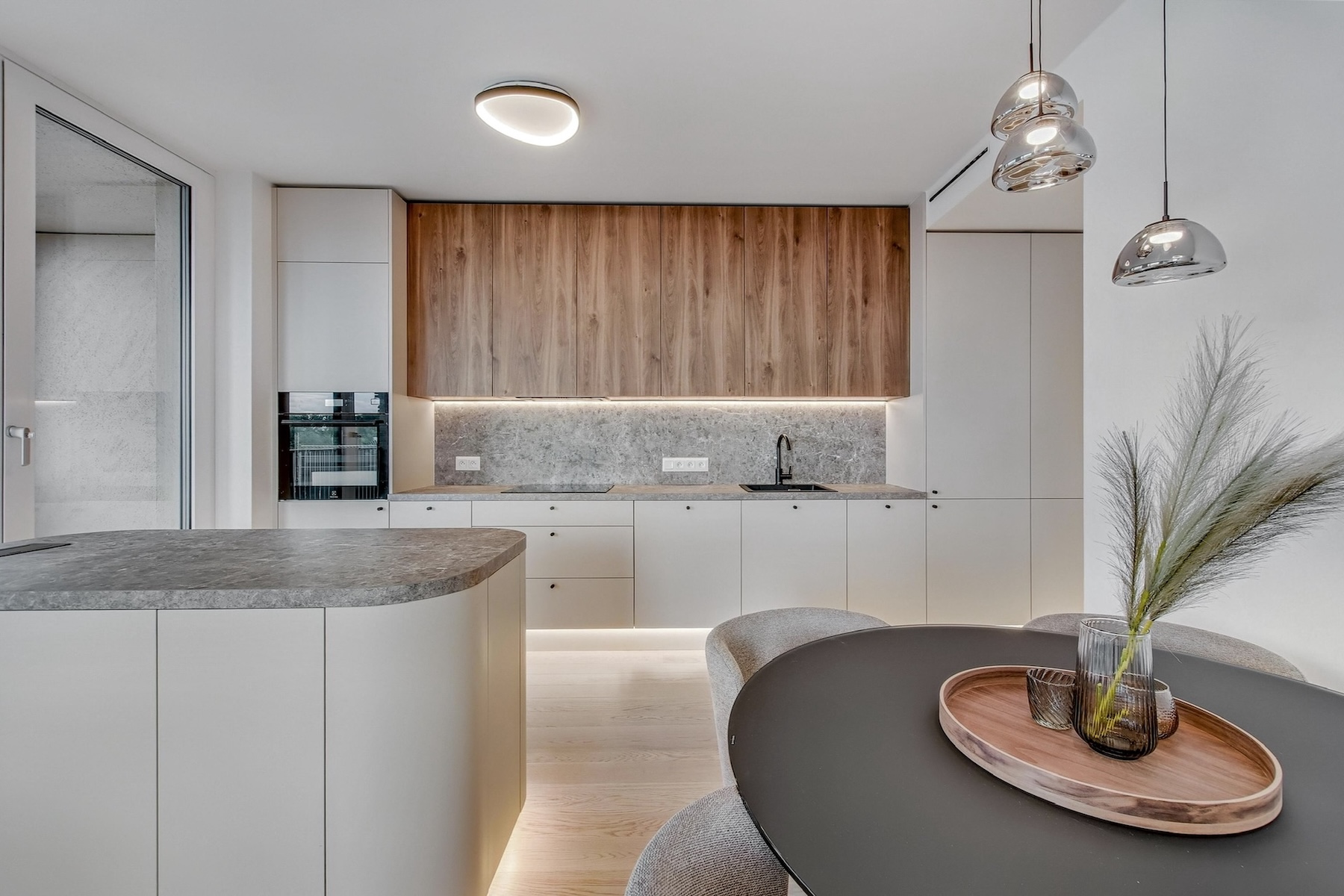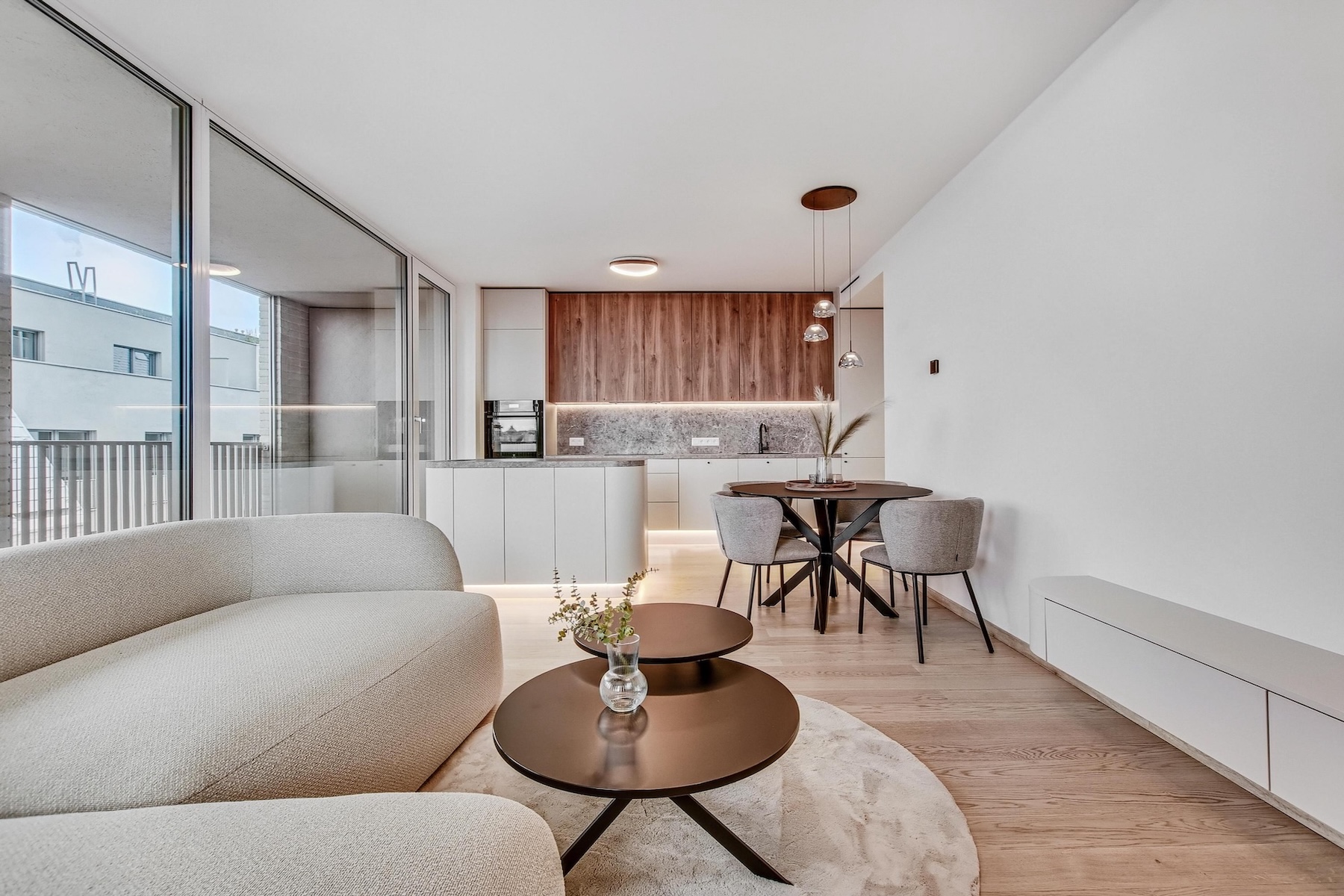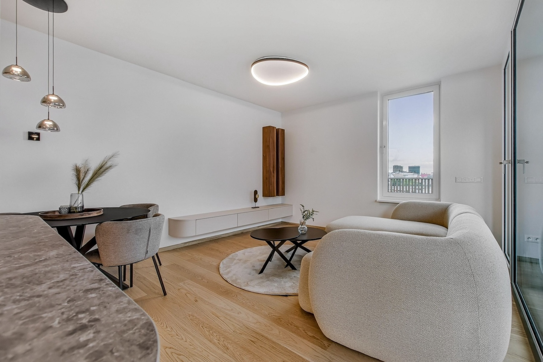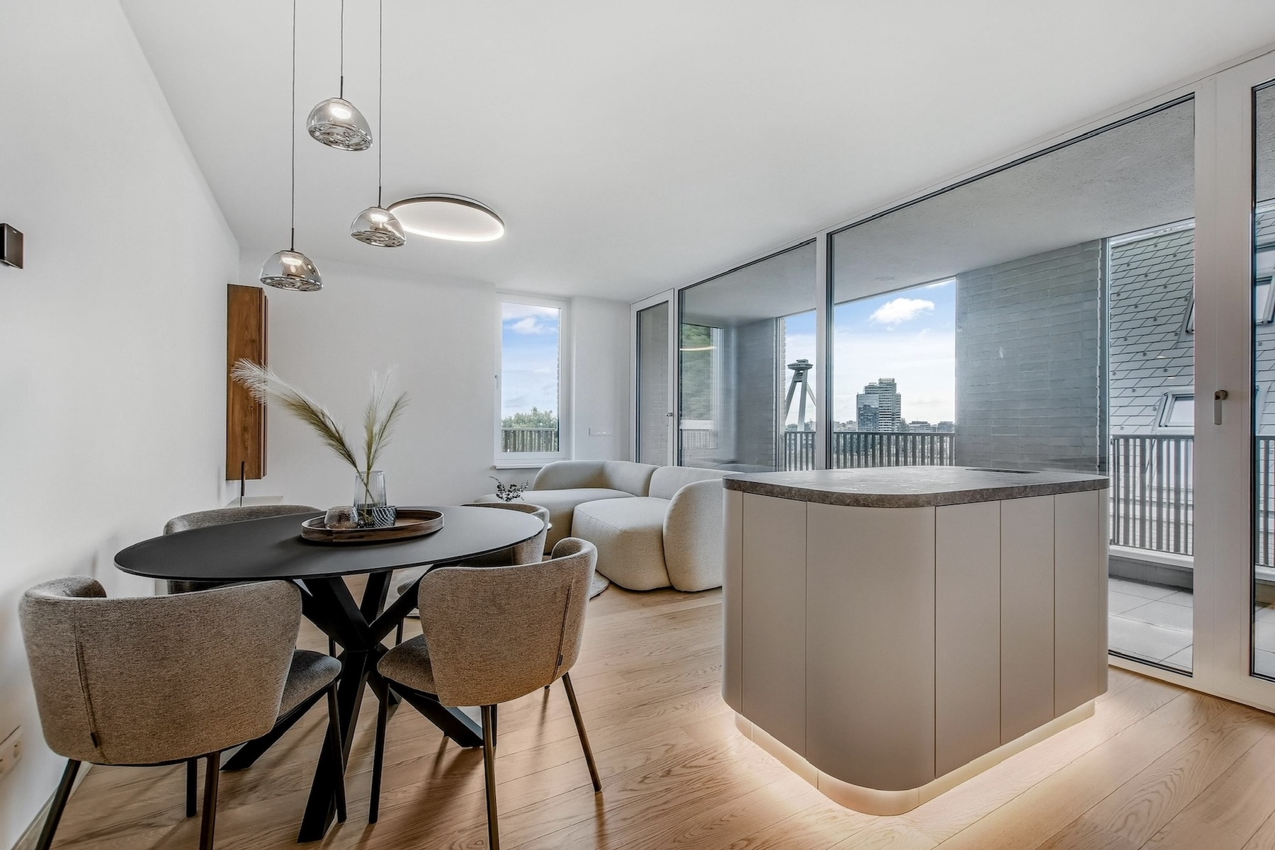 The apartment is fully furnished and features an open-concept living area that seamlessly extends to a spacious south-facing terrace. The kitchen is equipped with built-in appliances, a central island, and a dining area for four. The entire interior is designed with a focus on natural light, clean lines and practical storage solutions.