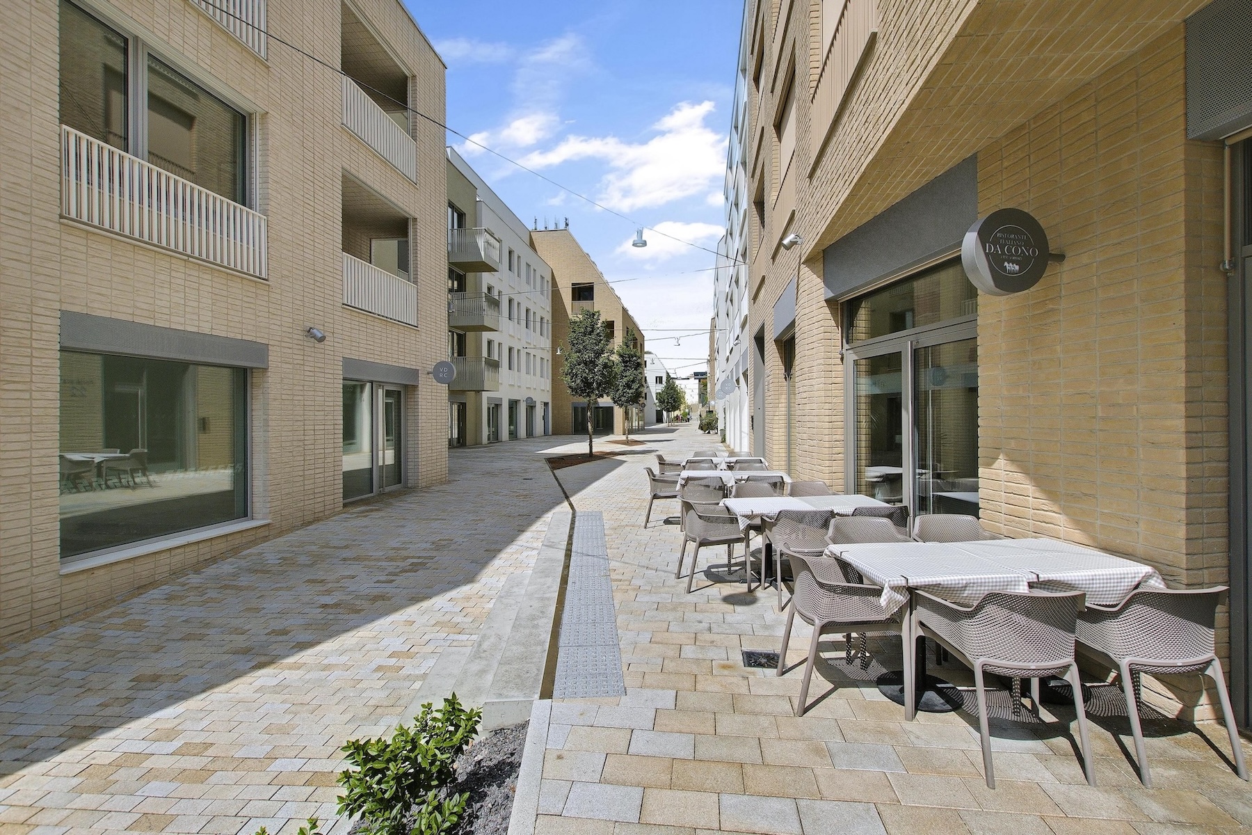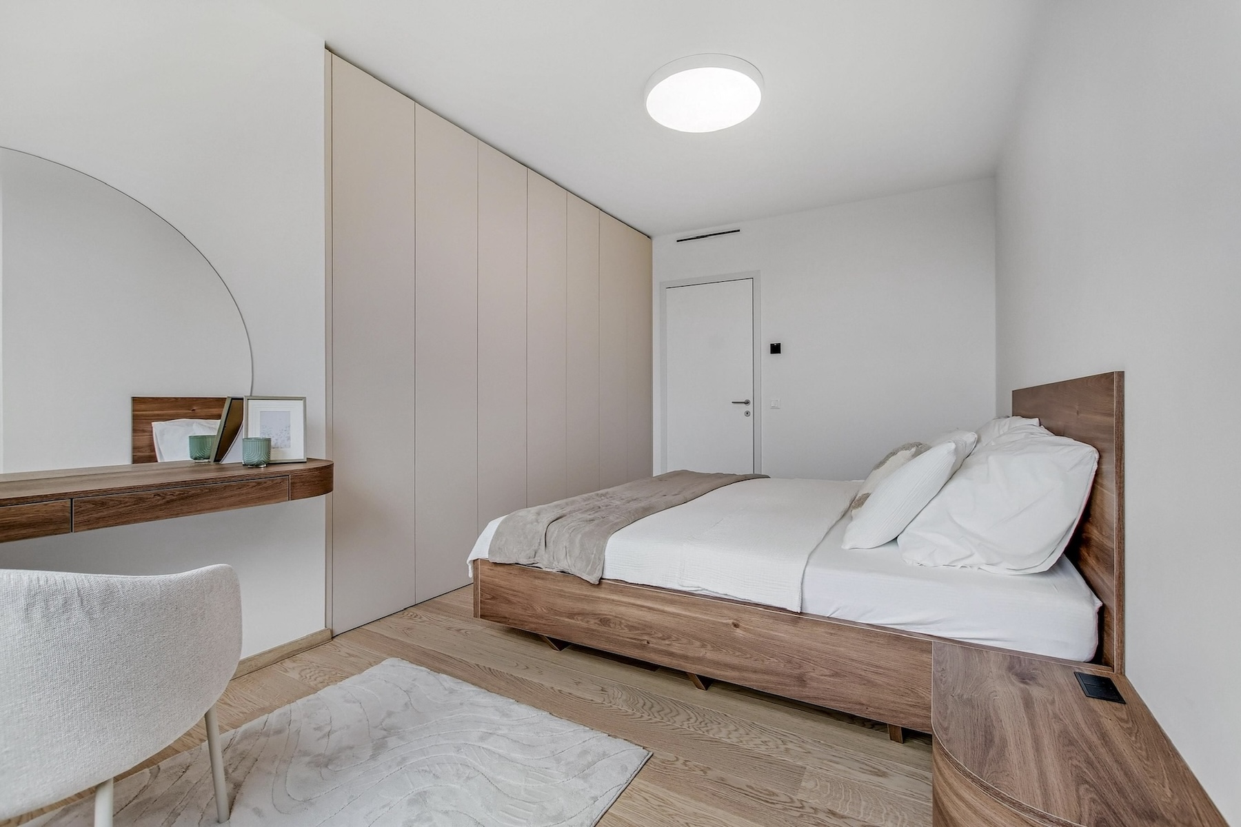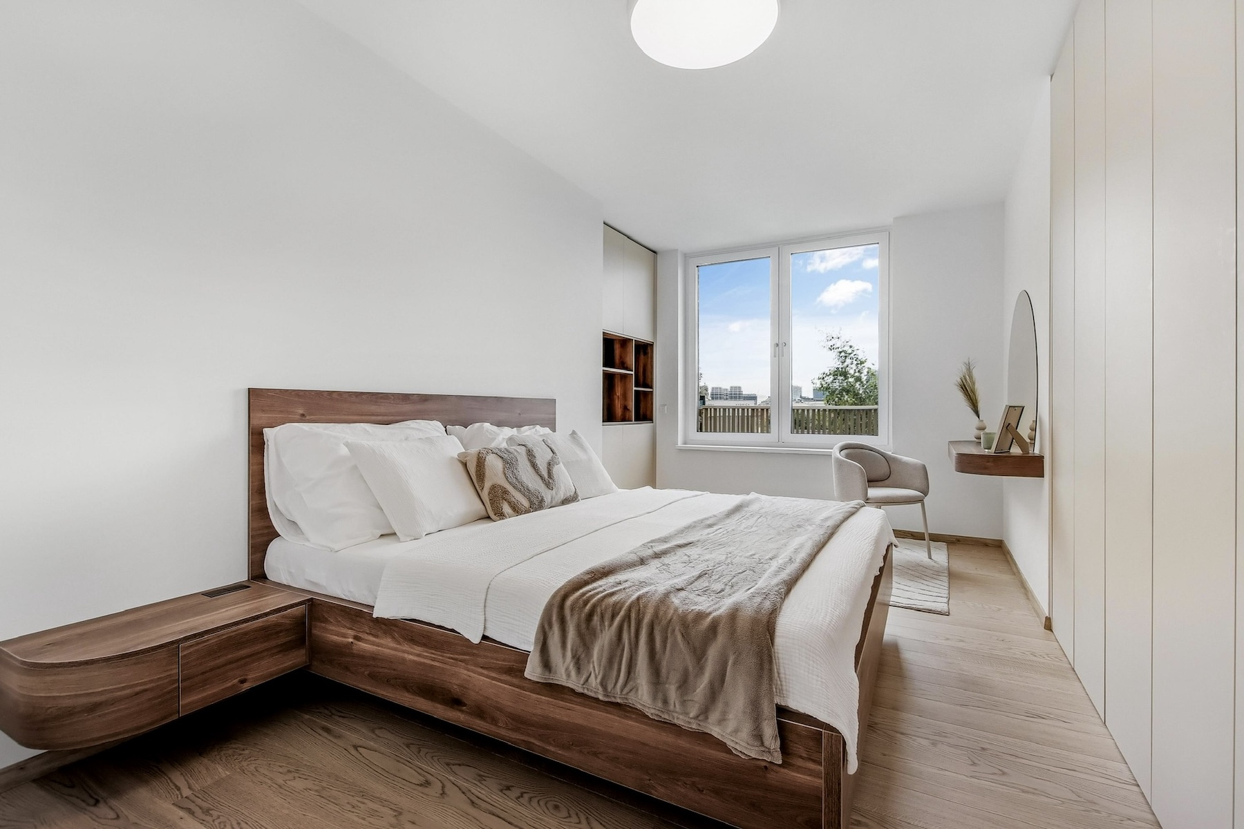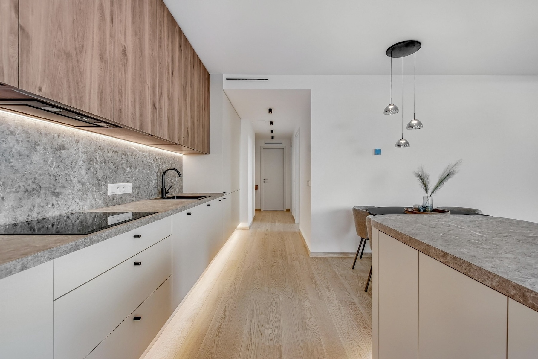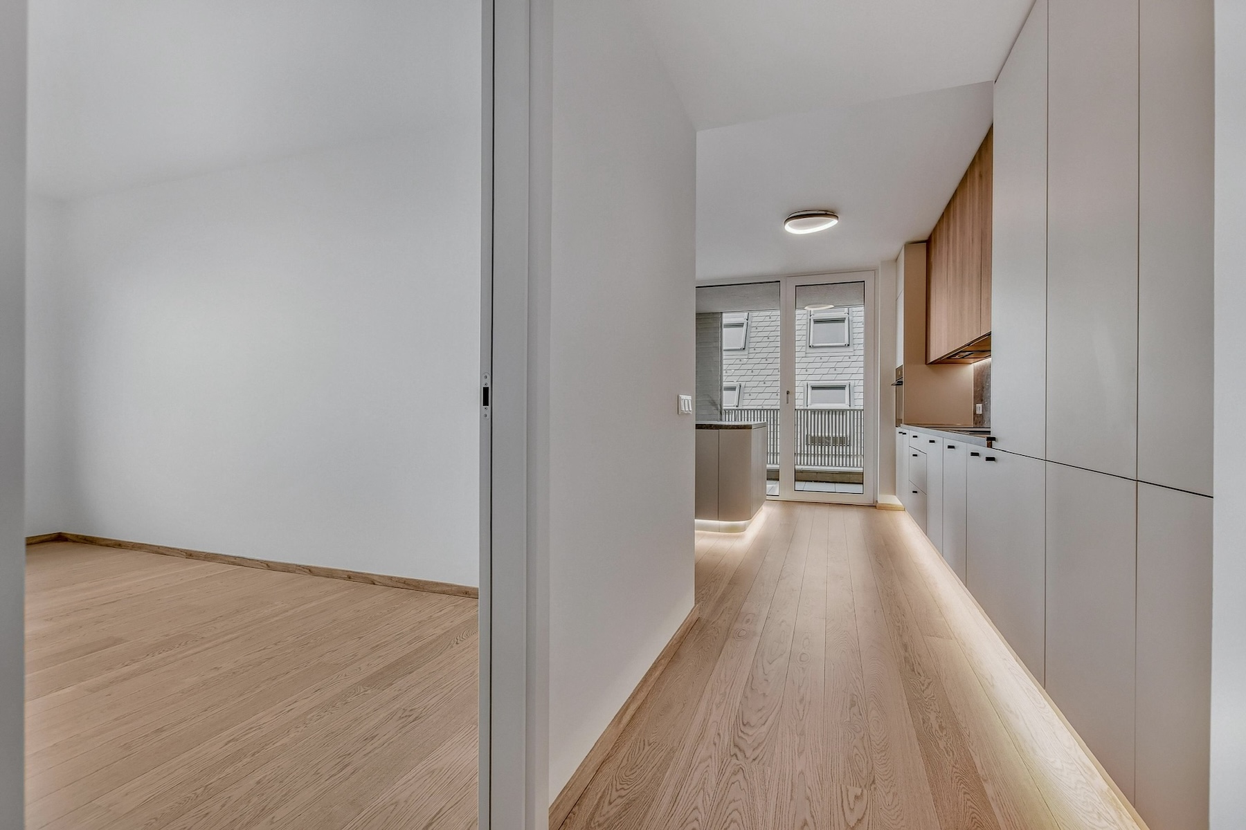 The apartment is fully furnished and features an open-concept living area that seamlessly extends to a spacious south-facing terrace. The kitchen is equipped with built-in appliances, a central island, and a dining area for four. The entire interior is designed with a focus on natural light, clean lines and practical storage solutions.