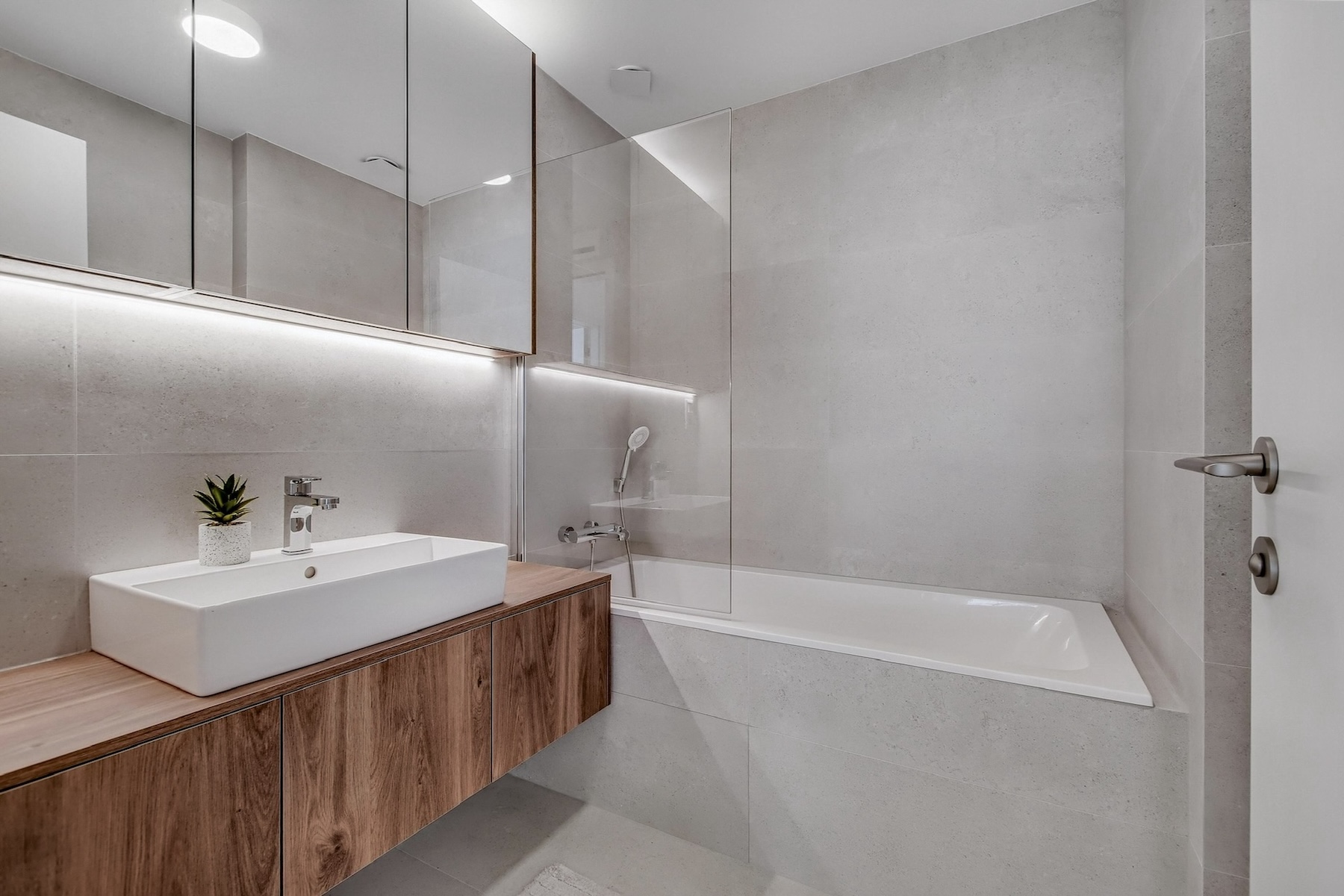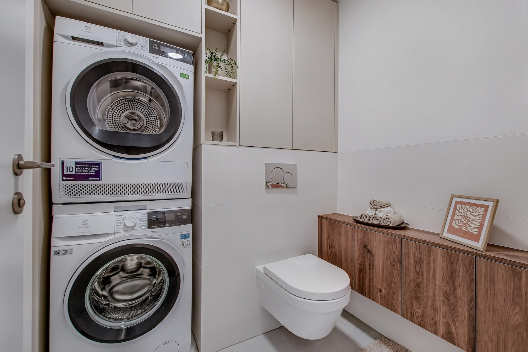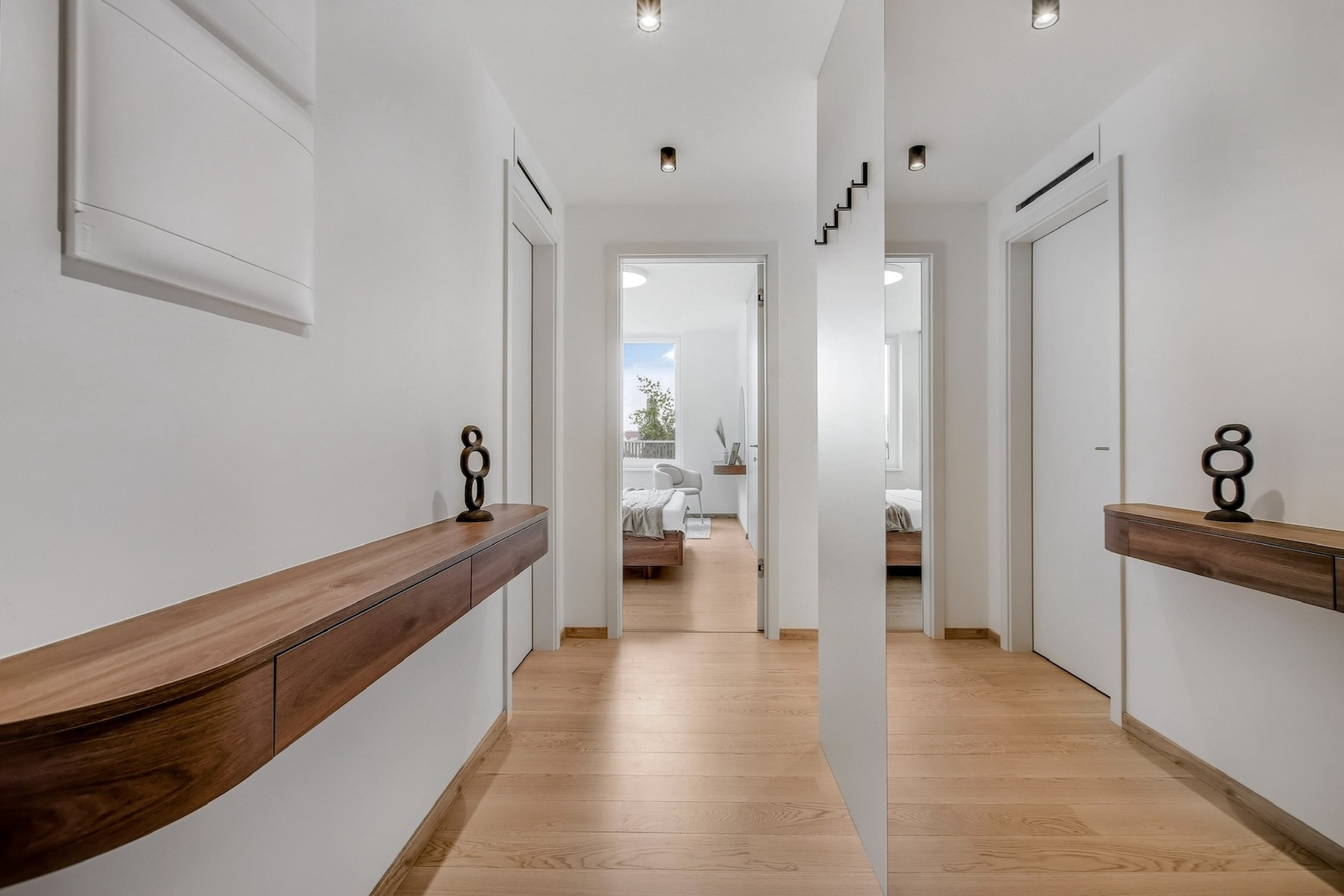 The sleeping quarters comprise two east-facing bedrooms, filled with morning light. The second bedroom can be customized according to the tenant’s needs – suitable as a child’s room, home office or guest room. The layout also includes an entrance hallway, bathroom with bathtub, and a separate guest toilet.