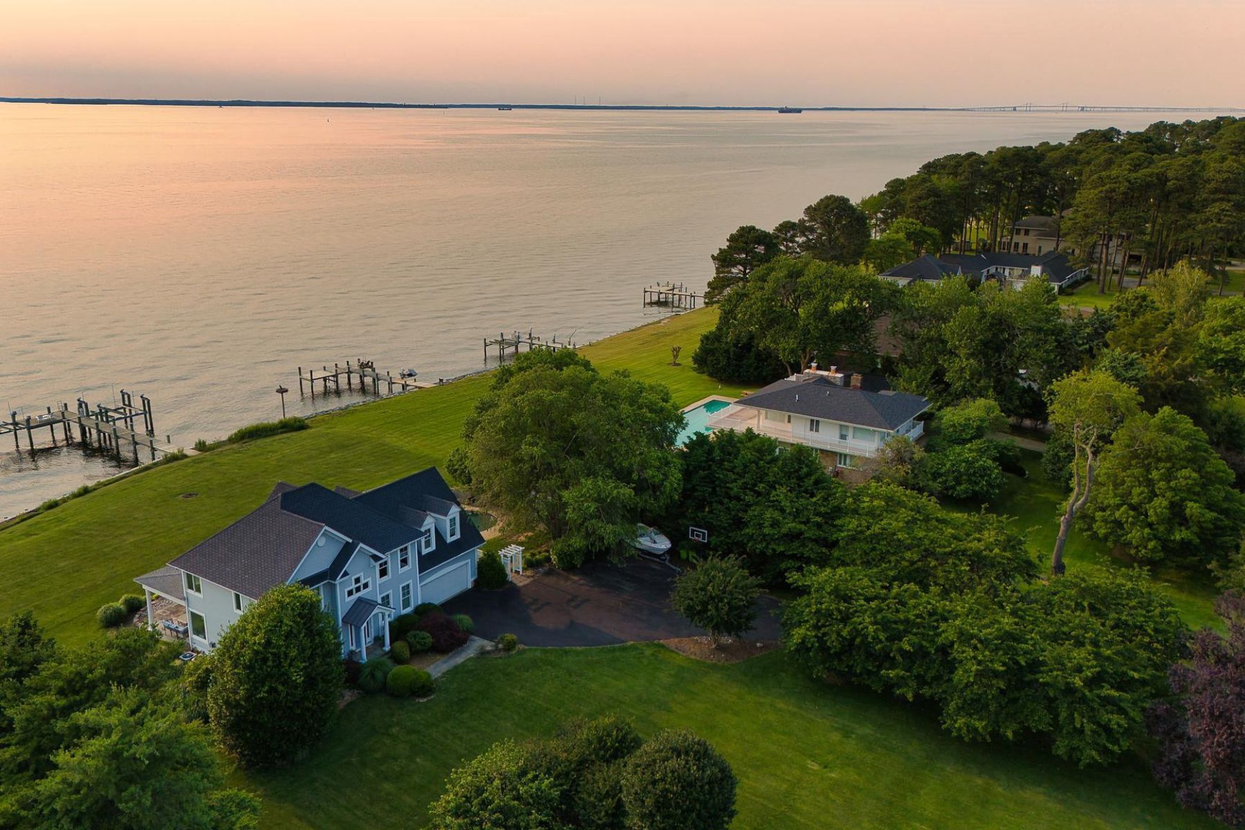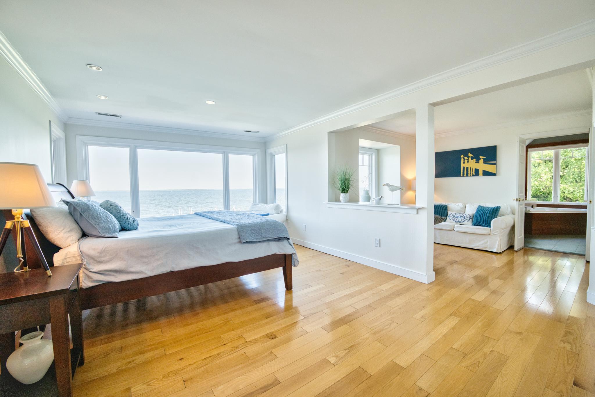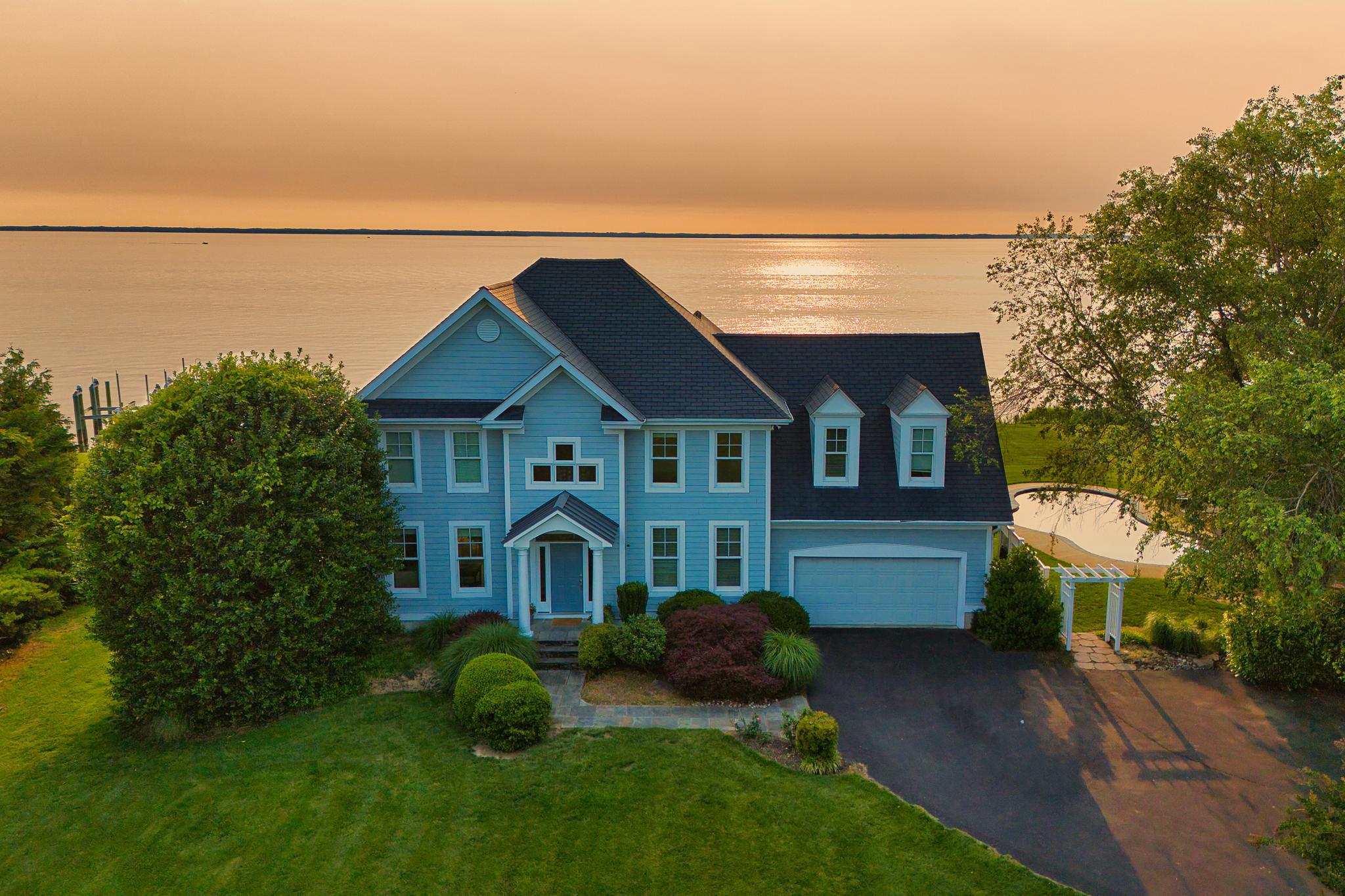 Welcome to a Chesapeake Bay retreat where spectacular views and unparalleled waterfront living await. Perfectly positioned on a serene cul-de-sac, this elegantly appointed home offers breathtaking vistas of the iconic Bay Bridge, majestic lighthouses, and sunsets that will leave you speechless.Upon entering the two-story foyer, the formal living room and bonus room welcome you and provide ample space for unwinding or hosting guests. The thoughtfully designed interior offers four bedrooms and four and a half baths, including an upper-level primary suite with a cozy sitting room and a yacht-inspired bathroom. On the lower level, a fifth bedroom studio suite features an ensuite bath, sitting area, and granite bar top — ideal as an in-law or au pair suite. A separate entrance to the outdoors provides additional flexibility and privacy.Natural light floods every room and frames the serene water views at every turn, accentuating the open-concept kitchen, dining area, and family room that flow seamlessly into the outdoor covered living spaces.Three sets of oversized French doors open to the stunning waterside patios, featuring a PebbleTec saltwater heated pool, lush mature landscaping, and perfect elevation outside of the flood zone — a rare combination that enhances both beauty and peace of mind. A covered patio and pool cabana with a dedicated pool bath create the perfect environment for relaxing or entertaining as you take in the beauty of the bay.The private dock with two boat lifts (12,500 lb and 30,000 lb) provides endless opportunities for fishing, crabbing, and boating, completing the ultimate waterfront lifestyle.This home is more than a residence—it’s a masterpiece of design and nature, crafted to immerse you in the soothing rhythm of life on the bay.Welcome Home.