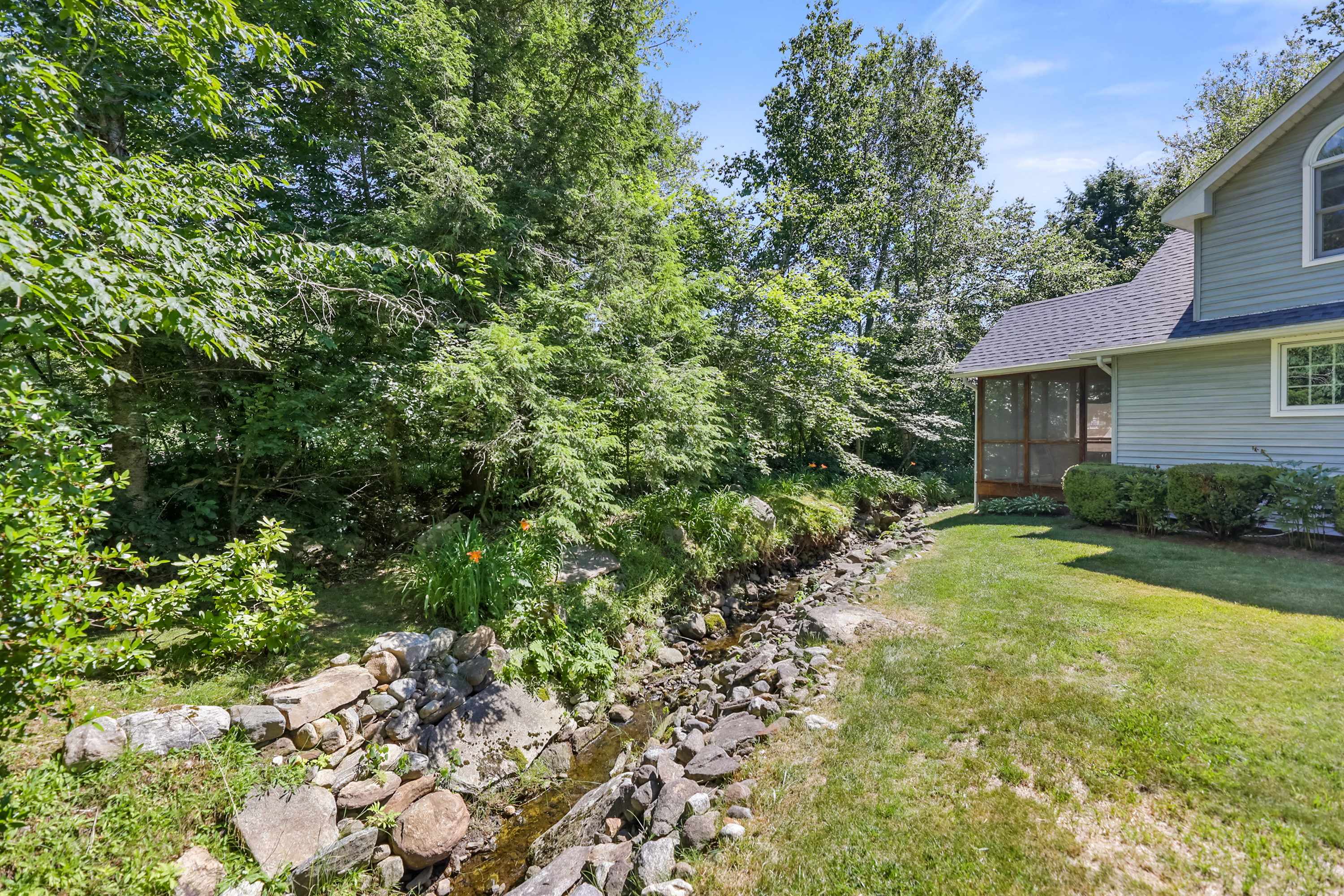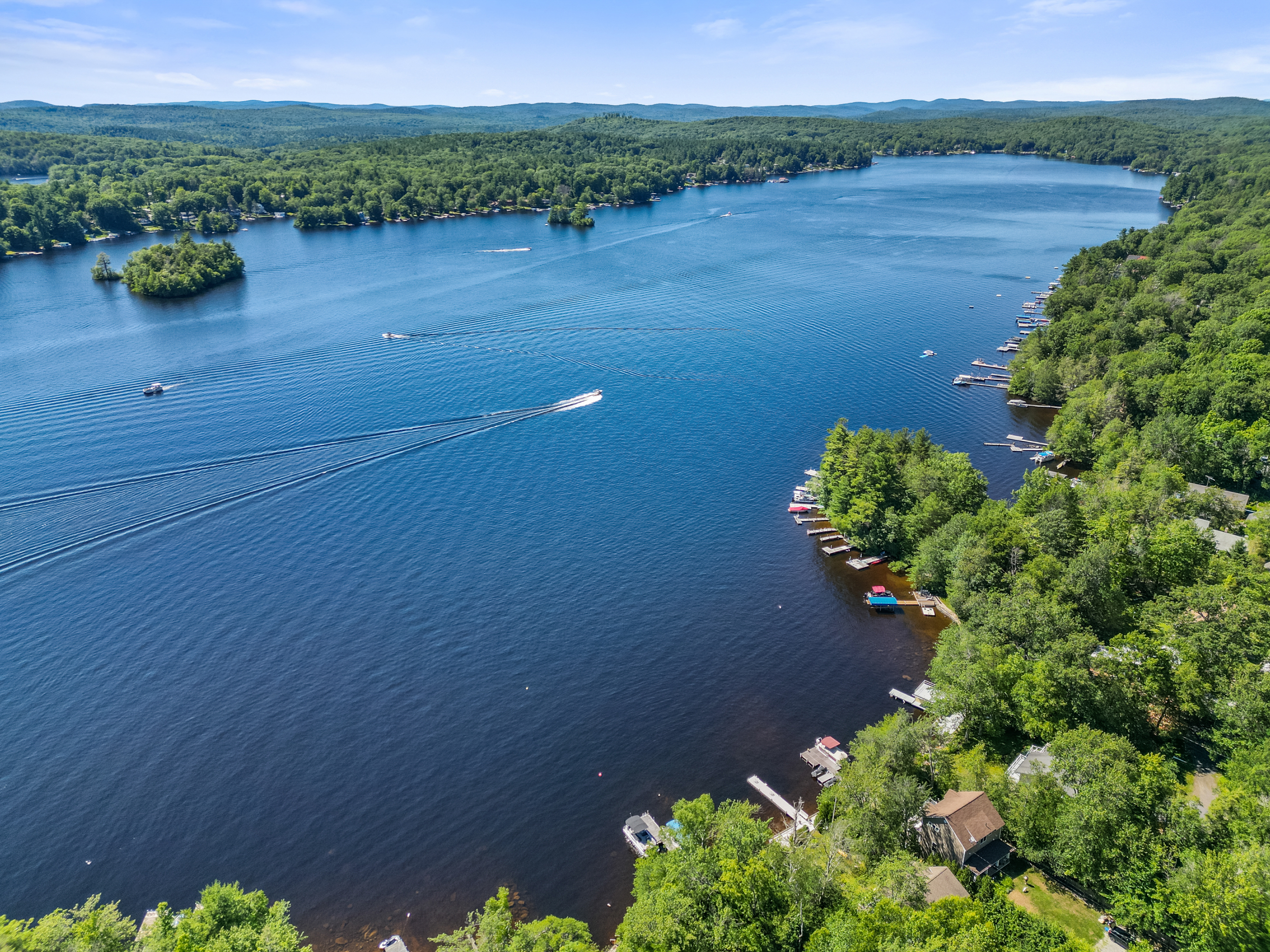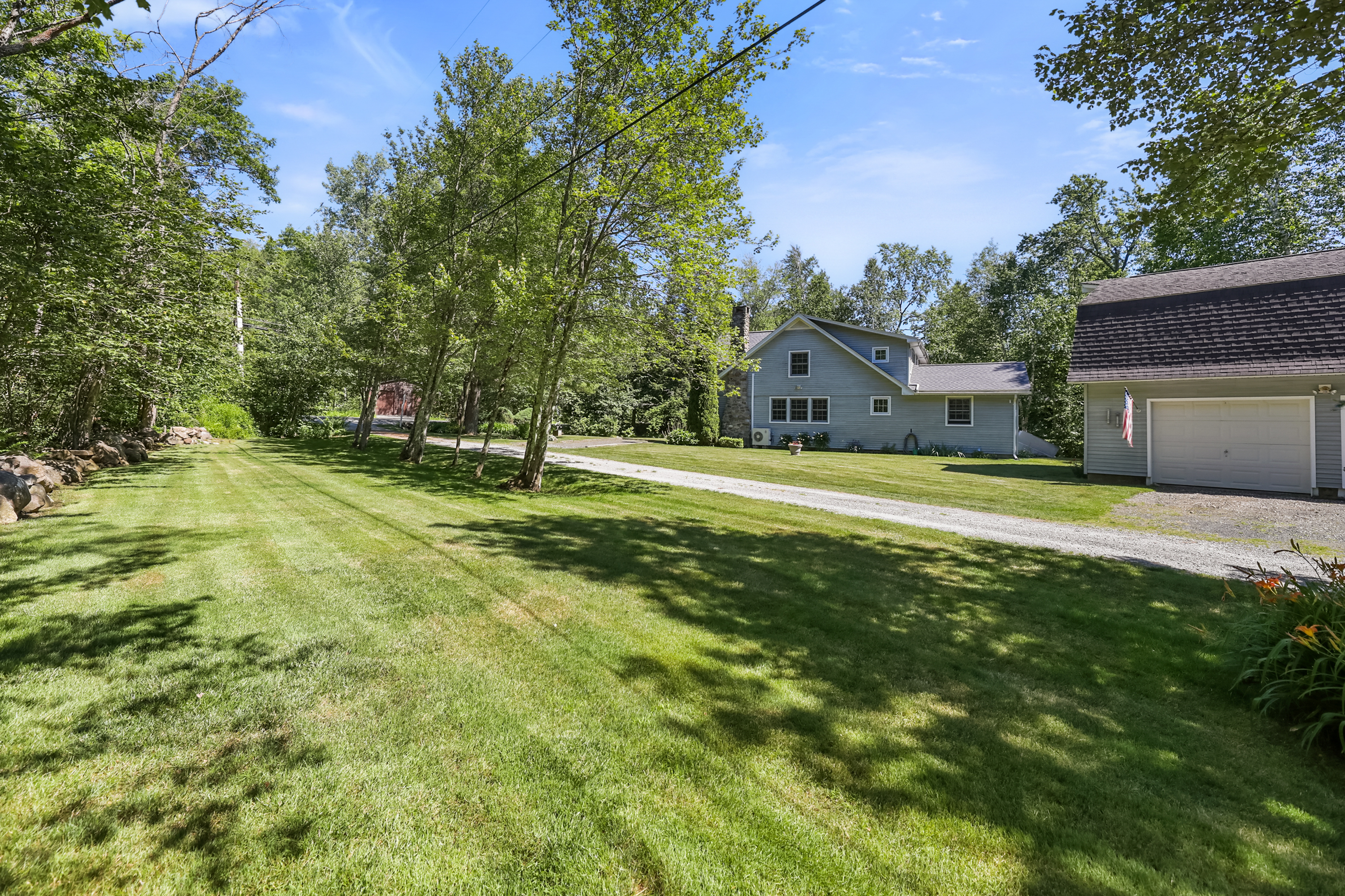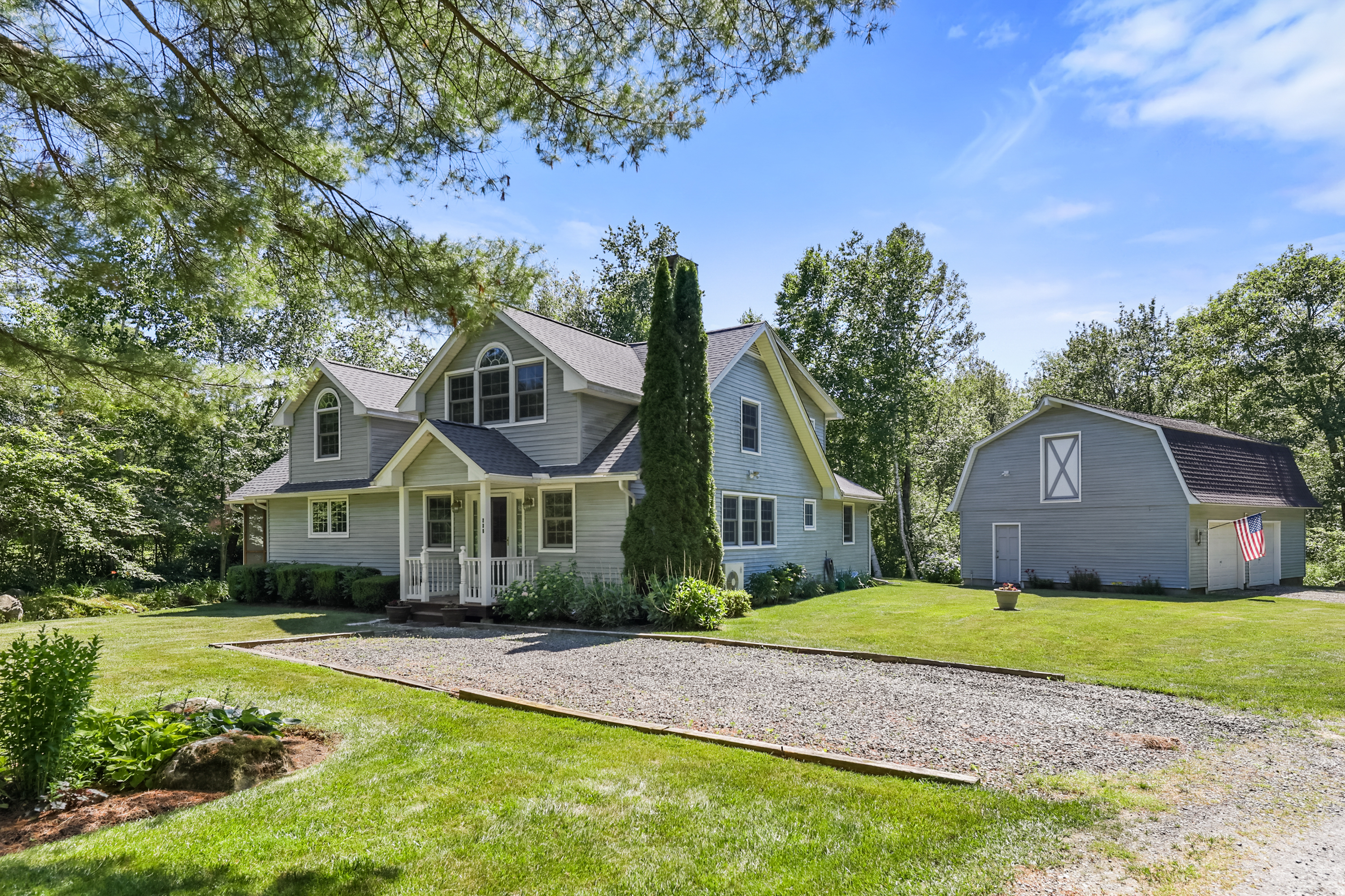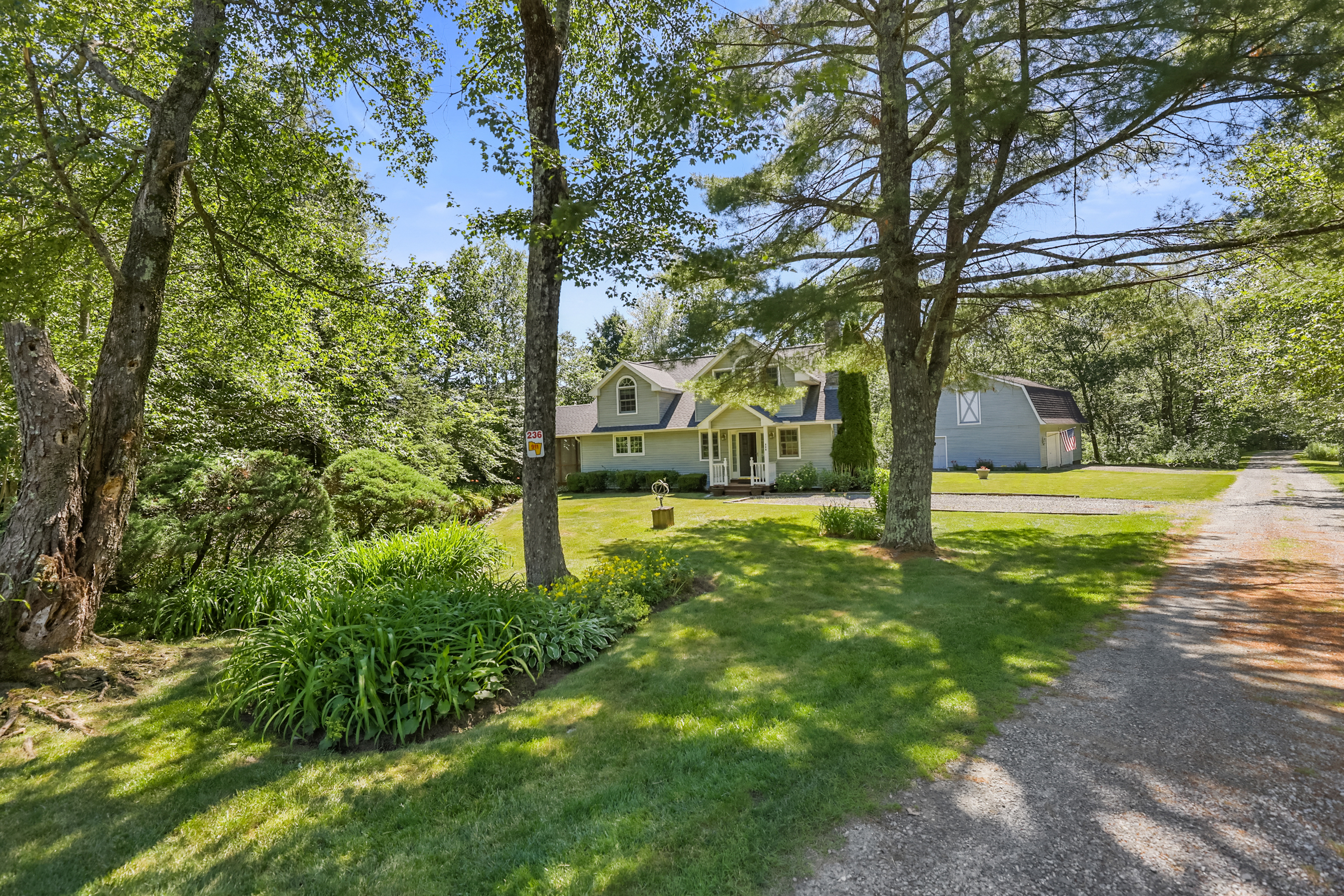 Welcome to your private retreat nestled on a beautifully landscaped half acre lot in a quiet, serene setting. This impeccably maintained home offers the perfect blend of comfort and nature, with deeded 99-year dock rights on Otis Reservoir—the largest recreational lake in Mass—just steps away. Step inside to a light-filled, open-concept living room featuring a cozy wood stove and stunning stone chimney surround. The space flows seamlessly into the dining area and kitchen, ideal for entertaining or simply relaxing. Gorgeous oak floors run throughout the main level, complementing the warm, airy atmosphere. The spacious first-floor master suite is a true sanctuary, complete with a walk-in closet, luxurious bathroom with a Jacuzzi tub, and a custom tiled walk-in shower. Upstairs, you'll find 3 bedrooms offering comfort and privacy for guests. Enjoy your morning coffee or unwind in the evening on the screened-in porch, which overlooks a babbling brook. A backyard deck surrounded by flower boxes adds even more space to take in the natural beauty around you. Outside, a 30x24 two-car barn provides ample storage and includes a large space above, perfect for a studio, workshop, or guest area. The home and barn are both vinyl sided, and the roof was replaced in 2022 with a 50-year guarantee, offering peace of mind for years to come. With plenty of natural light, an open and airy design, and thoughtful updates throughout, this home is a rare find for those seeking privacy, nature, and access to premier lake living.