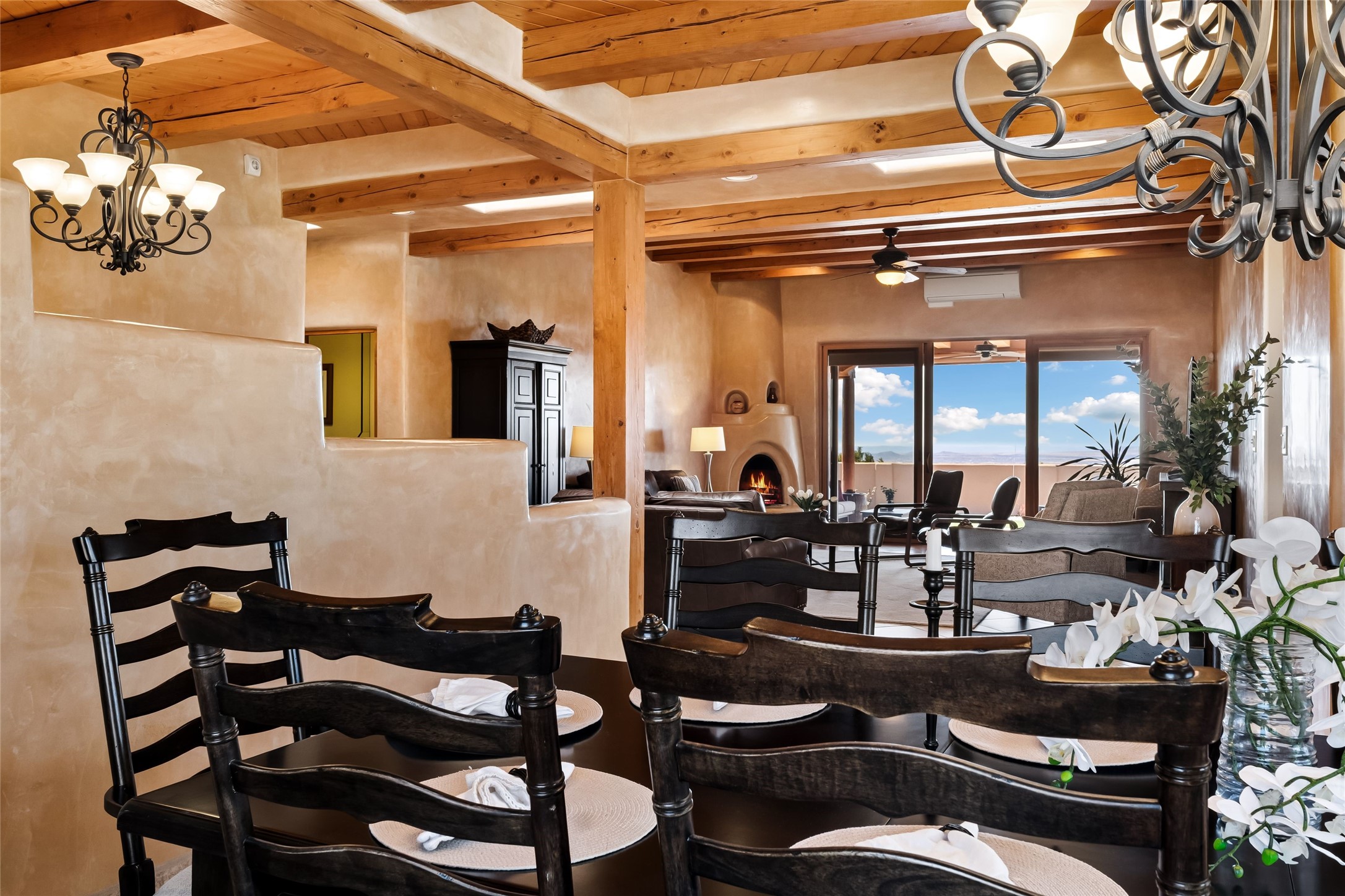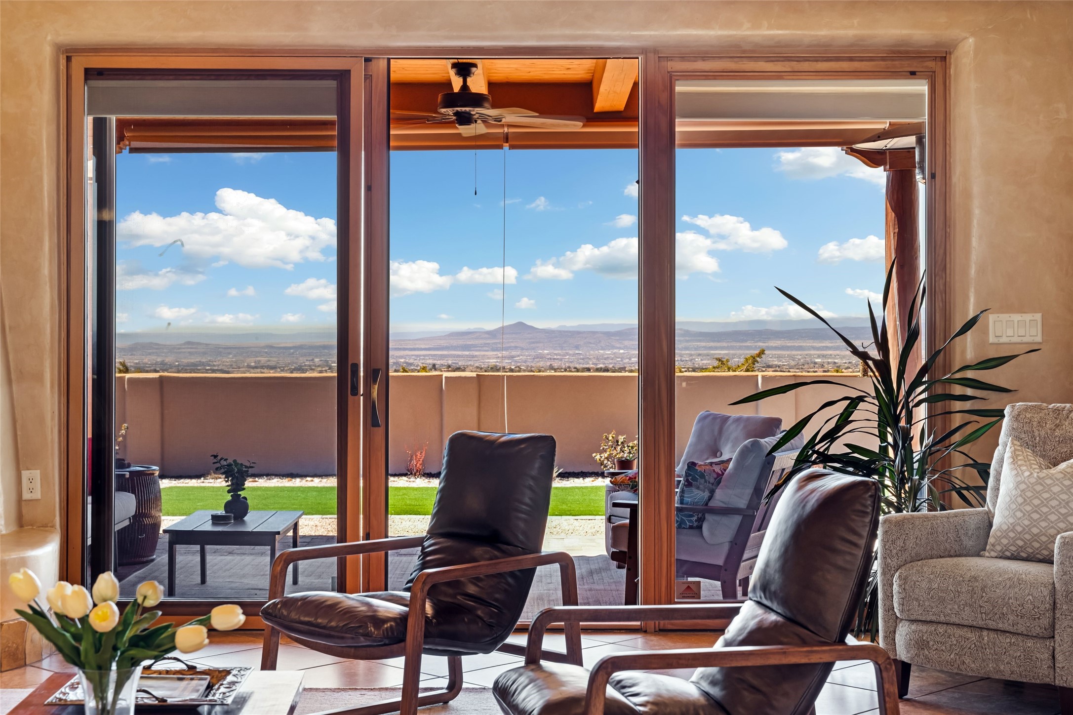 “Offering peace, privacy, and mountain views in every direction, 17 Sueño de Santa Fe is tucked away just minutes from downtown Santa Fe. This 5-acre property is ideally positioned to capture views of Sandia Mountain, the Sangre de Cristo sunrises, the Jemez Mountain sunsets, with convenient access to local favorites like El Gancho Fitness Swim & Racquet Club, Thrive Community School, and Harry’s Roadhouse. Built in 2006, the 4-bedroom, 2.5-bath home features a flowing floor plan designed for both comfortable daily living and easy entertaining. Multiple west-facing sliding glass doors connect the interior living spaces to the backyard and covered portal, creating a seamless indoor-outdoor lifestyle. The recently remodeled kitchen opens to a spacious family room with a kiva fireplace. Additional highlights include a formal dining room, a separate living room with its own kiva fireplace, and refined finishes such as diamond plaster walls and travertine tile floors. The primary suite is a peaceful retreat with its own kiva fireplace, a generous walk-in closet, and a luxurious en-suite bath with a soaking tub. Outside, the recently redesigned backyard provides the perfect setting for entertaining, relaxing while enjoying the natural surroundings, or star gazing from the hot tub. With beautiful earth-toned stucco and modern mini-split systems for efficient year-round comfort, this home blends timeless Santa Fe style with thoughtful updates. Peaceful yet connected, it’s an exceptional opportunity to enjoy a rare combination of privacy, natural beauty, and the Santa Fe lifestyle in one of the area’s most sought-after settings.”