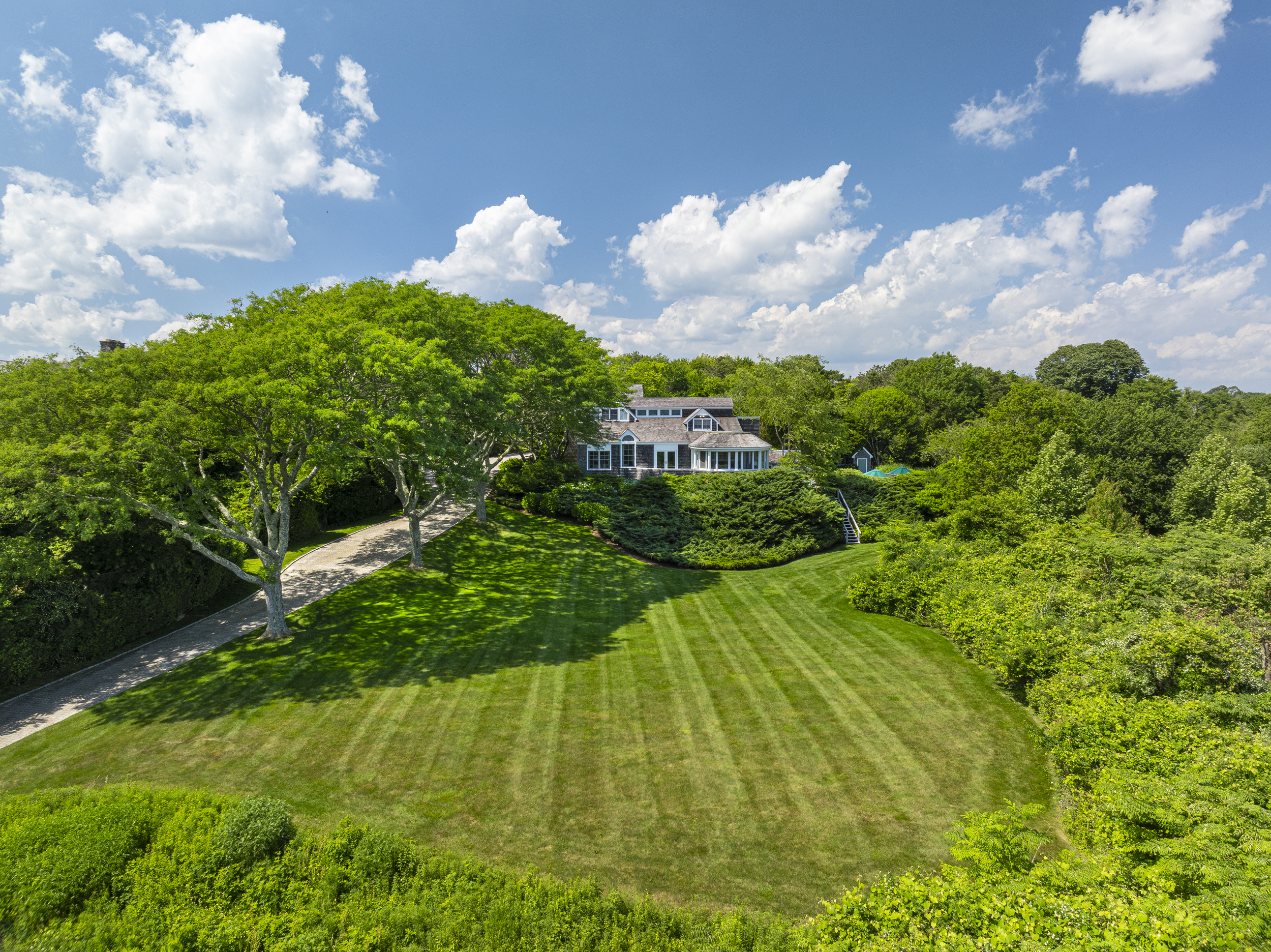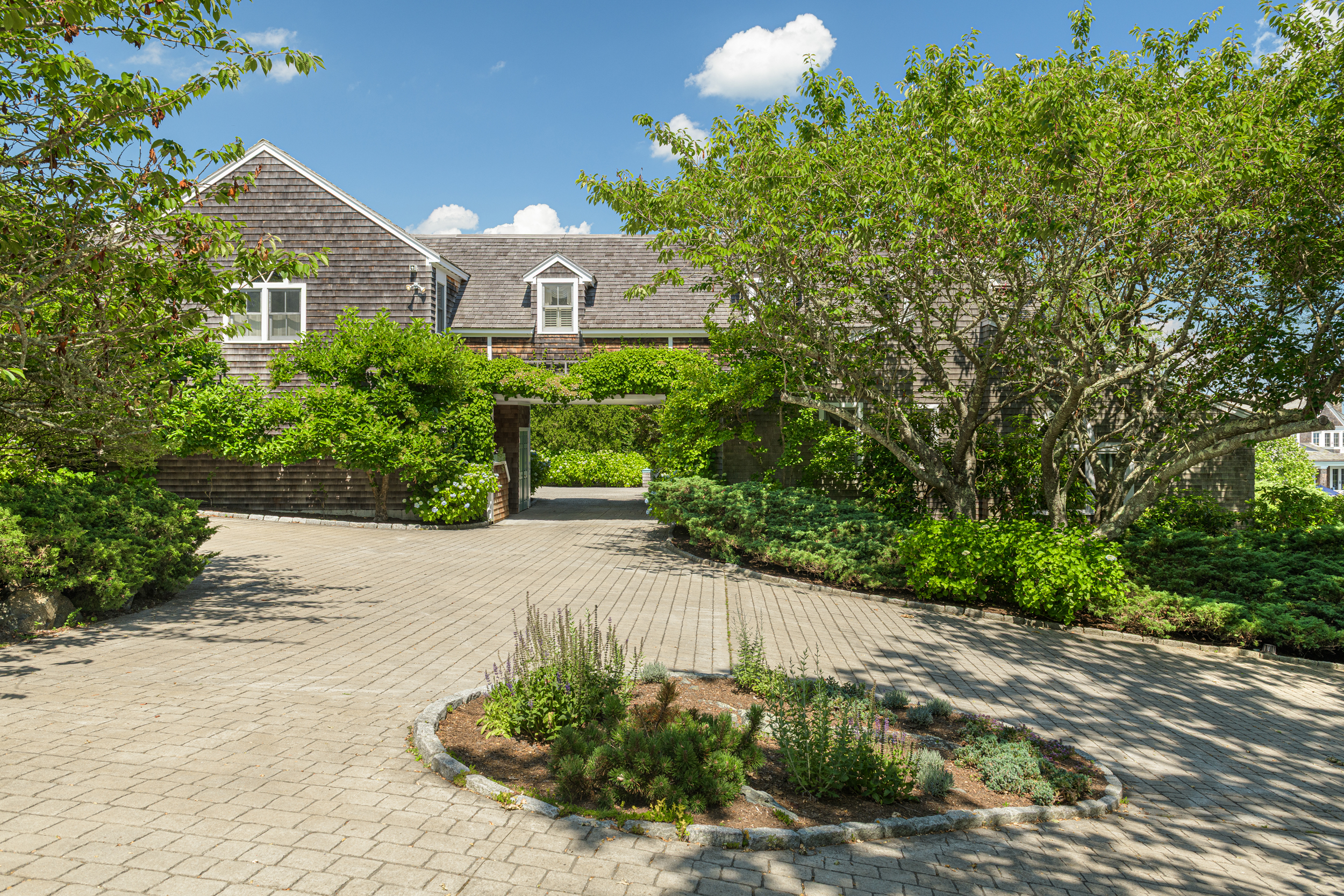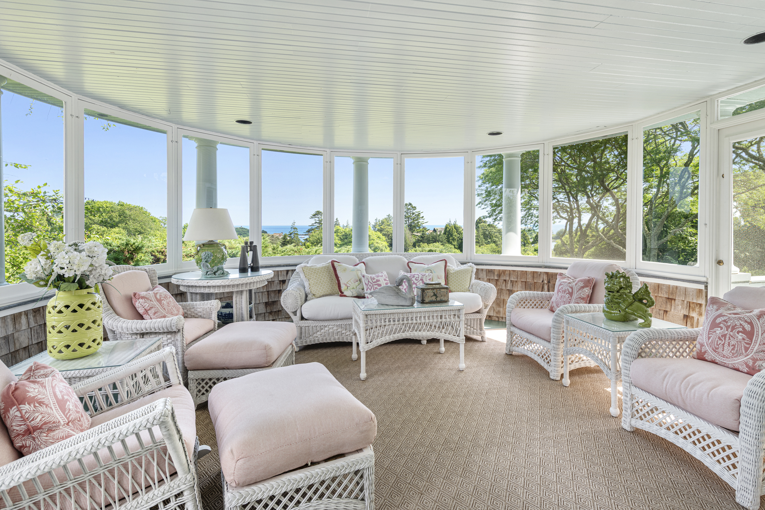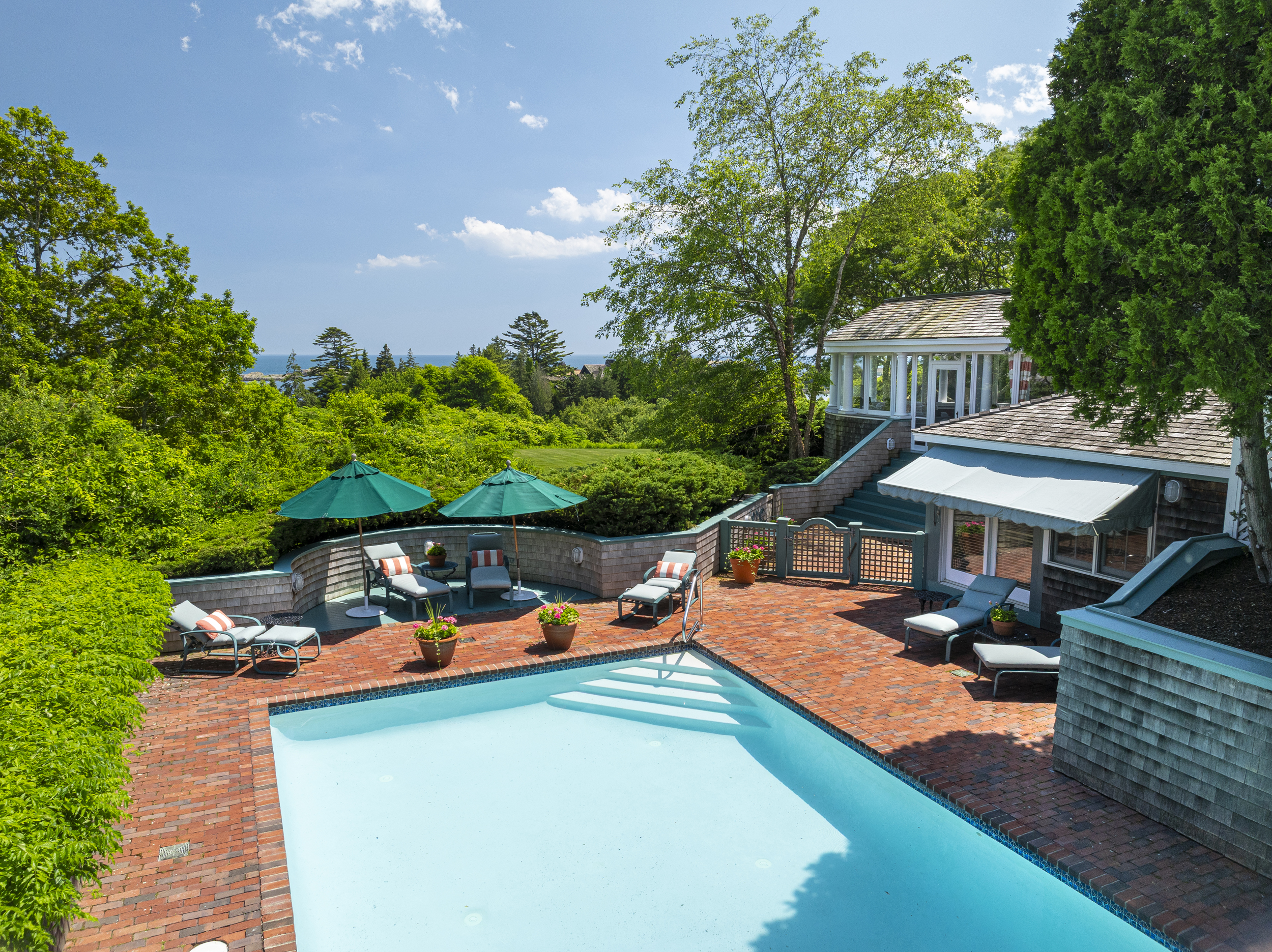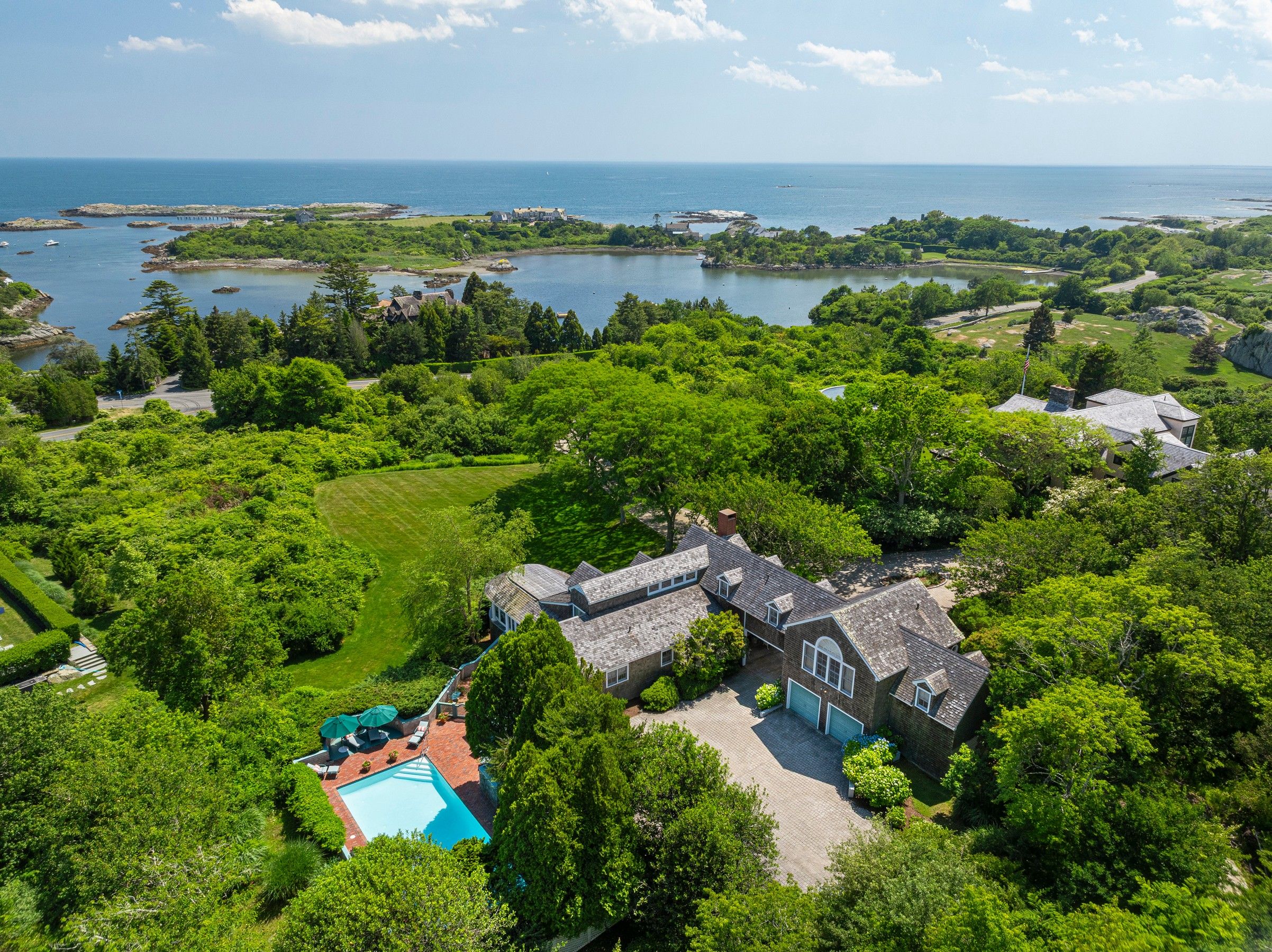“Twin Ledges” located on historic Ocean Drive, is a charming seaside retreat, offering privacy and seclusion, nestled within beautifully landscaped grounds, expansive lawns and ocean views. The shingled-style residence, custom built in 1982, sits on nearly four acres and features four levels of finished living space, designed to maximize natural light and scenic vistas. The main level offers a spacious living and dining area with an open, airy feel highlighted by vaulted ceilings, a wood-burning fireplace, and large windows that frame the surrounding landscape. A charming kitchen provides convenience while maintaining the home's open layout. The living space flows seamlessly to captivating, enclosed porch - perfect for gathering with family and guests while enjoying the coastal setting. Two bedrooms, a full bath and powder room complete this level. The top floor's primary en-suite bedroom boasts its own wood-burning fireplace and lovely views of the ocean. The finished lower level offers comfortable living space, complimented by a steam shower, wine cellar, and cedar closet with direct access to the heated saltwater pool. A two-car garage includes an elegant one-bedroom in-law suite above, connected to the main residence by a classic porte-cochere.