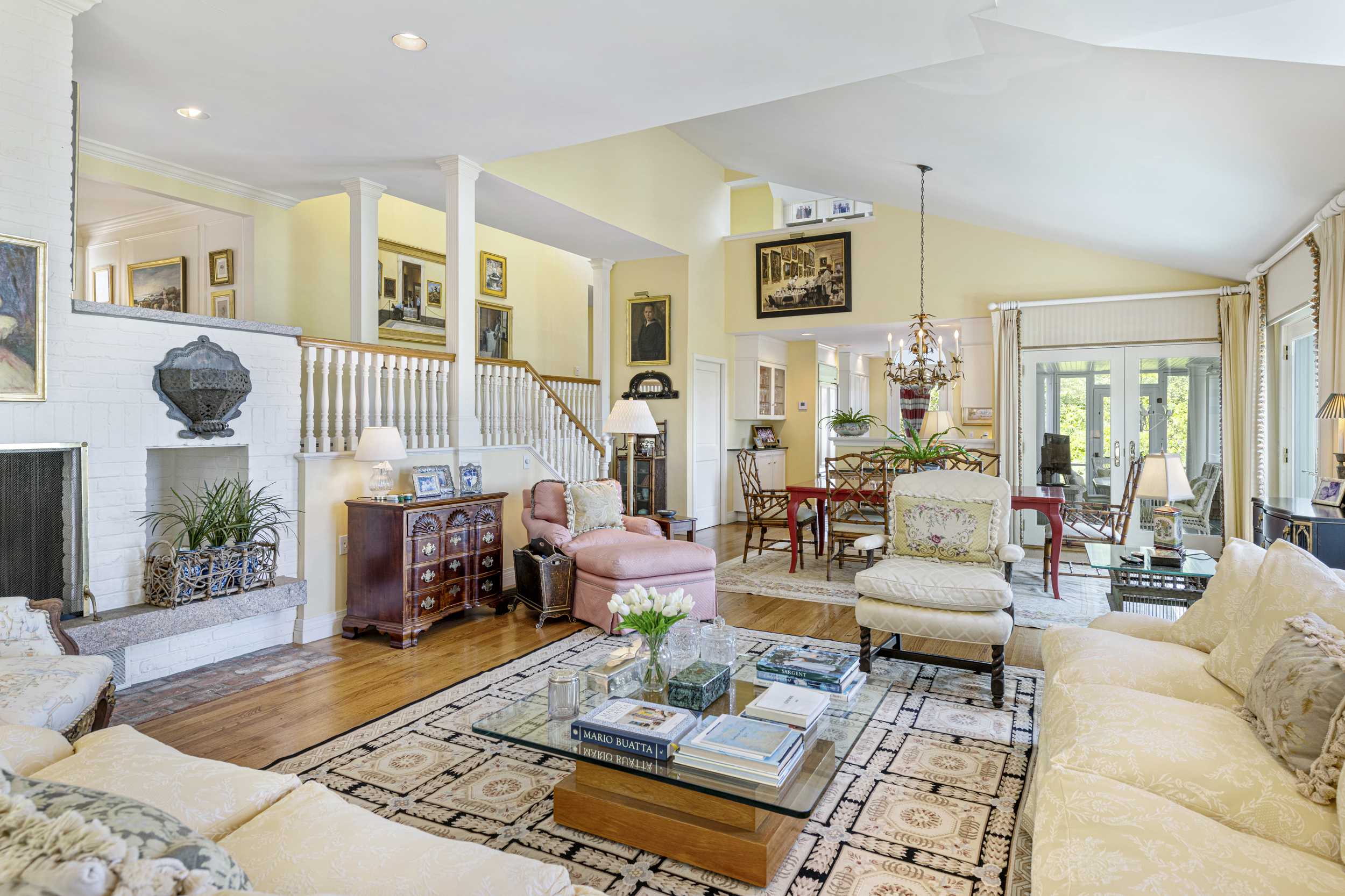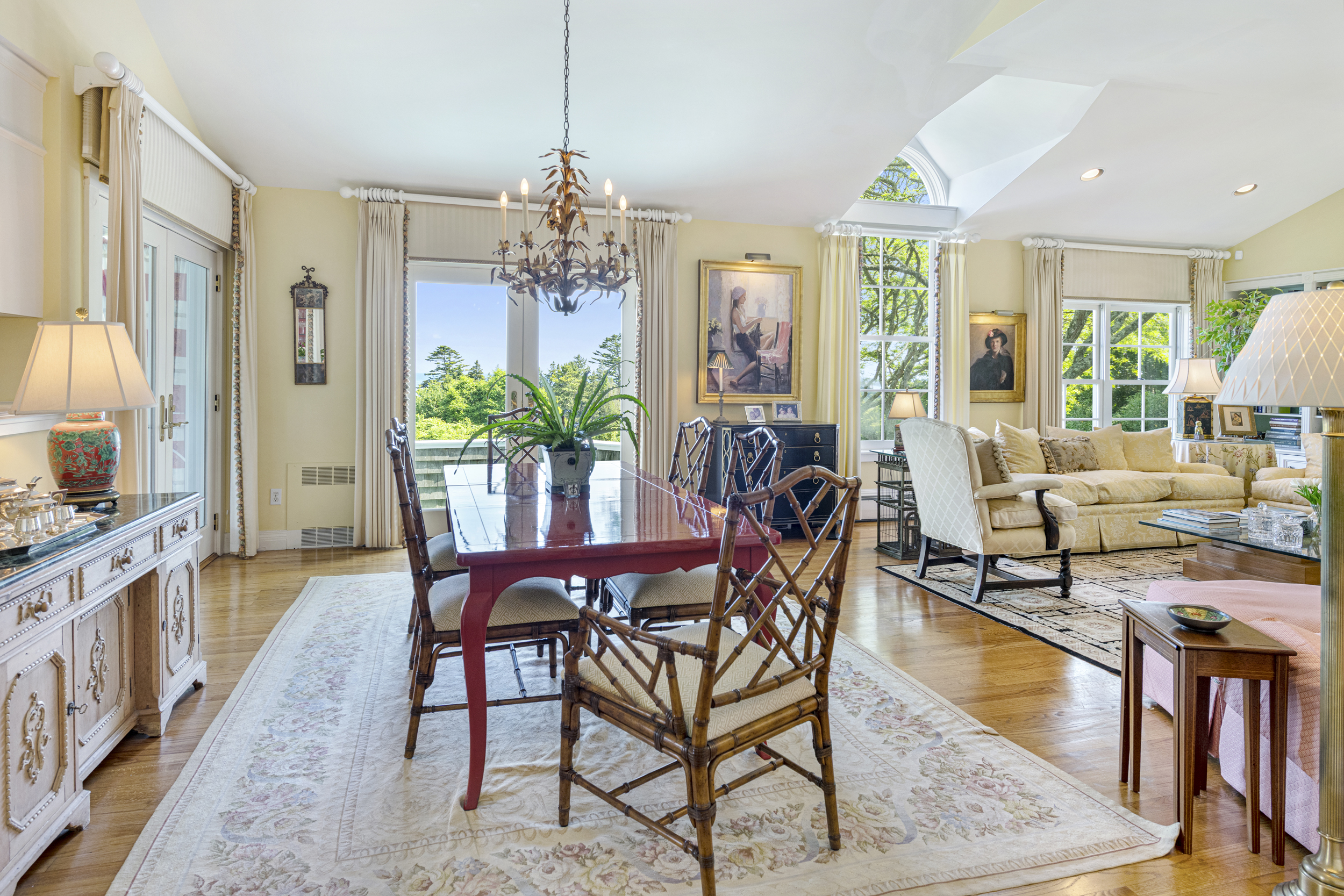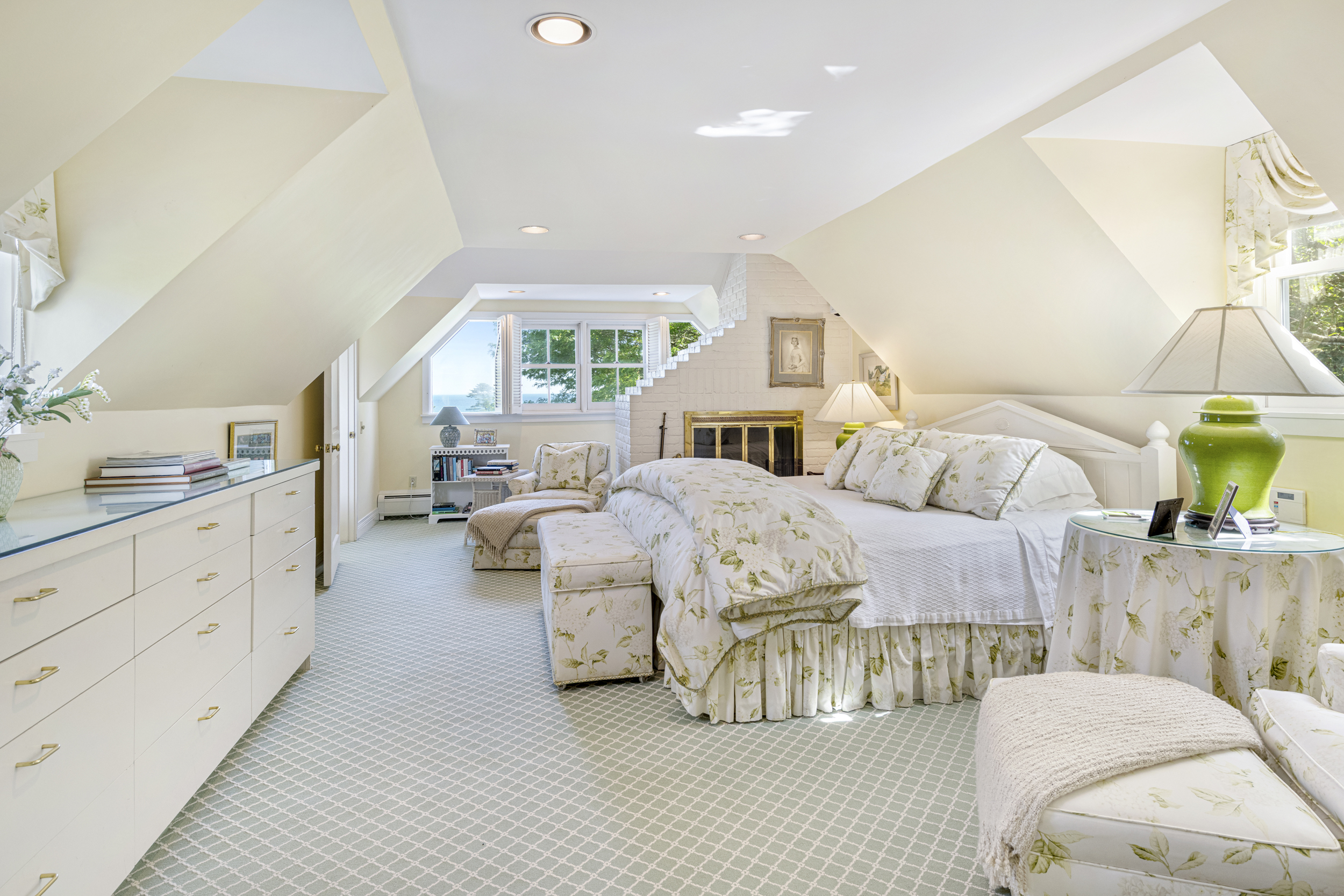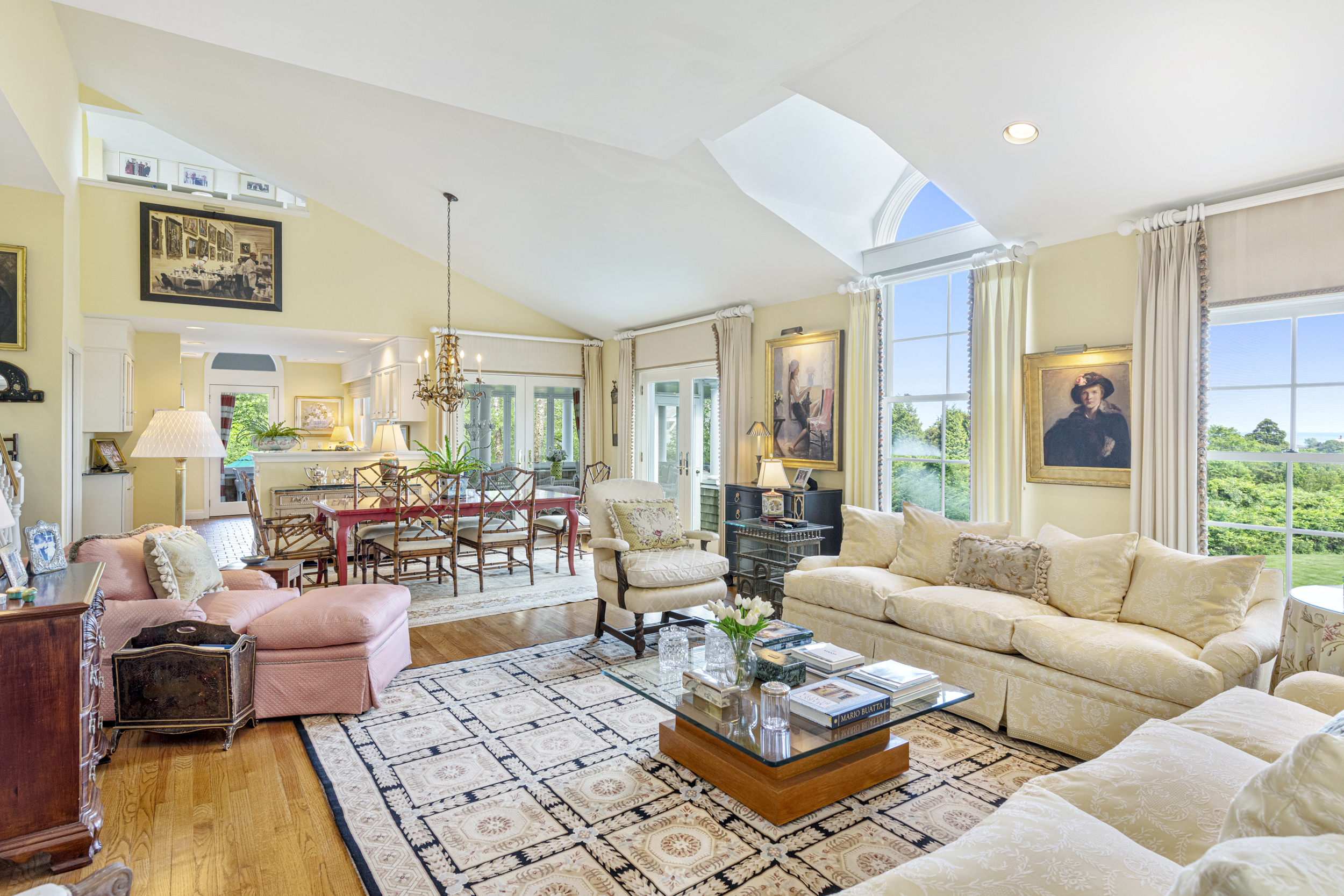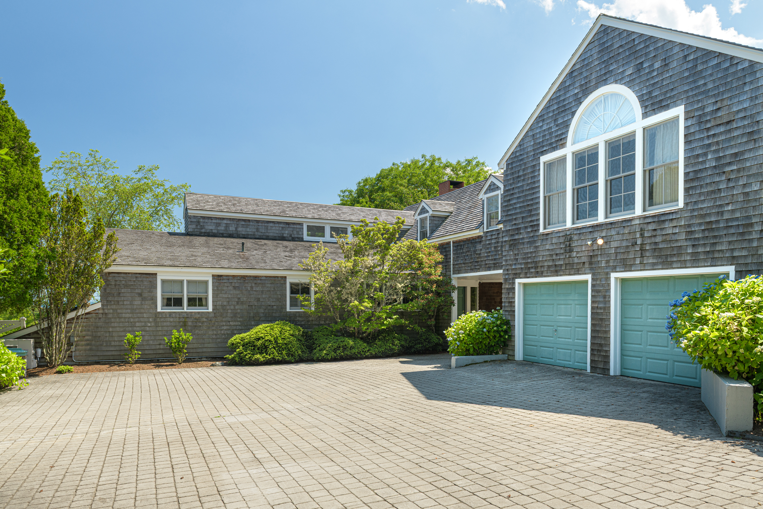 “Twin Ledges” located on historic Ocean Drive, is a charming seaside retreat, offering privacy and seclusion, nestled within beautifully landscaped grounds, expansive lawns and ocean views. The shingled-style residence, custom built in 1982, sits on nearly four acres and features four levels of finished living space, designed to maximize natural light and scenic vistas. The main level offers a spacious living and dining area with an open, airy feel highlighted by vaulted ceilings, a wood-burning fireplace, and large windows that frame the surrounding landscape. A charming kitchen provides convenience while maintaining the home's open layout. The living space flows seamlessly to captivating, enclosed porch - perfect for gathering with family and guests while enjoying the coastal setting. Two bedrooms, a full bath and powder room complete this level. The top floor's primary en-suite bedroom boasts its own wood-burning fireplace and lovely views of the ocean. The finished lower level offers comfortable living space, complimented by a steam shower, wine cellar, and cedar closet with direct access to the heated saltwater pool. A two-car garage includes an elegant one-bedroom in-law suite above, connected to the main residence by a classic porte-cochere.