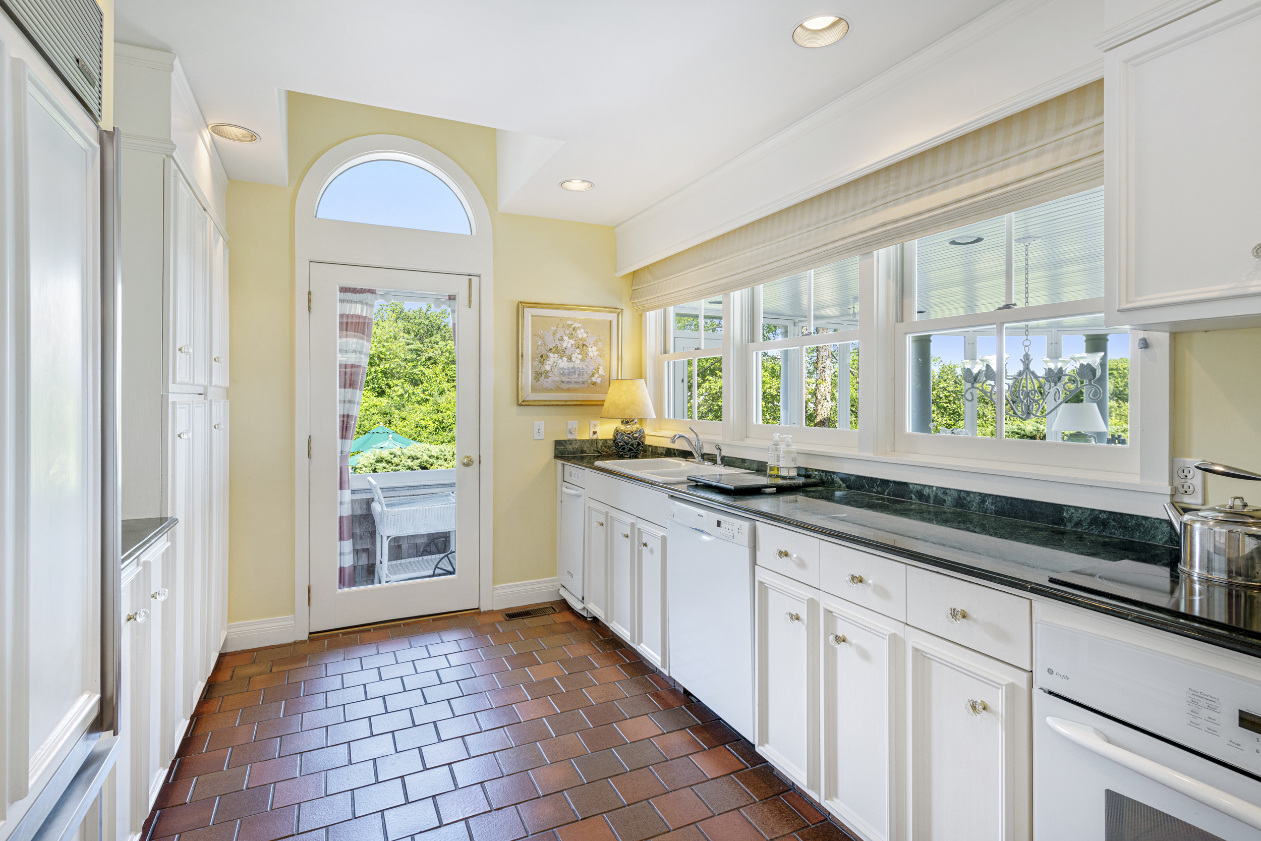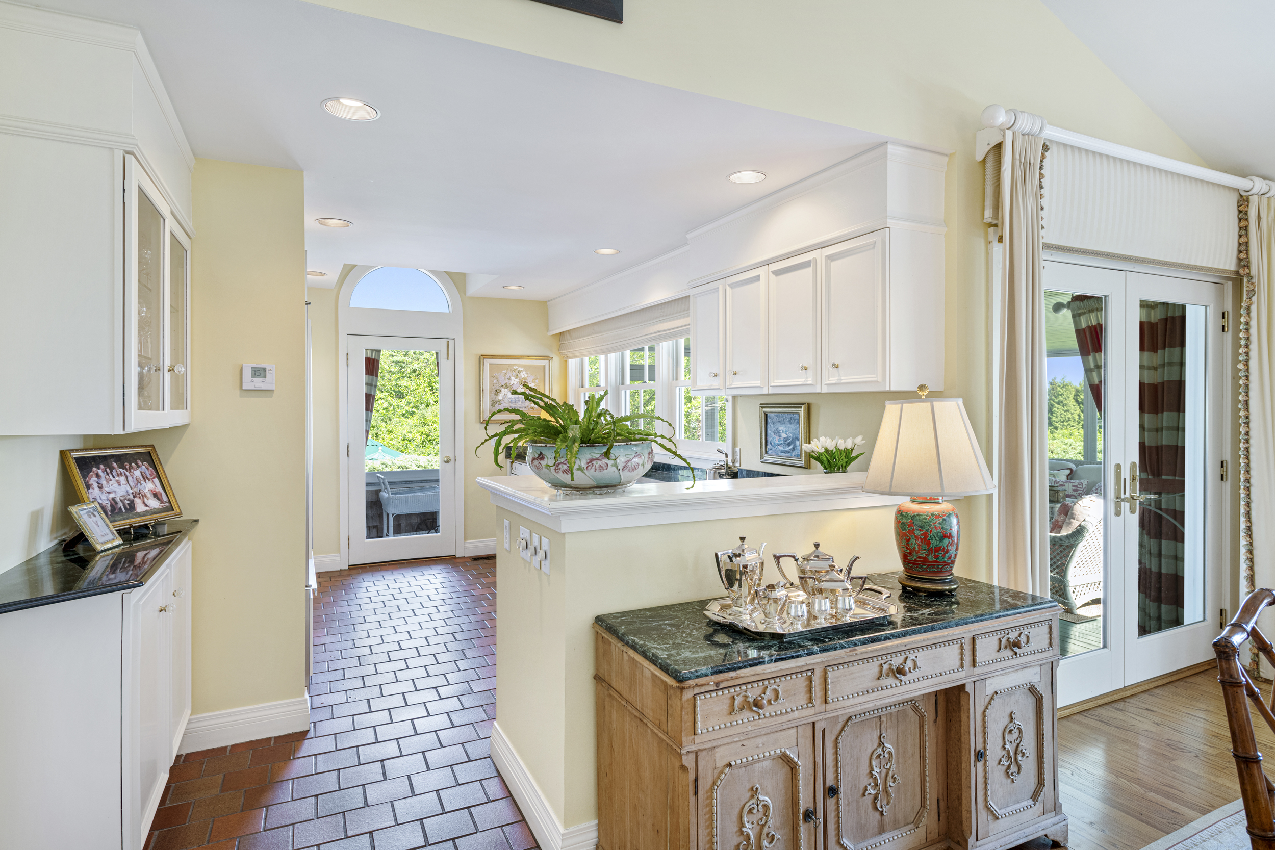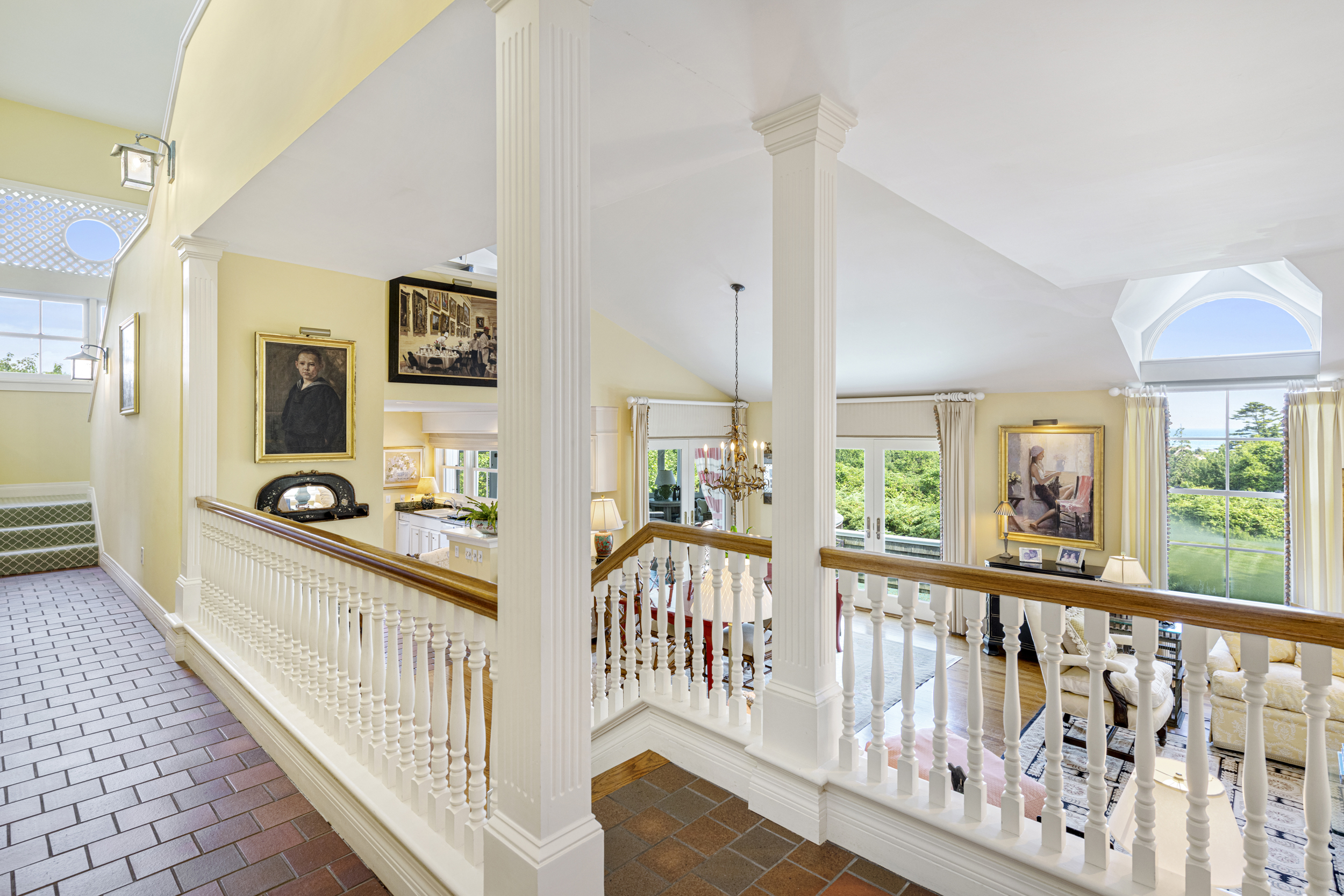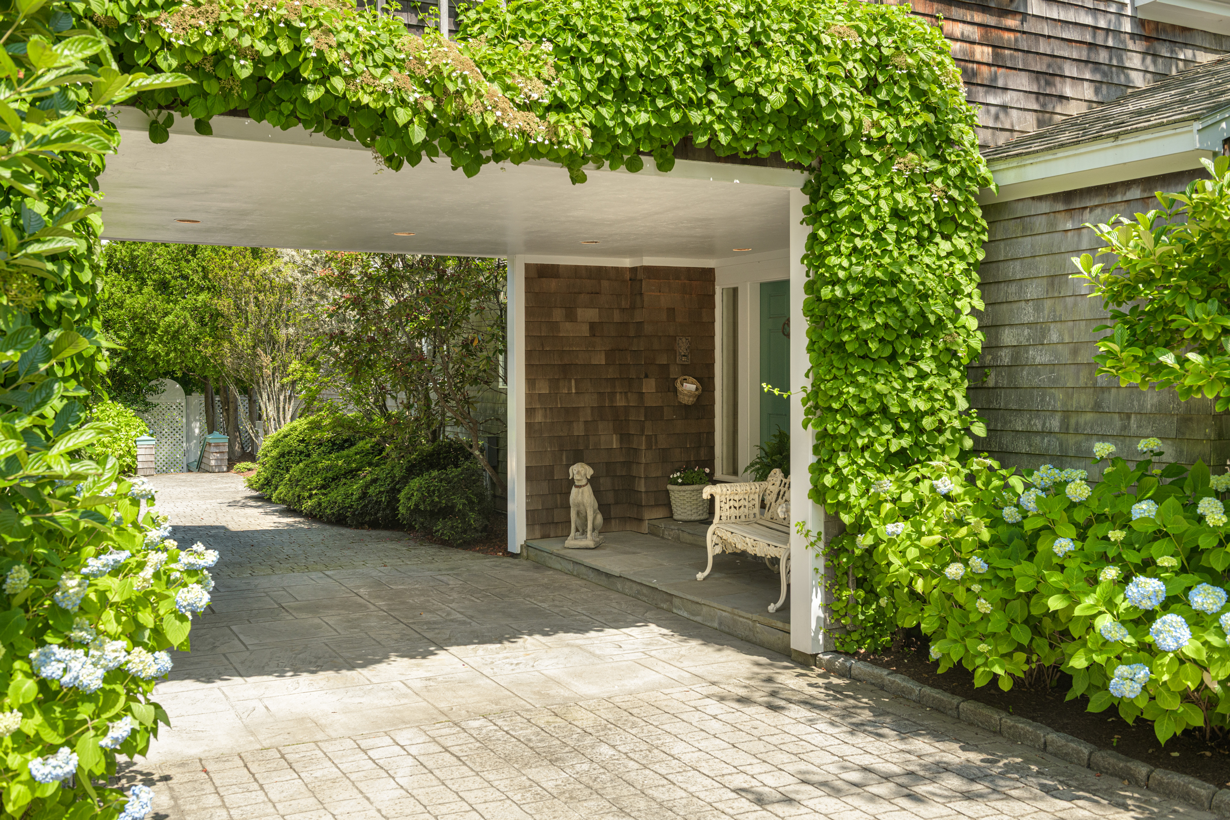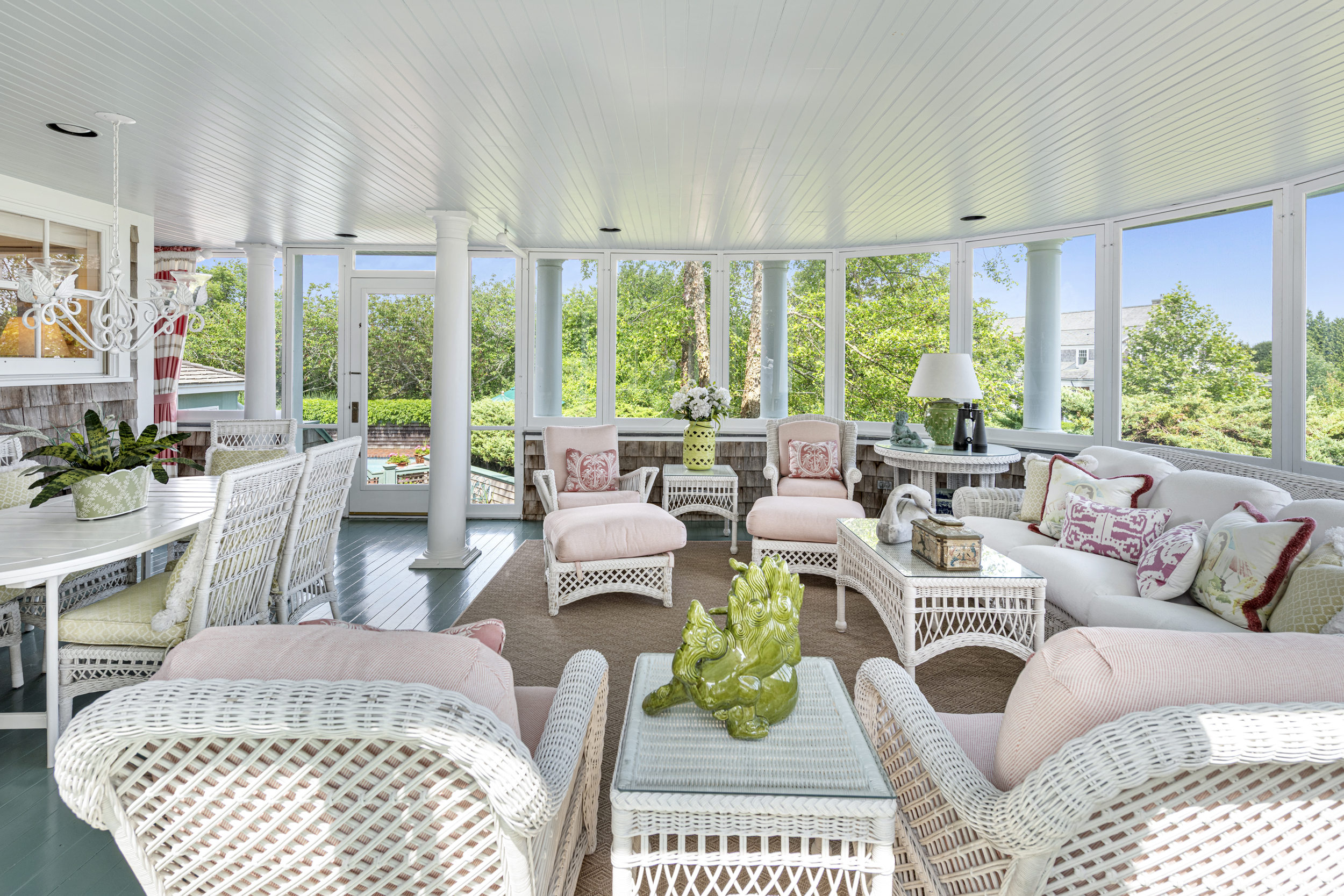 “Twin Ledges” located on historic Ocean Drive, is a charming seaside retreat, offering privacy and seclusion, nestled within beautifully landscaped grounds, expansive lawns and ocean views. The shingled-style residence, custom built in 1982, sits on nearly four acres and features four levels of finished living space, designed to maximize natural light and scenic vistas. The main level offers a spacious living and dining area with an open, airy feel highlighted by vaulted ceilings, a wood-burning fireplace, and large windows that frame the surrounding landscape. A charming kitchen provides convenience while maintaining the home's open layout. The living space flows seamlessly to captivating, enclosed porch - perfect for gathering with family and guests while enjoying the coastal setting. Two bedrooms, a full bath and powder room complete this level. The top floor's primary en-suite bedroom boasts its own wood-burning fireplace and lovely views of the ocean. The finished lower level offers comfortable living space, complimented by a steam shower, wine cellar, and cedar closet with direct access to the heated saltwater pool. A two-car garage includes an elegant one-bedroom in-law suite above, connected to the main residence by a classic porte-cochere.