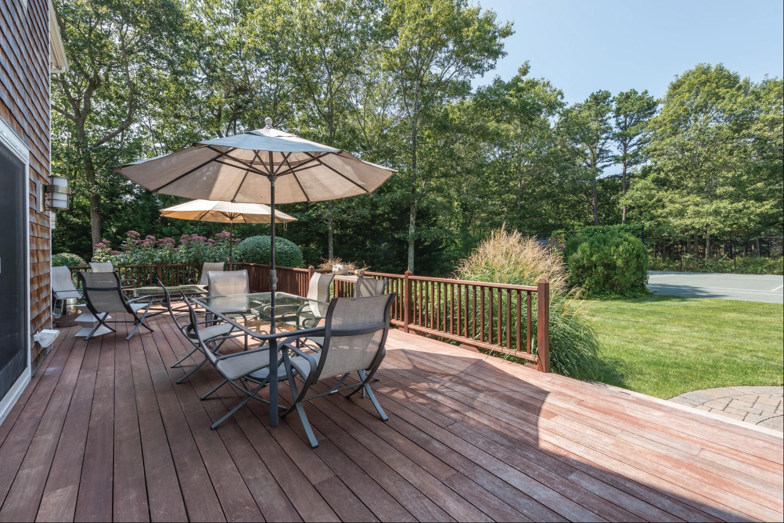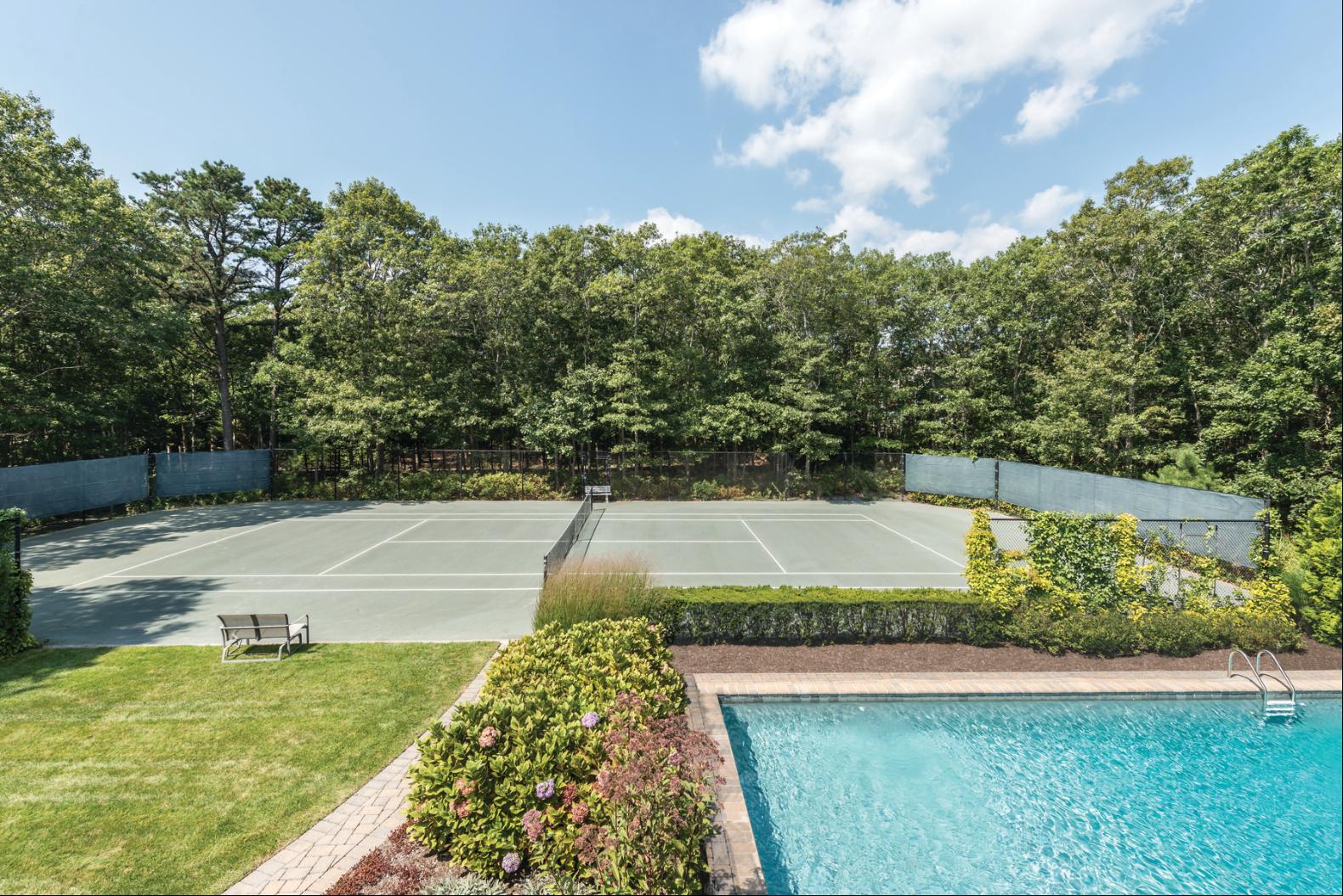 Located on a private 1.2+/- acre in Quogue Village, this 4662 sq. ft. Post Modern home greets you with a grand 2-story entryway that leads to a great room with a vaulted ceiling, wood-burning fireplace and built-in bookshelves and cabinetry. A wall of sliders brings in lots of light and opens to the expansive mahogany deck, heated gunite pool and Har-tru tennis court. The open floor plan includes a formal dining room, and a chef's kitchen with top of the line appliances, Caesarstone countertops, wine refrigerator, and an oversized center island. The breakfast area opens to the screened porch that overlooks onto the backyard. The first floor primary suite includes a gas fireplace, two walk-in closets and a newly renovated spa bath with separate shower and a soaking tub. Upstairs there are three additional en suite guest bedrooms and a junior primary suite with its own private deck. In addition, there is a gym with a Peloton bike, elliptical machine and free weights. The newly finished basement includes a full bath and a game room with a ping pong table, shuffleboard table, and a wet bar. Access to the Quogue Village Beach completes the perfect summer vacation home. Listing ID #738013