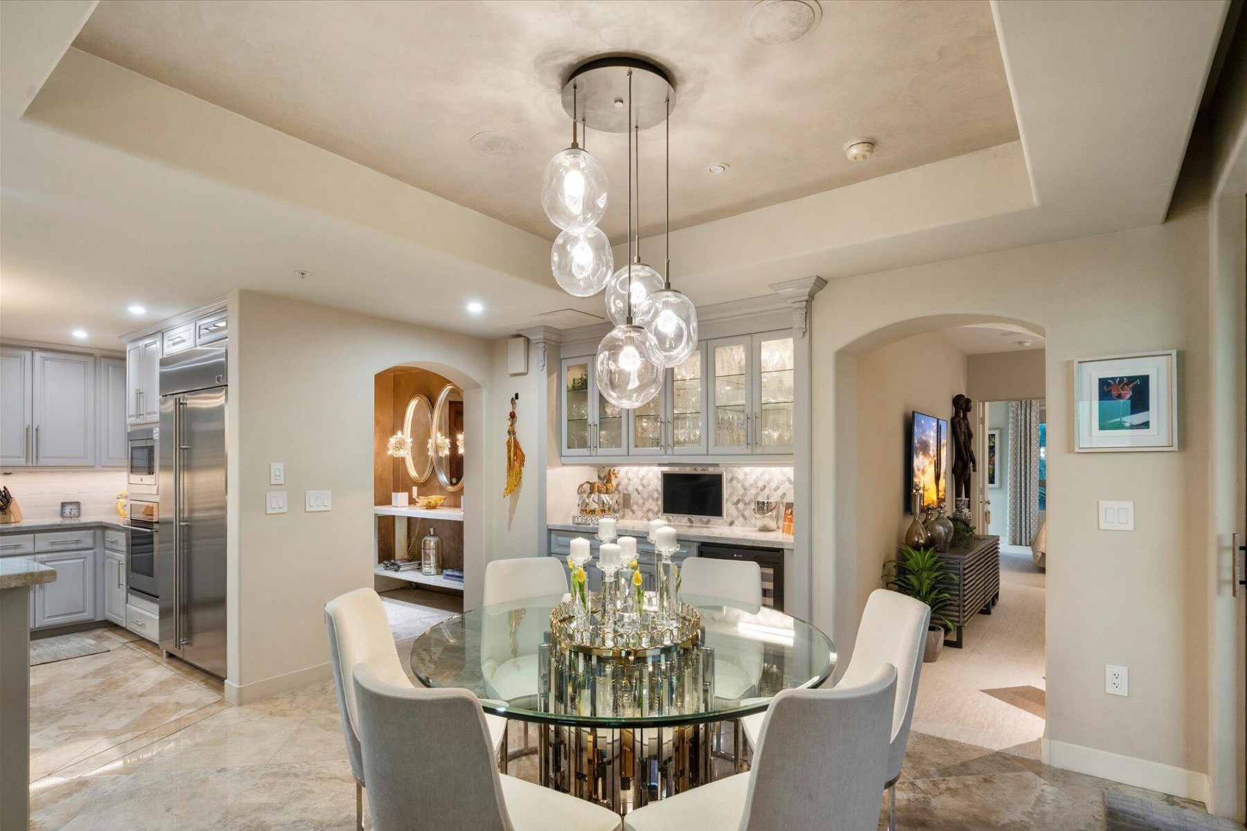 Perched on the fifth floor, this corner residence at The Landmark captures the best of North Scottsdale living—expansive mountain, fairway, and city light vistas with quiet, lock-and-leave ease. All a short stroll from Kierland Commons and Scottsdale Quarter for shopping and eating. The open plan is tailored for entertaining: a refined bar with built-ins and pull-outs anchors the great room, while integrated audio flows through the living, dining, and office. Office has a fireplace and built ins. The kitchen balances form and function with Taj Mahal quartzite surfaces. Private spaces are equally considered. A flexible junior suite doubles as a media retreat with a sitting area and motorized shades. The serene main suite opens to a balcony overlooking the Westin golf course, with Camelback Mountain on the horizon. Finishes include polished stone floors, refreshed bath lighting, and elegant crown detail in the main bath. Recent mechanical updates add everyday peace of mind. Practical perks complete the package: one assigned private parking space, plus a private garage, a private wine locker, plus both interior and exterior private storage rooms. The Landmark's social lifestyle includes weekly mingles, seasonal gatherings, and a fireside lounge, paired with resort-style amenities. Here, views define the experience and effortless living completes it.