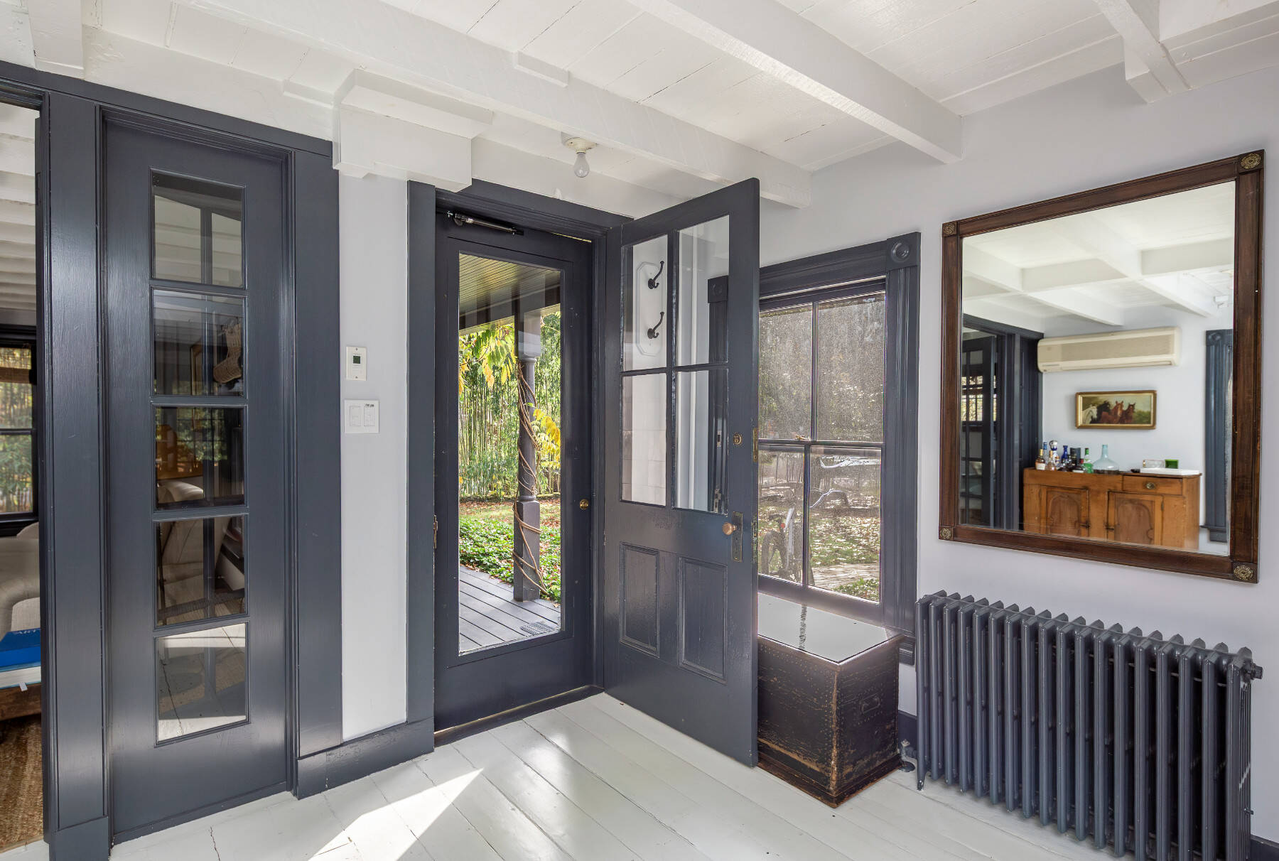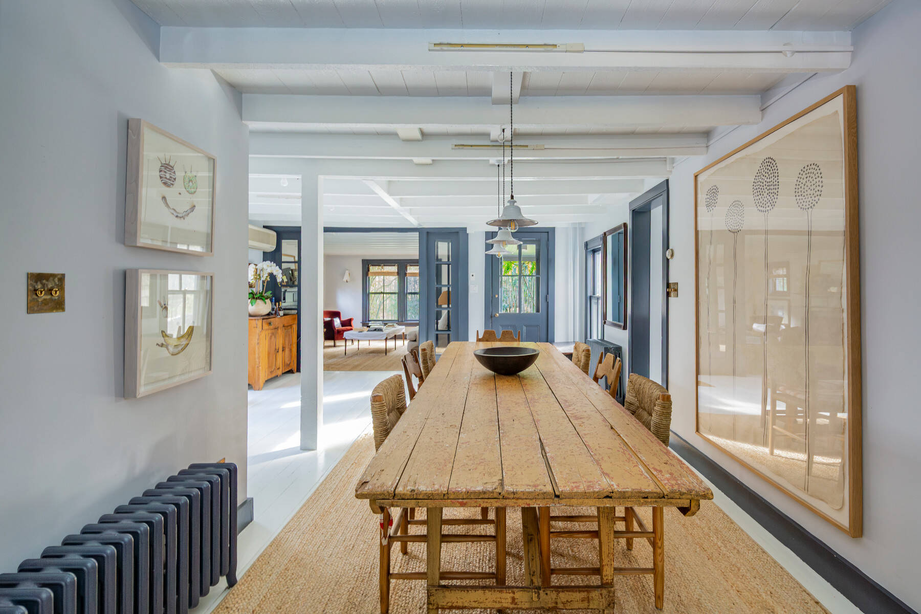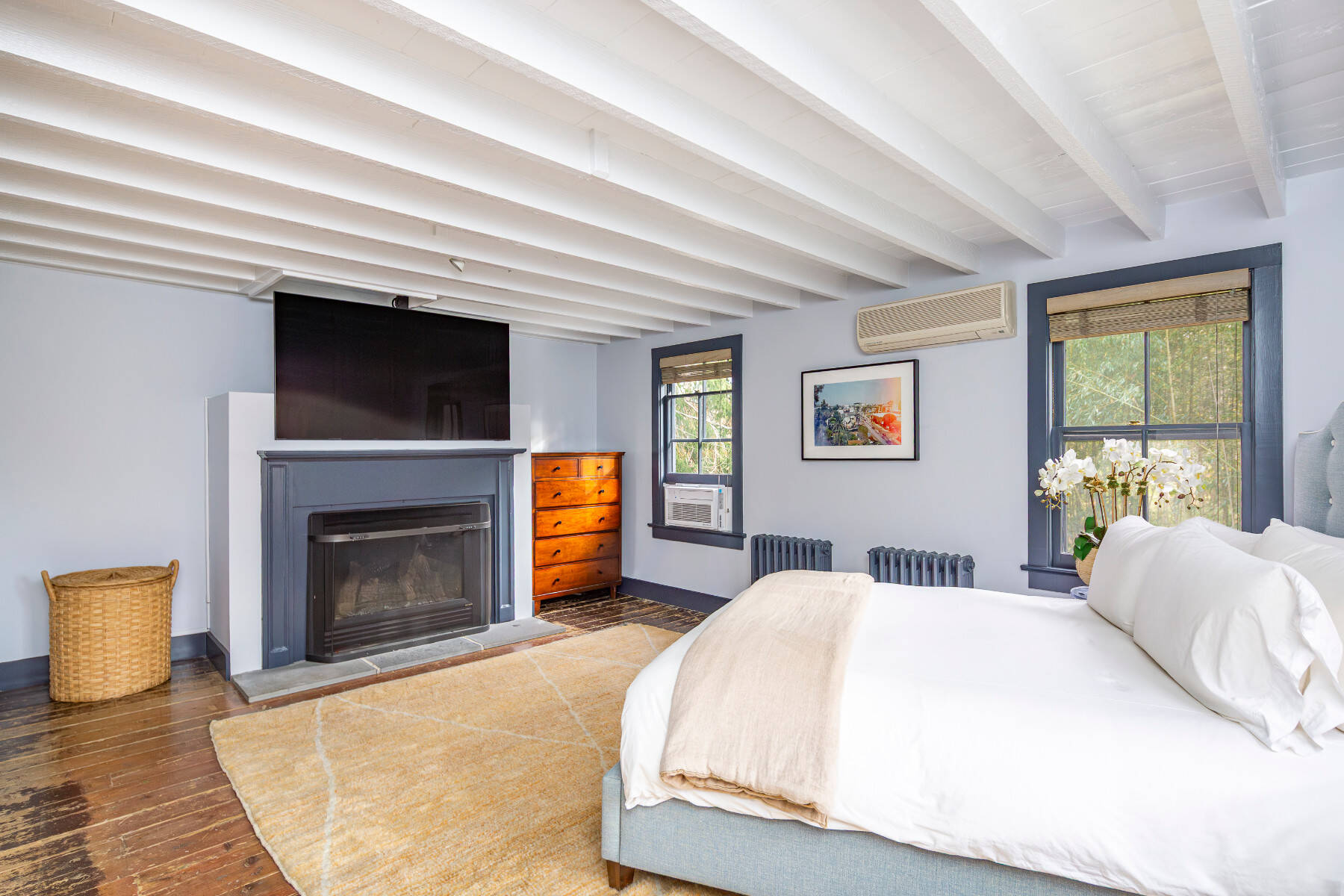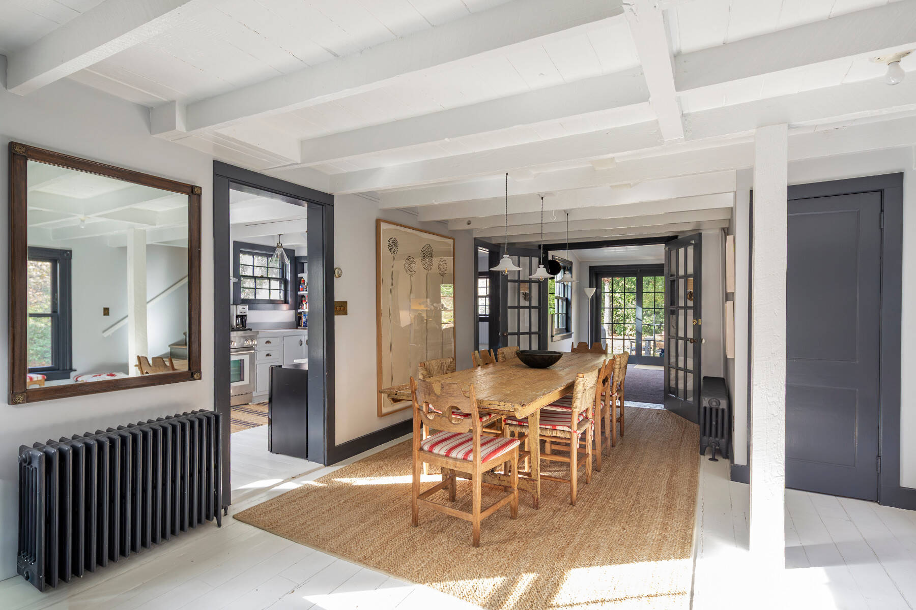 Tucked away on a quiet lane near Amagansett Village, this beautifully restored 1870s Federal farmhouse balances timeless character with sophistication. Just moments from town, the ocean, and favorite farm stands, it offers the quintessential Hamptons retreat. Inside, the 1,755-square-foot home is bright and welcoming, with white-painted wide-plank floors and exposed beams that create a relaxed coastal rhythm. The living room, anchored by a classic fireplace, opens to an all-season sunroom/TV room with white brick flooring and mullioned sliding doors that frame views of the surrounding gardens. Period details include original windows and soft blue-gray moldings, lending an authentic patina. An open dining area connects to the eat-in kitchen, where open shelving, stainless appliances, and an adjacent pantry/laundry room combine function with style. The sunroom, offers a perfect guest hideaway or flexible third sleeping space next to a full bath with a vintage claw-foot tub . Upstairs, the primary suite includes a gas fireplace and TV, a second bedroom with TV, a cozy reading nook with built-ins, and a thoughtfully designed full bath. Set on a half-acre shaded by mature oak, beech, and cherry trees, backyard dining area with gas BBQ, this Amagansett farmhouse embodies the appeal of village living, charming, chic, and just minutes from everything that makes this coastal hamlet so beloved. [[Rental Registration # 25-817]] EH RR #: 25-817