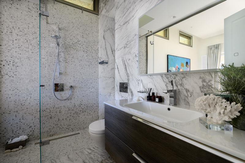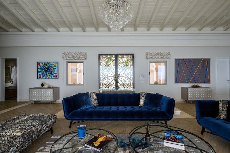 The villa itself offers 574 sqm of living space over two levels with a beautiful interior design, featuring contemporary French and Italian furniture throughout. The main extensive living, dining, and kitchen areas feature huge, minimal framed windows and high vaulted cypress beamed ceilings that ensure maximum views as well as light, bright and airy living. The stunning, Italian designer kitchen comes complete with Miele and Liebherr appliances. All these areas offer access to the extensive external areas and pool.