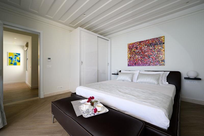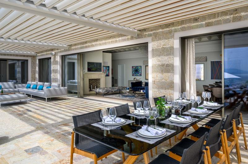 The villa is set within a plot of 4000 sqm, with a vast fully landscaped Mediterranean garden that features over 50 olive trees. Extensive stone terracing throughout the grounds creates wonderful spaces for external living – there are 285 sqm of terraces in the pool area alone, 105 sqm of which are covered by automatic bioclimatic pergolas, all offering perfect areas for relaxing or dining alfresco whilst taking in the views. A 72 sqm infinity pool is also perfectly positioned to take in the stunning views. There are steps down from the pool area firstly to a yoga / meditation area overlooking the sea, and then to a waterside decked area for sunbeds and the boat jetty.