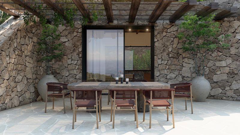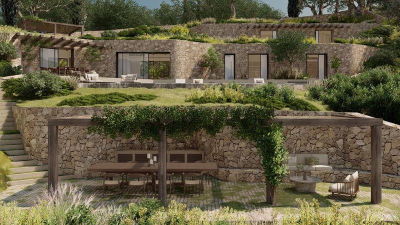 With a southerly aspect, this bespoke earth home is set within a plot of 2,534 sqm and is in complete harmony with its natural surrounding landscape. Access is via a private driveway that leads down to the property and parking area. It has been designed to offer a state-of-the-art garden with wonderful external living spaces that all enjoy the panoramic views. It includes a private pool with extensive paved sun terrace, poolside seating and dining areas as well as a covered external kitchen, BBQ, and dining area below the pool.