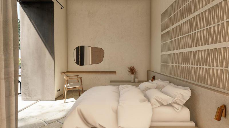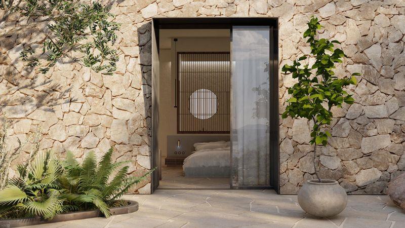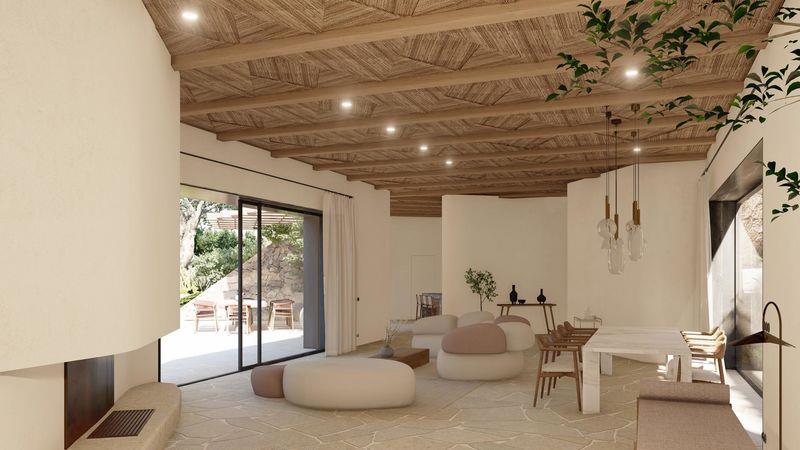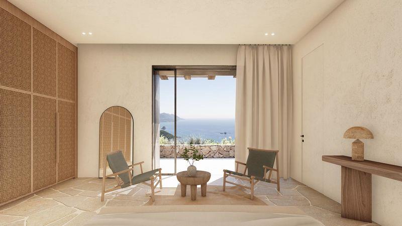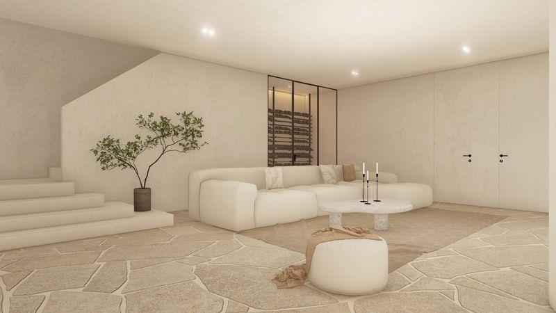 Stairs lead to the upper level where there are two further ensuite bedrooms that have access to terraces. The lower level has been designed to house the fifth ensuite bedroom, a wellness area, and a multifunctional space.